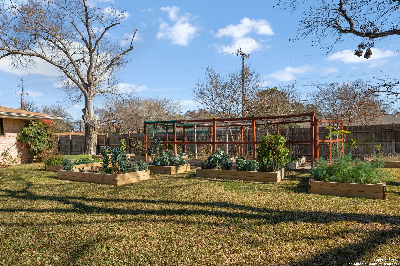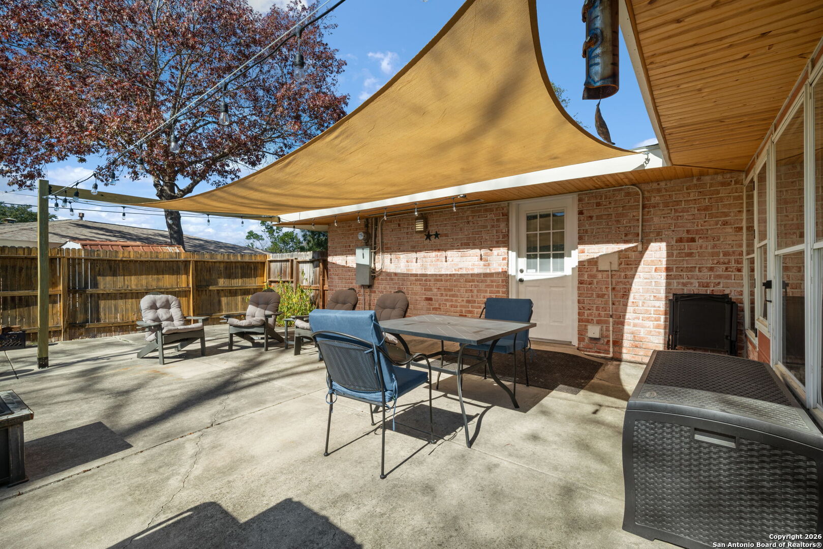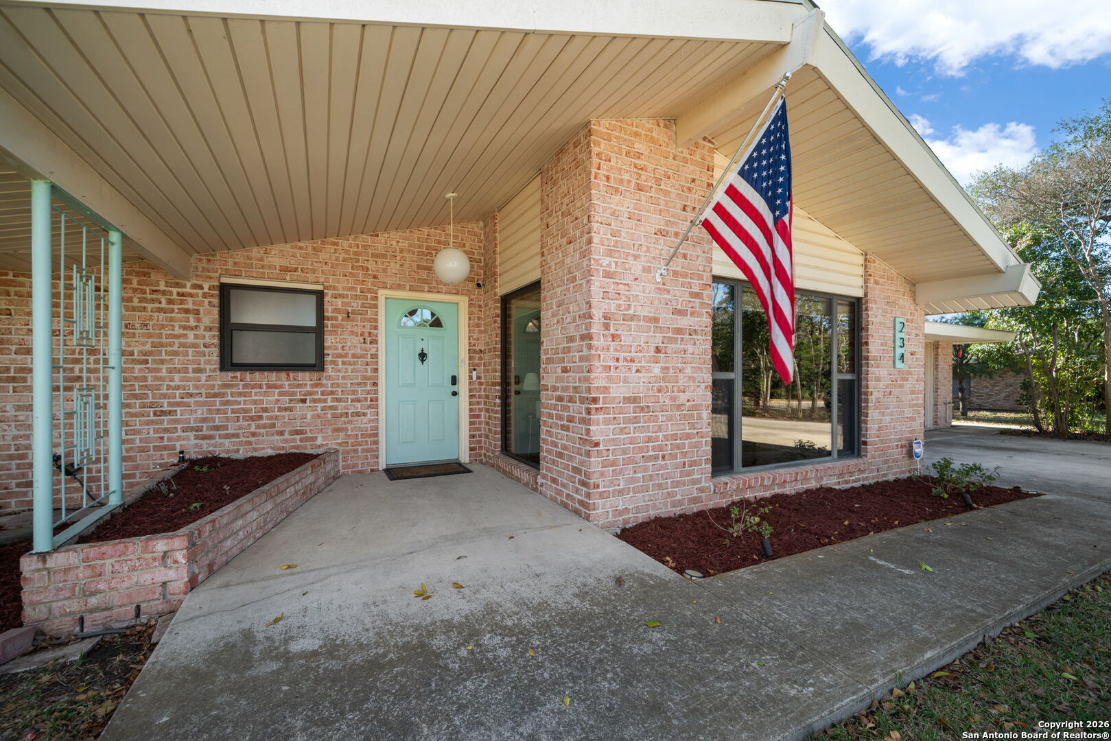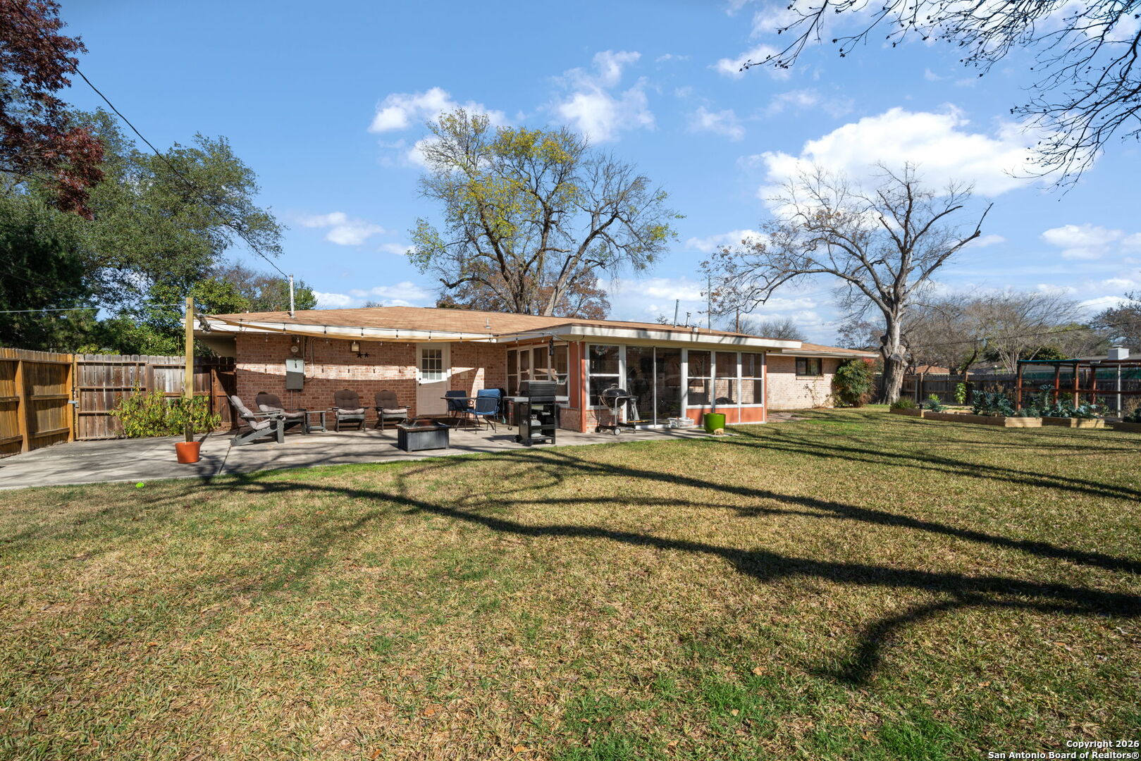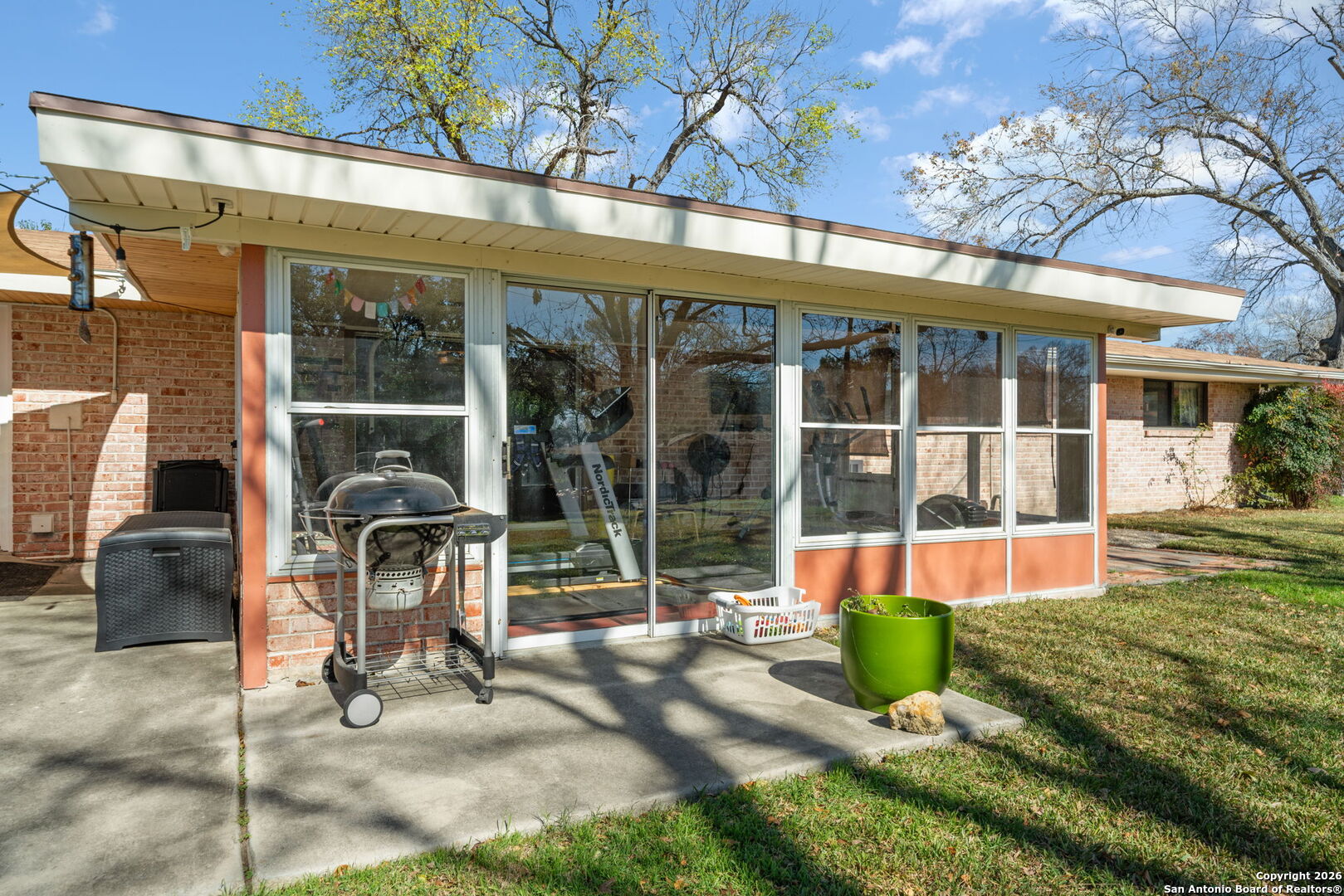 Welcome to this truly stylish single-story home located in one of San Antonio's most cherished communities, Windcrest. Situated on an oversized corner lot of +/- 0.377 acres, this property is surrounded by mature trees and lush landscaping, offering exceptional space, privacy, and a distinctive architectural style that truly sets it apart. Upon entry, you are welcomed by a bright, open floor plan with a front living area highlighted by a striking brick feature wall that creates a warm and inviting atmosphere. The thoughtfully designed kitchen features granite countertops, stainless steel appliances, a breakfast bar, and generous cabinet and counter space, making it ideal for both everyday living and entertaining. The primary bedroom offers a peaceful view of the backyard and includes a private, updated ensuite with a single vanity and walk-in shower. Two generously sized secondary bedrooms are complemented by an updated secondary bathroom with a tub & shower combination. A large utility room with a sink provides outstanding storage and added functionality. The enclosed sunroom currently serves as a home gym but easily functions as an additional living area, game room, or flexible space to suit your needs. Step outside to the expansive backyard where you will find a large patio, mature shade trees, a vegetable garden, and Tuff Shed, creating the perfect setting for outdoor relaxation or entertaining. This home offers a rare combination of lot size, character, and versatility within an established community. Enjoy nearby parks, walking trails, a top-rated golf course, and the quiet, welcoming atmosphere that makes Windcrest so special. Schedule your private showing today and experience everything this exceptional property has to offer.