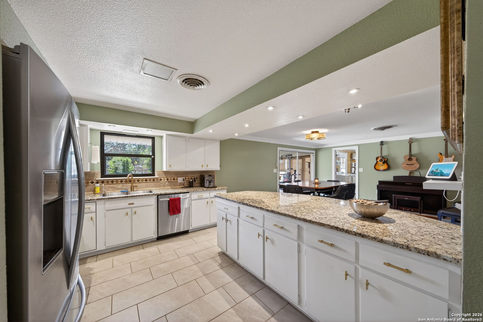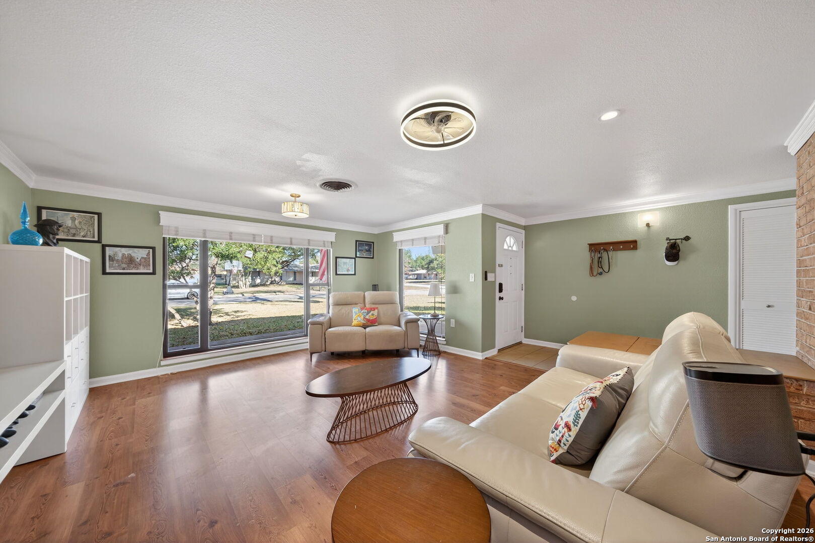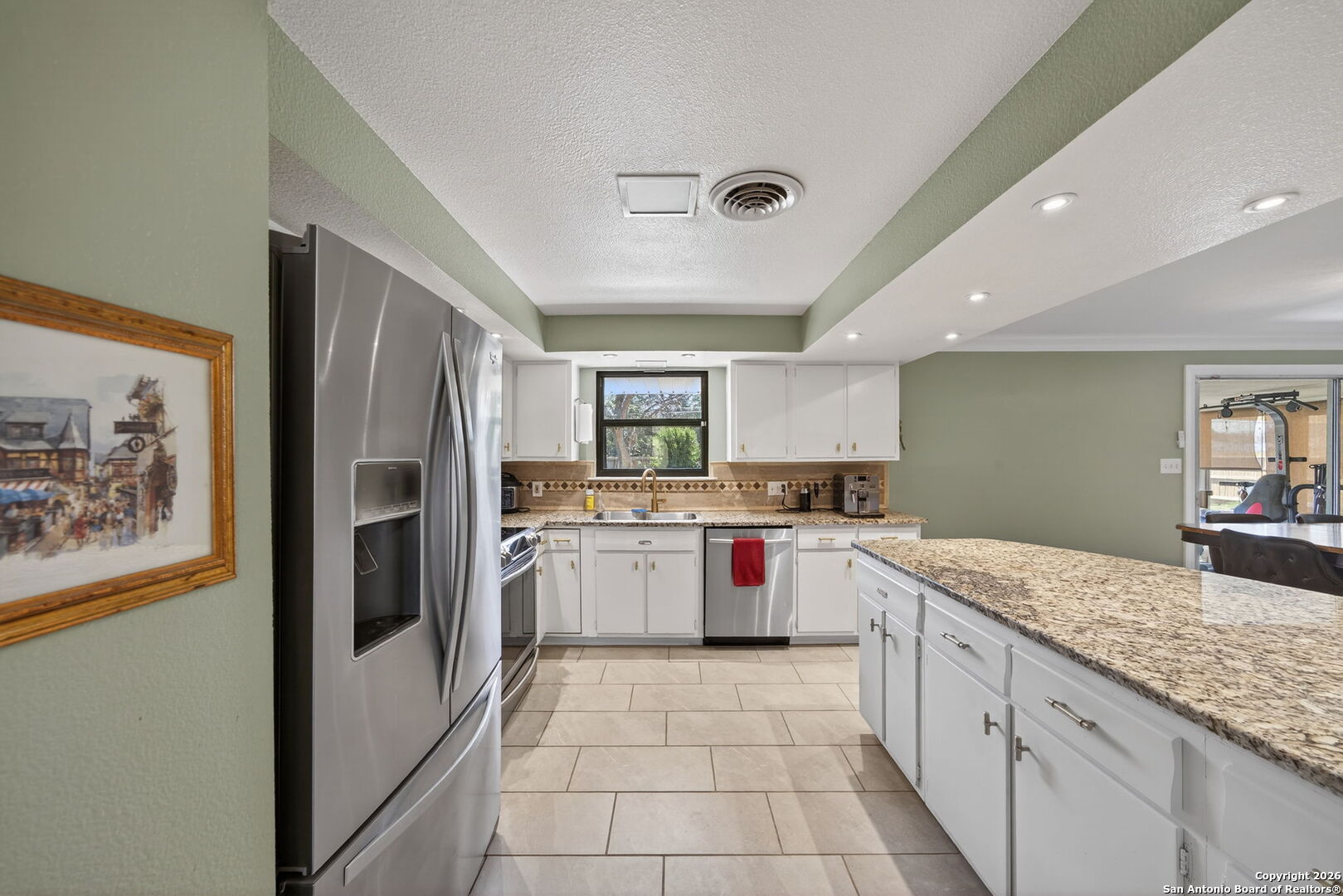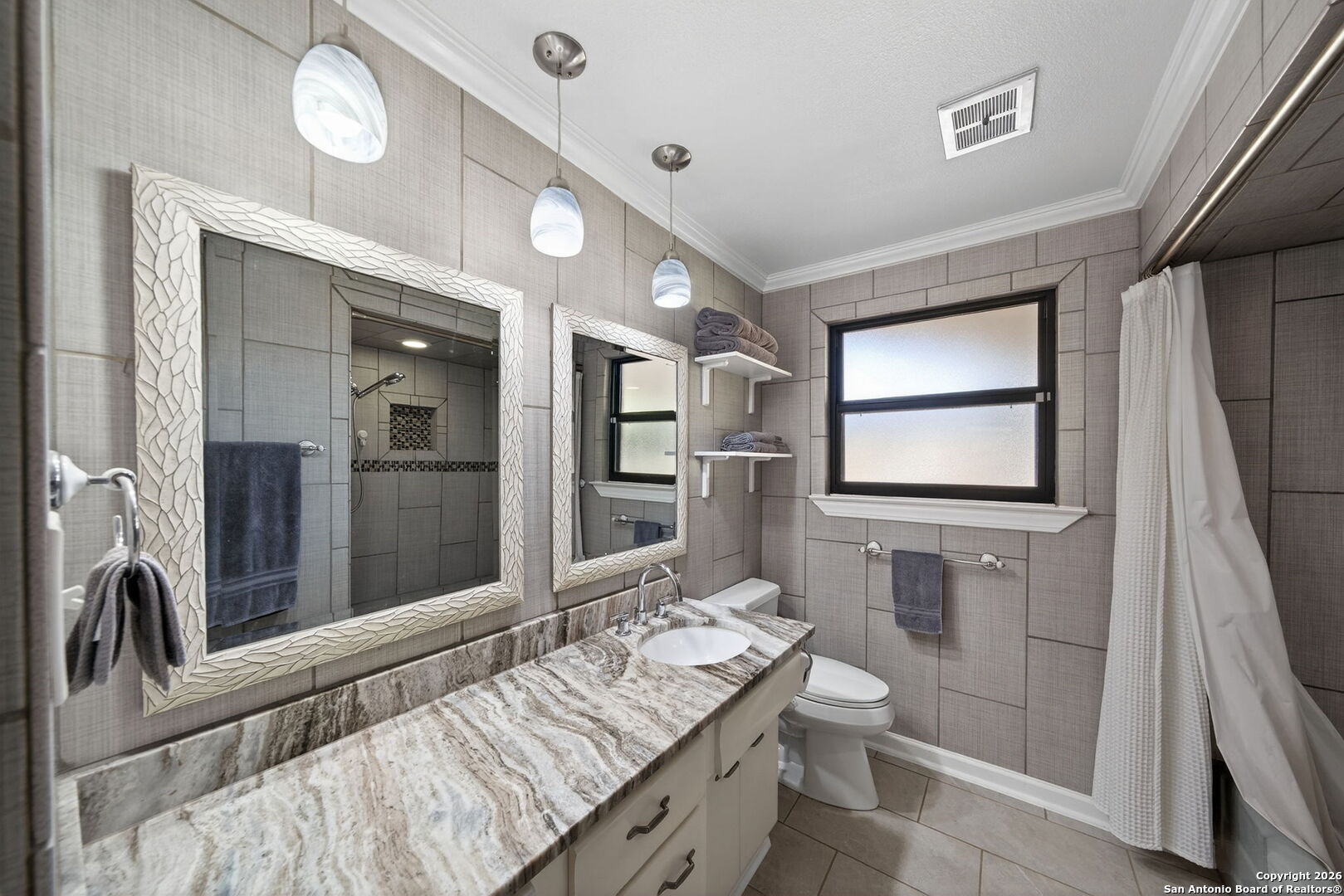Welcome to this truly stylish single-story home located in one of San Antonio's most cherished communities, Windcrest. Situated on an oversized corner lot of +/- 0.377 acres, this property is surrounded by mature trees and lush landscaping, offering exceptional space, privacy, and a distinctive architectural style that truly sets it apart. Upon entry, you are welcomed by a bright, open floor plan with a front living area highlighted by a striking brick feature wall that creates a warm and inviting atmosphere. The thoughtfully designed kitchen features granite countertops, stainless steel appliances, a breakfast bar, and generous cabinet and counter space, making it ideal for both everyday living and entertaining. The primary bedroom offers a peaceful view of the backyard and includes a private, updated ensuite with a single vanity and walk-in shower. Two generously sized secondary bedrooms are complemented by an updated secondary bathroom with a tub & shower combination. A large utility room with a sink provides outstanding storage and added functionality. The enclosed sunroom currently serves as a home gym but easily functions as an additional living area, game room, or flexible space to suit your needs. Step outside to the expansive backyard where you will find a large patio, mature shade trees, a vegetable garden, and Tuff Shed, creating the perfect setting for outdoor relaxation or entertaining. This home offers a rare combination of lot size, character, and versatility within an established community. Enjoy nearby parks, walking trails, a top-rated golf course, and the quiet, welcoming atmosphere that makes Windcrest so special. Schedule your private showing today and experience everything this exceptional property has to offer.