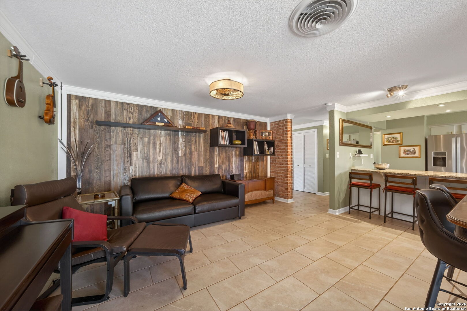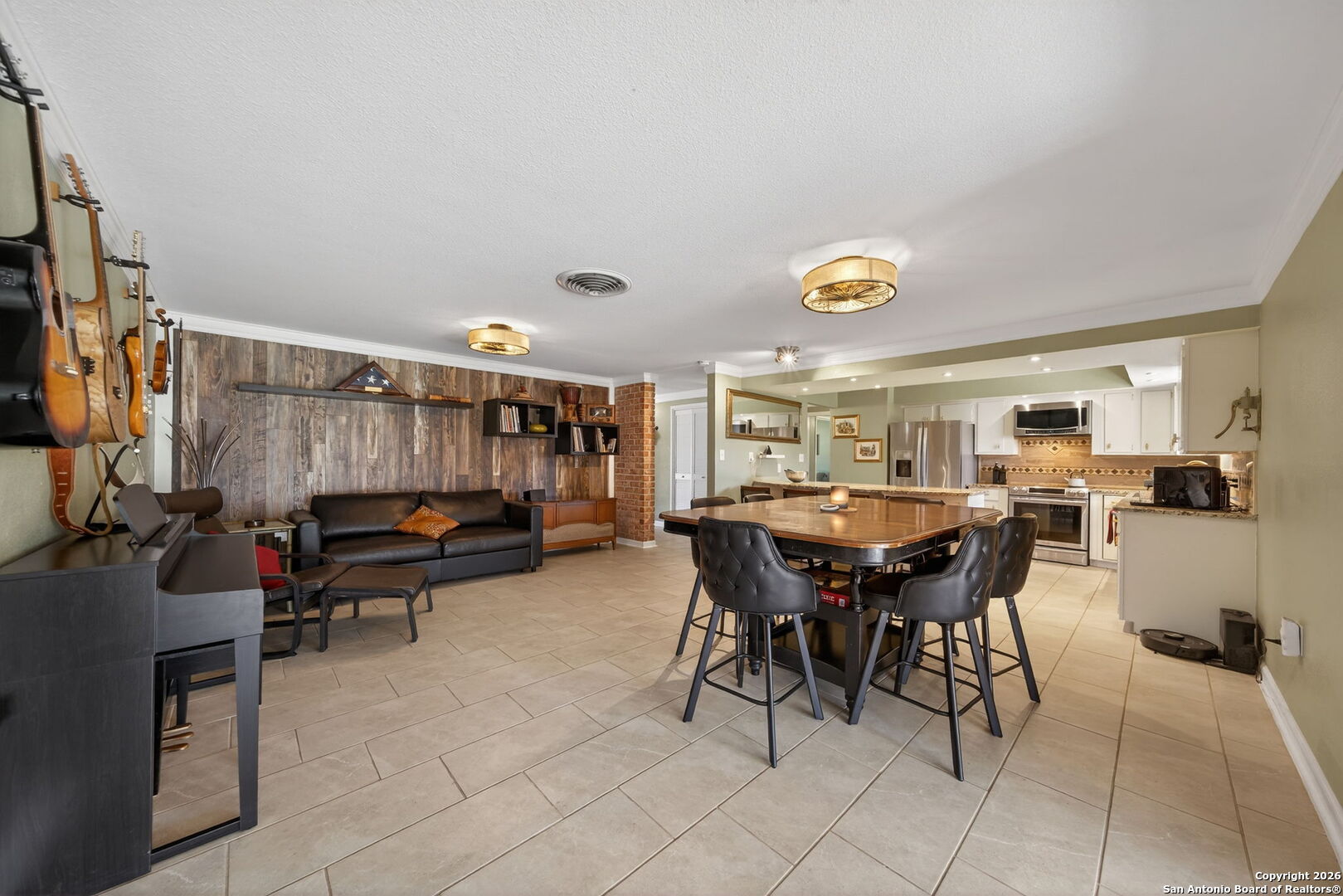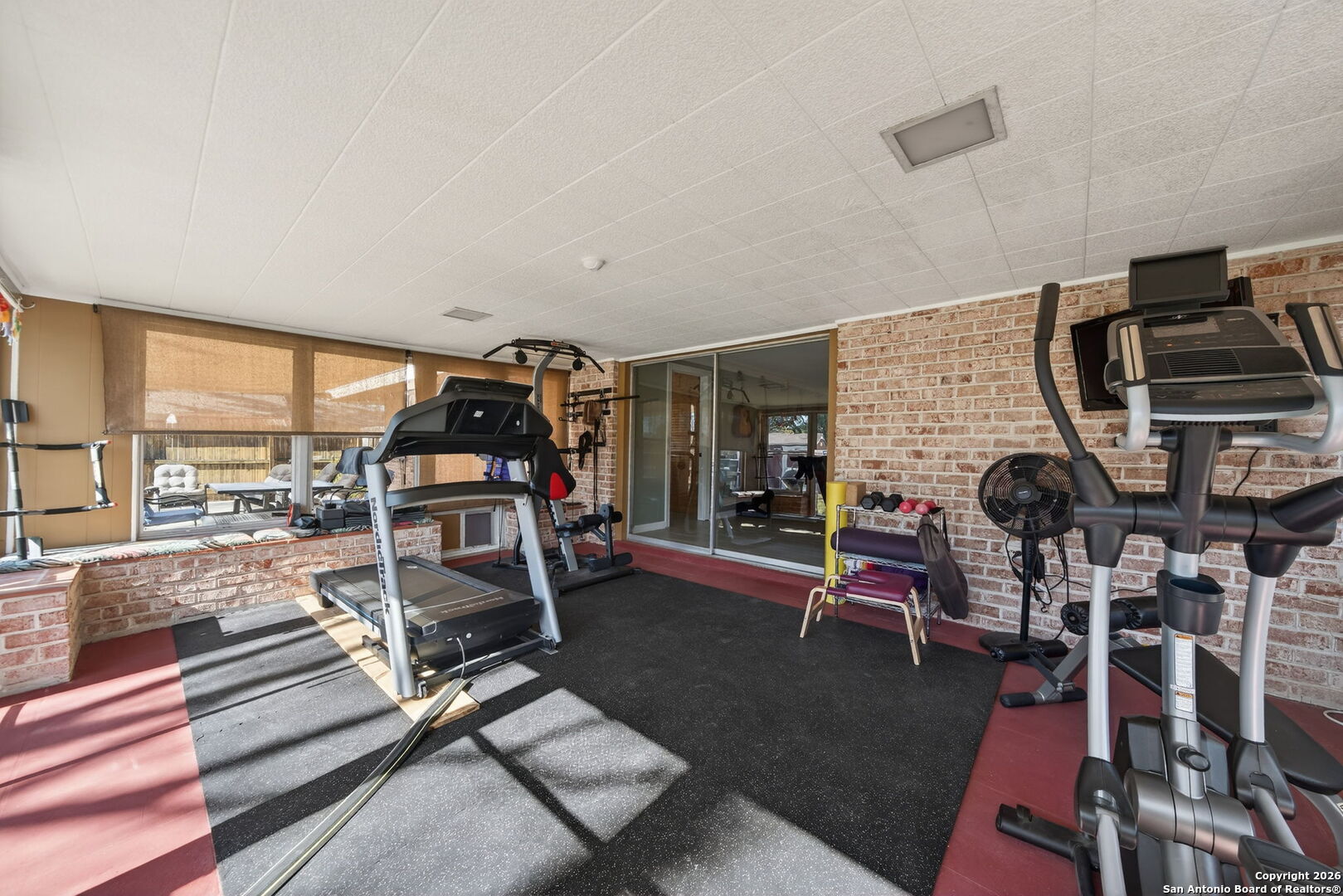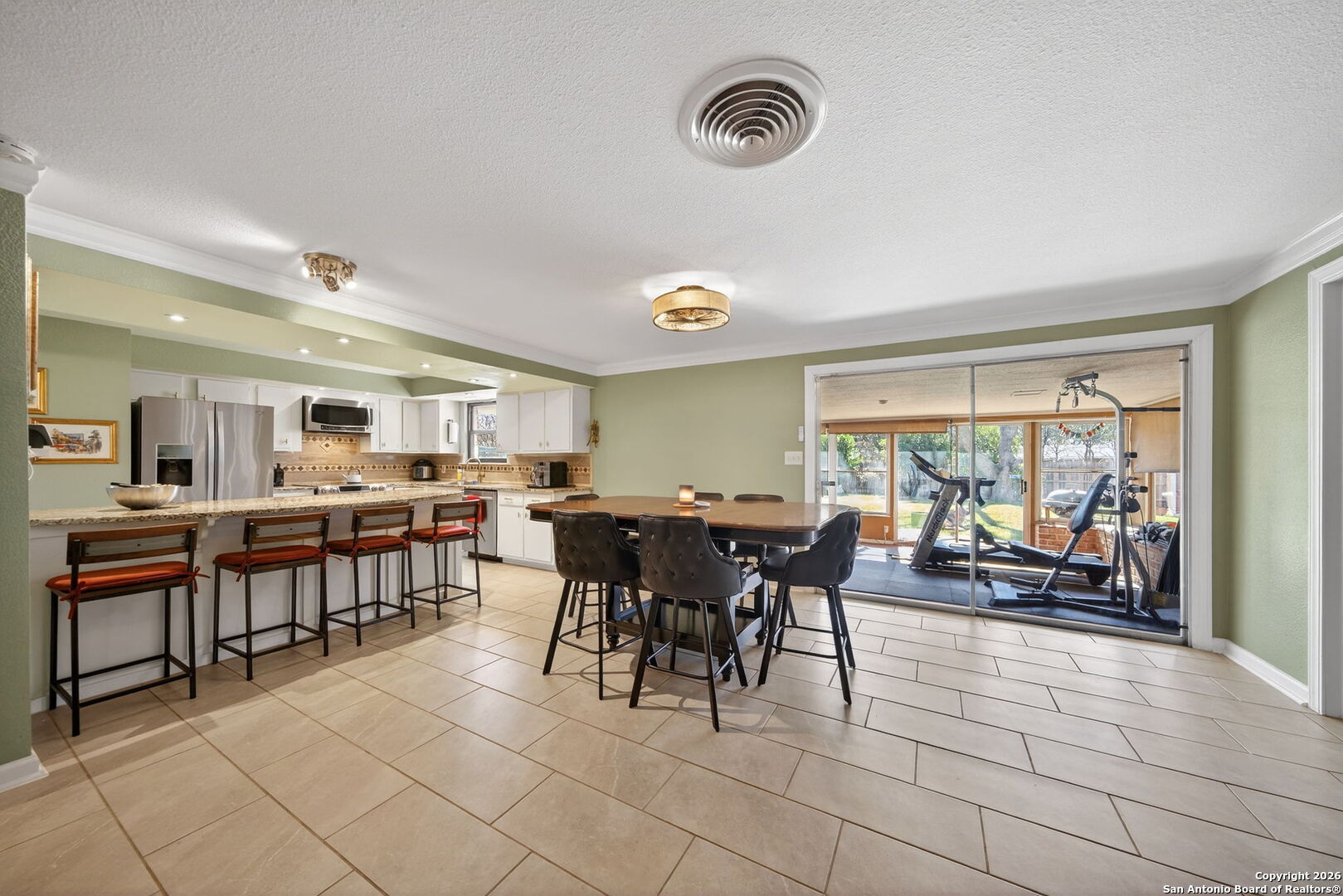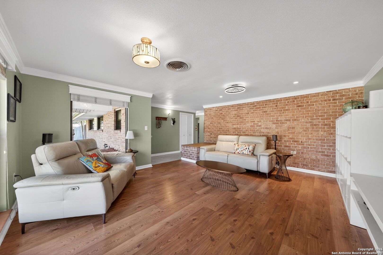 Welcome to this truly stylish single-story home located in one of San Antonio's most cherished communities, Windcrest. Situated on an oversized corner lot of +/- 0.377 acres, this property is surrounded by mature trees and lush landscaping, offering exceptional space, privacy, and a distinctive architectural style that truly sets it apart. Upon entry, you are welcomed by a bright, open floor plan with a front living area highlighted by a striking brick feature wall that creates a warm and inviting atmosphere. The thoughtfully designed kitchen features granite countertops, stainless steel appliances, a breakfast bar, and generous cabinet and counter space, making it ideal for both everyday living and entertaining. The primary bedroom offers a peaceful view of the backyard and includes a private, updated ensuite with a single vanity and walk-in shower. Two generously sized secondary bedrooms are complemented by an updated secondary bathroom with a tub & shower combination. A large utility room with a sink provides outstanding storage and added functionality. The enclosed sunroom currently serves as a home gym but easily functions as an additional living area, game room, or flexible space to suit your needs. Step outside to the expansive backyard where you will find a large patio, mature shade trees, a vegetable garden, and Tuff Shed, creating the perfect setting for outdoor relaxation or entertaining. This home offers a rare combination of lot size, character, and versatility within an established community. Enjoy nearby parks, walking trails, a top-rated golf course, and the quiet, welcoming atmosphere that makes Windcrest so special. Schedule your private showing today and experience everything this exceptional property has to offer.