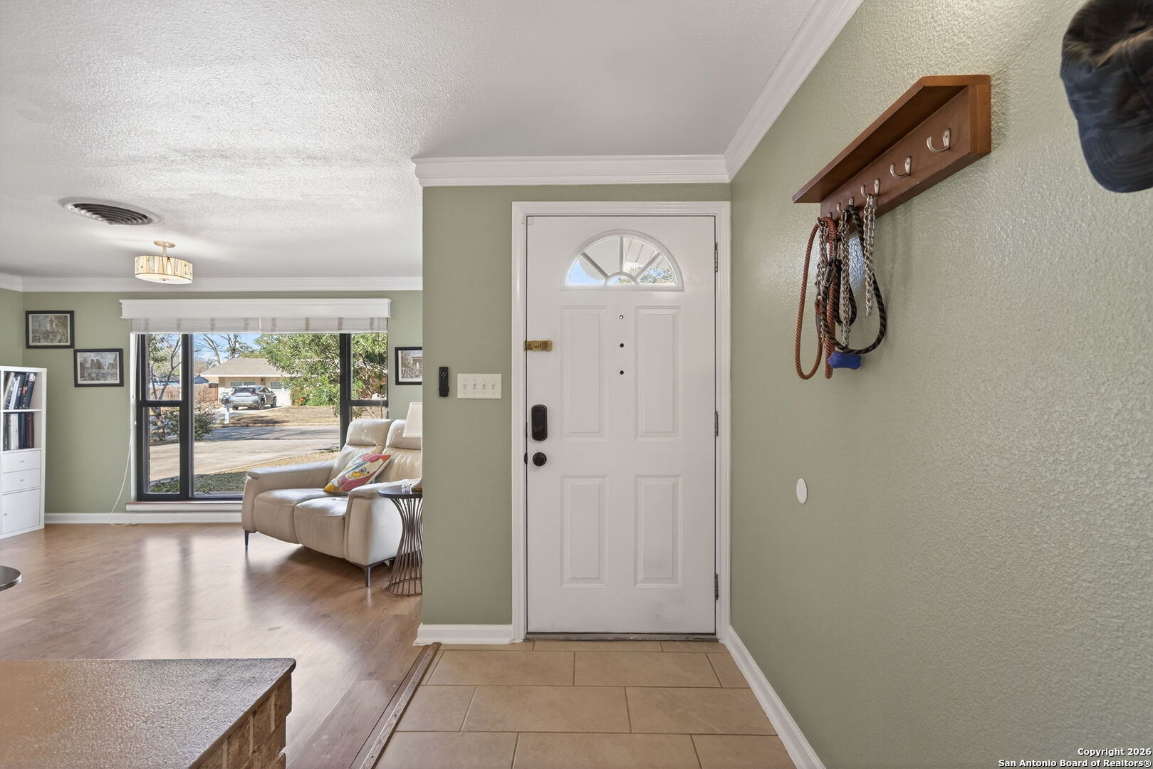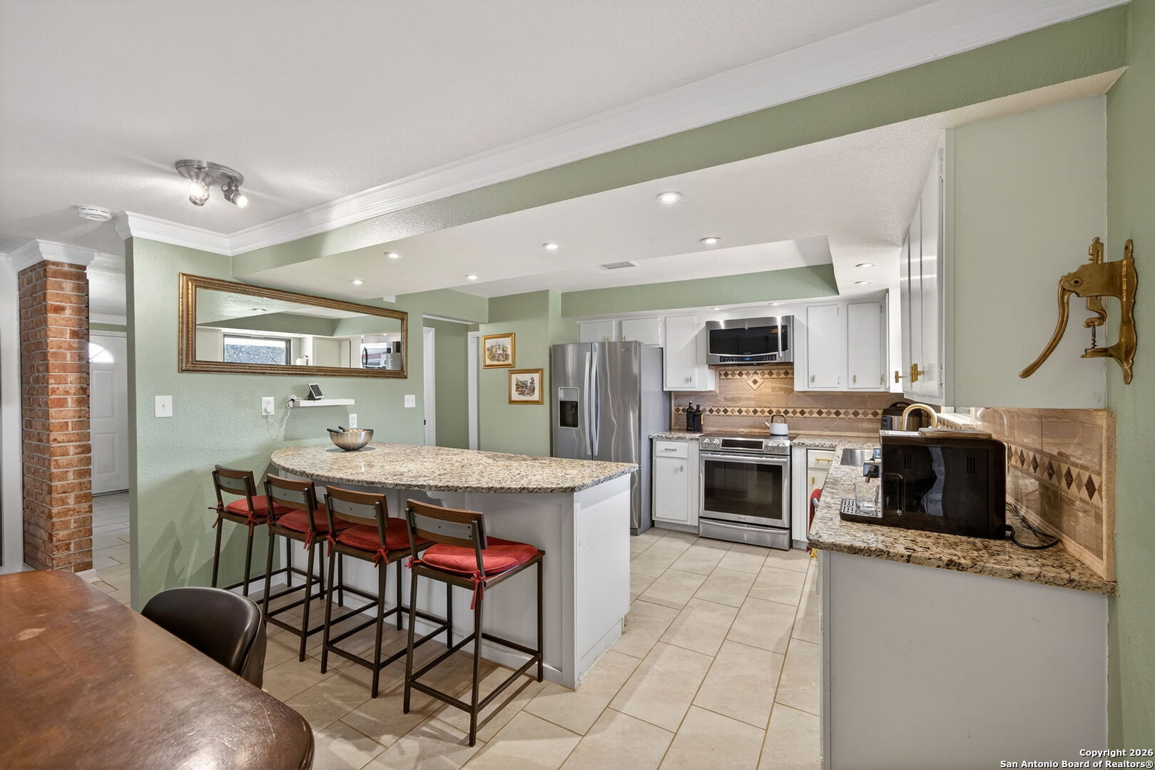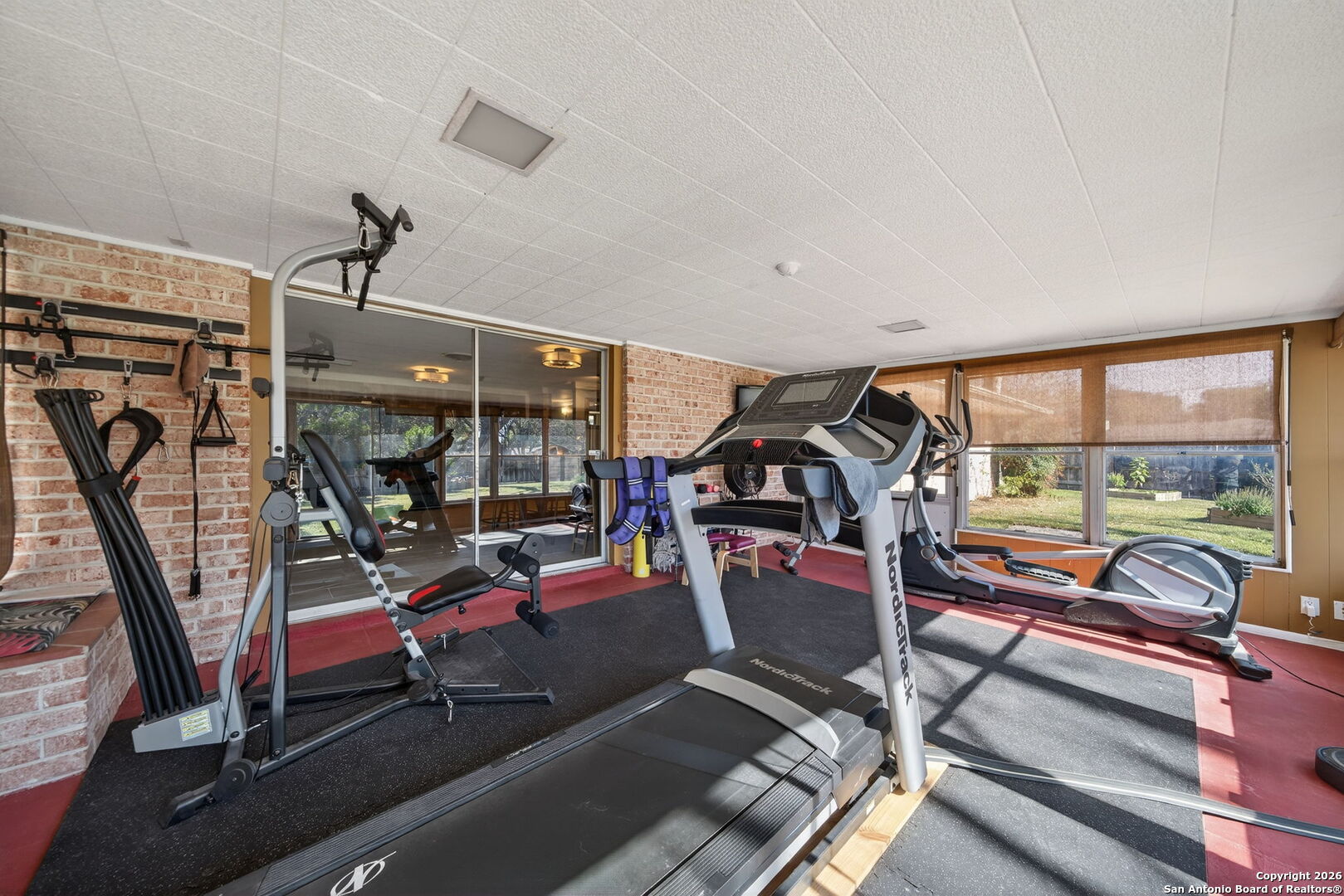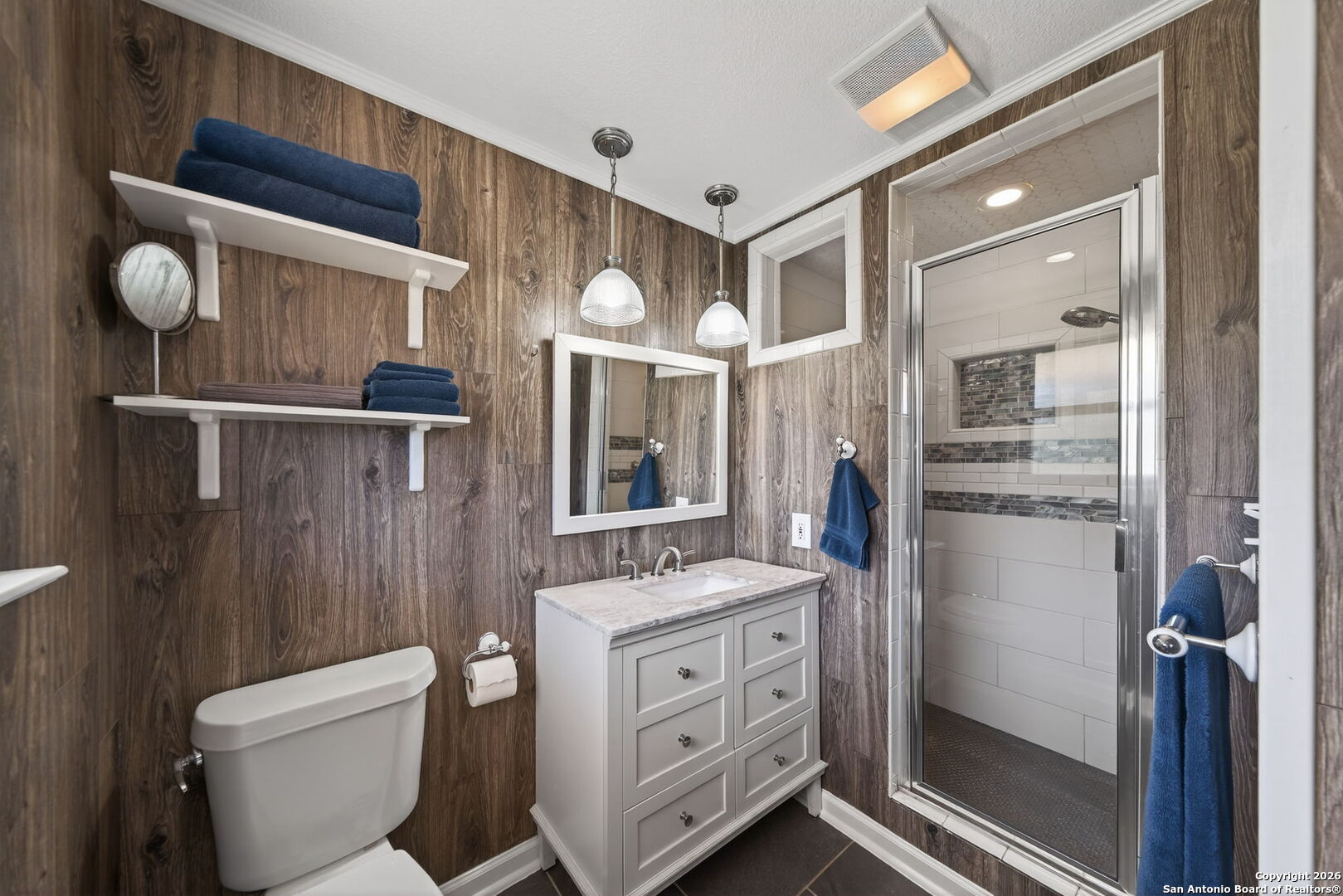 Welcome to this truly stylish single-story home located in one of San Antonio's most cherished communities, Windcrest. Situated on an oversized corner lot of +/- 0.377 acres, this property is surrounded by mature trees and lush landscaping, offering exceptional space, privacy, and a distinctive architectural style that truly sets it apart. Upon entry, you are welcomed by a bright, open floor plan with a front living area highlighted by a striking brick feature wall that creates a warm and inviting atmosphere. The thoughtfully designed kitchen features granite countertops, stainless steel appliances, a breakfast bar, and generous cabinet and counter space, making it ideal for both everyday living and entertaining. The primary bedroom offers a peaceful view of the backyard and includes a private, updated ensuite with a single vanity and walk-in shower. Two generously sized secondary bedrooms are complemented by an updated secondary bathroom with a tub & shower combination. A large utility room with a sink provides outstanding storage and added functionality. The enclosed sunroom currently serves as a home gym but easily functions as an additional living area, game room, or flexible space to suit your needs. Step outside to the expansive backyard where you will find a large patio, mature shade trees, a vegetable garden, and Tuff Shed, creating the perfect setting for outdoor relaxation or entertaining. This home offers a rare combination of lot size, character, and versatility within an established community. Enjoy nearby parks, walking trails, a top-rated golf course, and the quiet, welcoming atmosphere that makes Windcrest so special. Schedule your private showing today and experience everything this exceptional property has to offer.