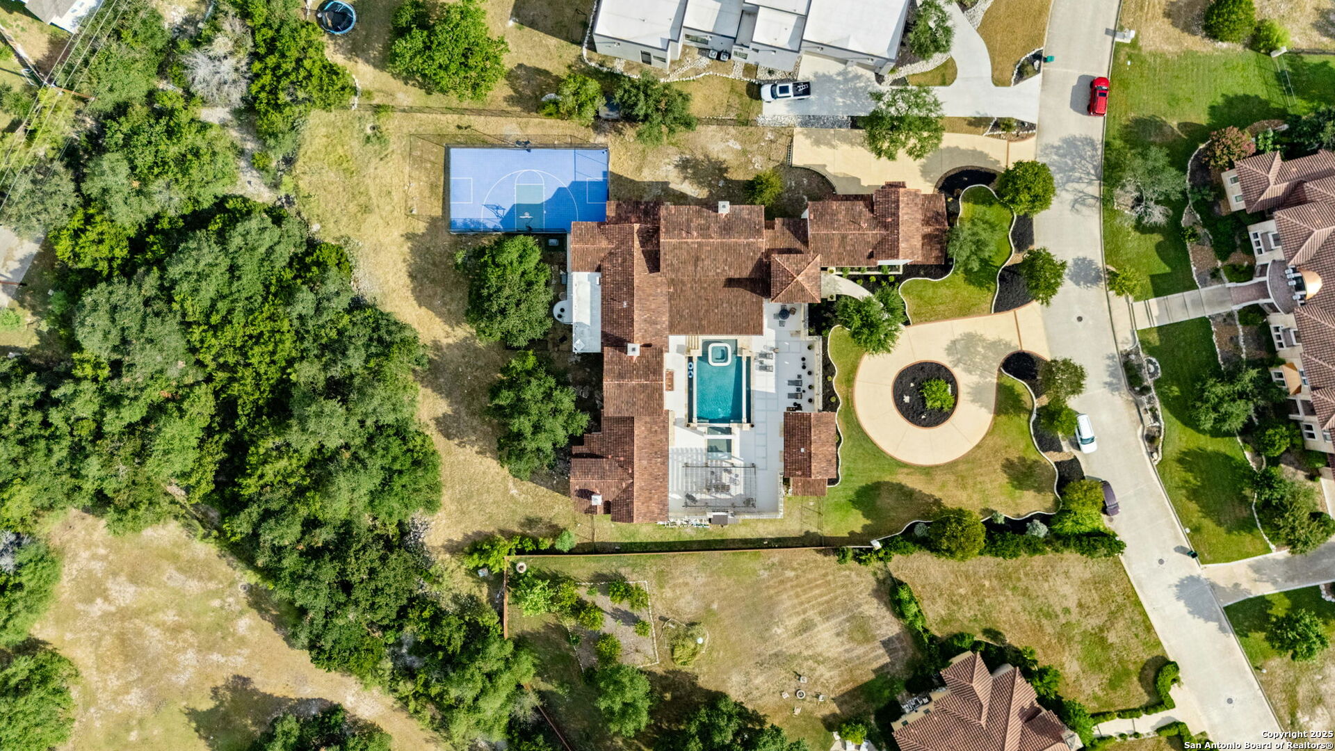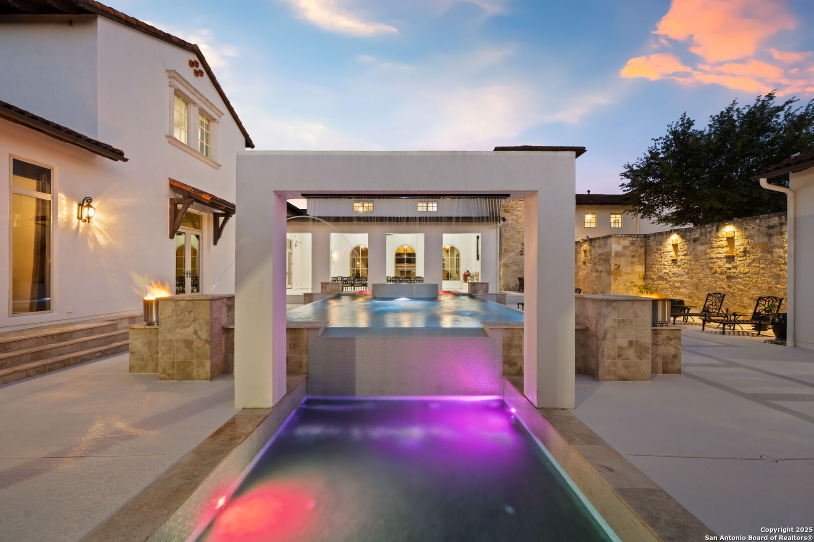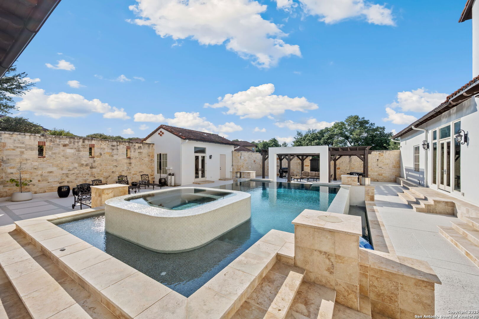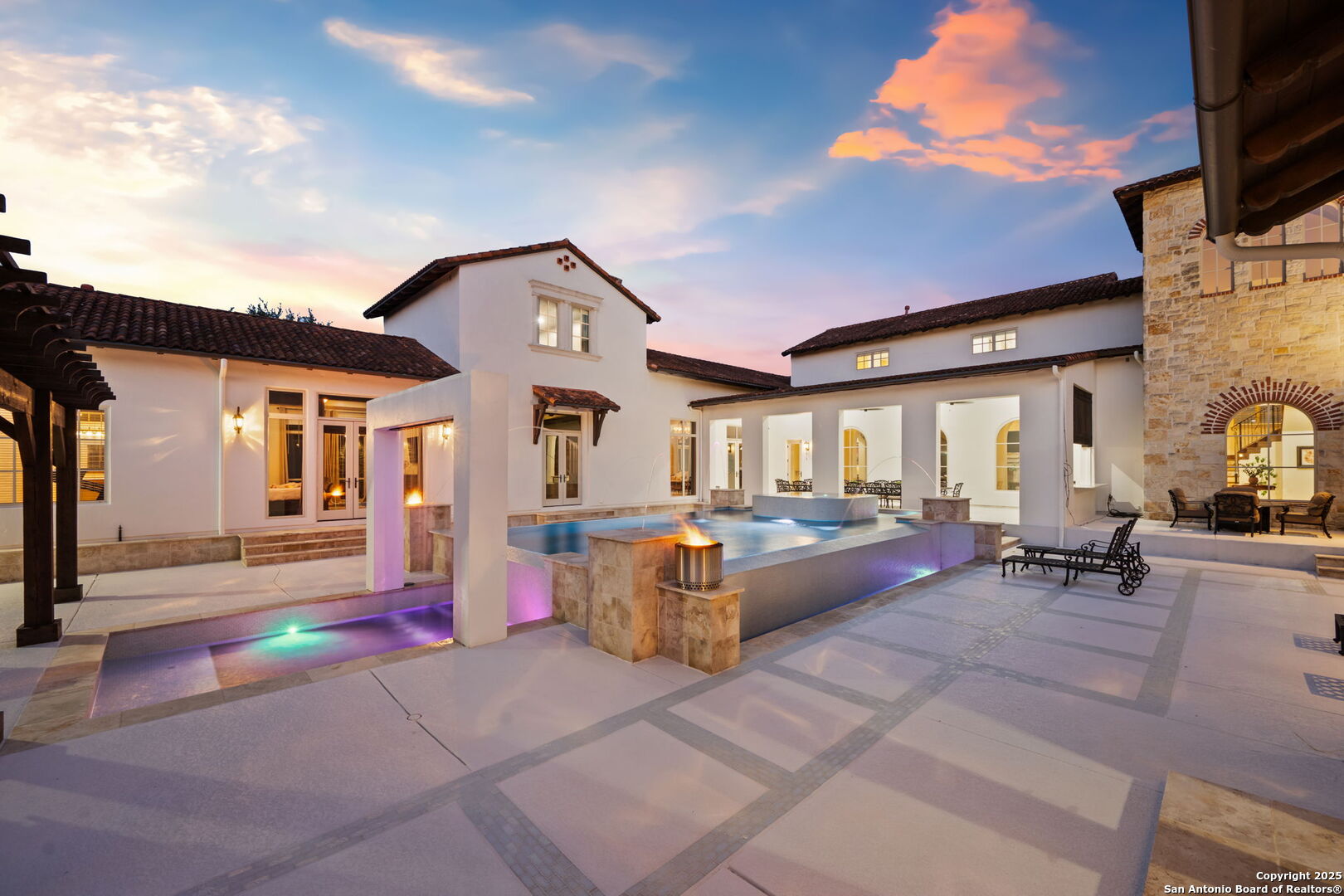Set on nearly 1.5 acres within the guard-gated community of Waterford Heights, this magnificent residence offers nearly 8,000 square feet of timeless design and luxurious living. From the moment you arrive, the circular drive and stone facade set the tone for a home that is as impressive as it is welcoming. The centerpiece of the home is the stunning courtyard featuring a showstopping infinity edge pool, designed as a private oasis surrounded by the residence (Seriously you have not seen a pool like this before!). Several elegant water features create a serene ambiance, while multiple seating areas offer the perfect backdrop for entertaining or quiet relaxation. With the addition of a fully equipped outdoor kitchen and a dedicated sports court, the backyard blends luxury and lifestyle seamlessly. From the courtyard, you'll also find access to the detached casita, complete with a full bath and walk in closet. This additional living space is ideal for in-laws, guests, or staff quarters, providing both comfort and privacy. The heart of the home is the chef's kitchen, anchored by a 6-burner Wolf gas range and griddle, dual islands, Sub Zero fridge, Wolf warming drawer, and a butler's kitchen with additional prep space and dishwasher, perfect for entertaining at any scale. An enclosed sunroom with its own outdoor fireplace offers a seamless transition from indoor to outdoor living. Designed for both comfort and elegance, the primary suite is split from the secondary bedrooms and offers direct access to the courtyard. The spa-like bathroom includes dual vanities, dual water closets, a soaking tub with a fireplace, walk-in shower and a generously sized walk-in closet with custom built-ins providing exceptional organization and storage. Located within the primary suite is an additional flex space perfect for an at home gym. Directly outside the primary suite you'll find the private office with direct access to the pool and courtyard area. Upstairs, a spacious gameroom, media room, and three additional bedrooms with en suite baths ensure everyone has their own space. With 5 bedrooms, 5.5 baths, a 3-car garage pre-wired for charging electric vehicles, and an array of thoughtfully designed living spaces, this home balances grand scale with intimate charm. This estate is not just a home, it's a lifestyle, blending privacy, luxury, and community in one of San Antonio's most prestigious neighborhoods. A truly unique property in the heart of Stone Oak that has it all.