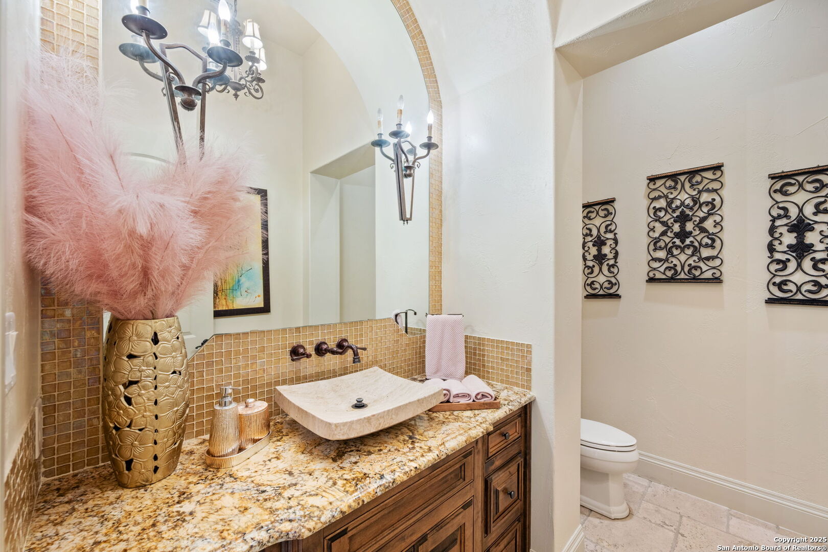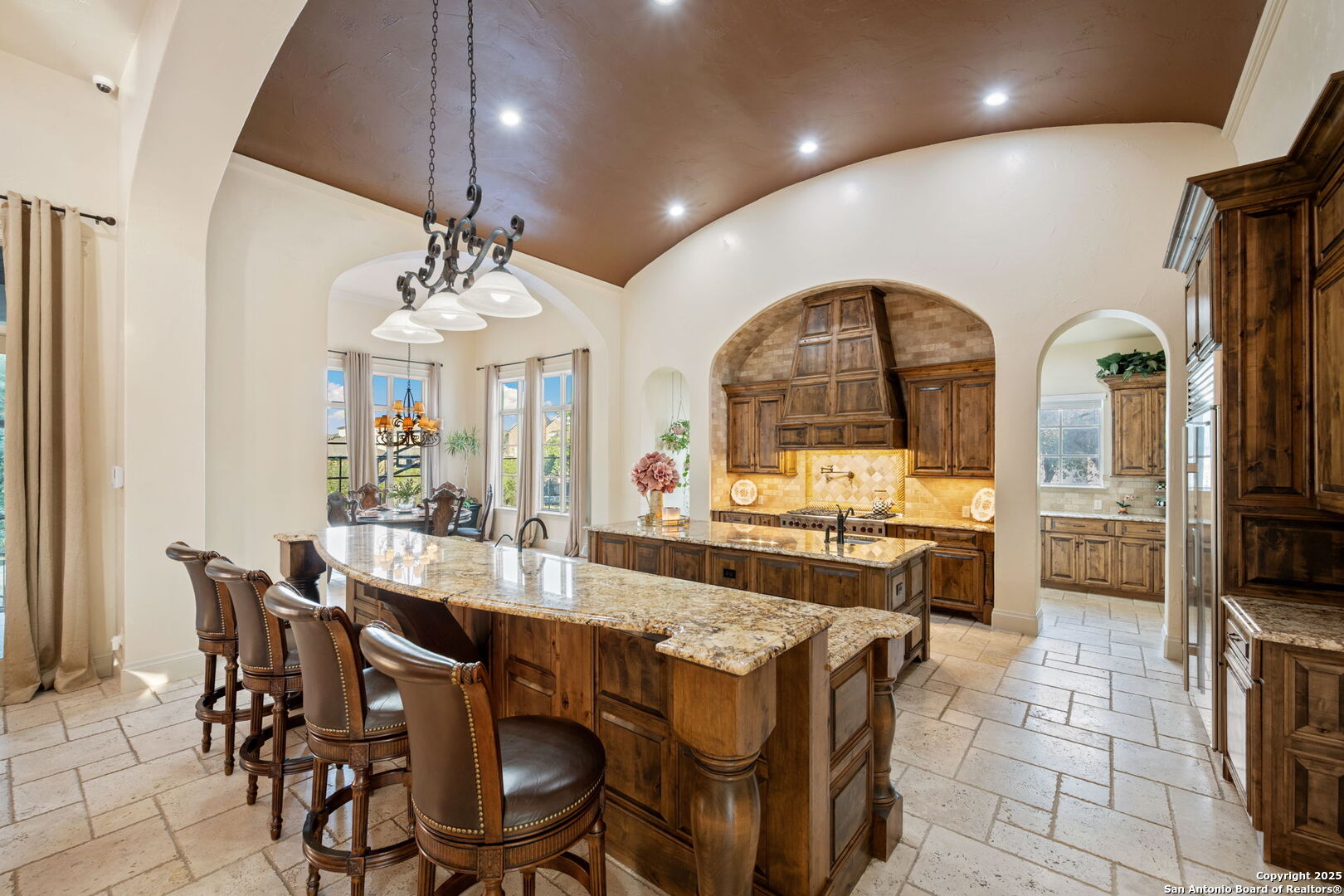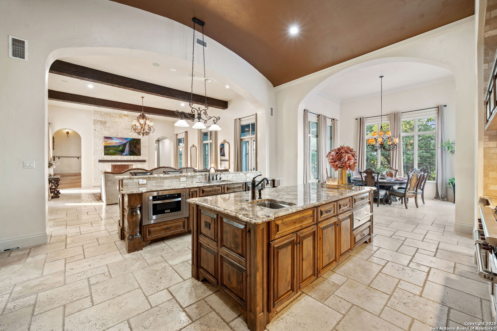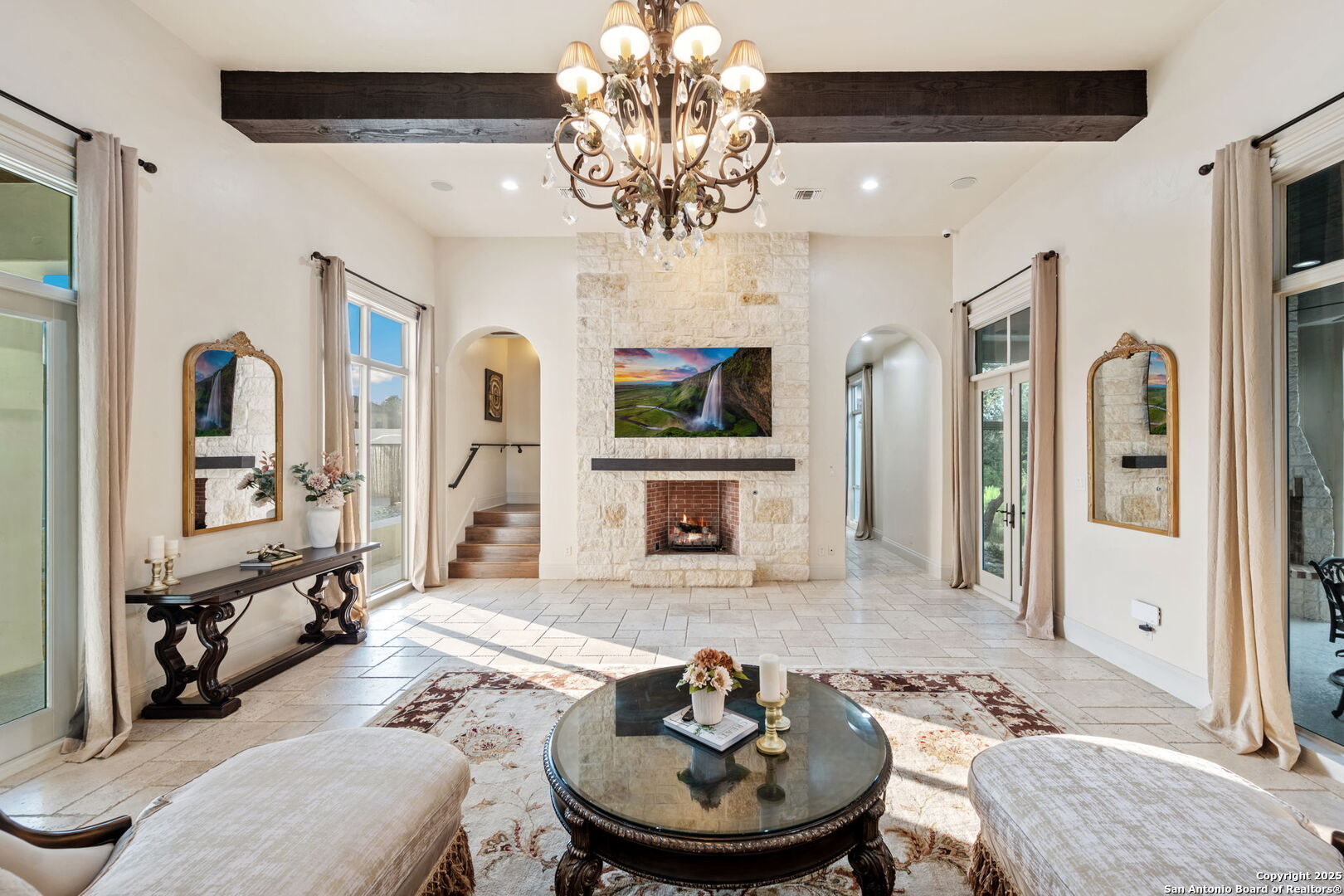 Set on nearly 1.5 acres within the guard-gated community of Waterford Heights, this magnificent residence offers nearly 8,000 square feet of timeless design and luxurious living. From the moment you arrive, the circular drive and stone facade set the tone for a home that is as impressive as it is welcoming. The centerpiece of the home is the stunning courtyard featuring a showstopping infinity edge pool, designed as a private oasis surrounded by the residence (Seriously you have not seen a pool like this before!). Several elegant water features create a serene ambiance, while multiple seating areas offer the perfect backdrop for entertaining or quiet relaxation. With the addition of a fully equipped outdoor kitchen and a dedicated sports court, the backyard blends luxury and lifestyle seamlessly. From the courtyard, you'll also find access to the detached casita, complete with a full bath and walk in closet. This additional living space is ideal for in-laws, guests, or staff quarters, providing both comfort and privacy. The heart of the home is the chef's kitchen, anchored by a 6-burner Wolf gas range and griddle, dual islands, Sub Zero fridge, Wolf warming drawer, and a butler's kitchen with additional prep space and dishwasher, perfect for entertaining at any scale. An enclosed sunroom with its own outdoor fireplace offers a seamless transition from indoor to outdoor living. Designed for both comfort and elegance, the primary suite is split from the secondary bedrooms and offers direct access to the courtyard. The spa-like bathroom includes dual vanities, dual water closets, a soaking tub with a fireplace, walk-in shower and a generously sized walk-in closet with custom built-ins providing exceptional organization and storage. Located within the primary suite is an additional flex space perfect for an at home gym. Directly outside the primary suite you'll find the private office with direct access to the pool and courtyard area. Upstairs, a spacious gameroom, media room, and three additional bedrooms with en suite baths ensure everyone has their own space. With 5 bedrooms, 5.5 baths, a 3-car garage pre-wired for charging electric vehicles, and an array of thoughtfully designed living spaces, this home balances grand scale with intimate charm. This estate is not just a home, it's a lifestyle, blending privacy, luxury, and community in one of San Antonio's most prestigious neighborhoods. A truly unique property in the heart of Stone Oak that has it all.