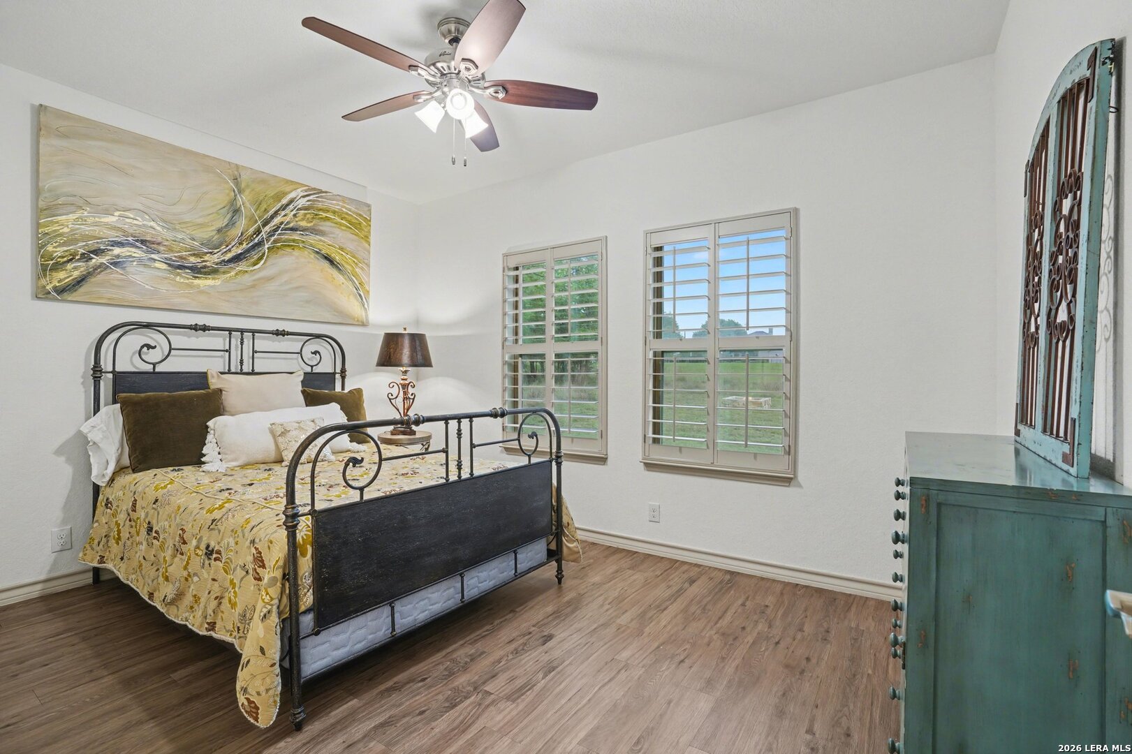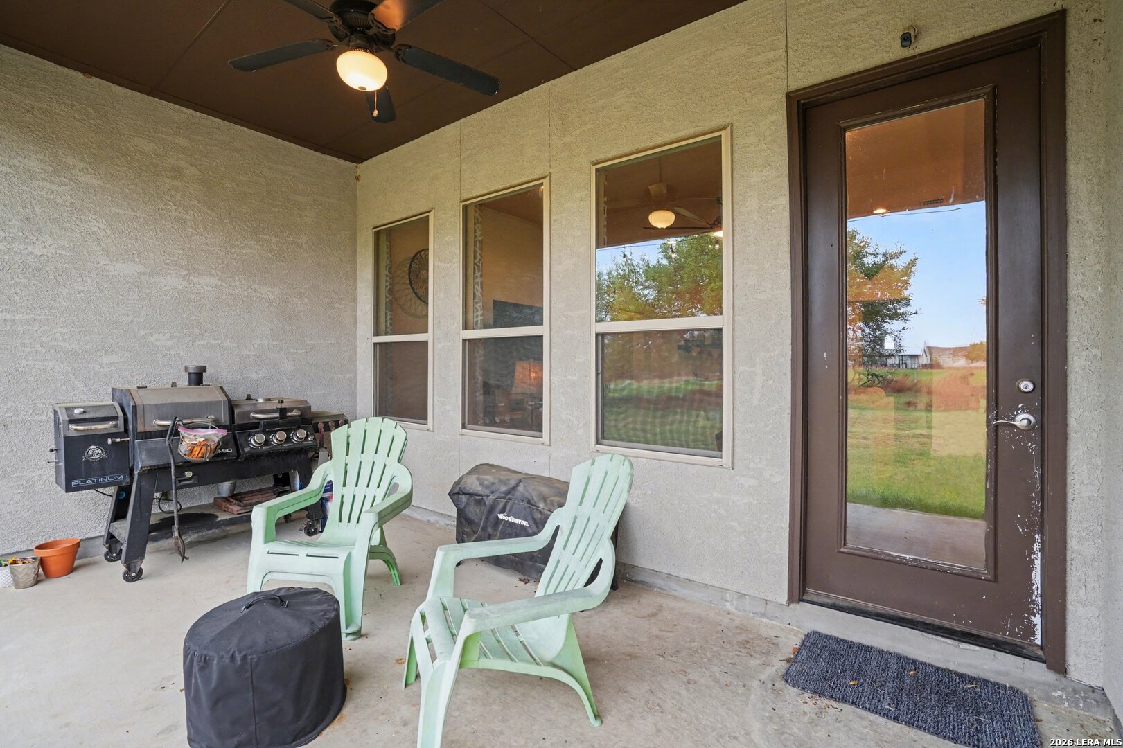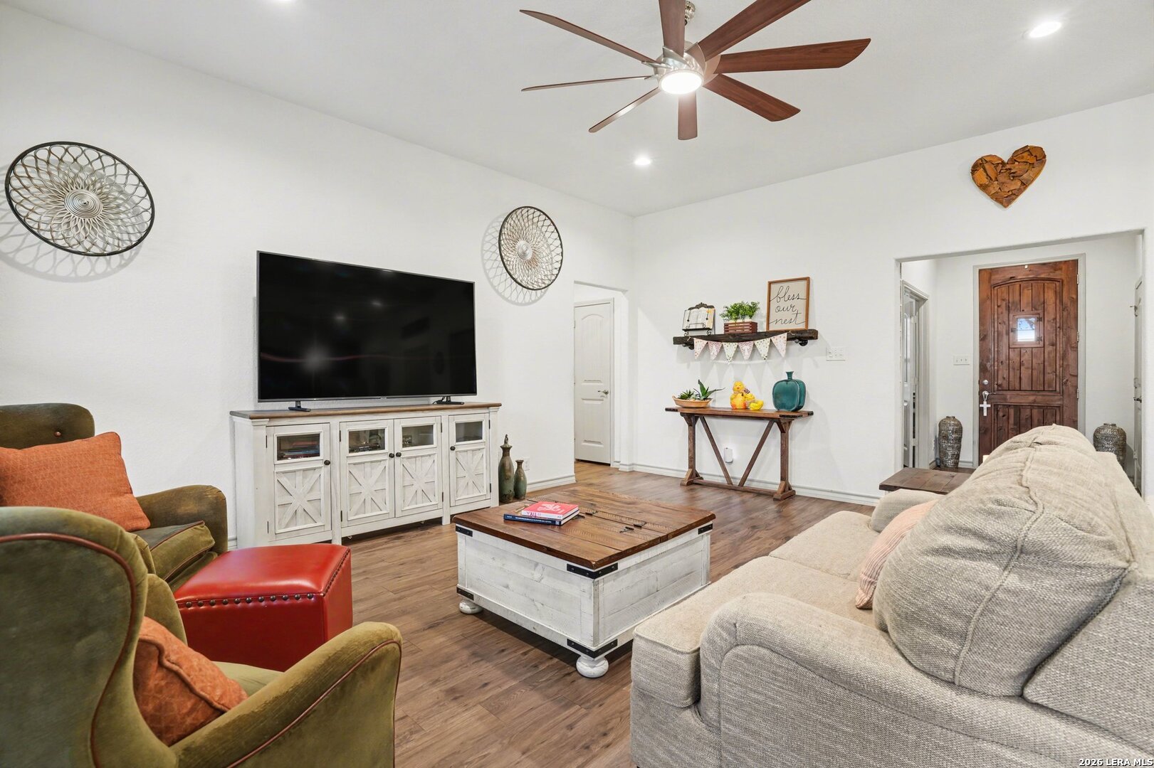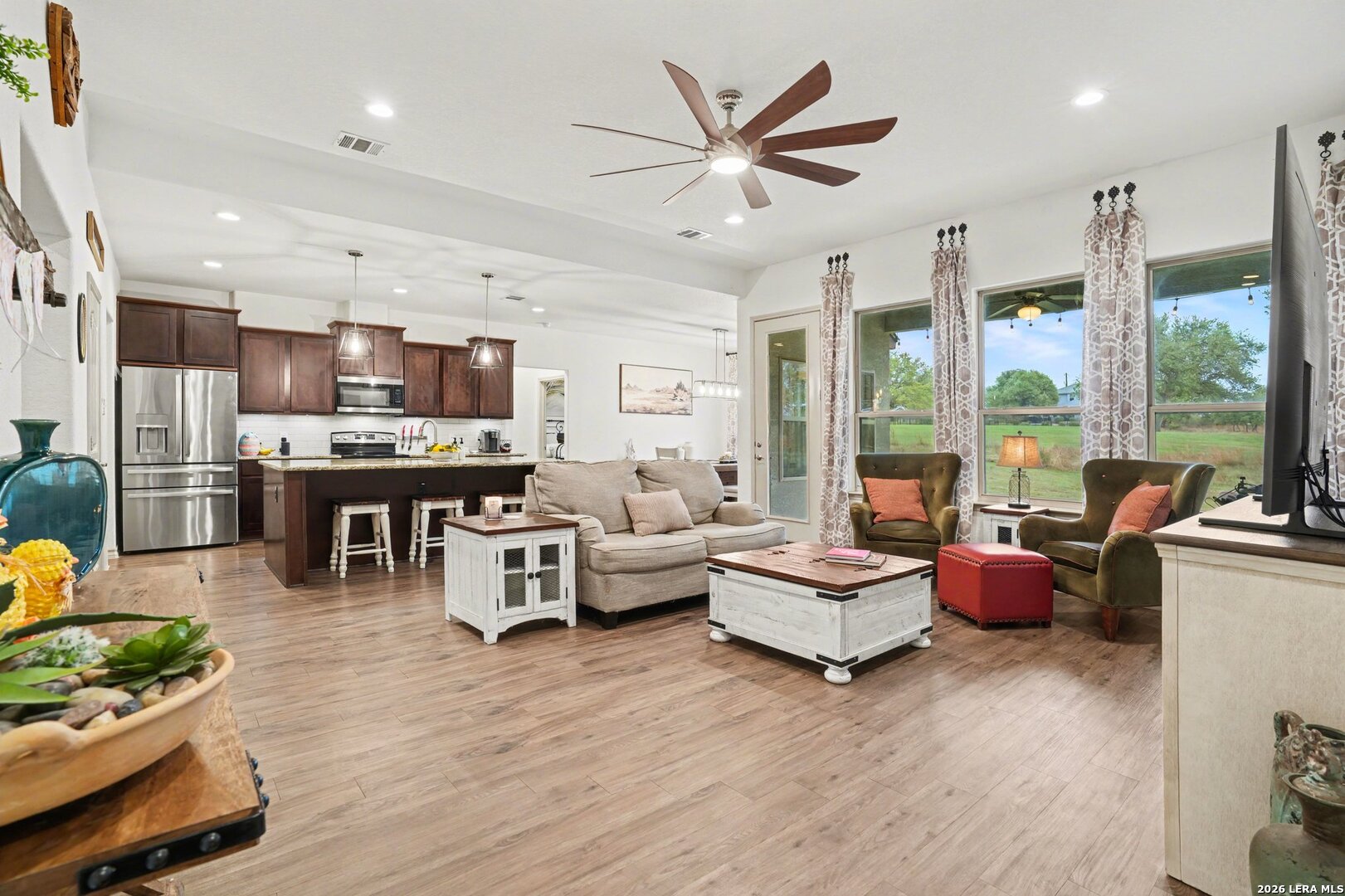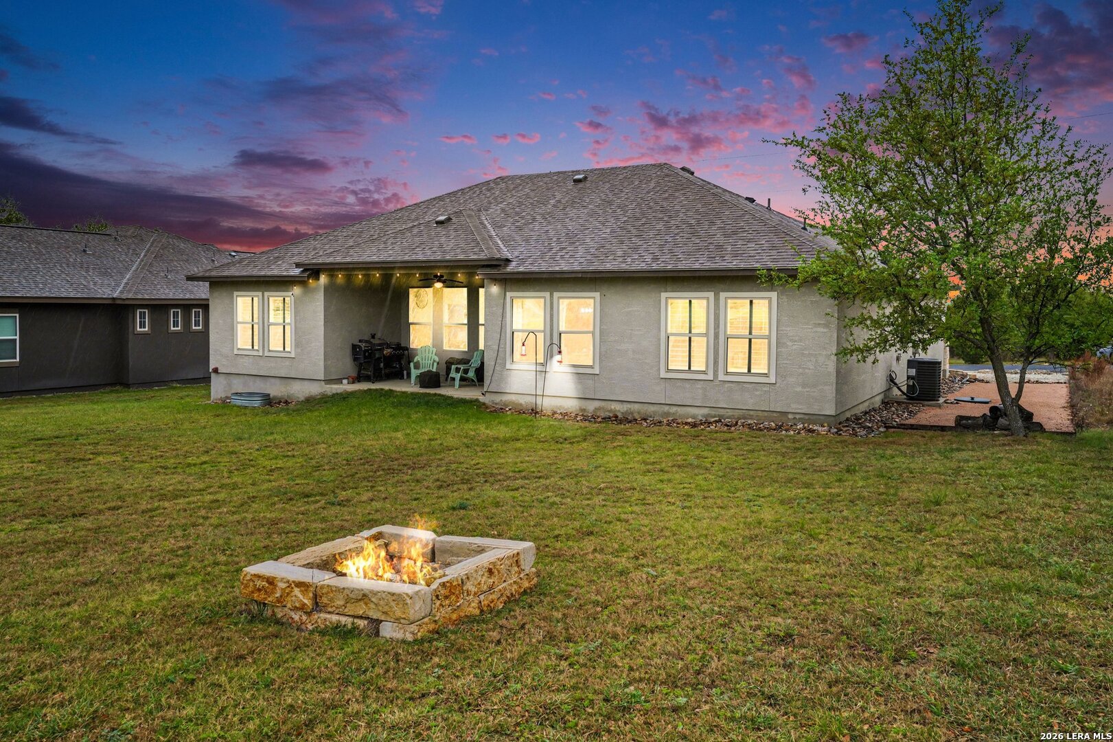 Refined Golf Course Living in Prestigious Rockin' J Ranch Welcome to an exceptional residence gracefully positioned along the 14th hole of the acclaimed Vaaler Creek Golf Course. Click the Virtual Tour link to experience the immersive 3D walkthrough. Built in 2019 and meticulously maintained by its original owners, this thoughtfully designed 4-bedroom, 2.5-bath home blends timeless elegance with modern comfort. The open-concept design is enhanced by soaring ceilings, expansive windows, and an abundance of natural light, creating an inviting yet sophisticated atmosphere throughout. At the heart of the home, the kitchen showcases granite countertops and effortless connectivity to the main living area-perfectly suited for both intimate gatherings and elevated entertaining. The primary suite serves as a private retreat, featuring refined recessed ceilings, an oversized walk-in shower, and dual walk-in closets designed for both function and luxury. Step outside to a covered patio where sweeping golf course views unfold-overlooking the tee box, fairway, and green from your elevated vantage point. The outdoor setting offers a rare sense of tranquility and openness, ideal for quiet evenings or hosting guests in style. Additional highlights include wood-look flooring throughout, curated finishes, a 2-car garage with extended depth for storage, and a fully fenced, professionally landscaped yard. Residents of Rockin' J Ranch enjoy a lifestyle of distinction with access to resort-style amenities including golf, a pool, fishing pier, scenic trails, parks, and clubhouse-all within close proximity to Blanco and a convenient drive to Austin and San Antonio. Select buyers may also benefit from exclusive financing incentives, including potential discounted rate options and no lender fee future refinancing (see Agent Remarks for details). Homes of this caliber, setting, and presentation are rarely available-schedule your private showing today.