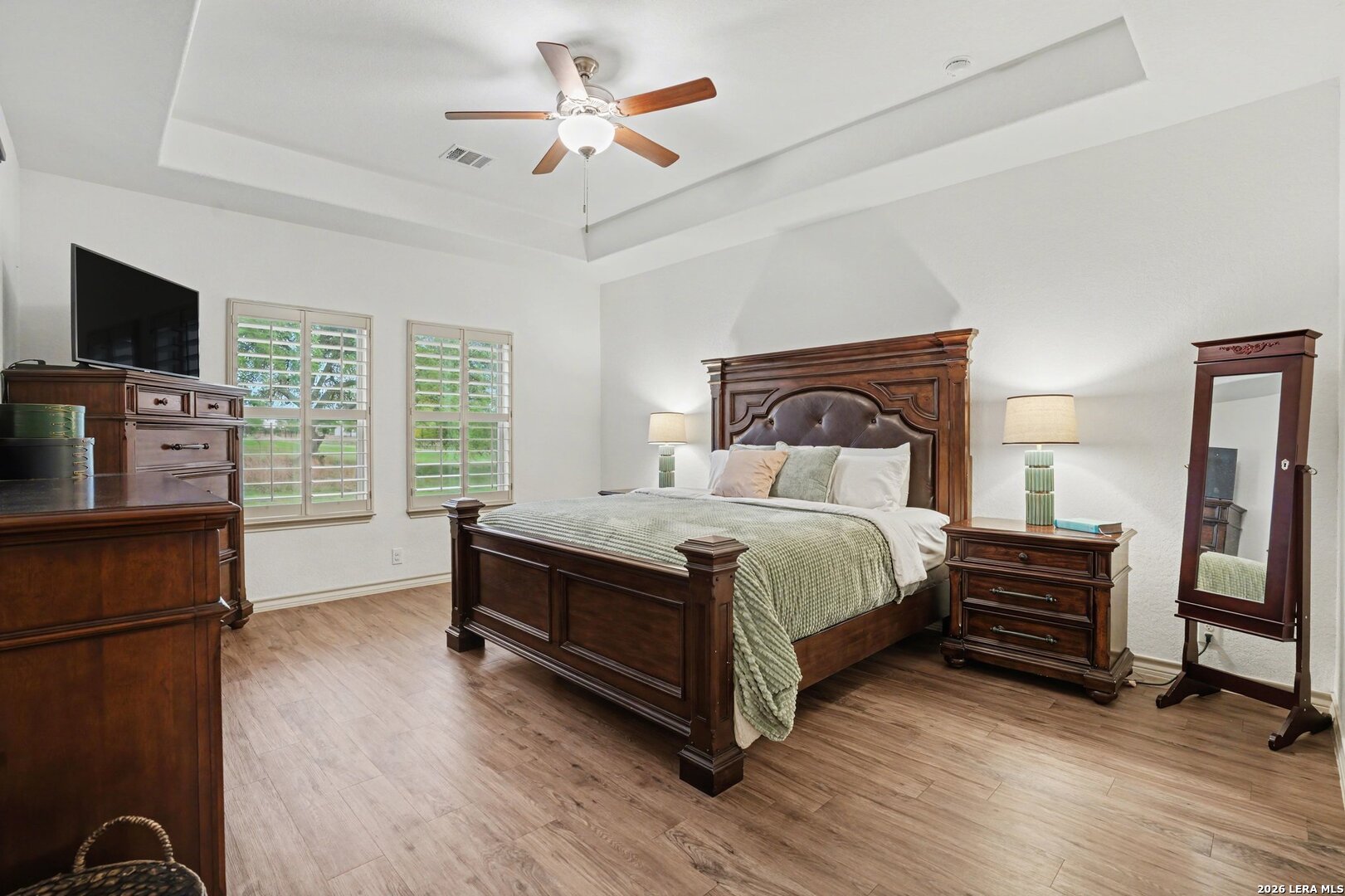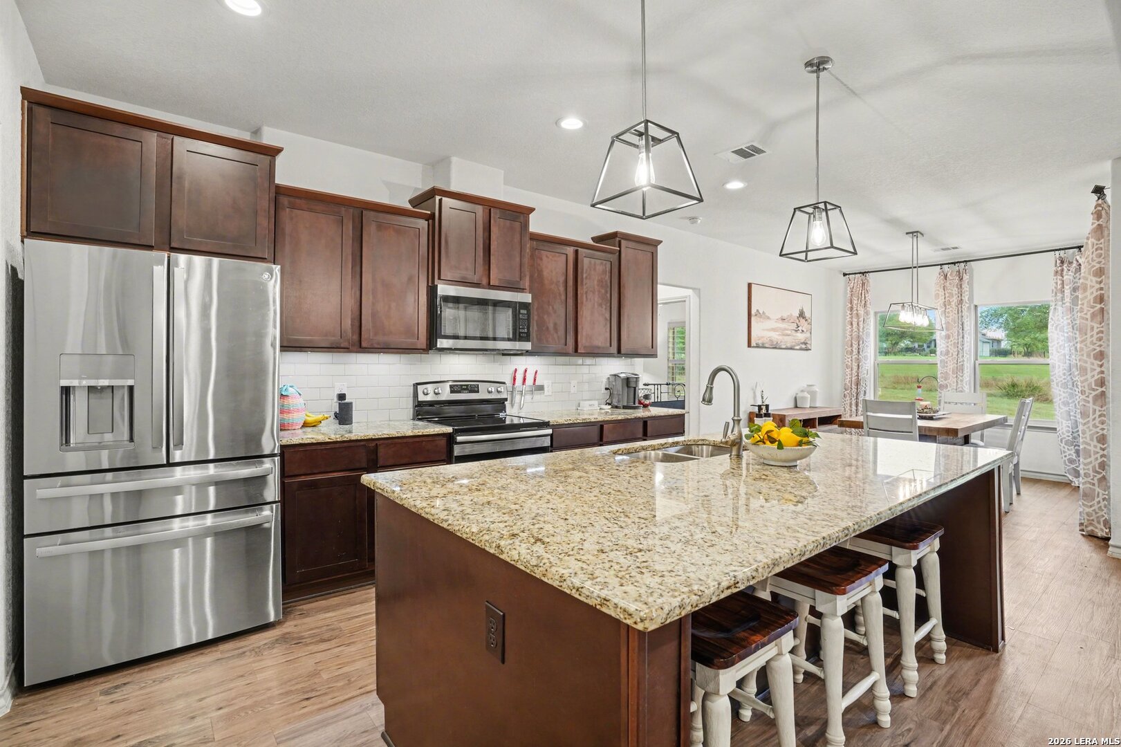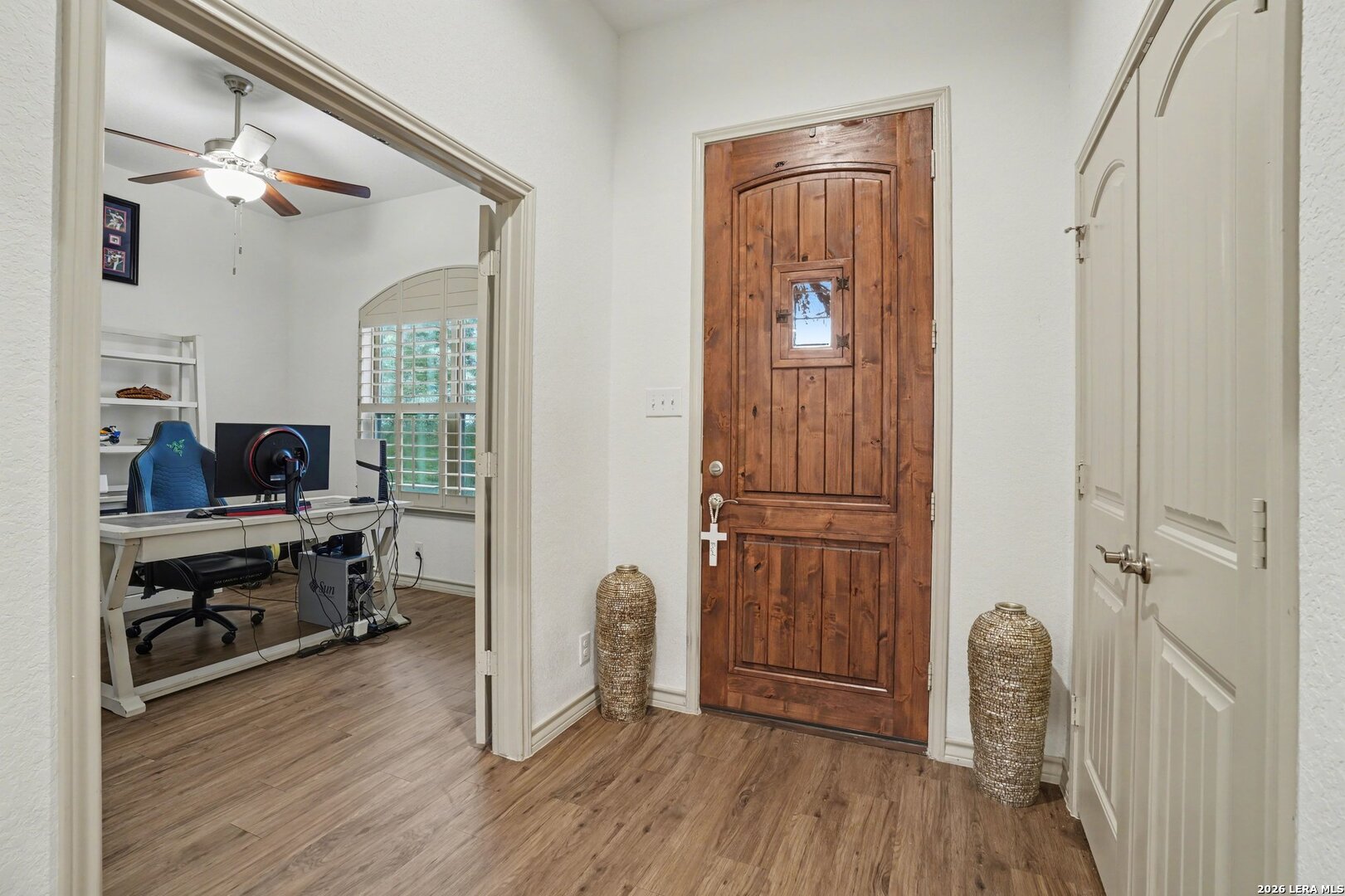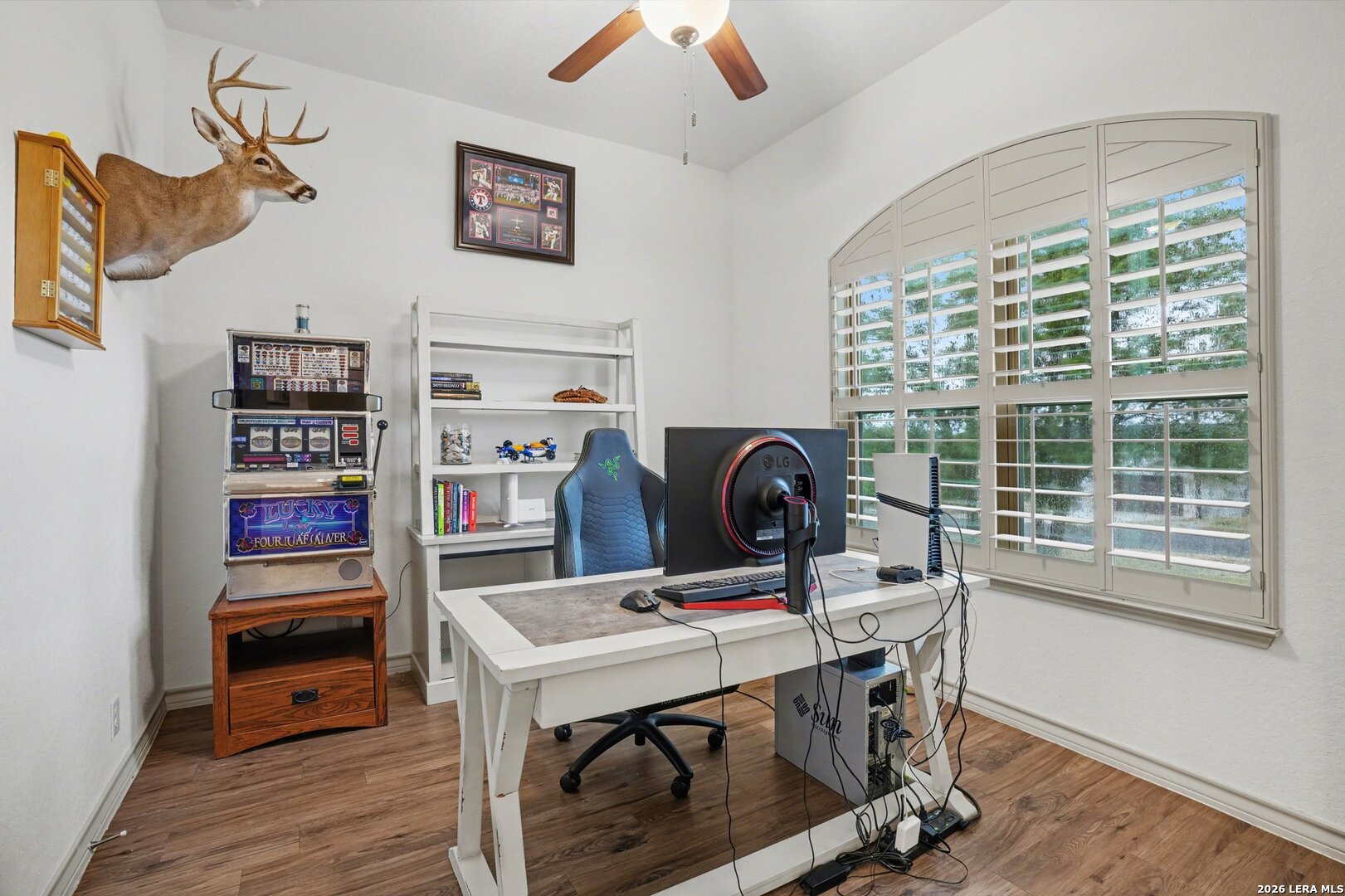 Refined Golf Course Living in Prestigious Rockin' J Ranch Welcome to an exceptional residence gracefully positioned along the 14th hole of the acclaimed Vaaler Creek Golf Course. Click the Virtual Tour link to experience the immersive 3D walkthrough. Built in 2019 and meticulously maintained by its original owners, this thoughtfully designed 4-bedroom, 2.5-bath home blends timeless elegance with modern comfort. The open-concept design is enhanced by soaring ceilings, expansive windows, and an abundance of natural light, creating an inviting yet sophisticated atmosphere throughout. At the heart of the home, the kitchen showcases granite countertops and effortless connectivity to the main living area-perfectly suited for both intimate gatherings and elevated entertaining. The primary suite serves as a private retreat, featuring refined recessed ceilings, an oversized walk-in shower, and dual walk-in closets designed for both function and luxury. Step outside to a covered patio where sweeping golf course views unfold-overlooking the tee box, fairway, and green from your elevated vantage point. The outdoor setting offers a rare sense of tranquility and openness, ideal for quiet evenings or hosting guests in style. Additional highlights include wood-look flooring throughout, curated finishes, a 2-car garage with extended depth for storage, and a fully fenced, professionally landscaped yard. Residents of Rockin' J Ranch enjoy a lifestyle of distinction with access to resort-style amenities including golf, a pool, fishing pier, scenic trails, parks, and clubhouse-all within close proximity to Blanco and a convenient drive to Austin and San Antonio. Select buyers may also benefit from exclusive financing incentives, including potential discounted rate options and no lender fee future refinancing (see Agent Remarks for details). Homes of this caliber, setting, and presentation are rarely available-schedule your private showing today.
