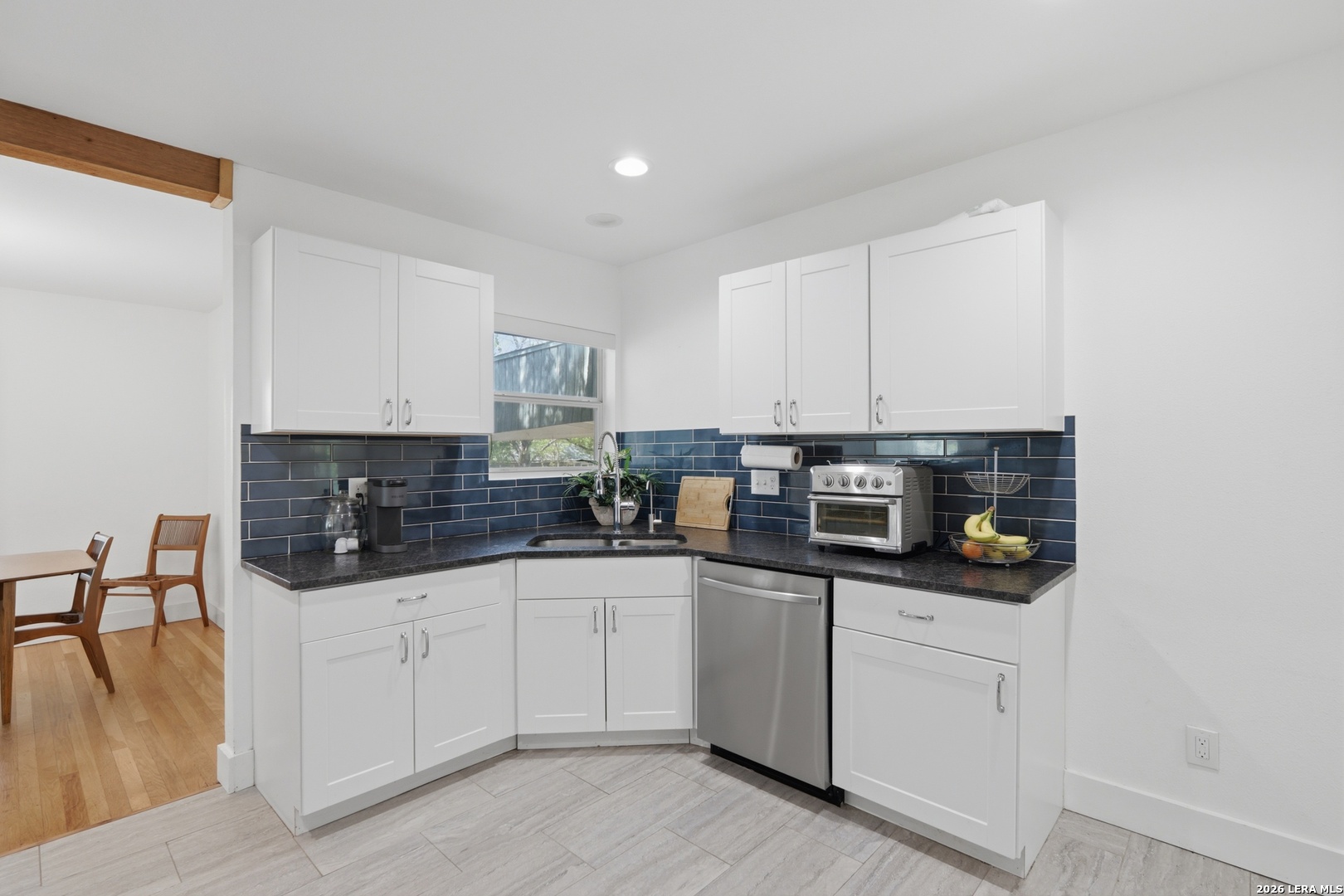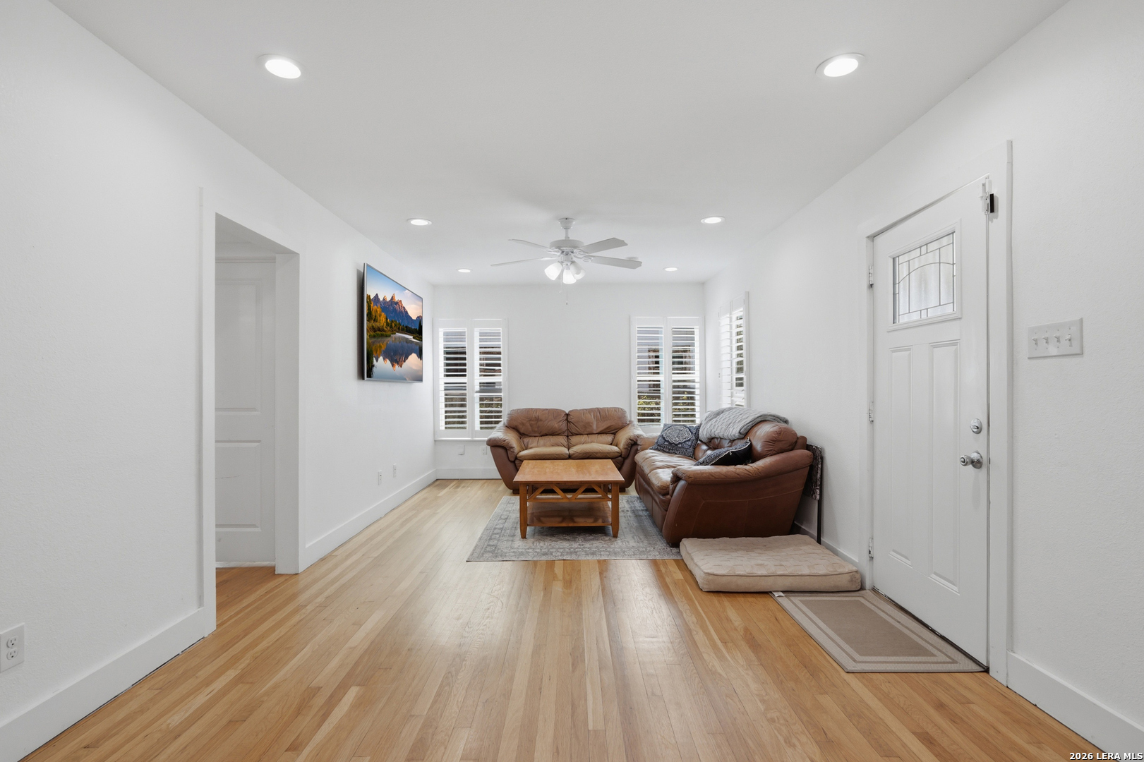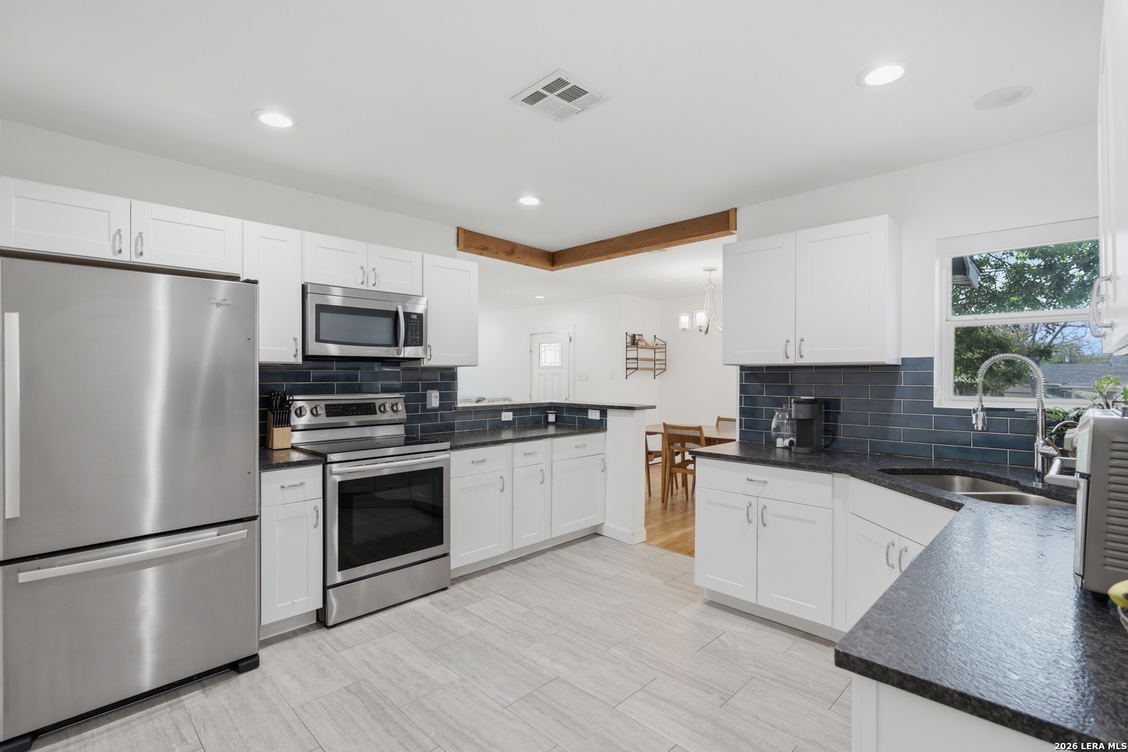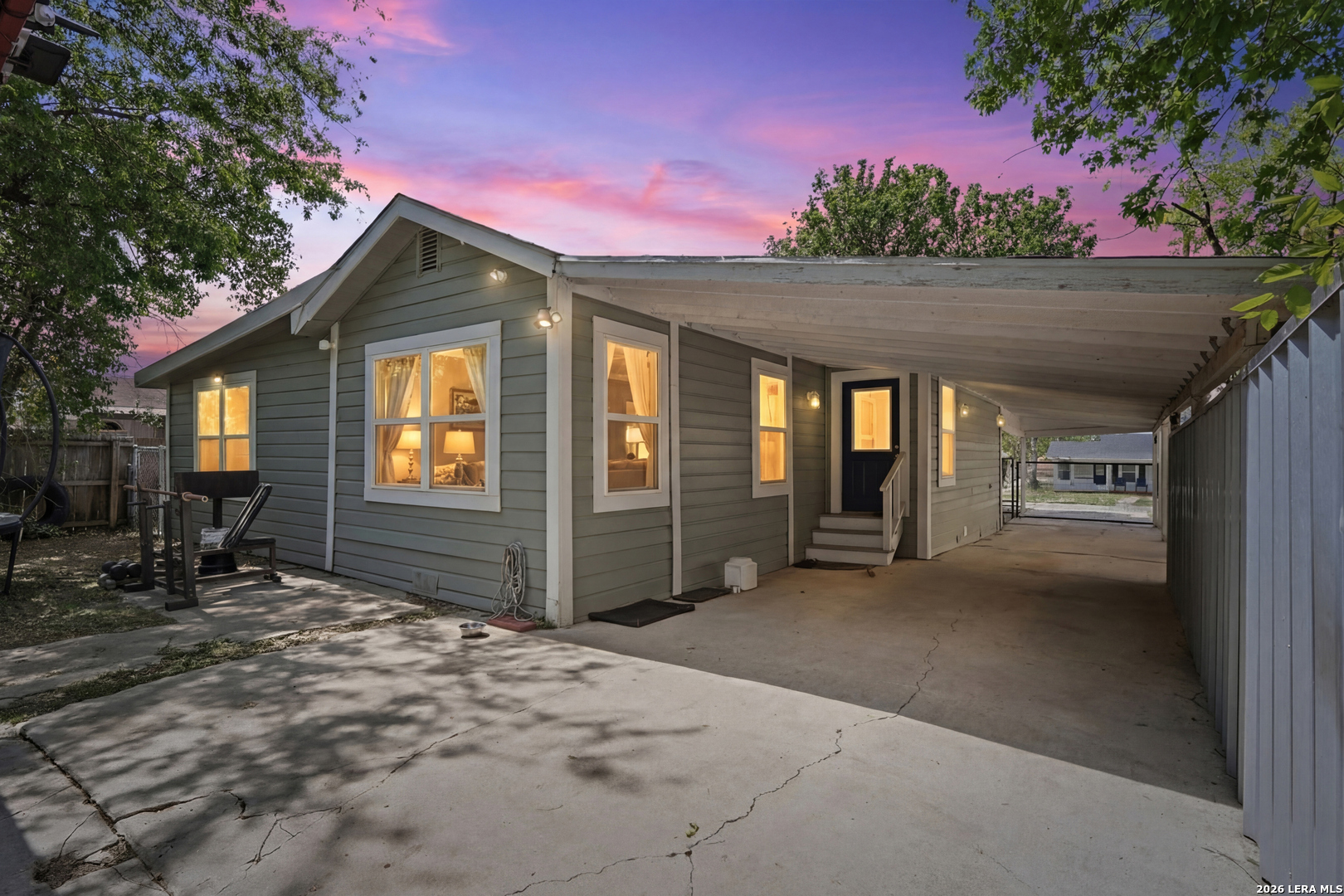 Single story open floor plan home in San Antonio with charming curb appeal, featuring a covered front porch and a mature tree that adds character from the moment you arrive. Inside, the layout flows effortlessly with recessed lighting and large windows that bring in abundant natural light, creating a bright and inviting atmosphere throughout the main living spaces. The kitchen is designed for both function and style, complete with stainless steel appliances, a beautiful backsplash, and ample workspace that connects seamlessly to the living and dining areas. The primary suite offers a comfortable retreat with a large walk in closet, double vanities, and a spacious tile shower. Additional highlights include an indoor laundry room for convenience and thoughtful use of space throughout the home. Step outside to enjoy a covered patio, a storage shed, and a privacy fence with partial metal fencing, offering both flexibility and usability. A two car carport adds extra covered parking. Located in a central area with a short commute to Downtown San Antonio, easy access to I 10 and Highway 37, and close proximity to Fort Sam Houston and Randolph Air Force Base, this property combines comfort, convenience, and accessibility.