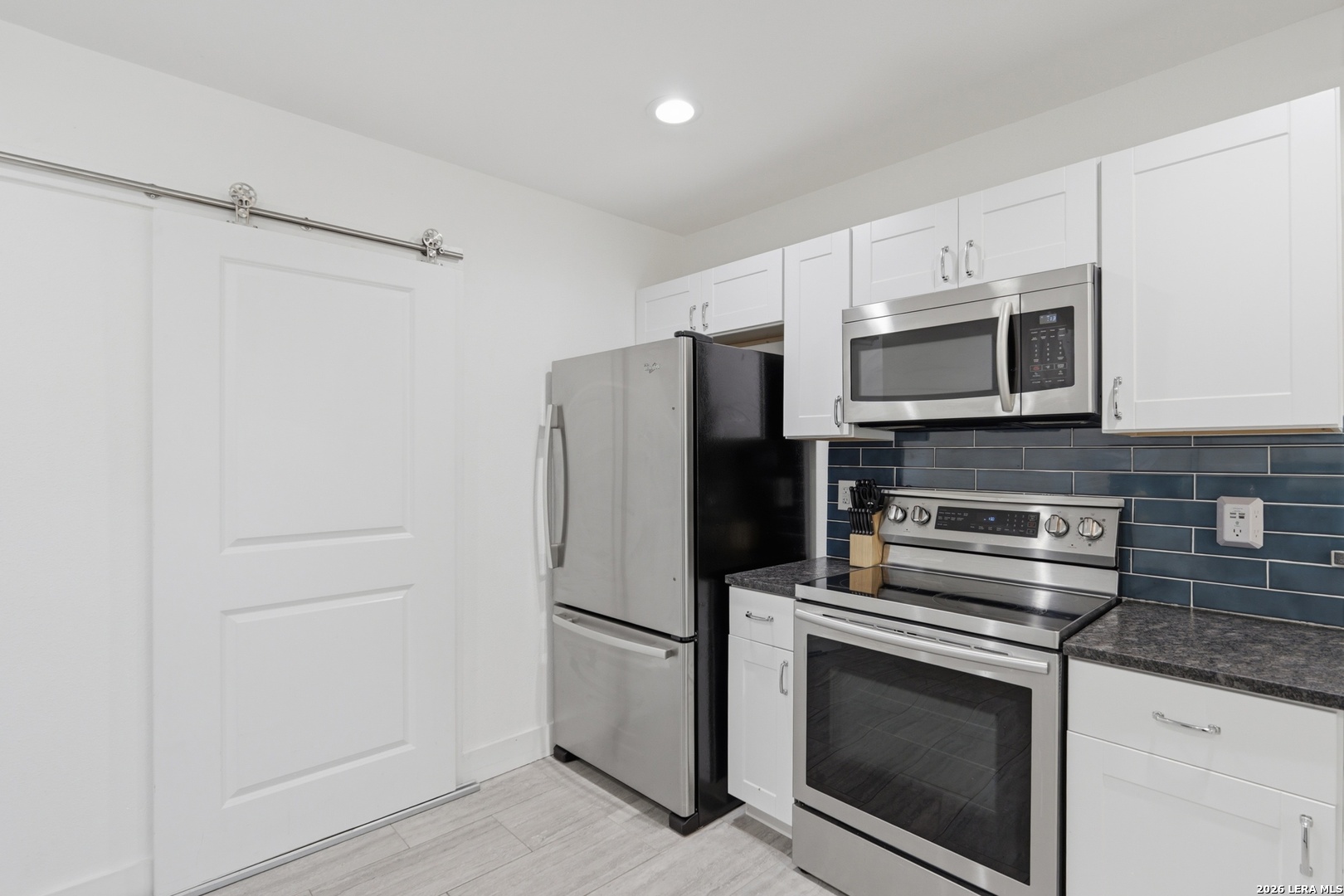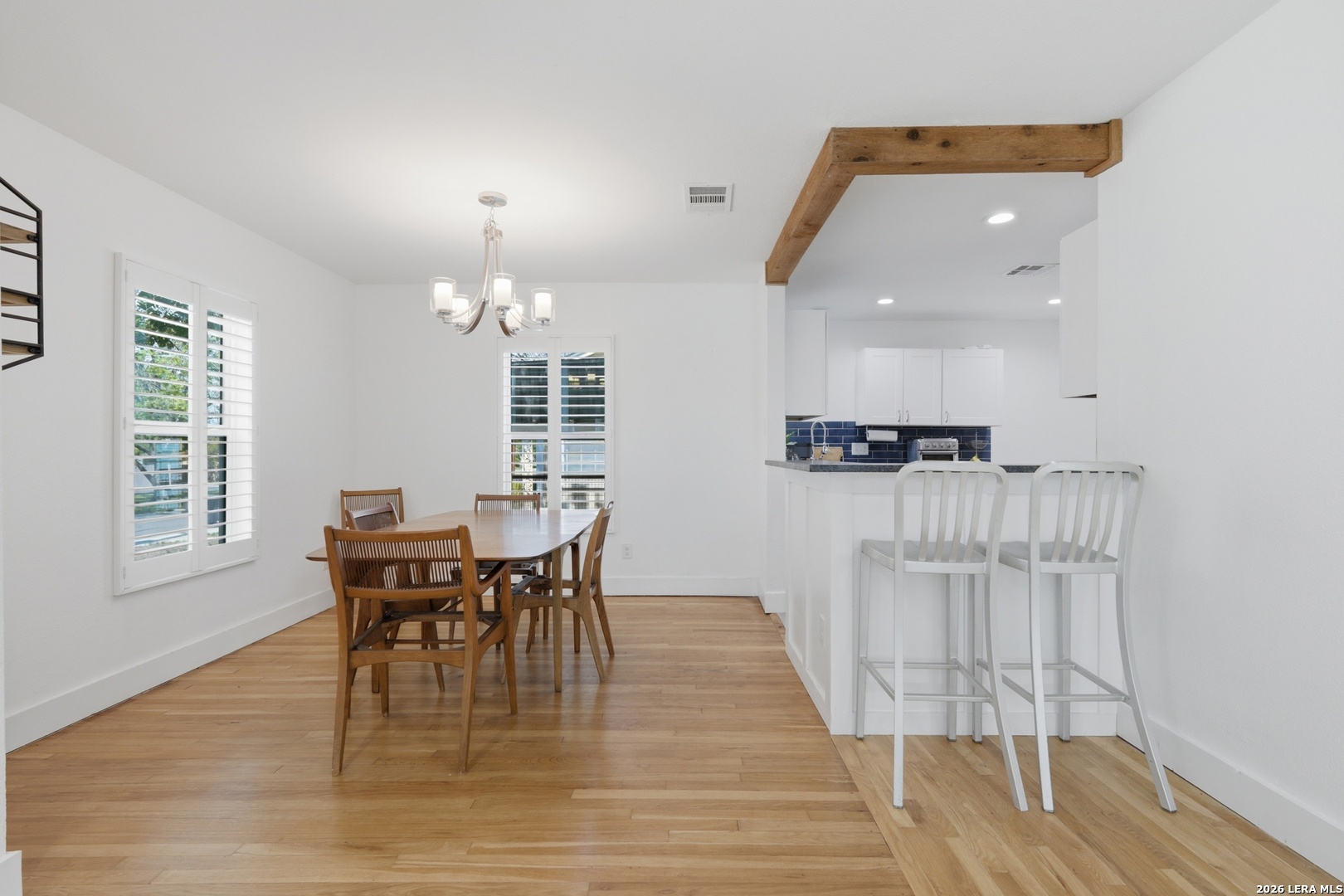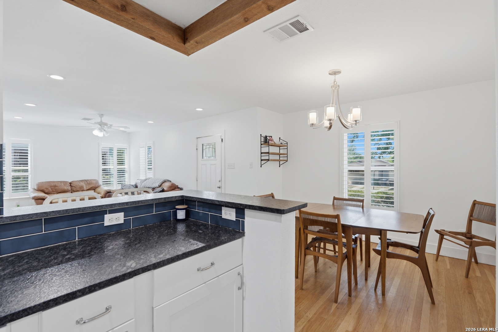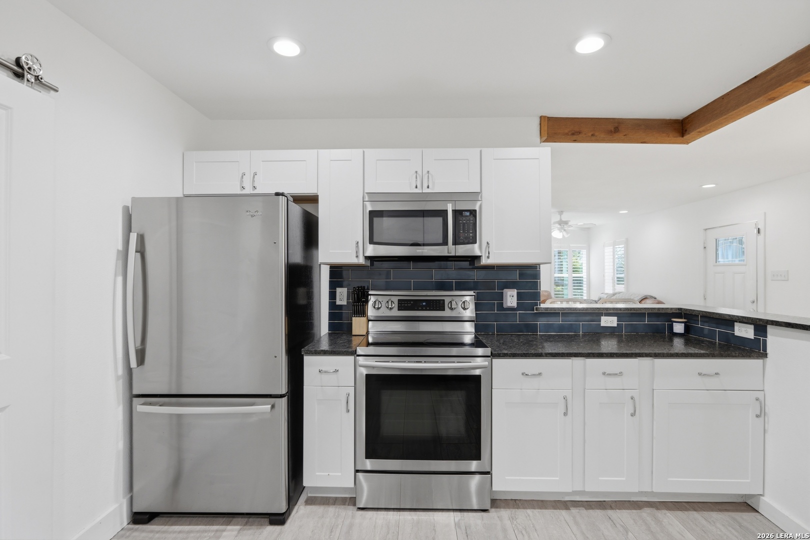Single story open floor plan home in San Antonio with charming curb appeal, featuring a covered front porch and a mature tree that adds character from the moment you arrive. Inside, the layout flows effortlessly with recessed lighting and large windows that bring in abundant natural light, creating a bright and inviting atmosphere throughout the main living spaces. The kitchen is designed for both function and style, complete with stainless steel appliances, a beautiful backsplash, and ample workspace that connects seamlessly to the living and dining areas. The primary suite offers a comfortable retreat with a large walk in closet, double vanities, and a spacious tile shower. Additional highlights include an indoor laundry room for convenience and thoughtful use of space throughout the home. Step outside to enjoy a covered patio, a storage shed, and a privacy fence with partial metal fencing, offering both flexibility and usability. A two car carport adds extra covered parking. Located in a central area with a short commute to Downtown San Antonio, easy access to I 10 and Highway 37, and close proximity to Fort Sam Houston and Randolph Air Force Base, this property combines comfort, convenience, and accessibility.