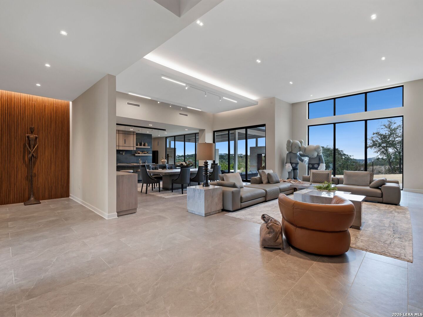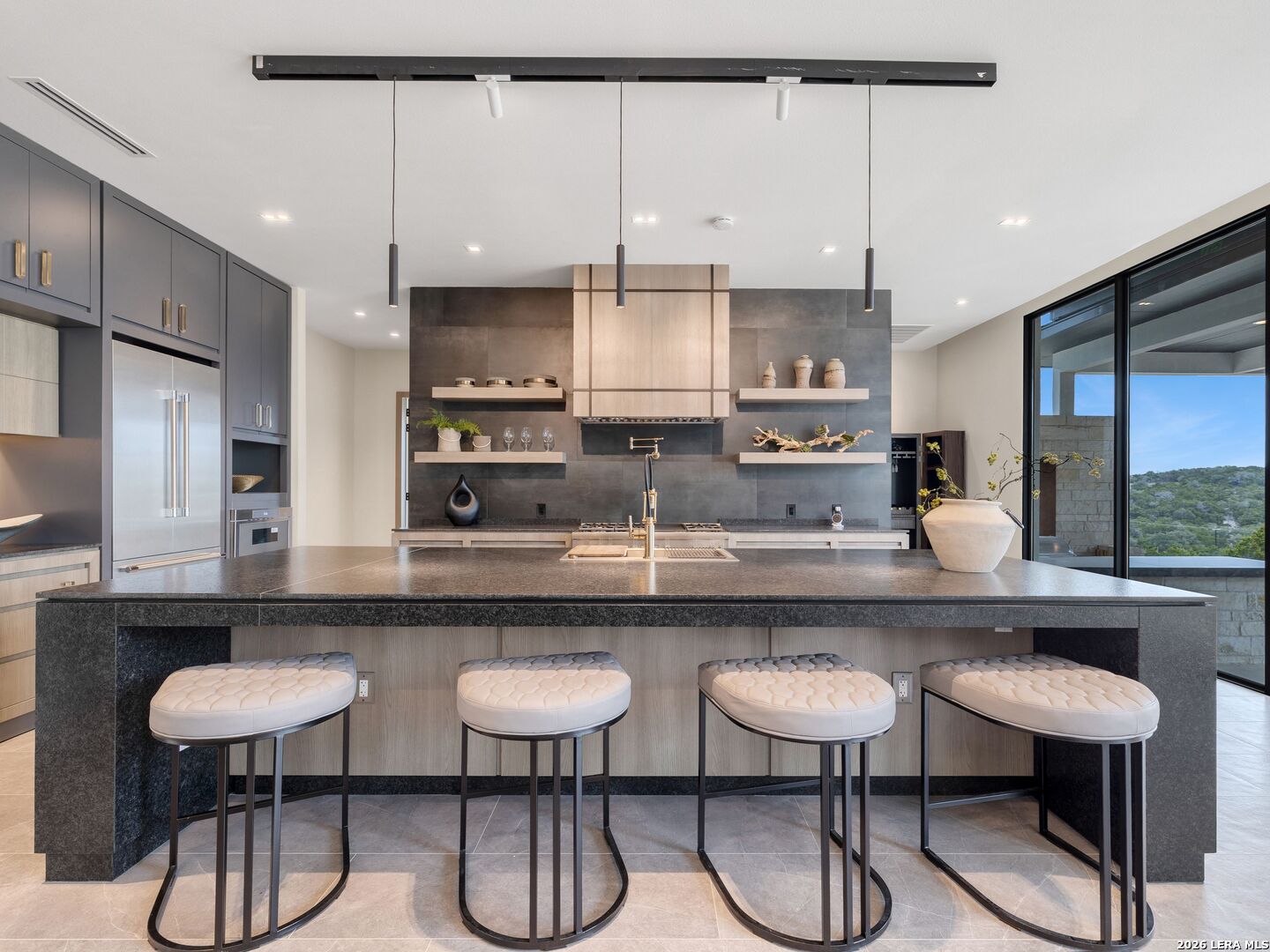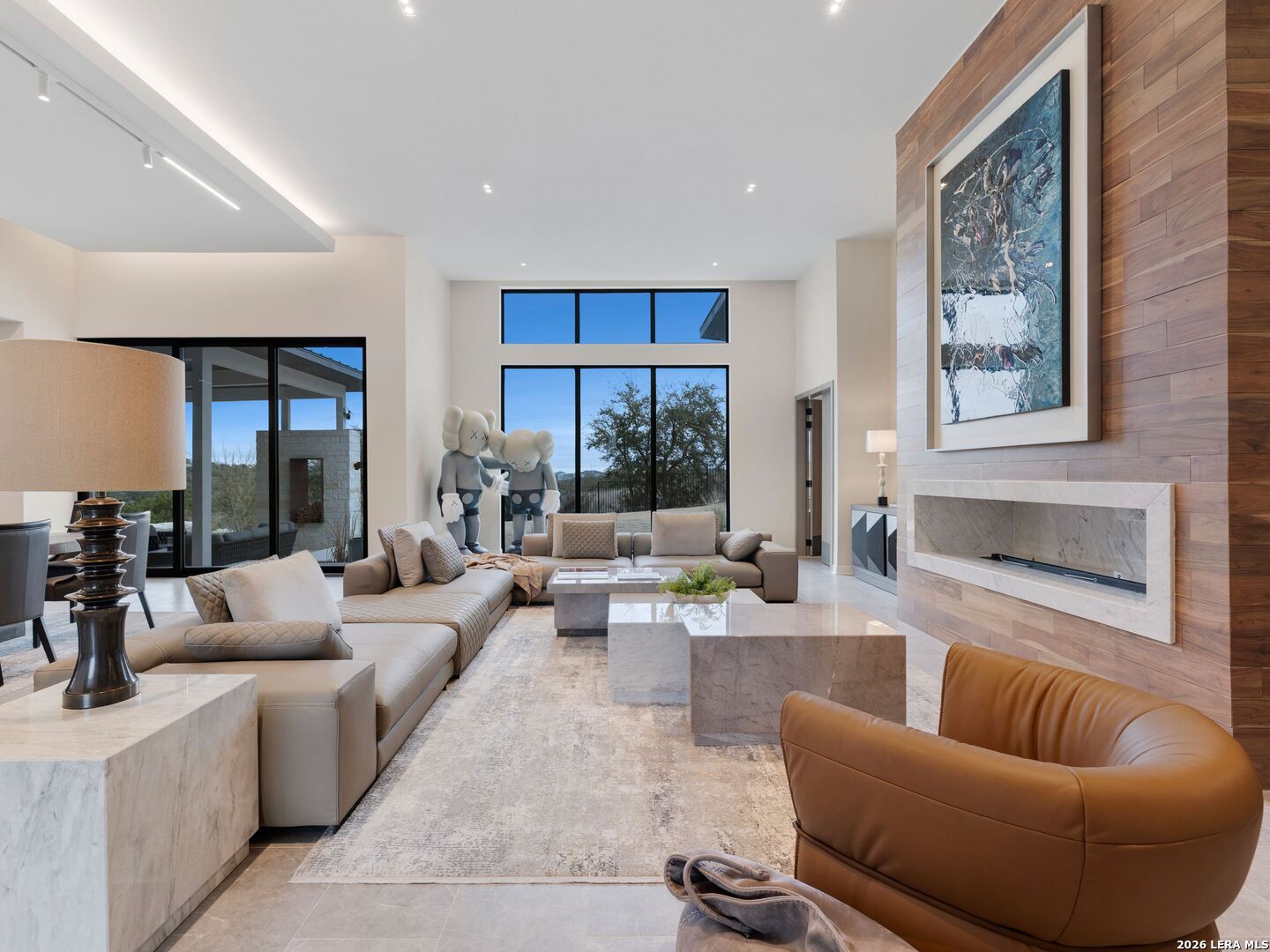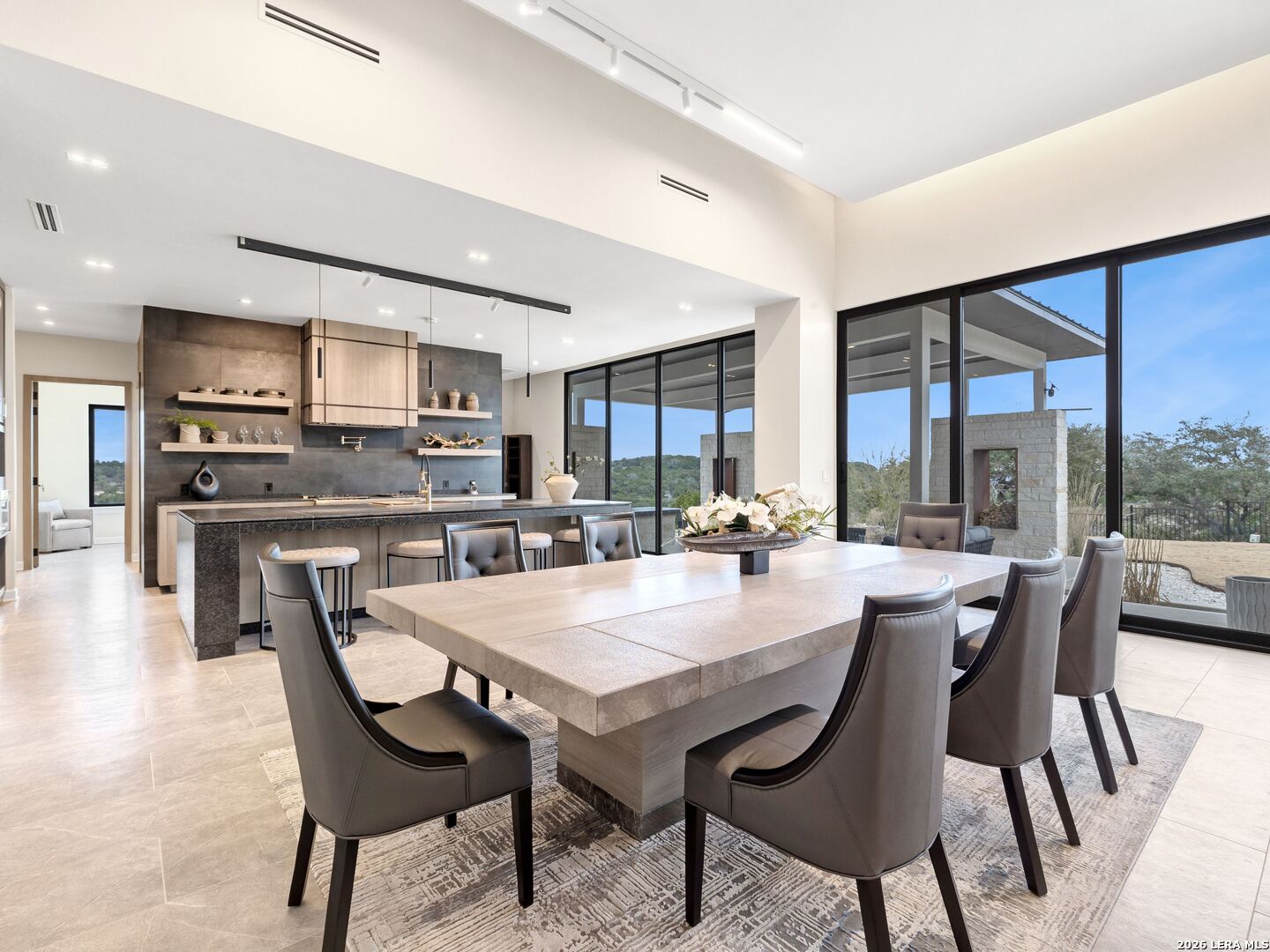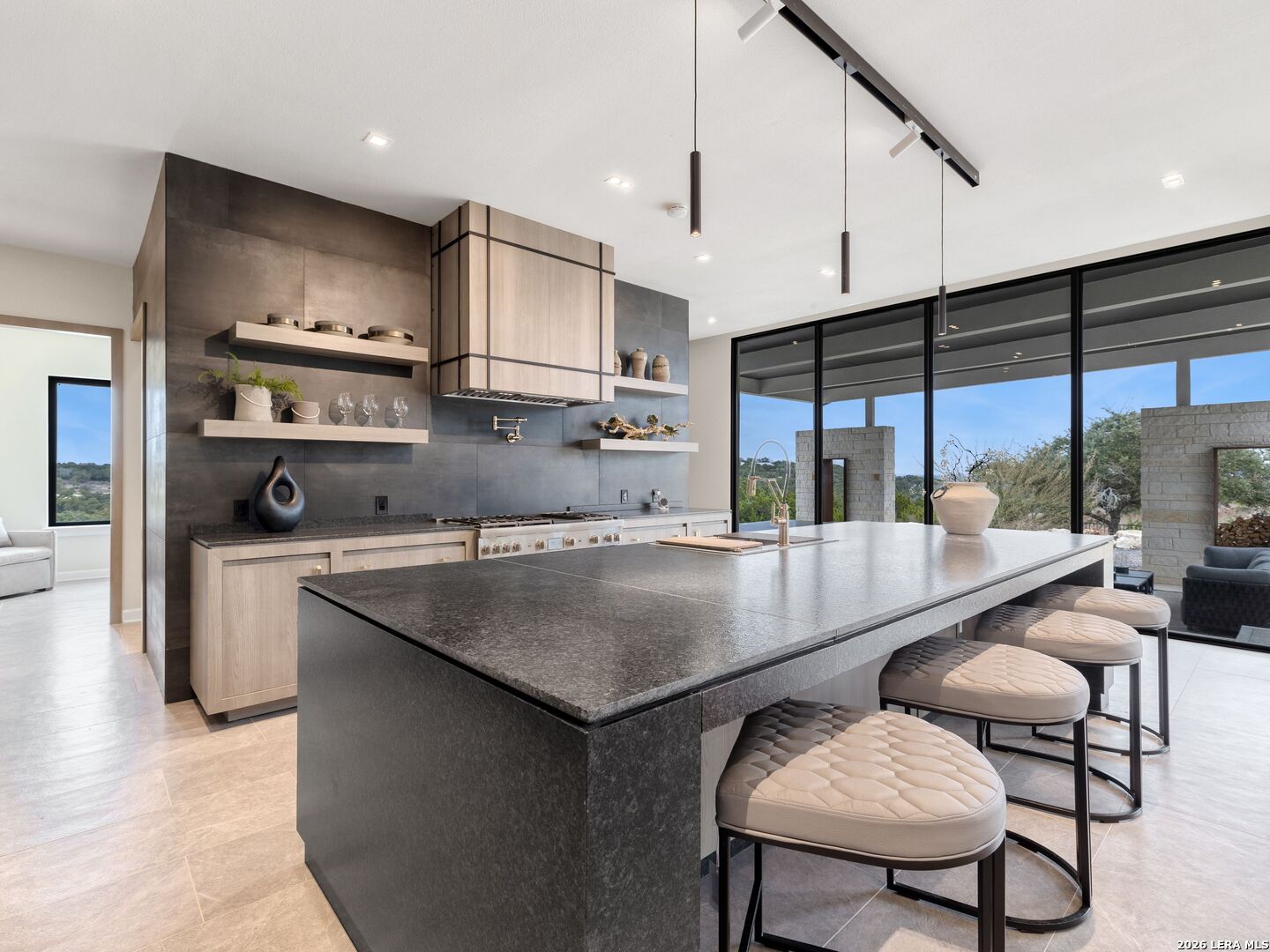 Clean architectural lines, limestone detailing, and expansive walls of glass define this contemporary residence. Elevated along a private drive with a discreet side-entry three-car garage, the exterior composition reflects disciplined proportions and a restrained material palette that establishes both privacy and presence. Inside, soaring ceilings and expansive glazing introduce natural light at scale. Large-format tile flooring extends throughout the main living areas, reinforcing the home's modern clarity. A custom wood-accent fireplace wall anchors the primary living space, adding warmth and contrast within the clean architectural framework. The kitchen is organized around a substantial granite island and framed by matte black and warm wood cabinetry with full-height storage. A Thermador appliance suite includes a professional gas range, built-in refrigeration, wall-mounted microwave, and pot filler. Under-cabinet lighting and refined fixtures complete a space designed for both daily function and elevated entertaining. The primary suite is privately positioned and scaled with intention. The bath features a floating dual vanity, freestanding soaking tub, and frameless walk-in shower with rainfall fixture, all finished in large-format tile within a restrained modern palette. Expansive sliding glass doors extend the interior to a covered outdoor living area supported by limestone columns and recessed lighting. The landscaped grounds and elevated positioning capture long-range views while preserving privacy, reinforcing the home's architectural presence from every angle. Architecturally composed and materially refined, this residence delivers modern luxury through scale, light, and intentional design.