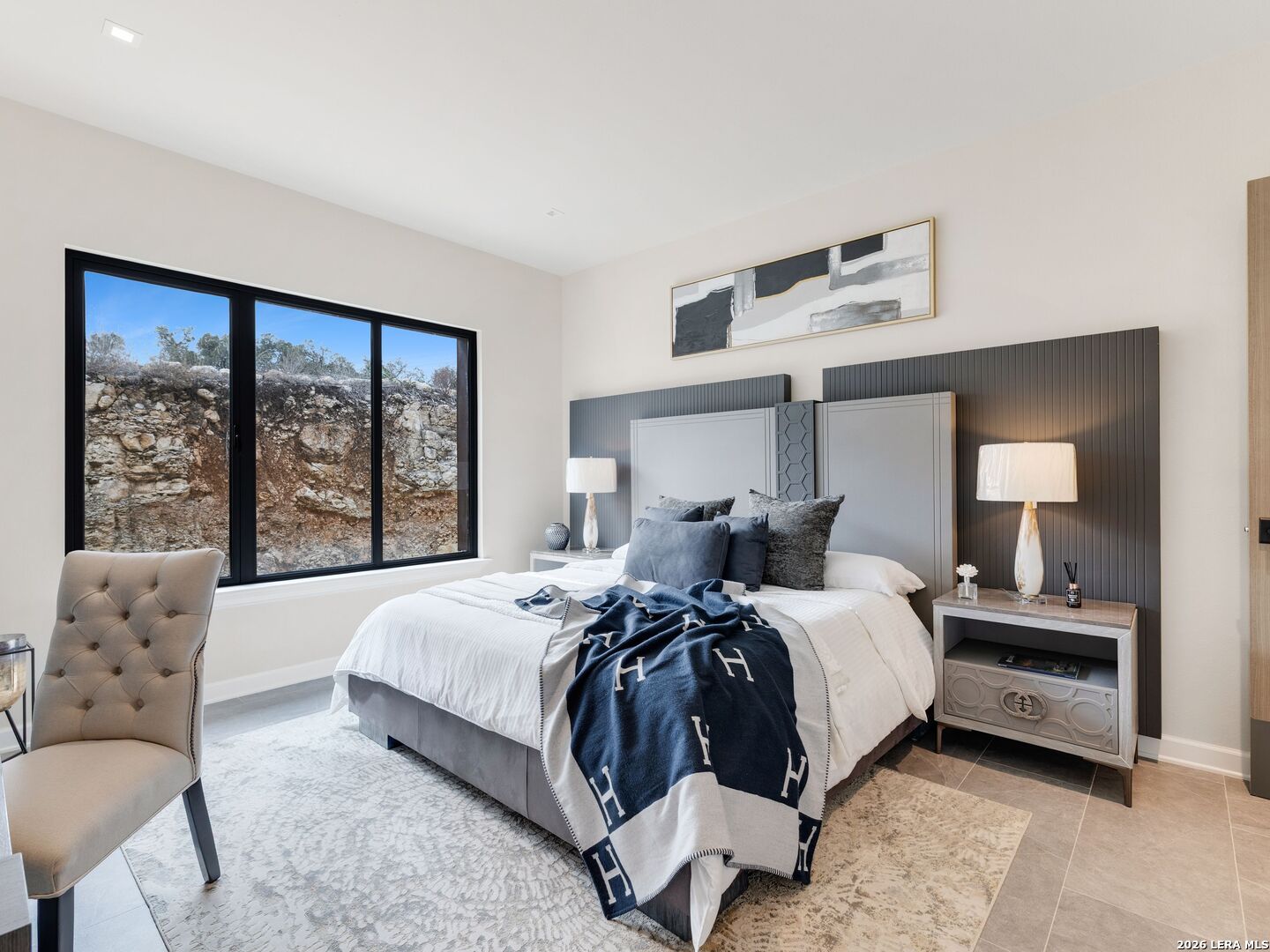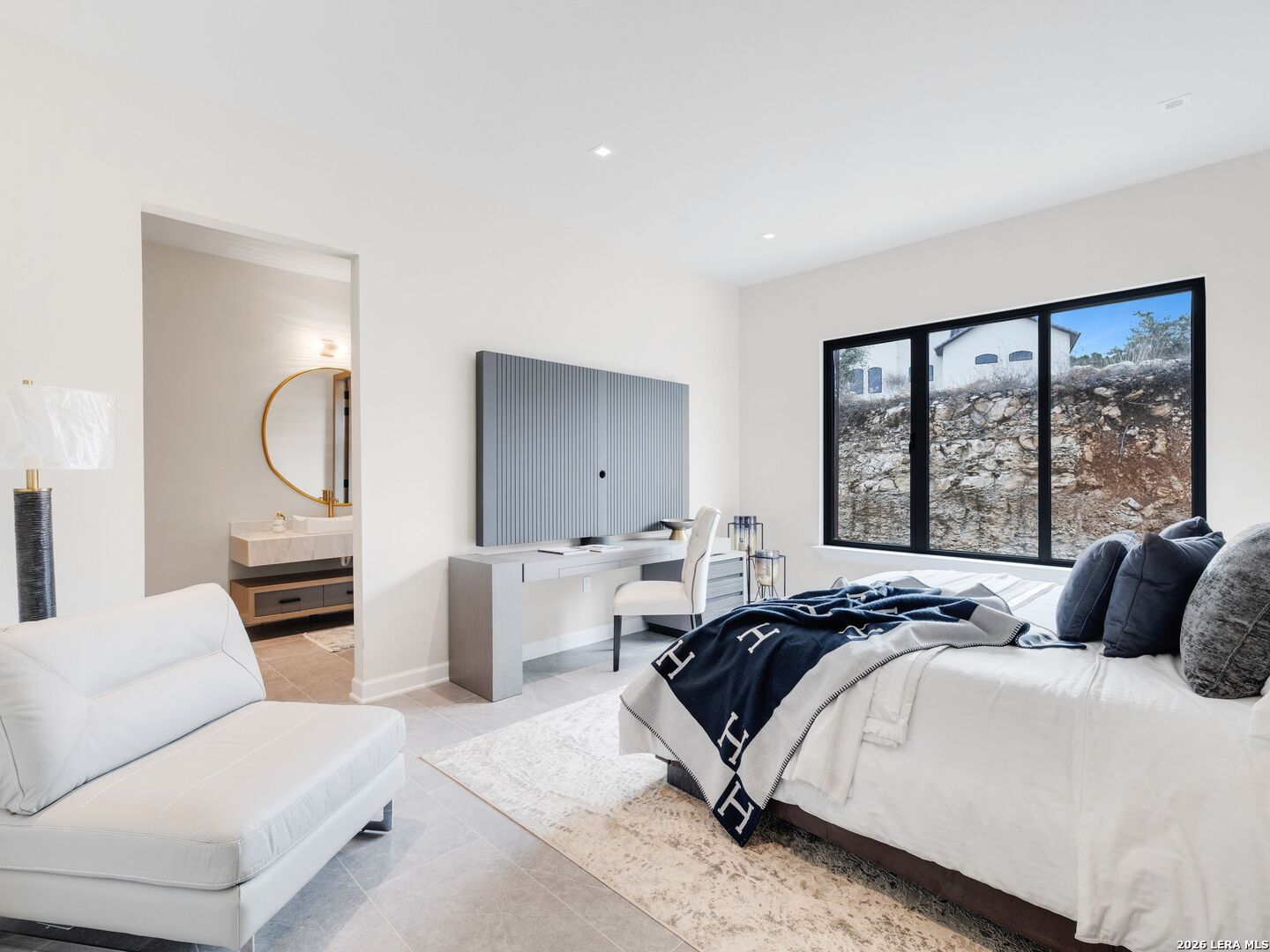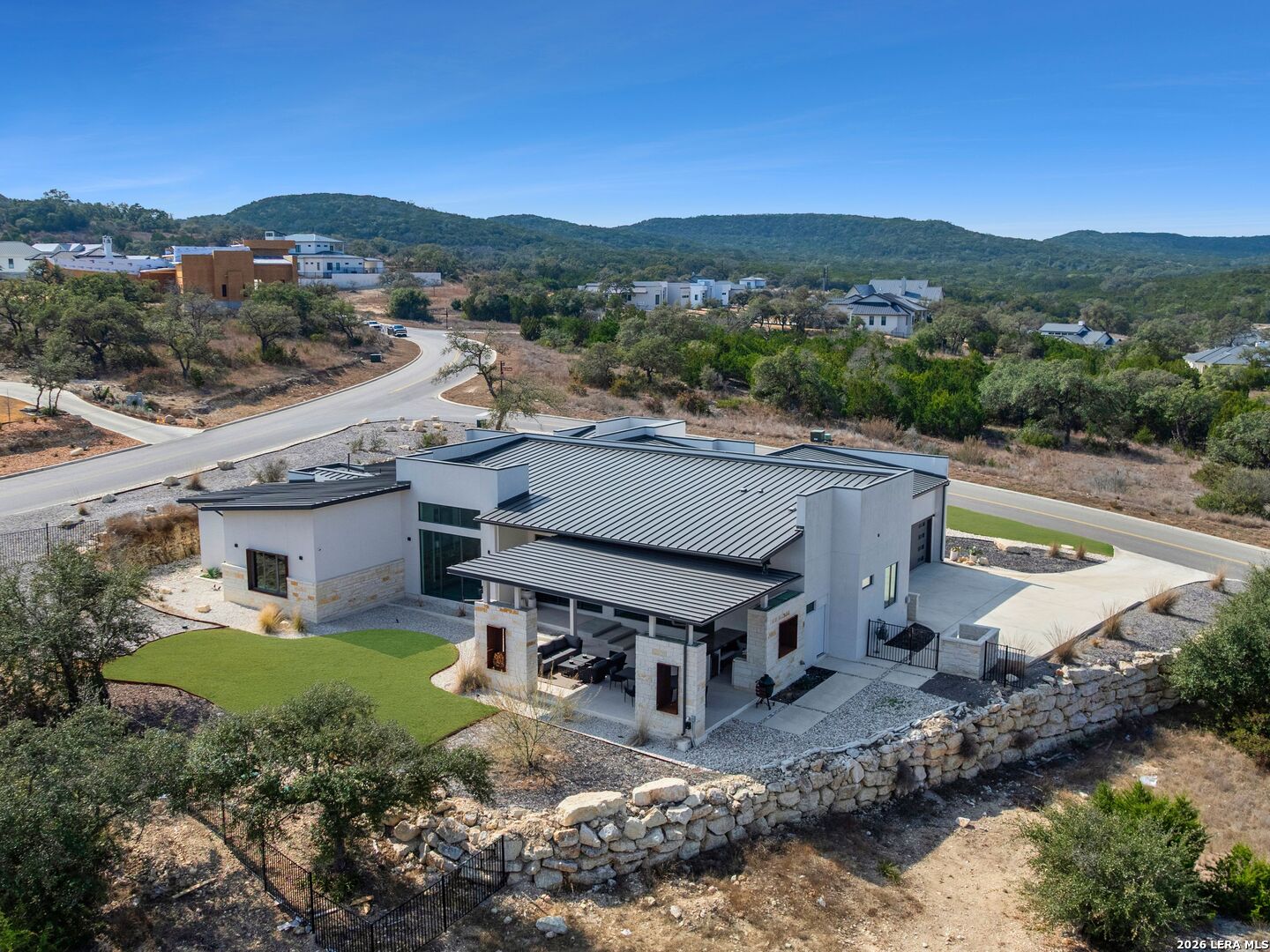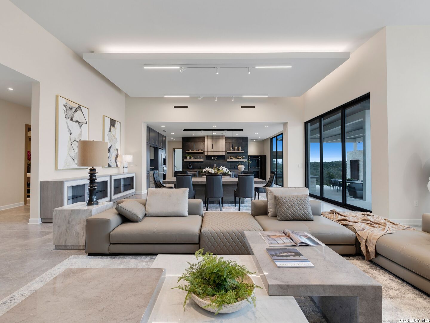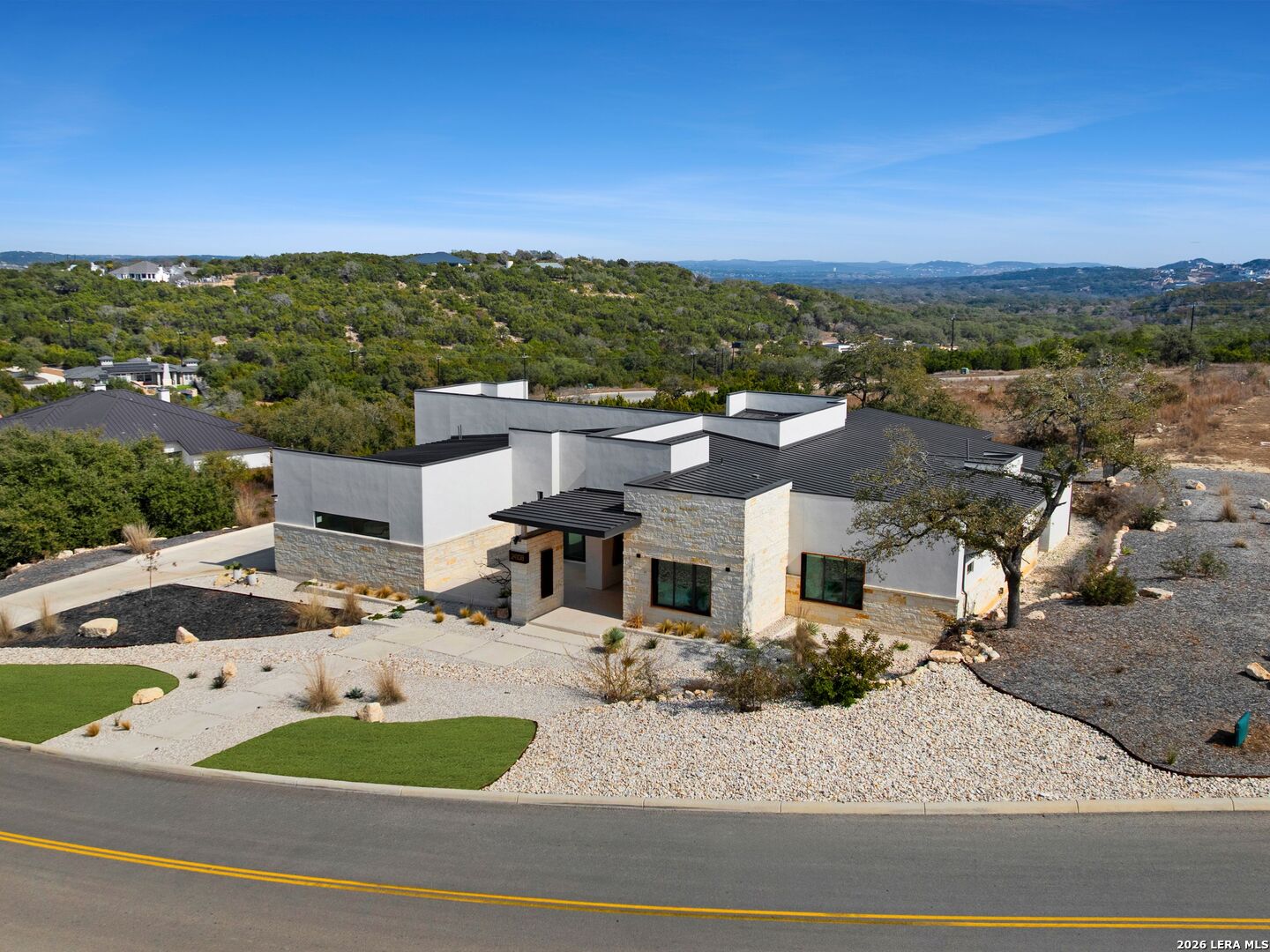Clean architectural lines, limestone detailing, and expansive walls of glass define this contemporary residence. Elevated along a private drive with a discreet side-entry three-car garage, the exterior composition reflects disciplined proportions and a restrained material palette that establishes both privacy and presence. Inside, soaring ceilings and expansive glazing introduce natural light at scale. Large-format tile flooring extends throughout the main living areas, reinforcing the home's modern clarity. A custom wood-accent fireplace wall anchors the primary living space, adding warmth and contrast within the clean architectural framework. The kitchen is organized around a substantial granite island and framed by matte black and warm wood cabinetry with full-height storage. A Thermador appliance suite includes a professional gas range, built-in refrigeration, wall-mounted microwave, and pot filler. Under-cabinet lighting and refined fixtures complete a space designed for both daily function and elevated entertaining. The primary suite is privately positioned and scaled with intention. The bath features a floating dual vanity, freestanding soaking tub, and frameless walk-in shower with rainfall fixture, all finished in large-format tile within a restrained modern palette. Expansive sliding glass doors extend the interior to a covered outdoor living area supported by limestone columns and recessed lighting. The landscaped grounds and elevated positioning capture long-range views while preserving privacy, reinforcing the home's architectural presence from every angle. Architecturally composed and materially refined, this residence delivers modern luxury through scale, light, and intentional design.