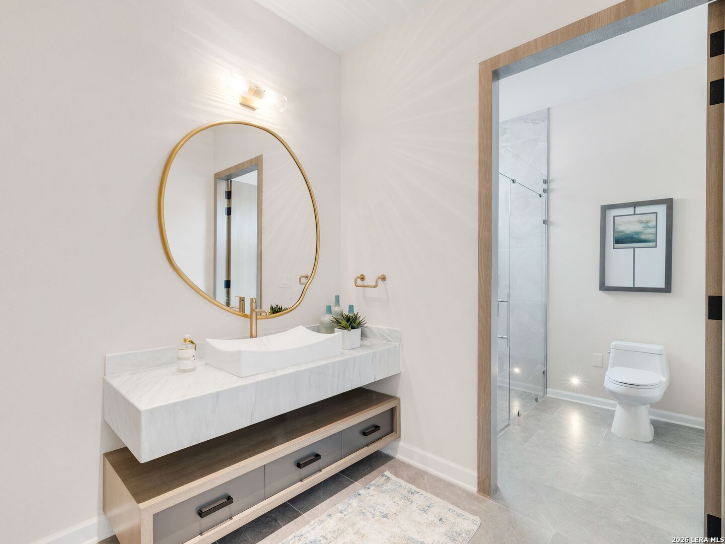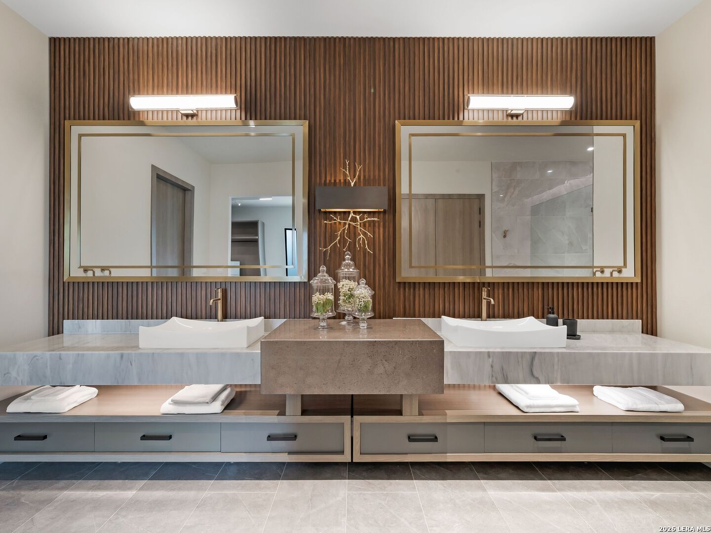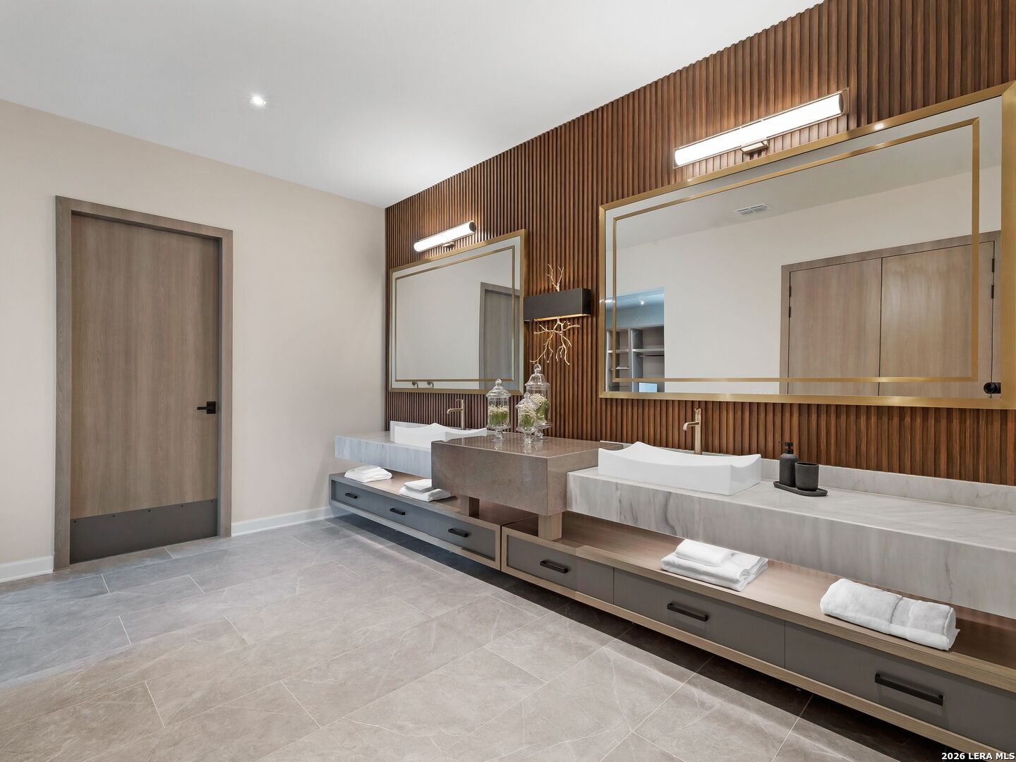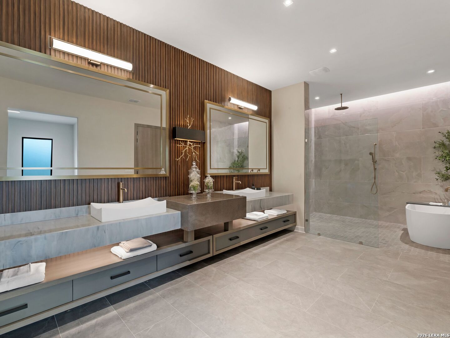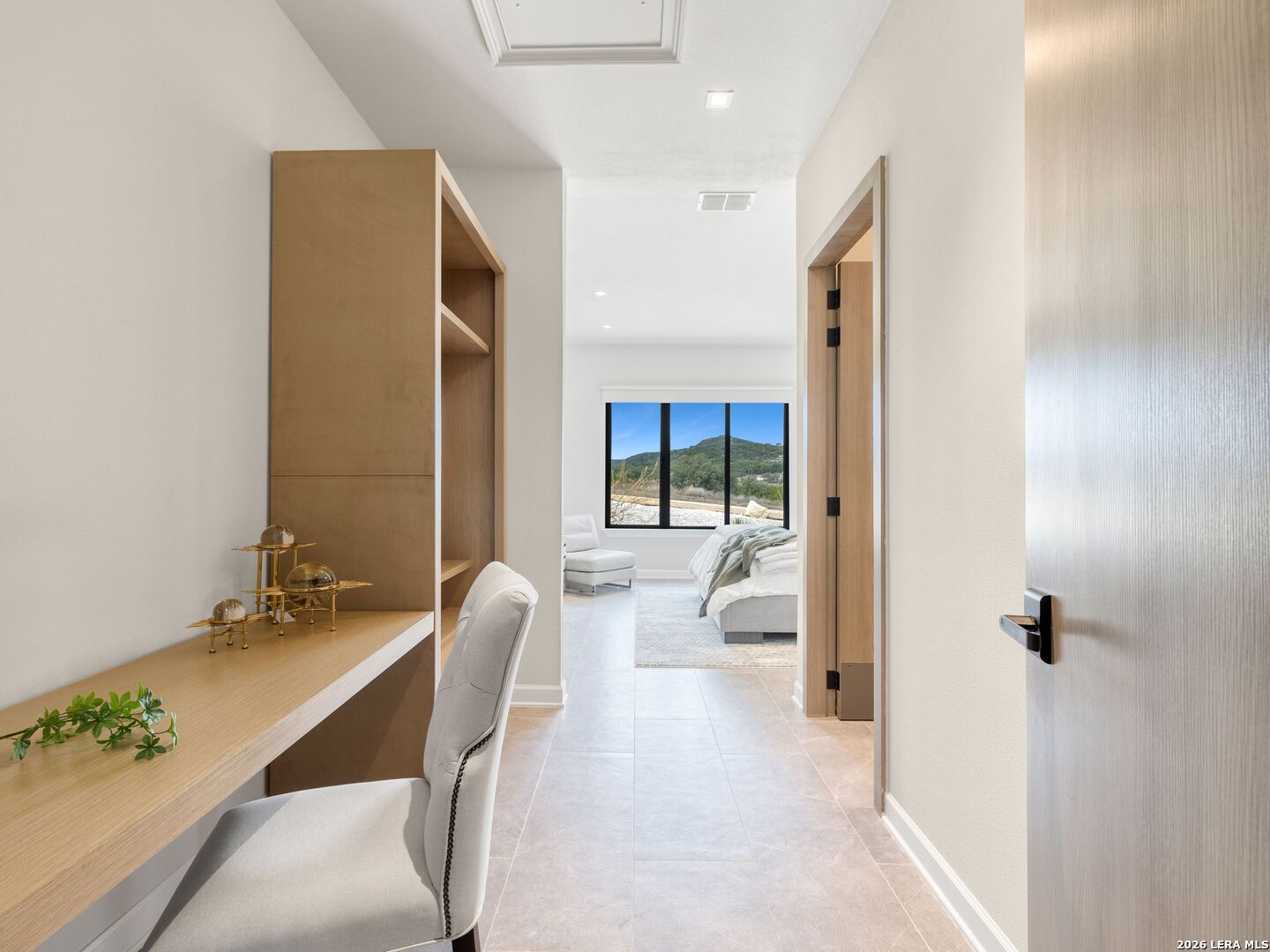Clean architectural lines, limestone detailing, and expansive walls of glass define this contemporary residence. Elevated along a private drive with a discreet side-entry three-car garage, the exterior composition reflects disciplined proportions and a restrained material palette that establishes both privacy and presence. Inside, soaring ceilings and expansive glazing introduce natural light at scale. Large-format tile flooring extends throughout the main living areas, reinforcing the home's modern clarity. A custom wood-accent fireplace wall anchors the primary living space, adding warmth and contrast within the clean architectural framework. The kitchen is organized around a substantial granite island and framed by matte black and warm wood cabinetry with full-height storage. A Thermador appliance suite includes a professional gas range, built-in refrigeration, wall-mounted microwave, and pot filler. Under-cabinet lighting and refined fixtures complete a space designed for both daily function and elevated entertaining. The primary suite is privately positioned and scaled with intention. The bath features a floating dual vanity, freestanding soaking tub, and frameless walk-in shower with rainfall fixture, all finished in large-format tile within a restrained modern palette. Expansive sliding glass doors extend the interior to a covered outdoor living area supported by limestone columns and recessed lighting. The landscaped grounds and elevated positioning capture long-range views while preserving privacy, reinforcing the home's architectural presence from every angle. Architecturally composed and materially refined, this residence delivers modern luxury through scale, light, and intentional design.