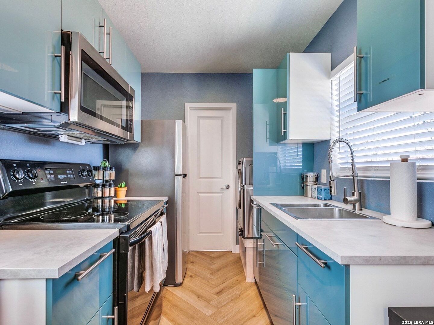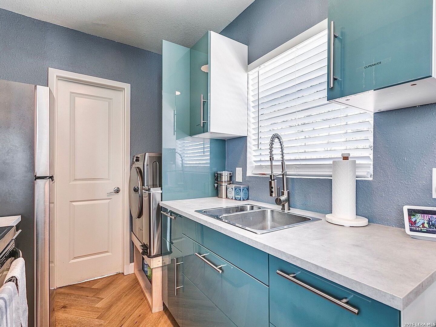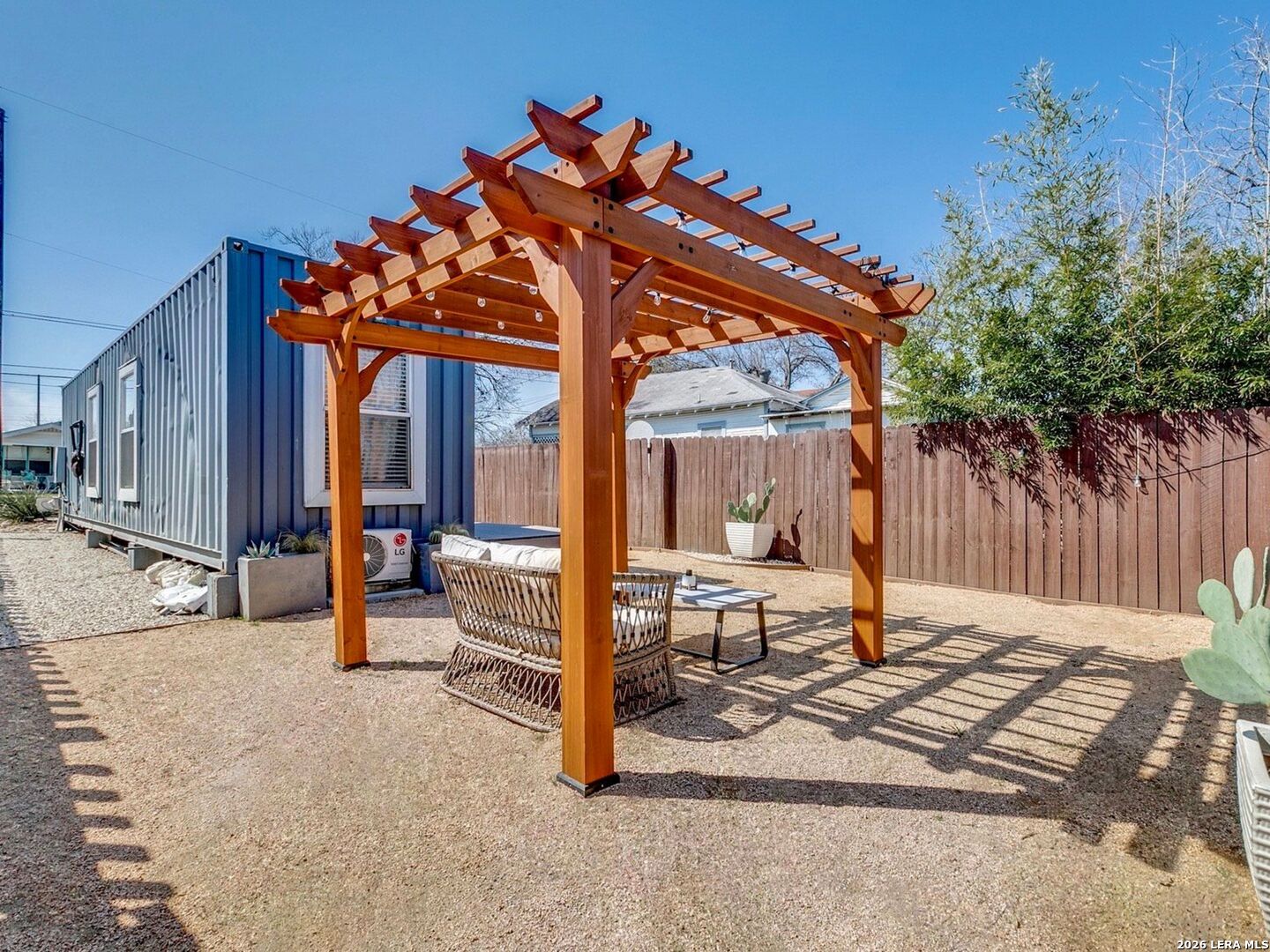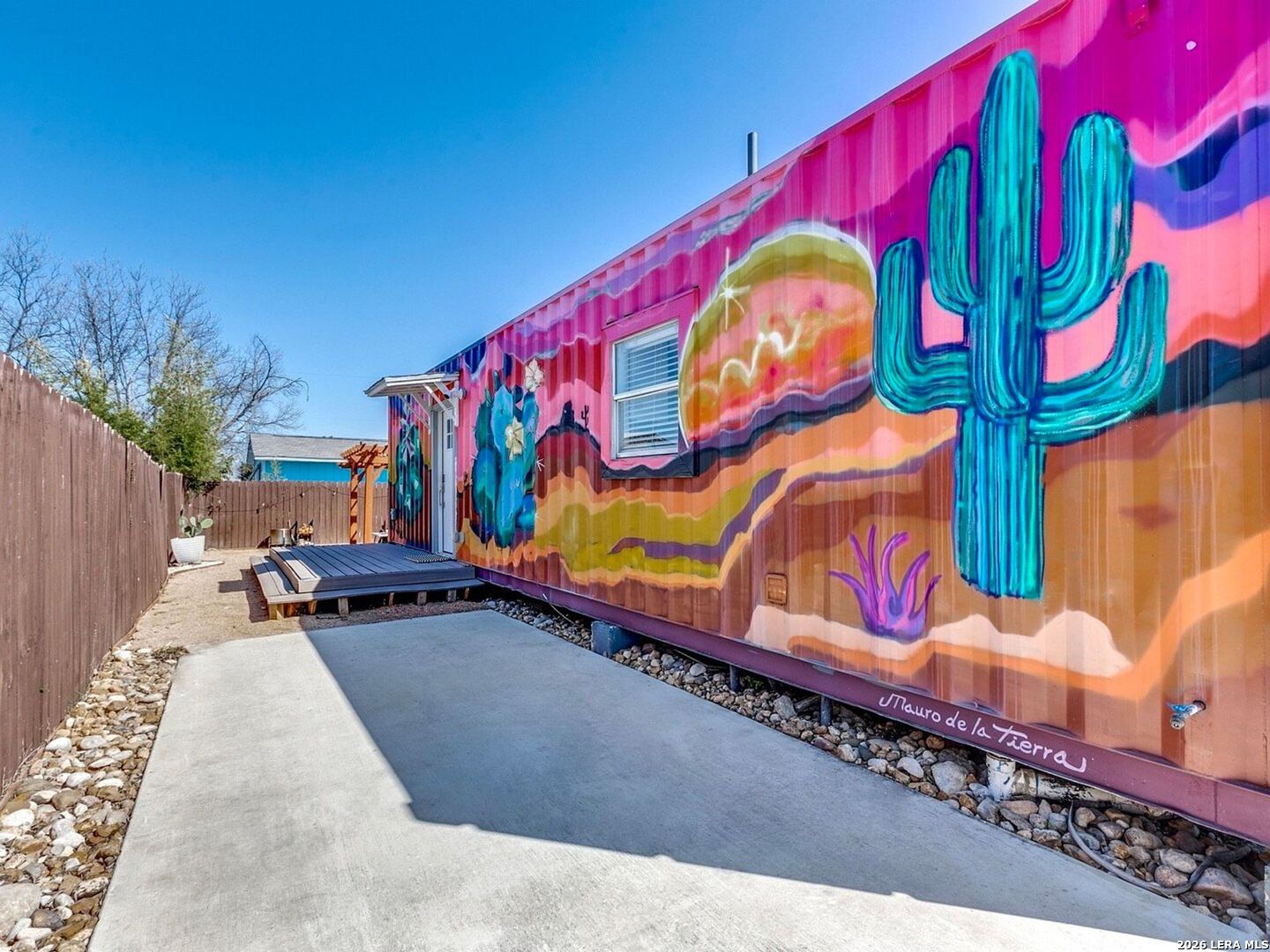 This truly unique container home stands out with its chic modern finishes inside, while the custom-painted exterior mural by local artist gives it an edgy urban vibe. The thoughtfully designed layout maximizes every inch of space, creating a smooth flow between the living area, kitchen, and bathroom. Tons of windows flood the home with natural light, showcasing the elegant herringbone-style flooring and the contemporary kitchen, which boasts glossy cabinetry with updated hardware, a stainless steel sink with a gooseneck faucet, and stainless steel appliances, including the refrigerator, plus a matching stackable washer and dryer are also included for added convenience. The walk-in shower has been upgraded with beautiful new tile and sleek black fixtures. Step outside to a private backyard featuring a patio, pergola, and low-maintenance professional xeriscaping in both the front and rear yards-perfect for relaxing and entertaining. This home is an exceptional option for both homeowners and investors alike.