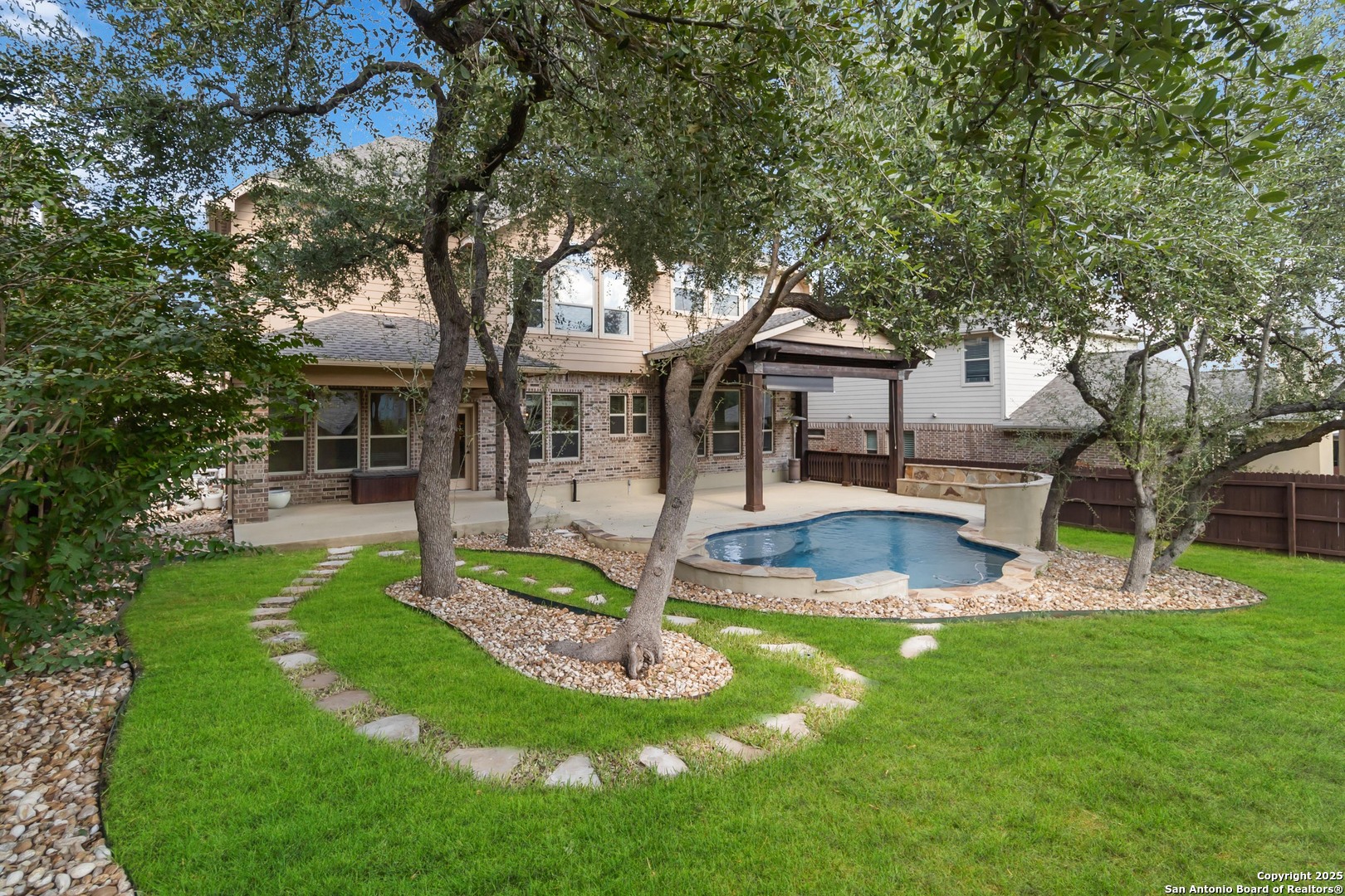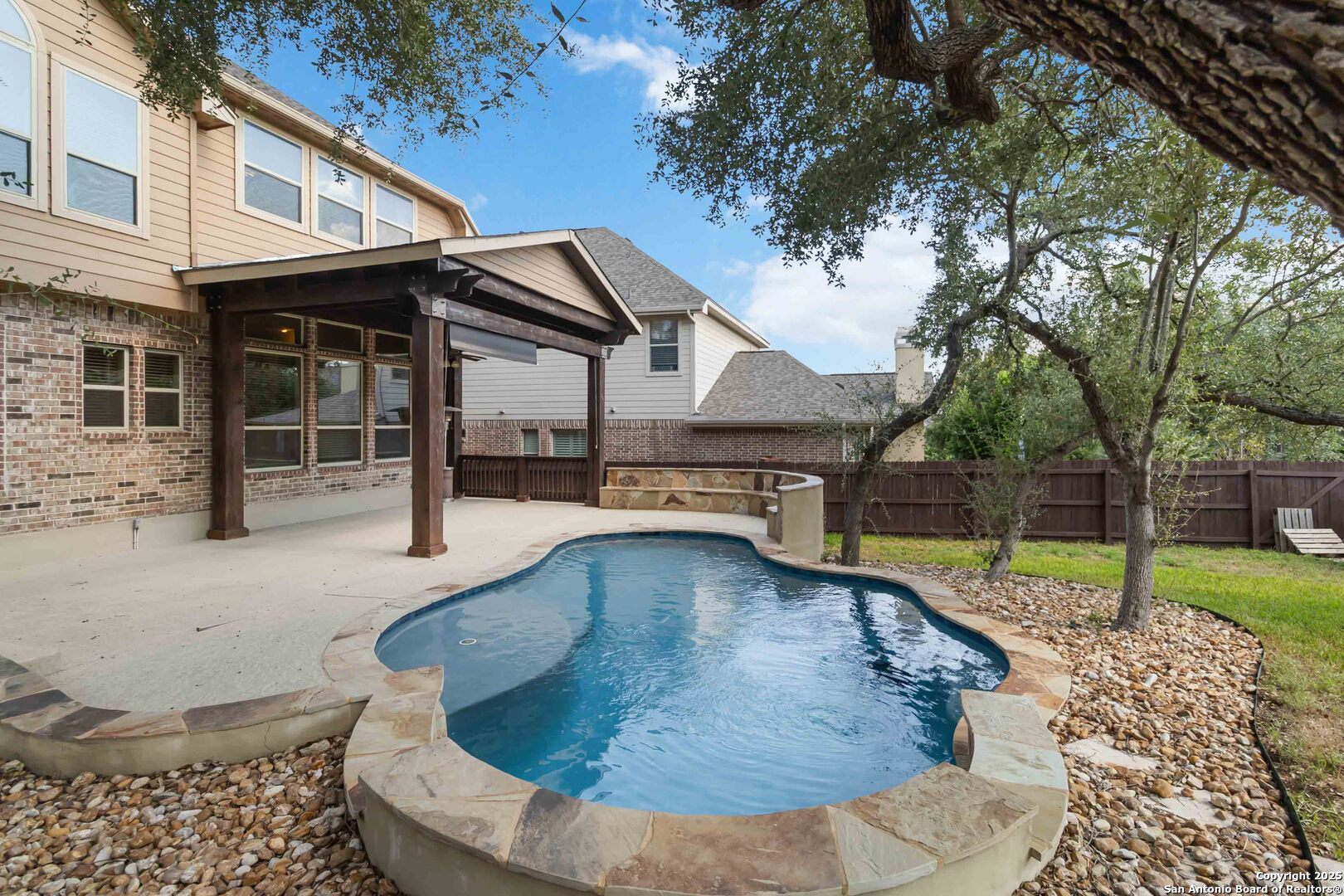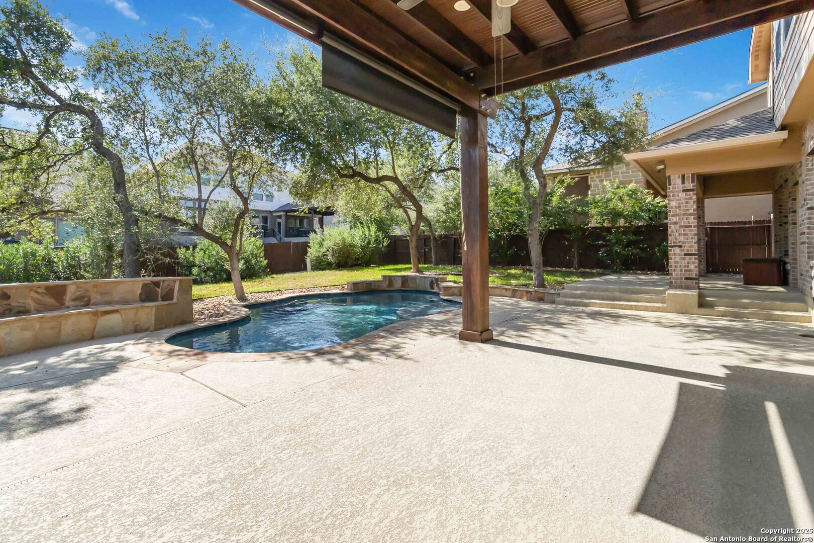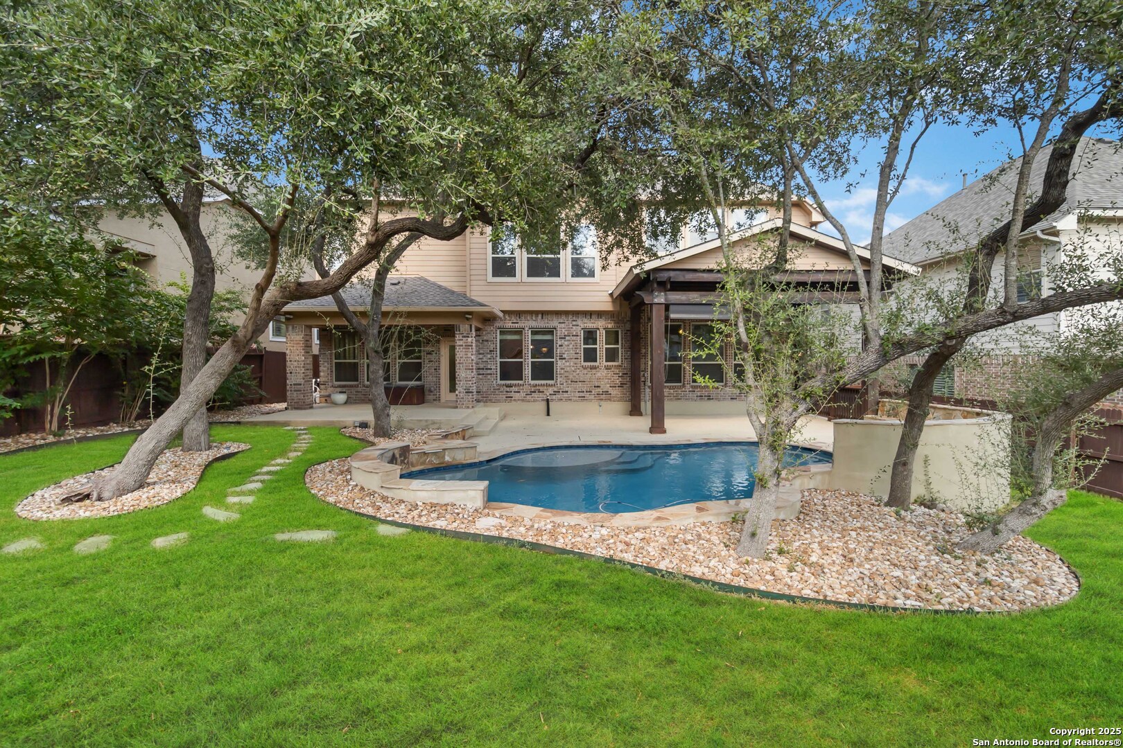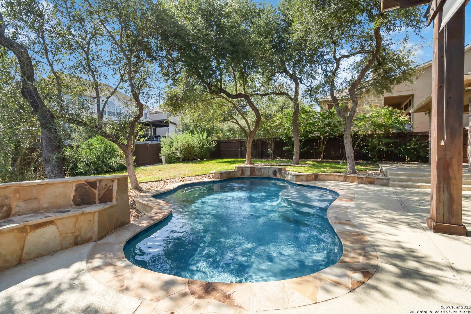 Exquisite Home with Pool, Theater, and Upgrades in Terra Bella - Reagan HS! Welcome to this stunning 5 bedroom, 4.5 bath home located in the highly sought-after Terra Bella community, feeding into Reagan High School. The spacious open-concept floor plan welcomes you with high ceilings, abundant natural light, and a seamless flow perfect for everyday living and entertaining. The living room features a stone fireplace, custom alcoves, and built-in media cabinetry, while the adjacent entryway showcases iron stair railings, tile floors, and a designated home office or study. You'll be captivated by the oversized kitchen, enhanced by pendant lighting, surrounded by granite countertops, generous cabinetry and drawers, and a gas cooktop with built-in oven and a breakfast area! The extra large primary suite offers a tranquil retreat with tons of natural lighting and the primary bathroom features a separate garden tub and shower, double vanity, and a large walk-in closet. Entertain or unwind in the oversized theater room, complete with Epson sound and projection system. The home also has a separate flex room to use as a home gym, playroom or gameroom. The large backyard is truly an oasis, complete with a covered patio with drop-down shades, a sparkling pool, and several dining and lounging areas surrounded by mature trees offering plenty of shade. Additional highlights include a brand-new roof, new dishwasher, and a fully equipped theater system with projector and surround sound. The home features tile and hardwood flooring throughout-carpet in the media room only, offering both style and easy maintenance. Situated in a gated community with controlled access, you'll enjoy added peace of mind. Conveniently located just minutes from shopping, dining, and major highways, this home offers the perfect blend of luxury and accessibility. Don't miss your chance to own this move-in-ready home in the highly desirable Terra Bella community-schedule your private showing today!