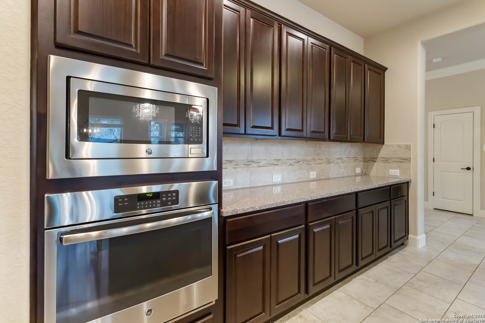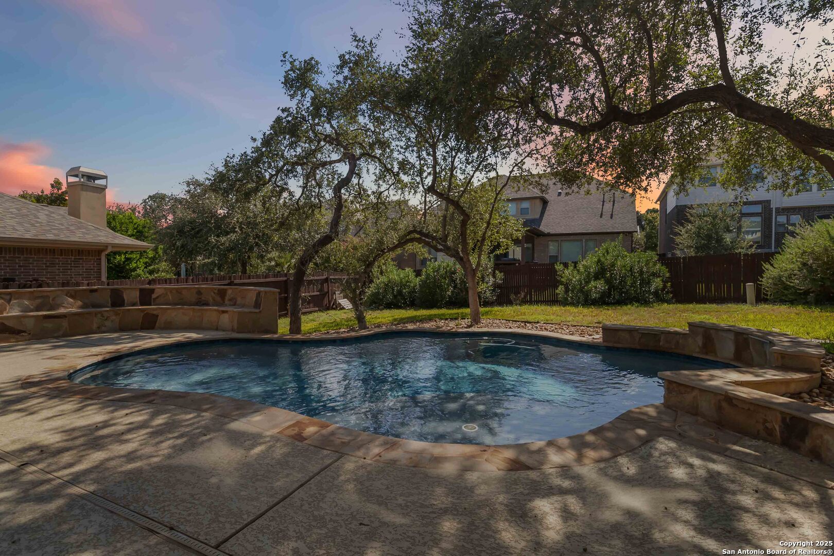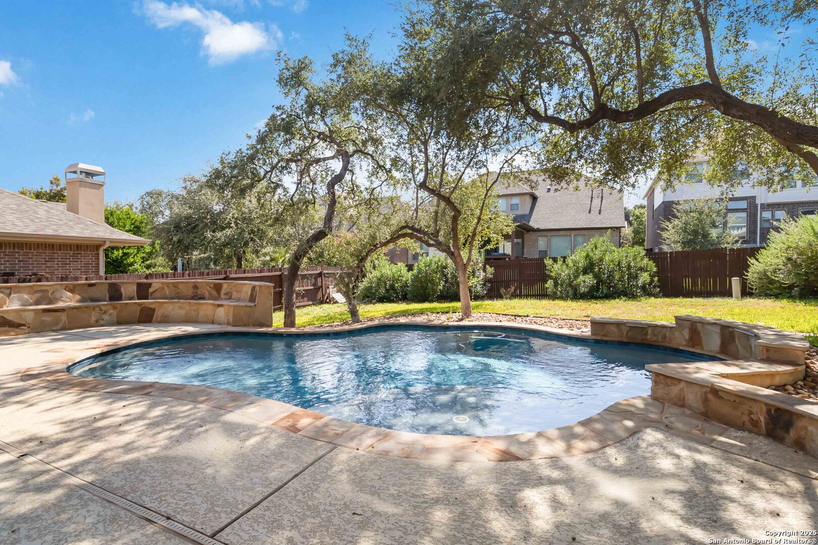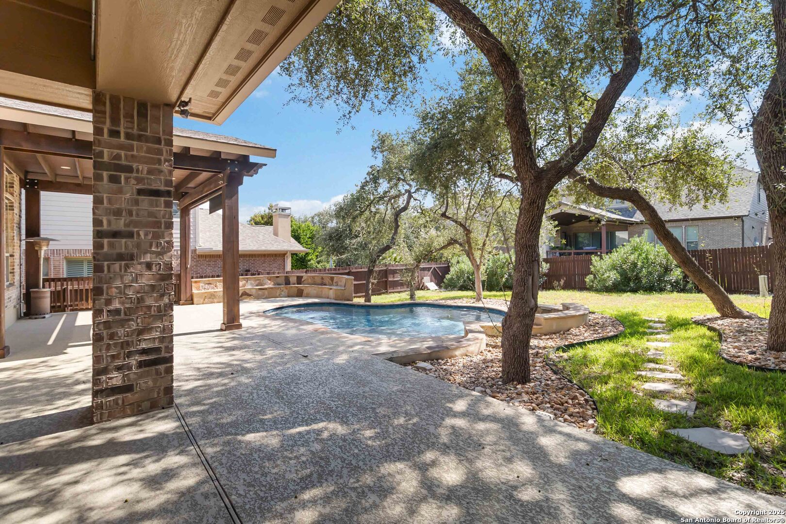 Exquisite Home with Pool, Theater, and Upgrades in Terra Bella - Reagan HS! Welcome to this stunning 5 bedroom, 4.5 bath home located in the highly sought-after Terra Bella community, feeding into Reagan High School. The spacious open-concept floor plan welcomes you with high ceilings, abundant natural light, and a seamless flow perfect for everyday living and entertaining. The living room features a stone fireplace, custom alcoves, and built-in media cabinetry, while the adjacent entryway showcases iron stair railings, tile floors, and a designated home office or study. You'll be captivated by the oversized kitchen, enhanced by pendant lighting, surrounded by granite countertops, generous cabinetry and drawers, and a gas cooktop with built-in oven and a breakfast area! The extra large primary suite offers a tranquil retreat with tons of natural lighting and the primary bathroom features a separate garden tub and shower, double vanity, and a large walk-in closet. Entertain or unwind in the oversized theater room, complete with Epson sound and projection system. The home also has a separate flex room to use as a home gym, playroom or gameroom. The large backyard is truly an oasis, complete with a covered patio with drop-down shades, a sparkling pool, and several dining and lounging areas surrounded by mature trees offering plenty of shade. Additional highlights include a brand-new roof, new dishwasher, and a fully equipped theater system with projector and surround sound. The home features tile and hardwood flooring throughout-carpet in the media room only, offering both style and easy maintenance. Situated in a gated community with controlled access, you'll enjoy added peace of mind. Conveniently located just minutes from shopping, dining, and major highways, this home offers the perfect blend of luxury and accessibility. Don't miss your chance to own this move-in-ready home in the highly desirable Terra Bella community-schedule your private showing today!