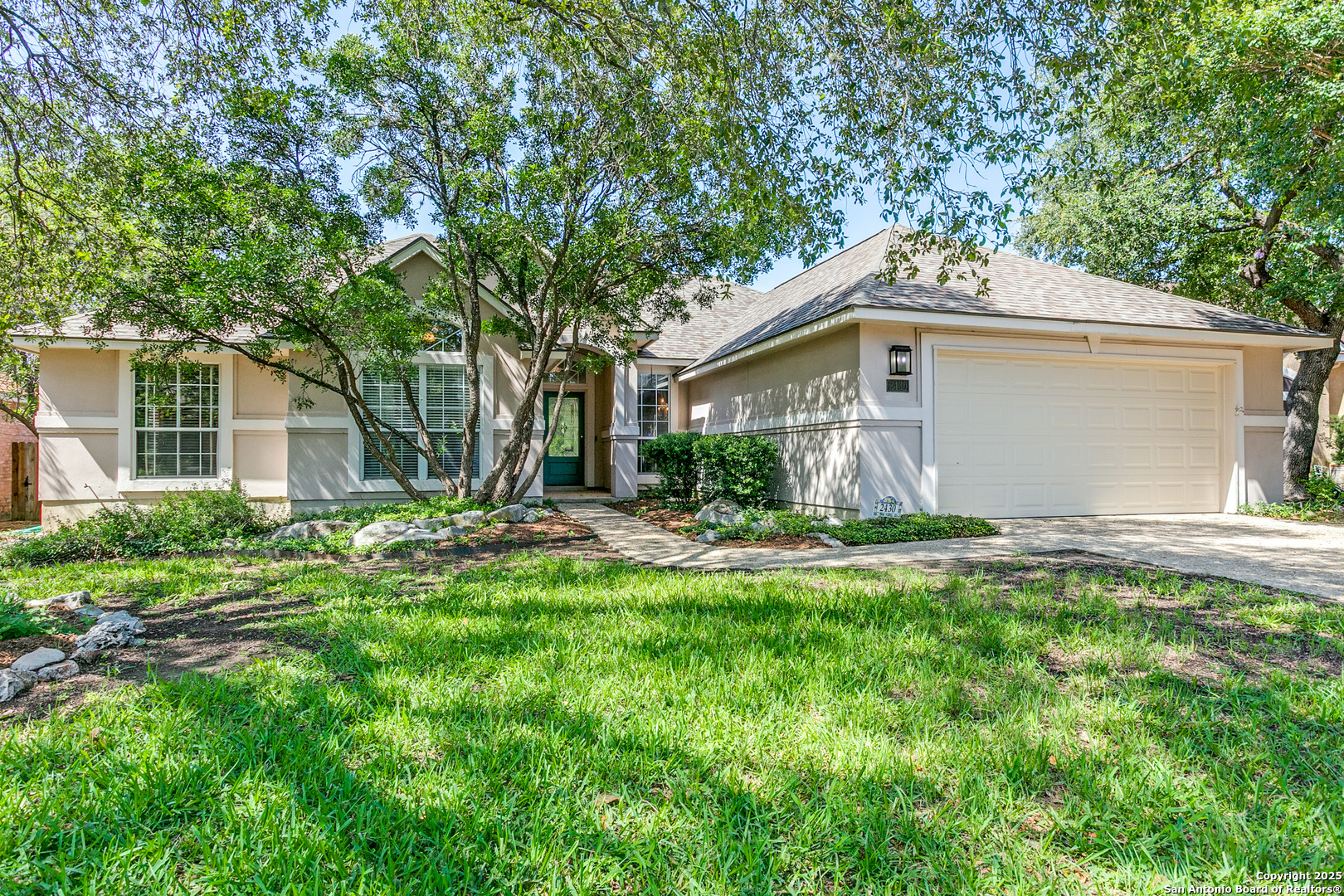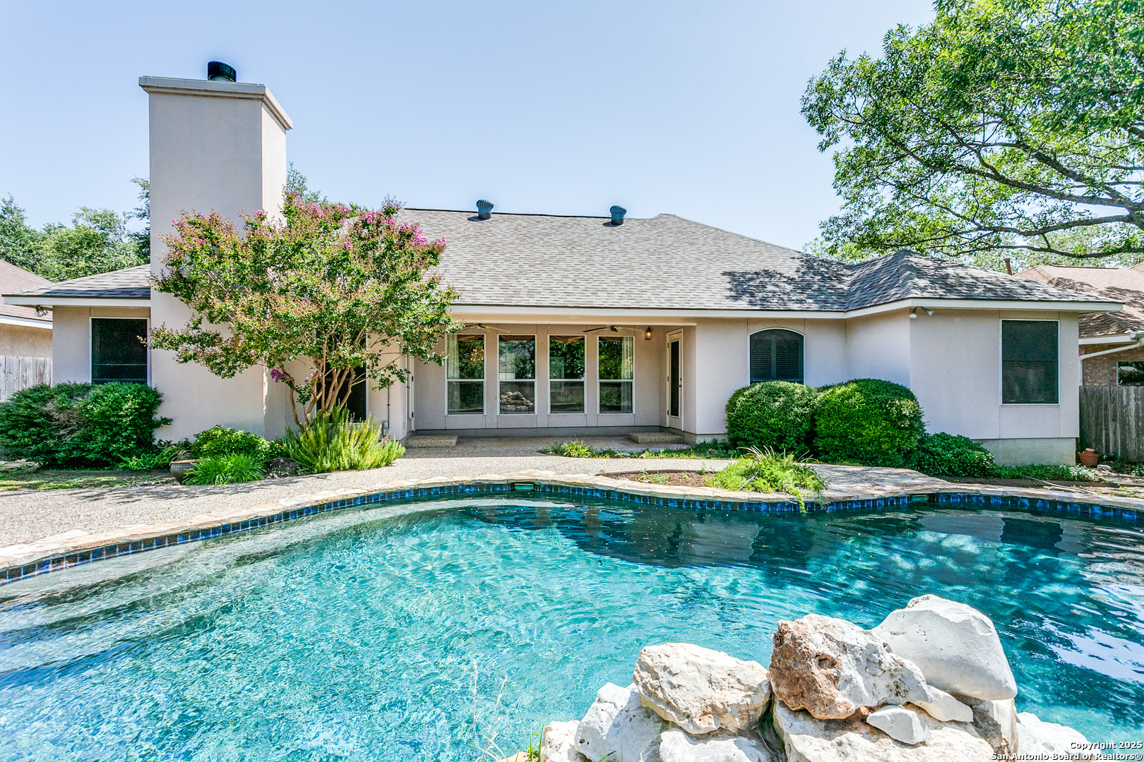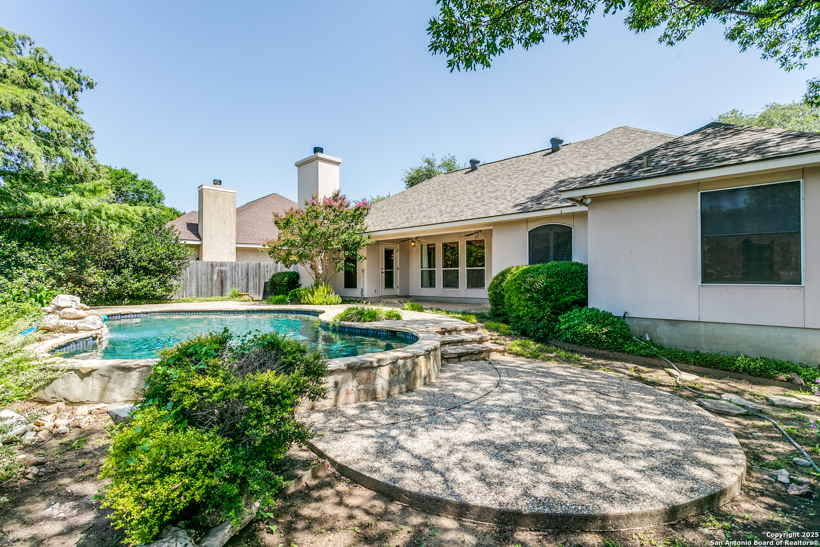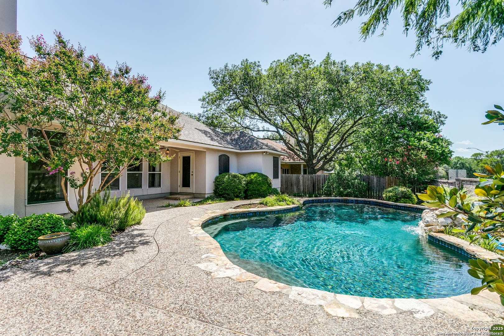 Custom, one owner Mann home in the desirable Canyon Oaks Estates neighborhood. One story stucco home on a level lot with mature Oak trees and landscaping. Keith Zars constructed and weekly maintained pool in the back yard with adjacent covered patio for relaxing year-round. Private backyard, with no immediate back neighbors, on a 30 mph, low traffic, residential street. Inside enjoy multiple living spaces with a formal living room plus a family room with a wood/gas fireplace. Three eating areas include a formal dining room, breakfast area and breakfast bar. The newly remodeled kitchen features granite countertops, custom cabinets, built-in oven and cooktop. All blinds are included plus plantation shutters in the family room and exterior solar shades. The primary suite with patio access features a spacious walk-in closet, double vanity, a separate shower and jetted garden tub. Two secondary bedrooms share a bathroom. Easy access to retail, restaurants, 281 and 1604 plus SA International Airport. No HOA. Seller is offering $1500 towards repairs of buyer's choice.