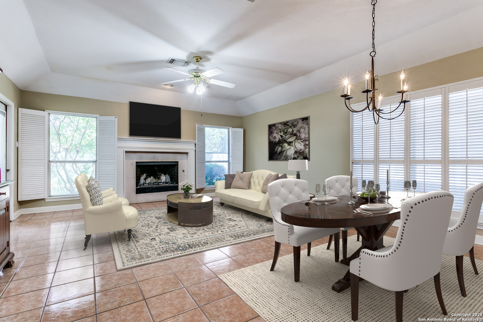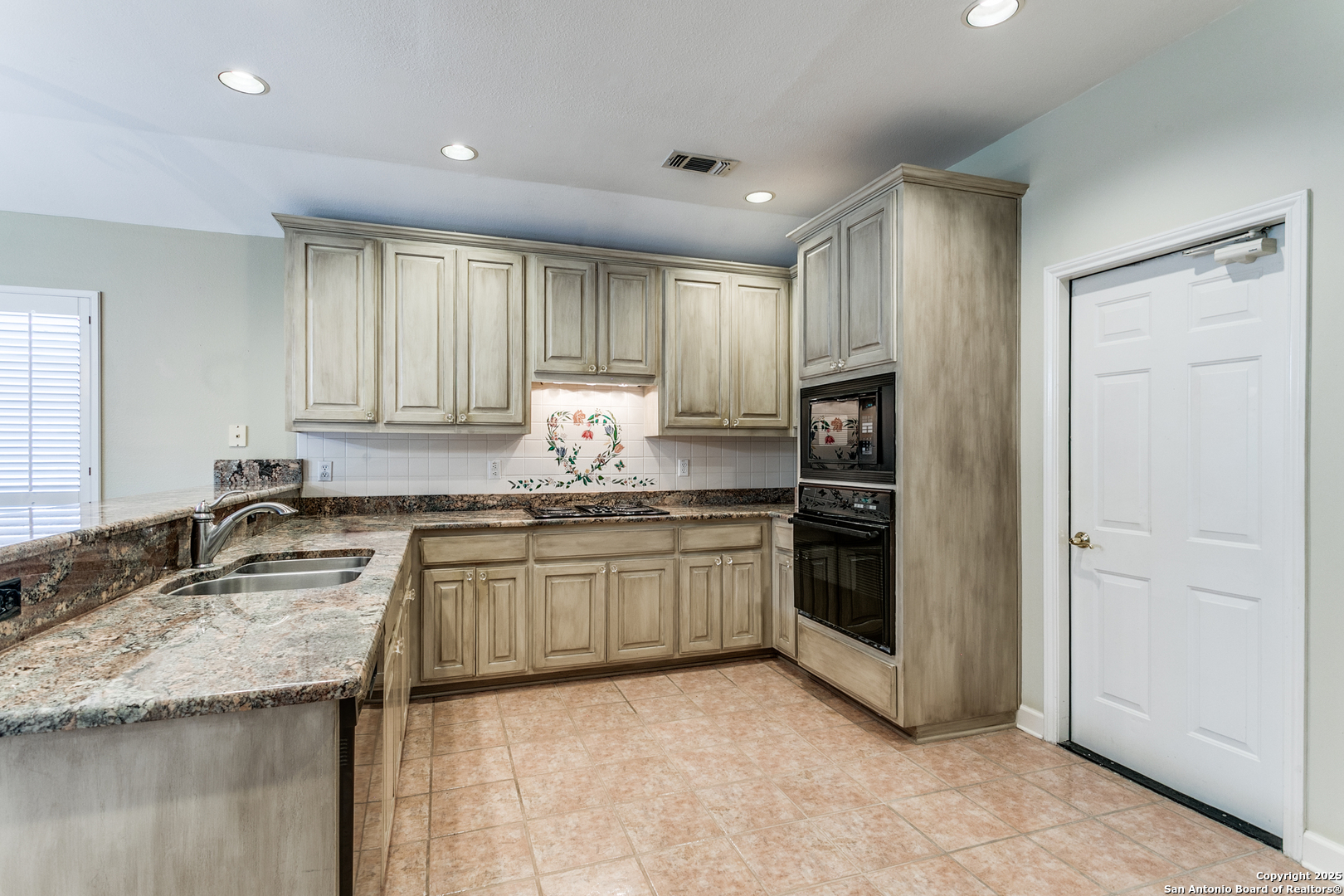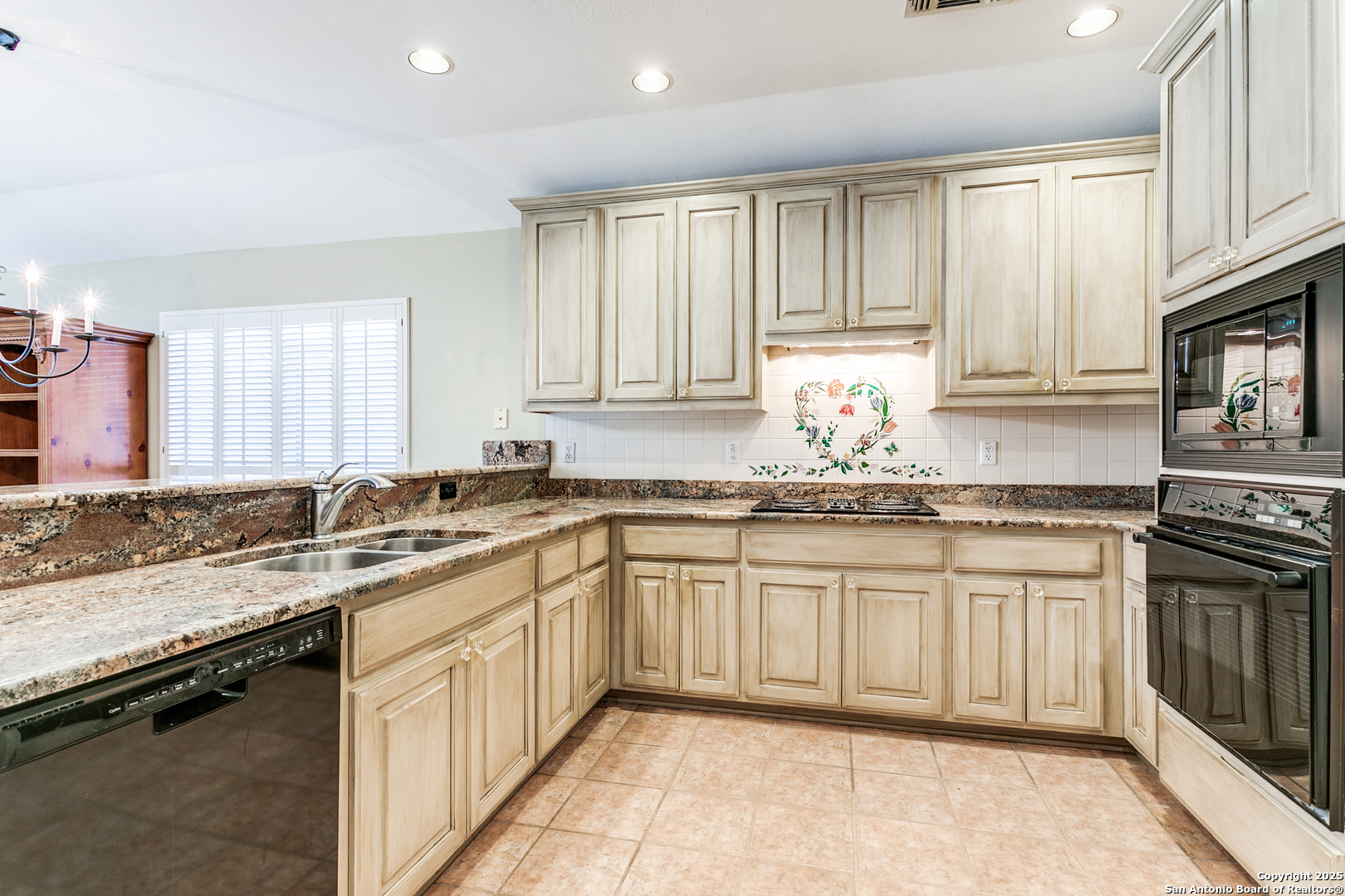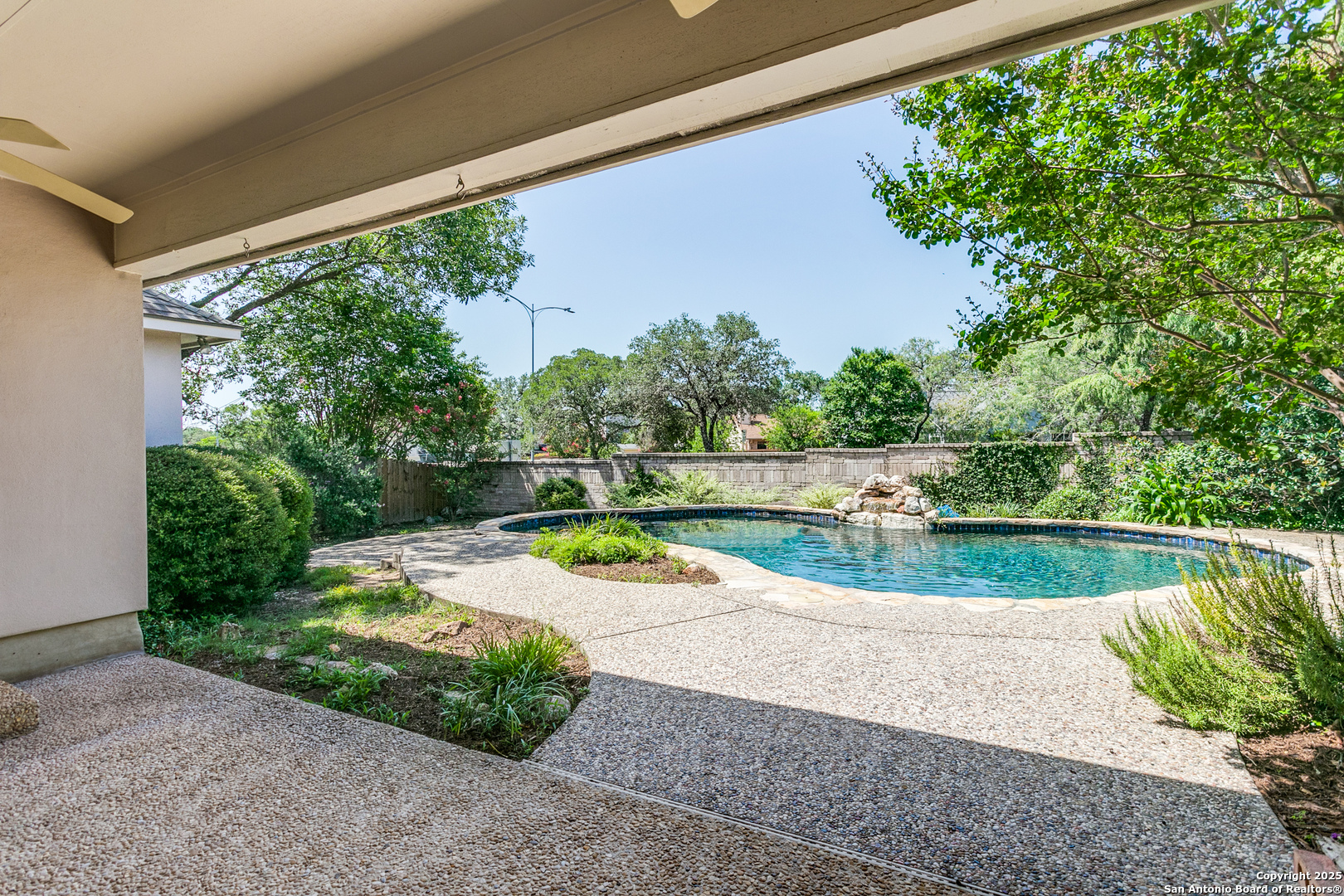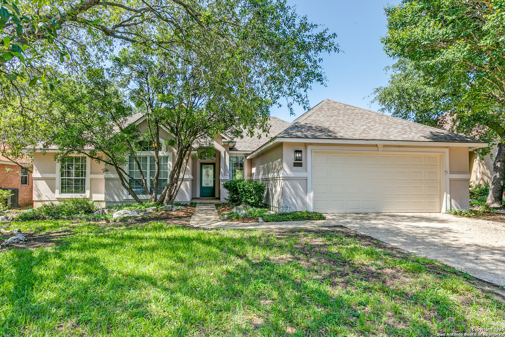Custom, one owner Mann home in the desirable Canyon Oaks Estates neighborhood. One story stucco home on a level lot with mature Oak trees and landscaping. Keith Zars constructed and weekly maintained pool in the back yard with adjacent covered patio for relaxing year-round. Private backyard, with no immediate back neighbors, on a 30 mph, low traffic, residential street. Inside enjoy multiple living spaces with a formal living room plus a family room with a wood/gas fireplace. Three eating areas include a formal dining room, breakfast area and breakfast bar. The newly remodeled kitchen features granite countertops, custom cabinets, built-in oven and cooktop. All blinds are included plus plantation shutters in the family room and exterior solar shades. The primary suite with patio access features a spacious walk-in closet, double vanity, a separate shower and jetted garden tub. Two secondary bedrooms share a bathroom. Easy access to retail, restaurants, 281 and 1604 plus SA International Airport. No HOA. Seller is offering $1500 towards repairs of buyer's choice.