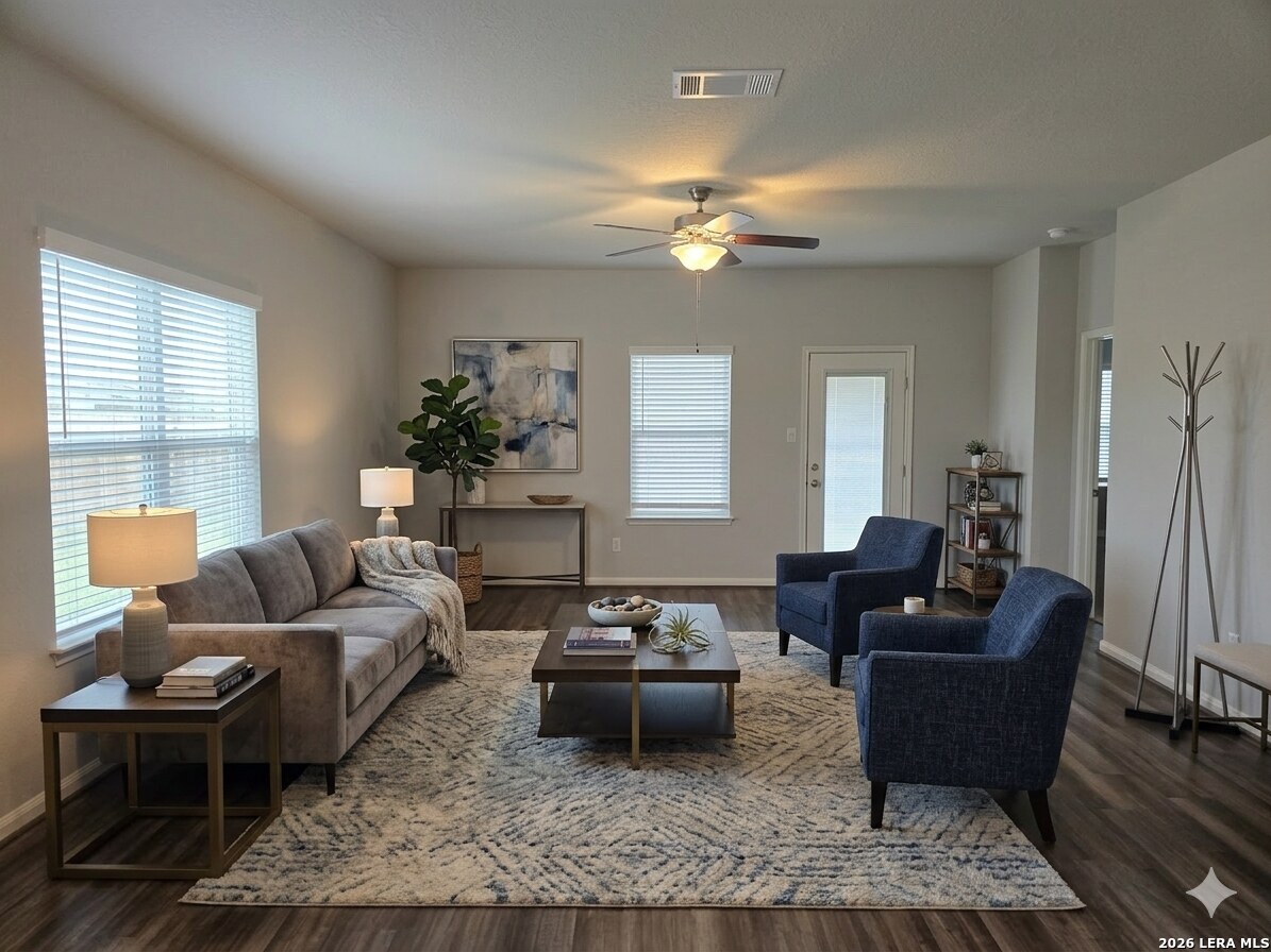 Welcome home to this modern and inviting 4-bedroom, 2.5-bath residence in West San Antonio, conveniently located near SeaWorld and top-rated schools. Step inside to a bright, open-concept layout featuring stylish wood-look flooring that enhances the home's warm and welcoming feel. The centerpiece of the home is a beautifully designed kitchen, complete with a large island, bar seating, and sleek stainless steel appliances-perfect for entertaining or everyday living. The spacious primary suite, located on the main floor, offers a private retreat with high ceilings, abundant natural light, and a luxurious en suite bathroom featuring dual vanities, a soaking tub, and a separate shower. Upstairs, you'll find three additional bedrooms along with a versatile loft space-ideal for a home office, game room, or second living area-providing both comfort and privacy for family or guests. This home combines modern style, functional space, and a prime location-ready for you to move in and enjoy.