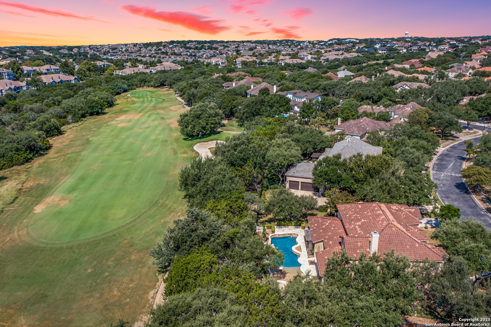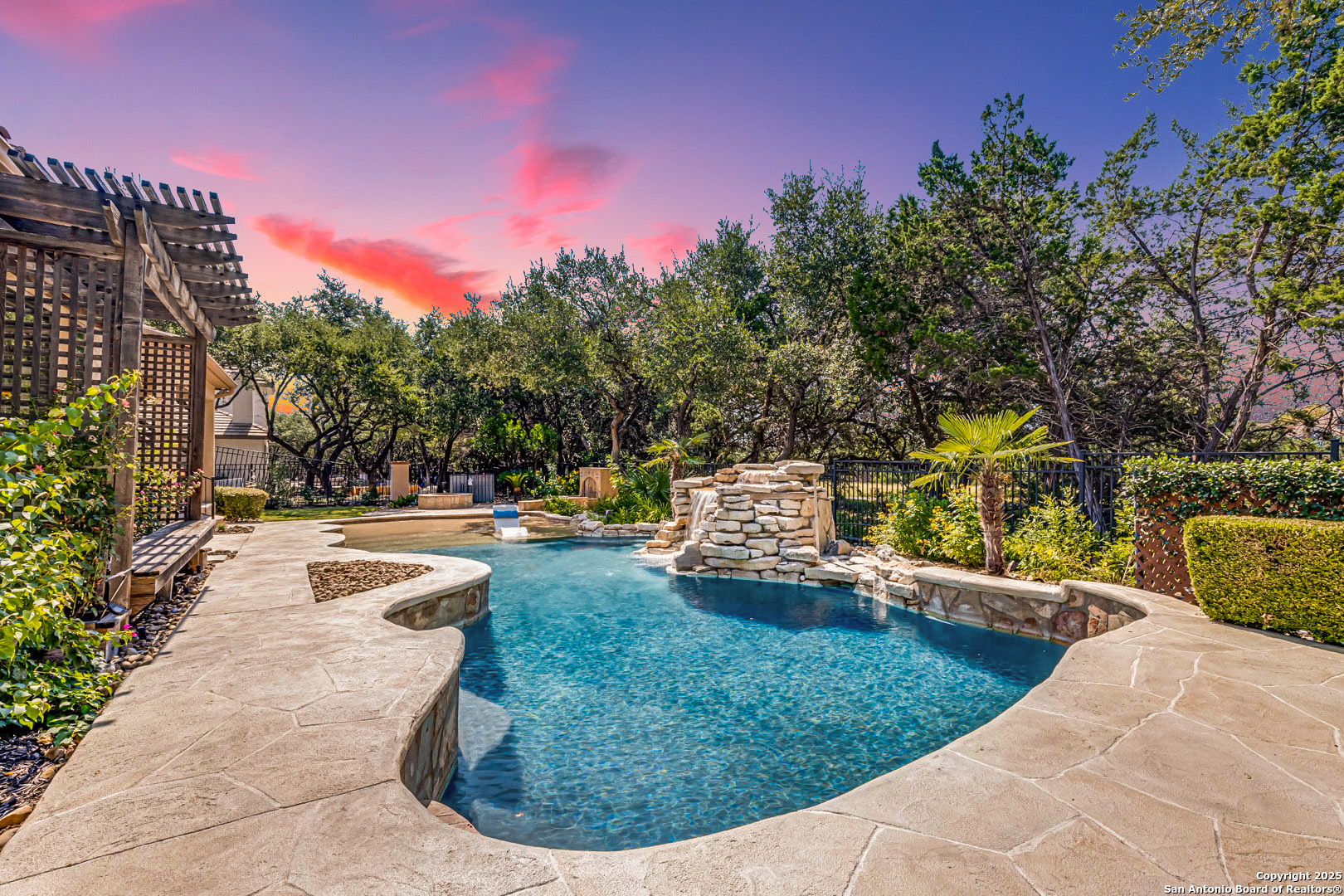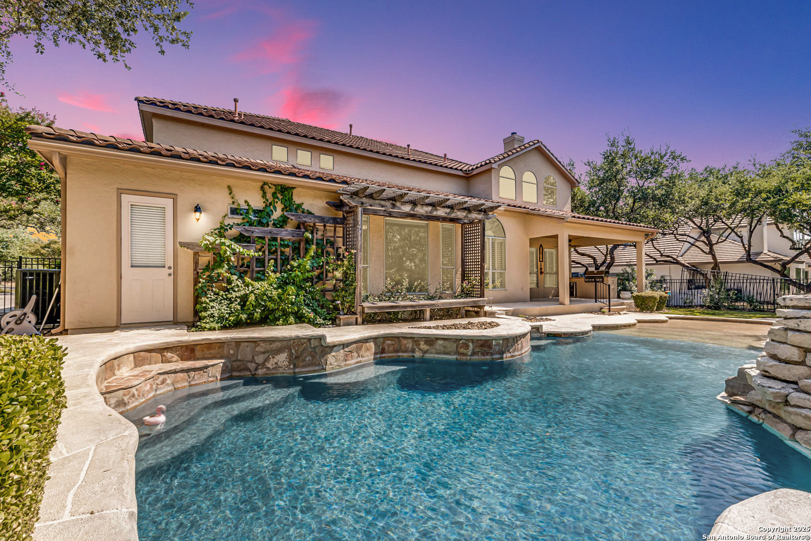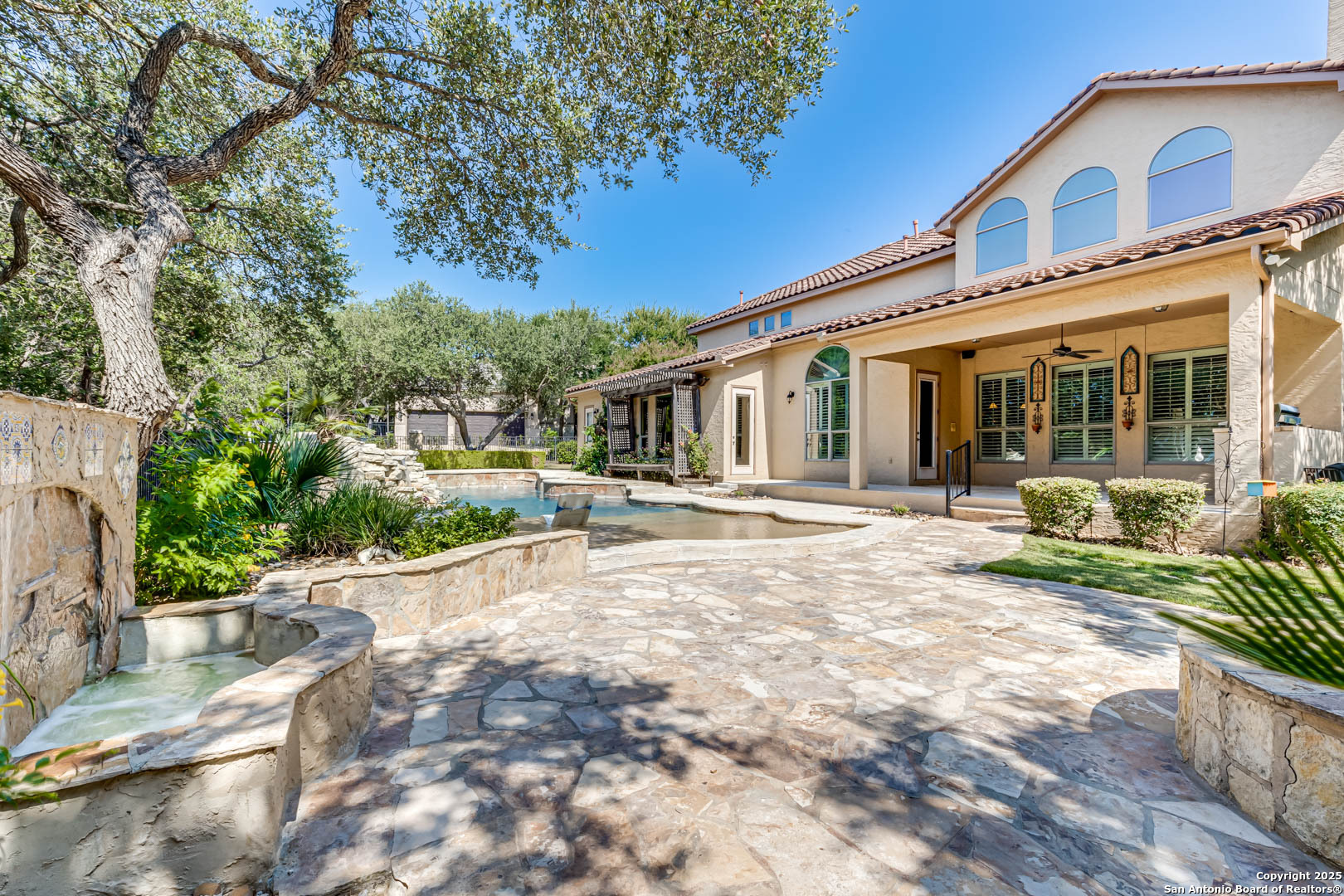 Welcome to the Estates of Canyon Springs - Stone Oak's Most Prestigious Gated Community! Through the guarded gates, you'll find the exclusive Estates perfectly situated between the community park, playground, basketball courts, and the fourth hole of the renowned Canyon Springs Golf Course. This stunning five-bedroom, four full-bath, and two half-bath estate includes a dedicated cabana bath for seamless poolside living. Recently updated and freshly painted, the home showcases custom cabinetry, rich wood floors, and elegant travertine tile throughout. From the moment you arrive, the incredible curb appeal sets the tone. Inside, an open floor plan and walls of windows frame views of the large covered lanai, outdoor kitchen, built-in fire pit, and waterfall. The luxury pool, complete with a stone grotto, overlooks the lush green fairways, creating a true backyard retreat. The chef's kitchen, equipped with premium finishes, opens to the family room anchored by a dramatic floor-to-ceiling fireplace. The front office doubles as a fifth bedroom with a private, half bathroom-perfect for guests or multigenerational living. The primary suite offers serene poolside views and a spa-like bath with dual vanities, a spacious walk-in closet, an oversized walk-in shower, and a luxurious garden tub. Upstairs, a large homework station, spacious secondary bedrooms, and a versatile bonus room-ideal for a teen space or workout area-provide flexible living. The crown jewel of the upper level is the expansive game room, complete with a wet bar and ample space for both media and recreation-billiards table included! Experience a lifestyle of luxury, privacy, and security in one of San Antonio's most sought-after communities.