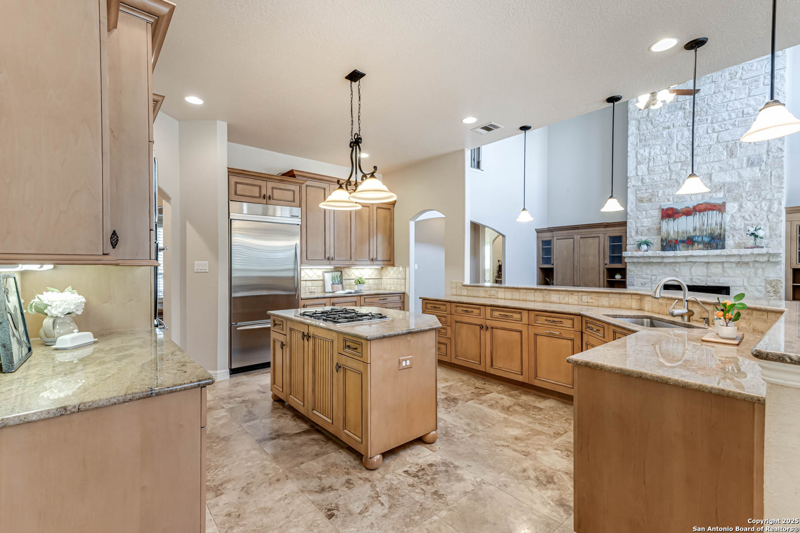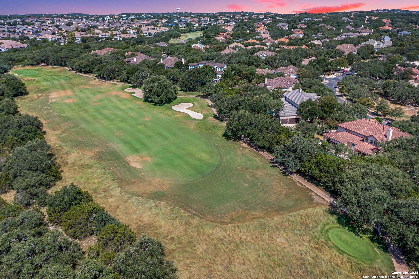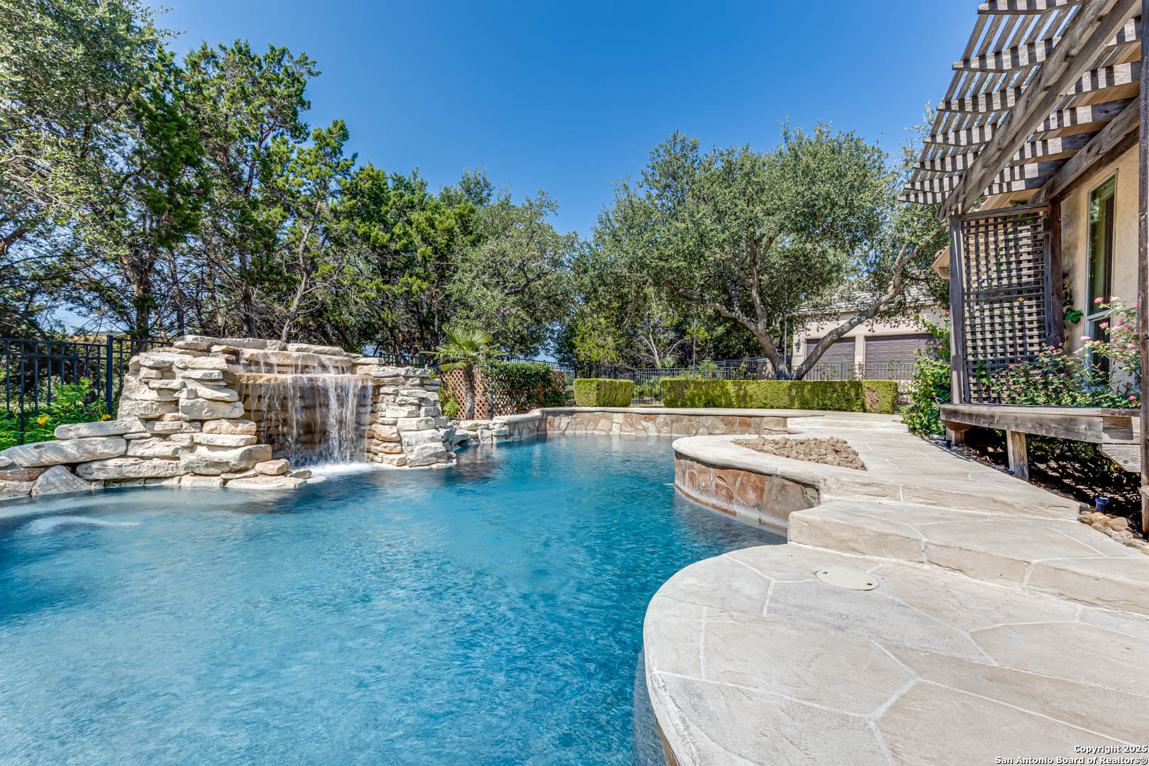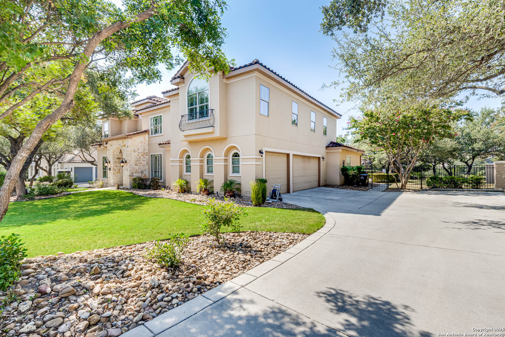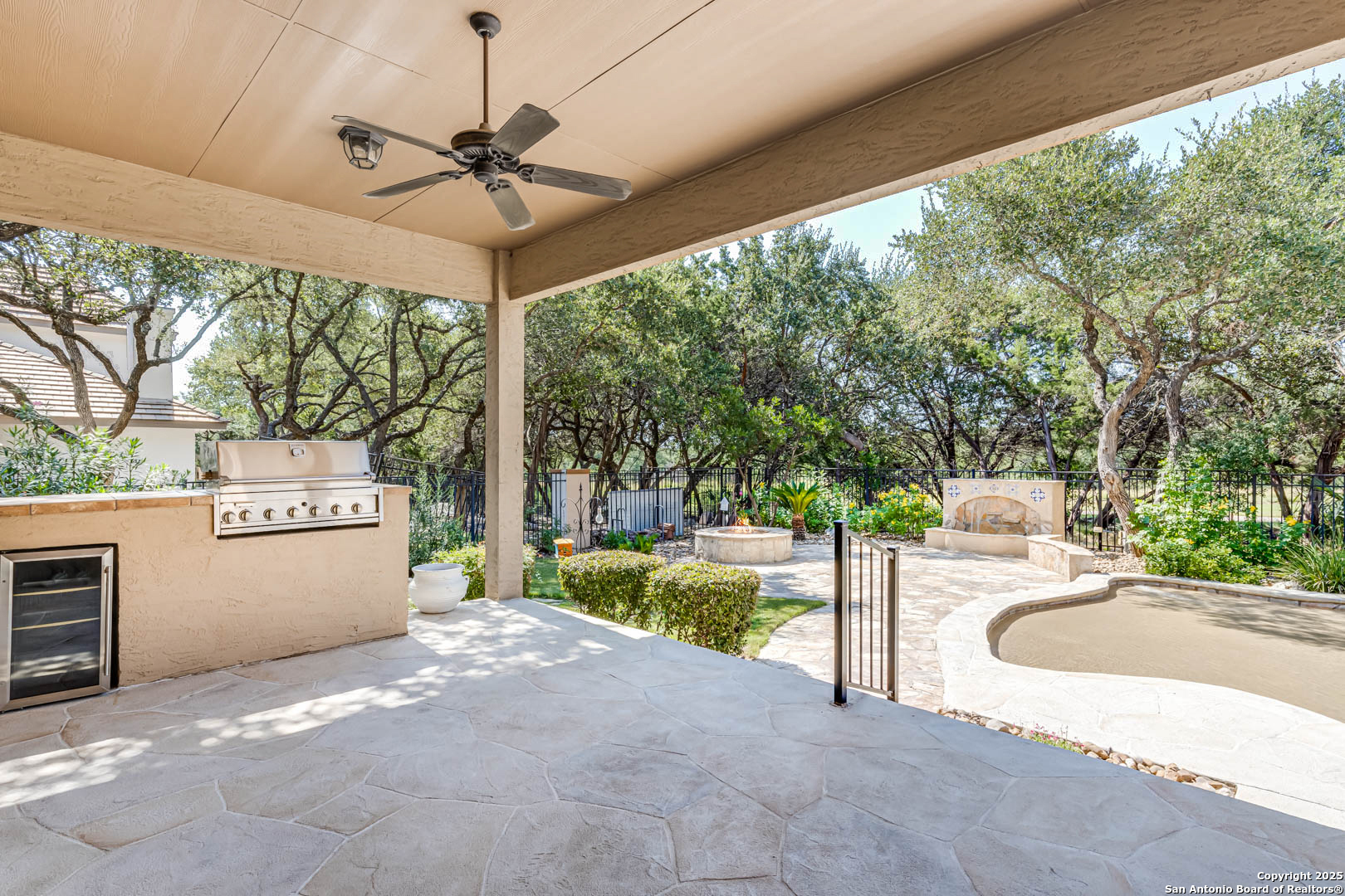 Welcome to the Estates of Canyon Springs - Stone Oak's Most Prestigious Gated Community! Through the guarded gates, you'll find the exclusive Estates perfectly situated between the community park, playground, basketball courts, and the fourth hole of the renowned Canyon Springs Golf Course. This stunning five-bedroom, four full-bath, and two half-bath estate includes a dedicated cabana bath for seamless poolside living. Recently updated and freshly painted, the home showcases custom cabinetry, rich wood floors, and elegant travertine tile throughout. From the moment you arrive, the incredible curb appeal sets the tone. Inside, an open floor plan and walls of windows frame views of the large covered lanai, outdoor kitchen, built-in fire pit, and waterfall. The luxury pool, complete with a stone grotto, overlooks the lush green fairways, creating a true backyard retreat. The chef's kitchen, equipped with premium finishes, opens to the family room anchored by a dramatic floor-to-ceiling fireplace. The front office doubles as a fifth bedroom with a private, half bathroom-perfect for guests or multigenerational living. The primary suite offers serene poolside views and a spa-like bath with dual vanities, a spacious walk-in closet, an oversized walk-in shower, and a luxurious garden tub. Upstairs, a large homework station, spacious secondary bedrooms, and a versatile bonus room-ideal for a teen space or workout area-provide flexible living. The crown jewel of the upper level is the expansive game room, complete with a wet bar and ample space for both media and recreation-billiards table included! Experience a lifestyle of luxury, privacy, and security in one of San Antonio's most sought-after communities.