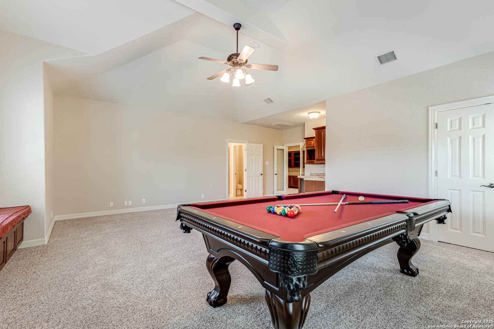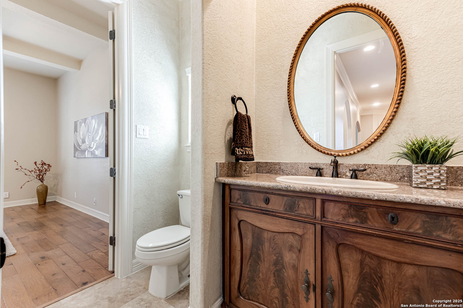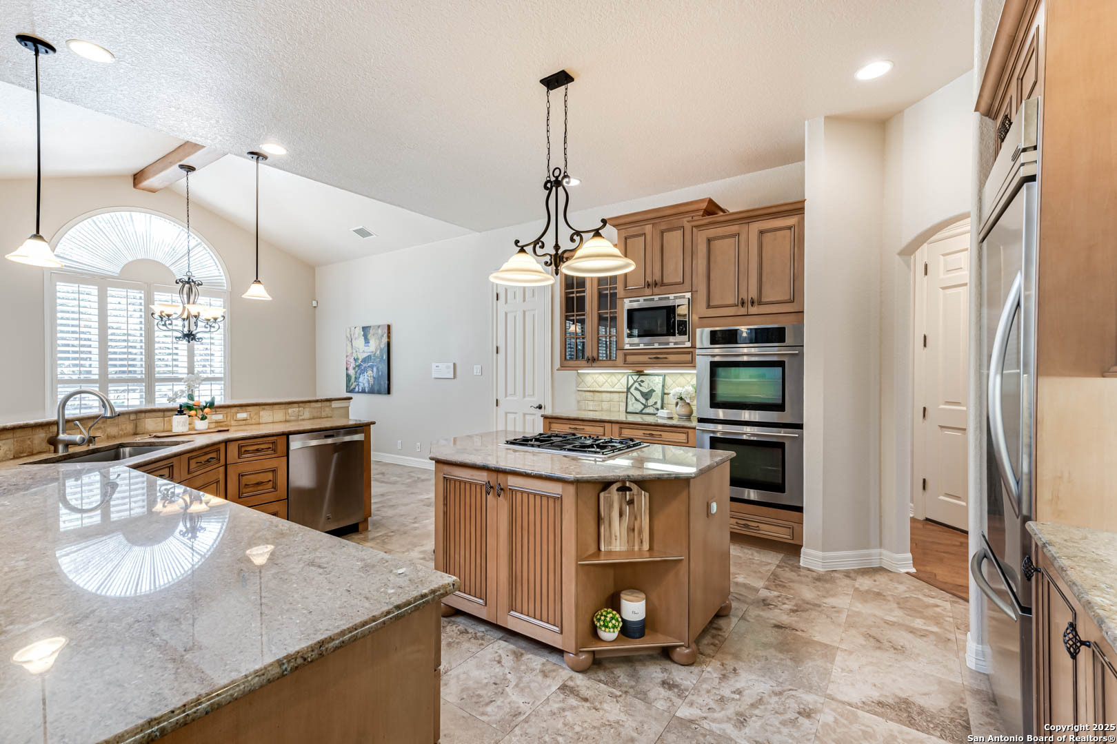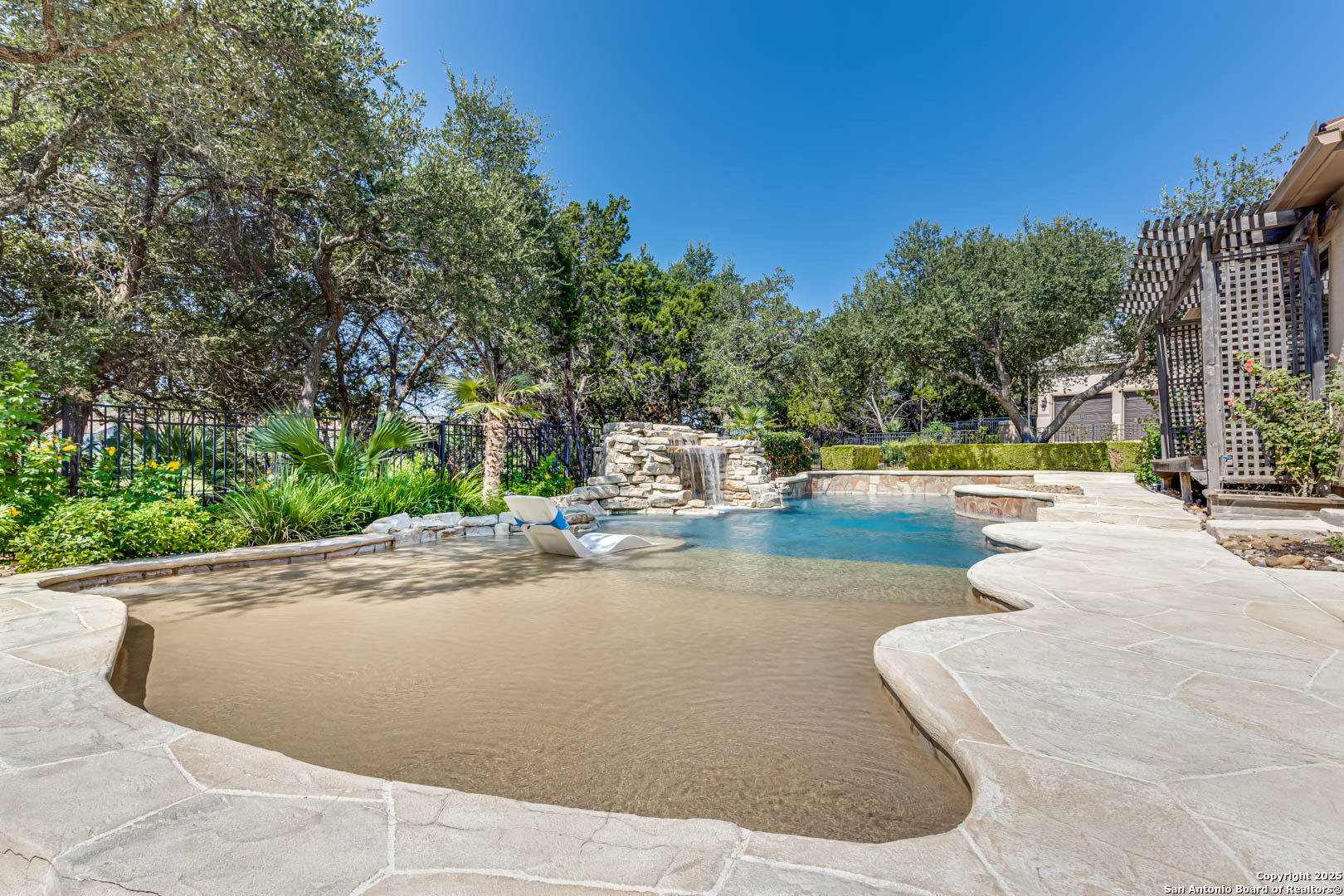 Welcome to the Estates of Canyon Springs - Stone Oak's Most Prestigious Gated Community! Through the guarded gates, you'll find the exclusive Estates perfectly situated between the community park, playground, basketball courts, and the fourth hole of the renowned Canyon Springs Golf Course. This stunning five-bedroom, four full-bath, and two half-bath estate includes a dedicated cabana bath for seamless poolside living. Recently updated and freshly painted, the home showcases custom cabinetry, rich wood floors, and elegant travertine tile throughout. From the moment you arrive, the incredible curb appeal sets the tone. Inside, an open floor plan and walls of windows frame views of the large covered lanai, outdoor kitchen, built-in fire pit, and waterfall. The luxury pool, complete with a stone grotto, overlooks the lush green fairways, creating a true backyard retreat. The chef's kitchen, equipped with premium finishes, opens to the family room anchored by a dramatic floor-to-ceiling fireplace. The front office doubles as a fifth bedroom with a private, half bathroom-perfect for guests or multigenerational living. The primary suite offers serene poolside views and a spa-like bath with dual vanities, a spacious walk-in closet, an oversized walk-in shower, and a luxurious garden tub. Upstairs, a large homework station, spacious secondary bedrooms, and a versatile bonus room-ideal for a teen space or workout area-provide flexible living. The crown jewel of the upper level is the expansive game room, complete with a wet bar and ample space for both media and recreation-billiards table included! Experience a lifestyle of luxury, privacy, and security in one of San Antonio's most sought-after communities.