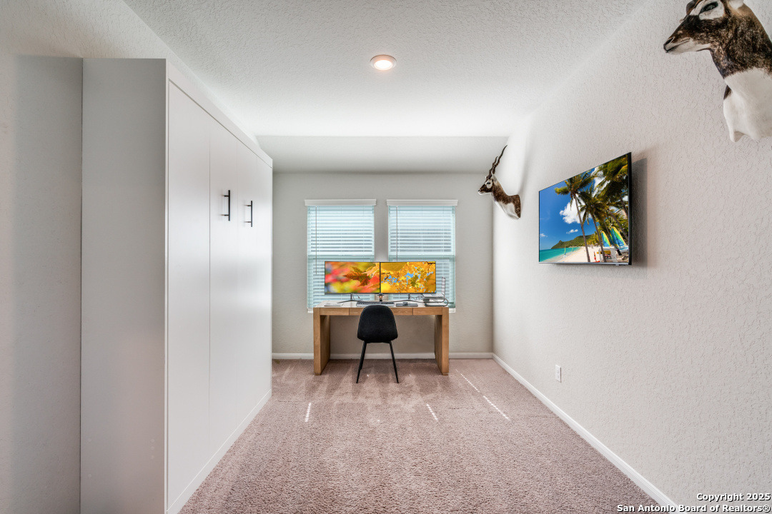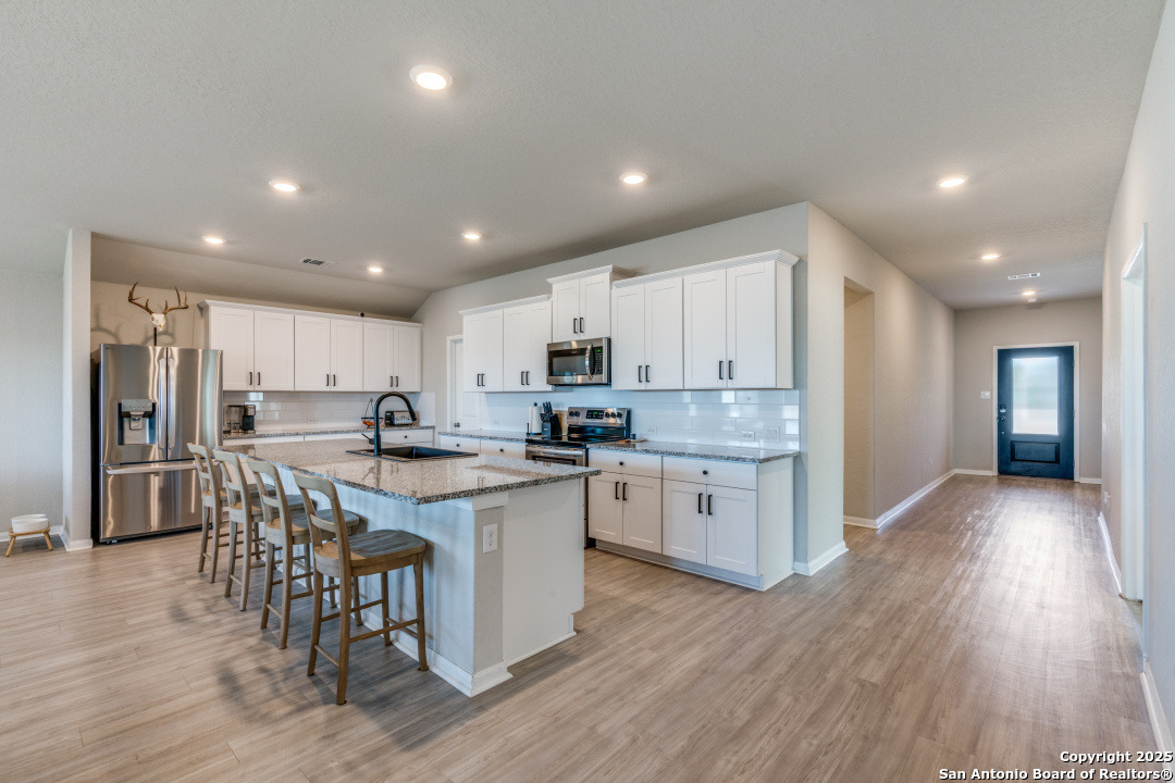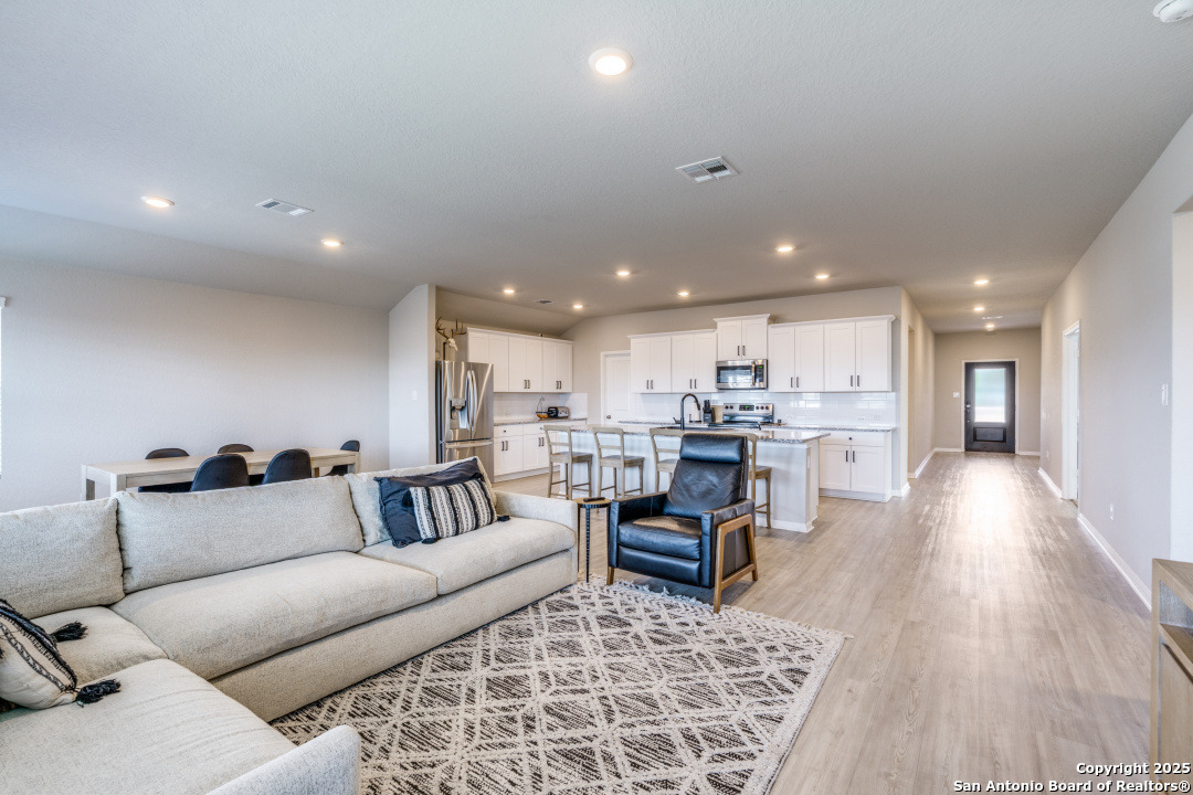 Located in the desirable Voss Farms community, this barely lived-in 4 bedroom, 2 bathroom home built in 2021 offers modern design, thoughtful upgrades, and an inviting open floor plan. The spacious kitchen is a true centerpiece, featuring abundant cabinetry, a large island with bar seating, stainless steel appliances, and a deep farmhouse-style sink. Just off the kitchen, an additional flex space serves perfectly as a home office or secondary living area. The primary suite provides a peaceful retreat with an en suite bathroom that includes dual vanities and a large walk-in shower, while the additional bedrooms offer comfort and versatility for family or guests. Step outside to a covered back patio with scenic views and enjoy added privacy thanks to extra space between rear neighbors and an open easement lot next door. Combining comfort, functionality, and a prime location, this Voss Farms home is move-in ready and beautifully maintained.