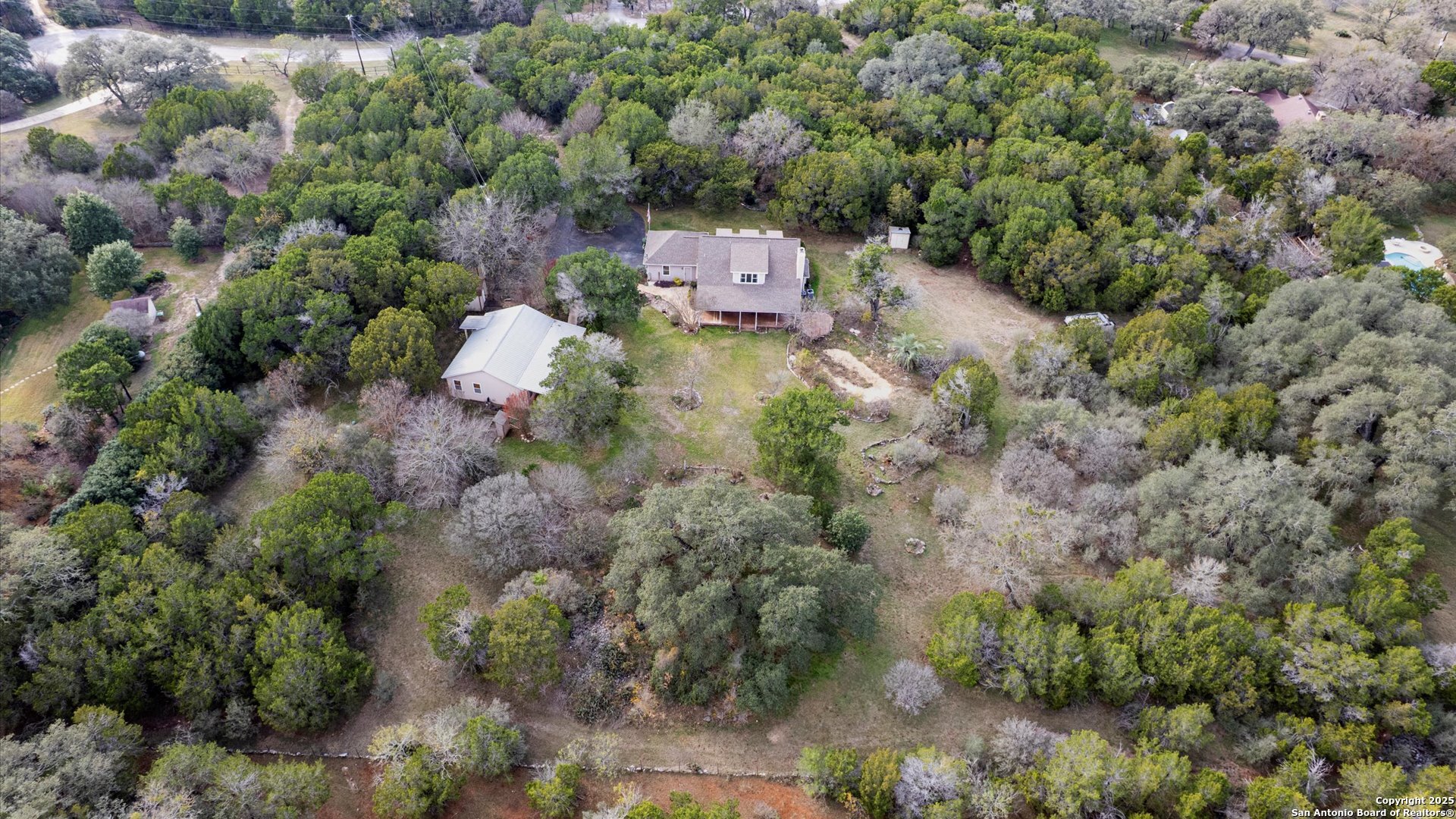 Set on 5 beautiful acres, this unique property offers two homes-ideal for multi-generational living, guests, or extra space to spread out and enjoy Hill Country privacy. A private gated entrance leads you into a peaceful setting surrounded by mature trees and wide-open space. The main home is a two-story layout featuring 3 bedrooms and 2 full baths, with the primary suite conveniently located downstairs along with the laundry room. Two separate living areas provide flexibility for everyday living or entertaining, and the main living room features a cozy fireplace, built-ins, and tons of natural light. Upstairs you'll find two additional bedrooms, a full bath, and a charming sitting area that works perfectly as a home office, reading nook, or quiet place to relax. Step out the back door onto a covered deck-great for enjoying the views and peaceful surroundings. The second home offers a comfortable one-bedroom, one-bath layout with vaulted ceilings, a full kitchen, office space, and its own laundry room-perfect for extended family or long-term guests. Additional features include two storage sheds, no city taxes, a voluntary HOA, and plenty of room to enjoy the outdoors. This is a beautiful, private property with space, flexibility, and endless possibilities.