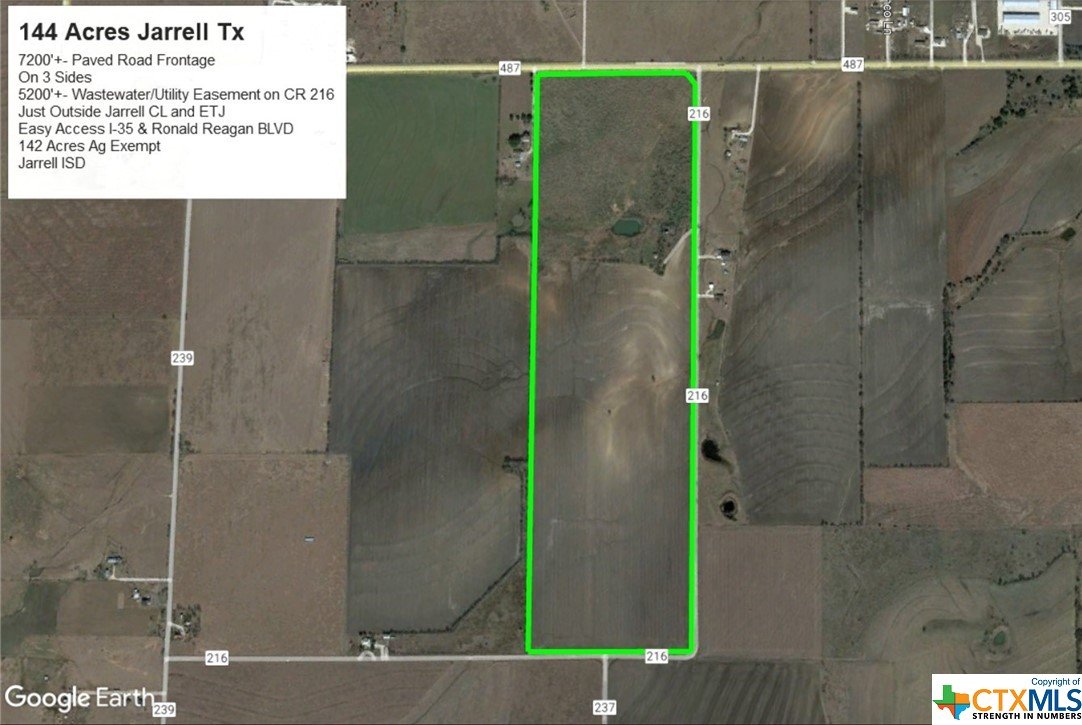BACK ON THE MARKET-REDUCED PRICE! A REMARKABLE OPPORTUNITY FOR DEVELOPMENT WITH 144 ACRES LOCATED JUST OUTSIDE THE JARRELL CITY LIMITS AND ETJ. THIS PROPERTY HAS 7200+- FEET OF PAVED ROAD FRONTAGE BORDERING 3 SIDES AND 5200+- FEET OF WASTEWATER/UTILITY EASEMENT ALONG COUNTY ROAD 216 TO FM 487. GREAT TOPOGRAPHY. EASY ACCESS TO I-35 AND RONALD REAGAN BLVD. APPROXIMATLEY 15 MILES FROM GEORGETOWN, 23 MILES TO ROUND ROCK, AND 42 MILES FROM THE HEART OF AUSTIN. LESS THAN 1.4 MILES FROM JARRELL HIGH SCHOOL AND JUST A FEW MINUTES FROM LOCAL SHOPPING. 142 ACRES ARE CURRENTLY AG EXEMPT. AG LEASE IN PLACE. SELLER WILL NOT BE PLACING ANY RESTRICTIONS ON THE PROPERTY. JARRELL ISD.