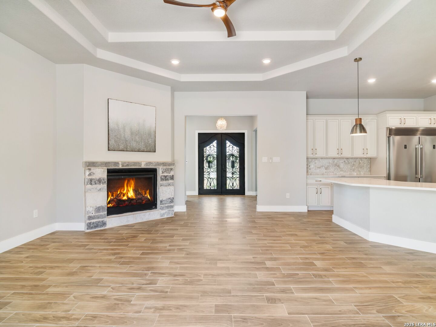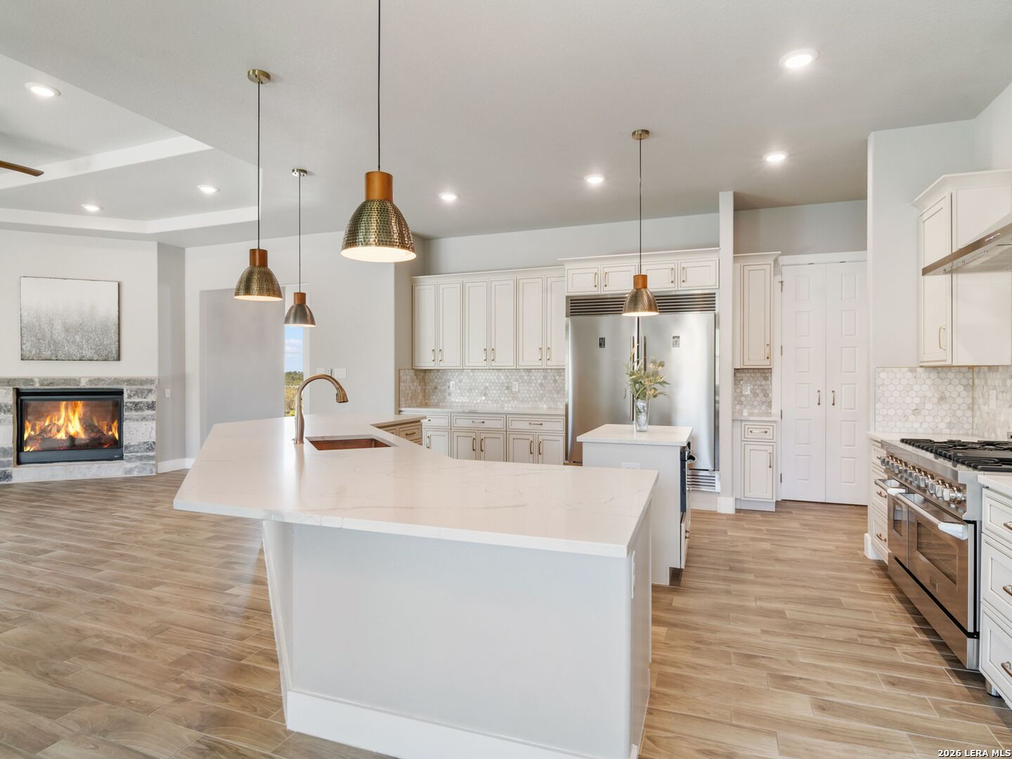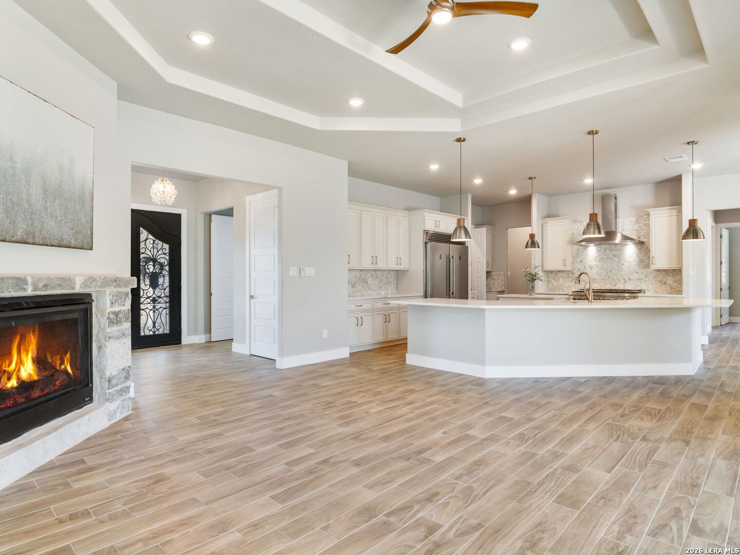 Set on 2 acres in Summit Ridge, this well appointed residence offers a balance of scale, comfort, and everyday livability just minutes from Medina Lake. A pillared entrance, circular drive, and all masonry stucco and stone exterior create a strong first impression, while the oversized side entry three car garage adds both function and presence. Inside, the floor plan is designed to accommodate both daily living and entertaining, with a dedicated study, media room, and thoughtfully arranged living spaces throughout. The kitchen is centered around an oversized quartz island with counter seating, complemented by professional grade appliances and an oversized side by side refrigerator. Wood look tile flooring carries through the main living areas, adding warmth and durability. The primary suite offers a private retreat with a tray ceiling, sitting area, and a spacious bath featuring a garden tub, separate vanities, separate shower, and walk in closets. Secondary spaces are equally well considered, including a game room with a beverage refrigerator and microwave. Outdoor living is just as inviting, with a covered patio, integrated speakers, and a floor to ceiling stacked stone fireplace overlooking the expansive homesite.
