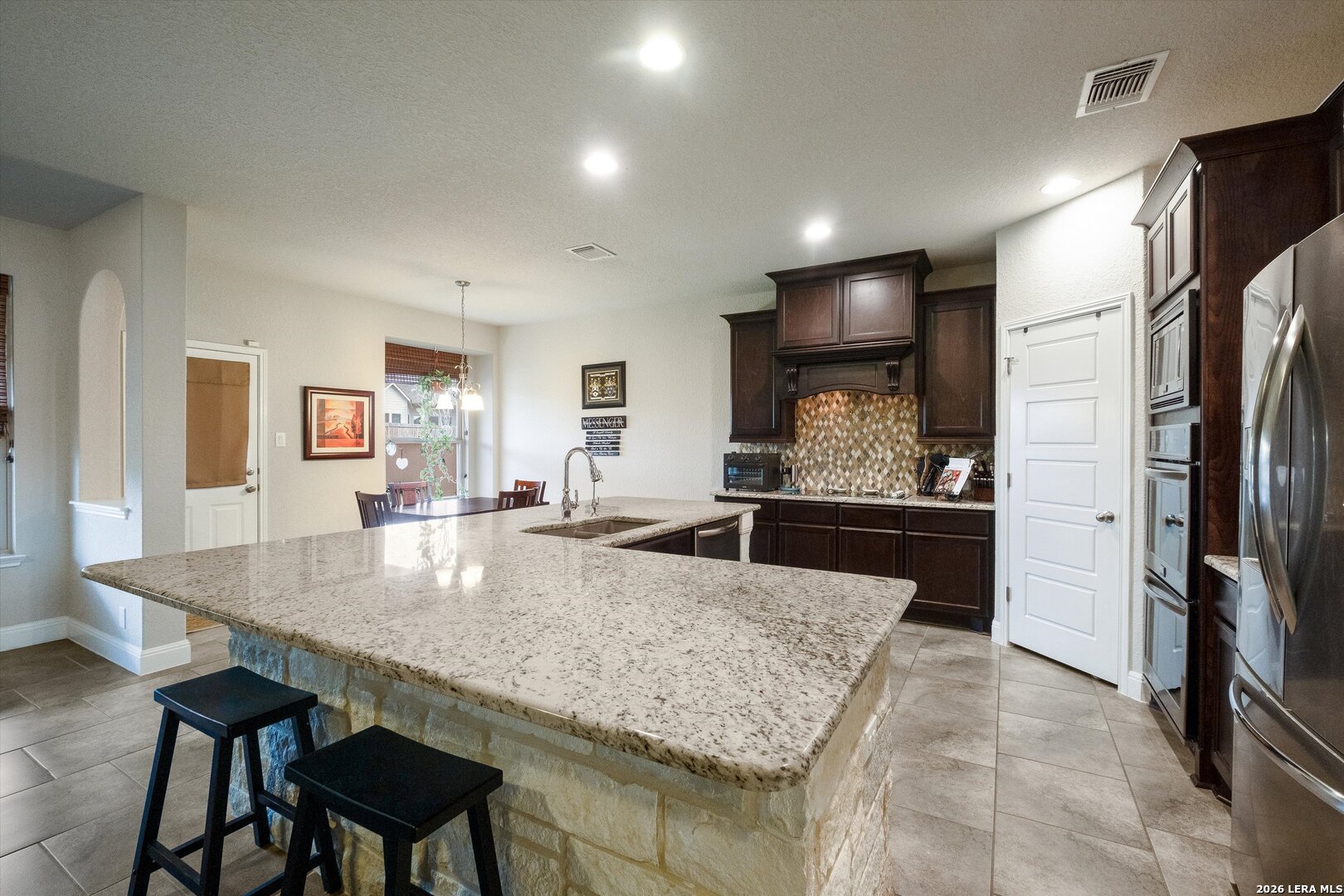 This stunning two-story home in Turning Stone Estates offers 4 bedrooms and 3.5 bathrooms, with a thoughtfully designed layout where everything is on the main level except for a private upstairs retreat featuring a spare bedroom, full bathroom, and loft area. Filled with character, the home boasts 10' ceilings, 8' doors, and beautiful 42" J-Kraft cabinetry throughout. The spacious kitchen is a true centerpiece with stainless steel appliances, dual ovens, and a large L-shaped granite island perfect for entertaining. A dedicated office on the main level adds convenience, while the backyard features an expansive Texas Lanai-ideal for relaxing or hosting guests. The home also includes a fully paid-off solar system, dual water heaters, and ceiling-mounted storage in the garage, offering both energy efficiency and practical functionality. Enjoy resort-style living with neighborhood amenities including a pool, tennis courts, park/playground, and sports court.