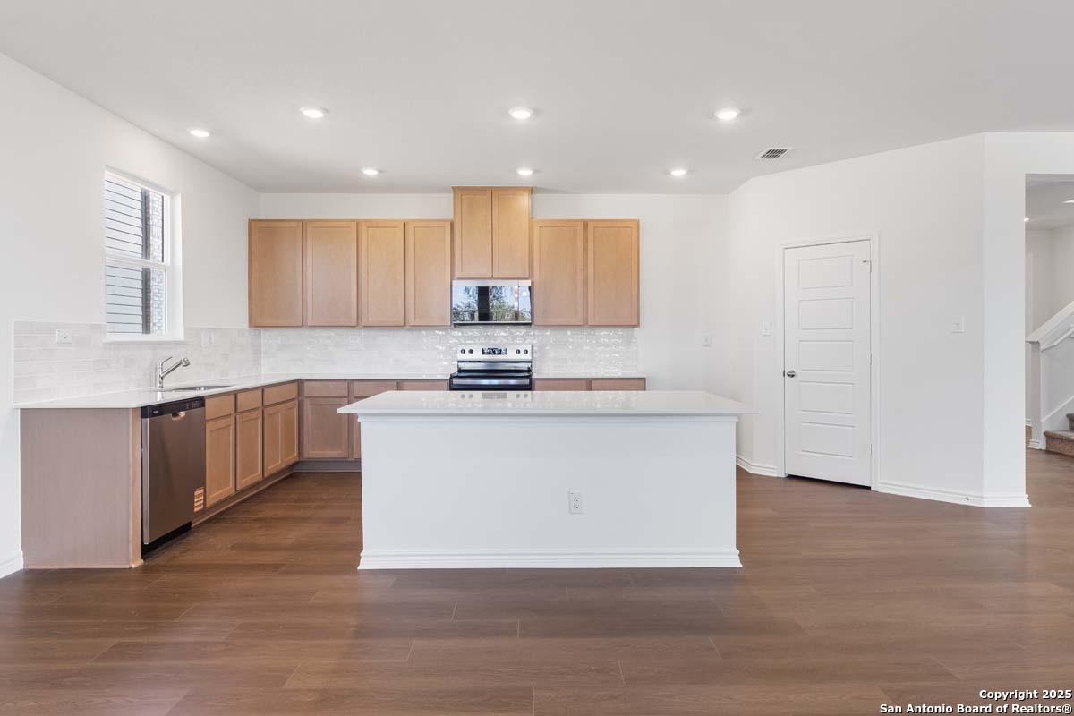 Step into style and comfort with 9-ft. first floor ceilings that create an open, airy atmosphere. The kitchen features Whirlpool stainless steel appliances, Woodmont Dakota Shaker panel 42-in. upper cabinets, Silestone countertops in Linen Cream, a Daltile tile backsplash, and an extended breakfast bar. The primary bath offers upgraded cabinets and a sleek 42-in. shower with a Daltile tile surround. Decorative touches include a Carrara-style entry door, Kwikset Polo interior door hardware, Stella Vista ceramic tile in the bathrooms, and vinyl plank flooring in the kitchen and greatroom. Enjoy added peace of mind with a wireless security system, plus curb appeal with a fully sodded yard and automatic sprinkler system.