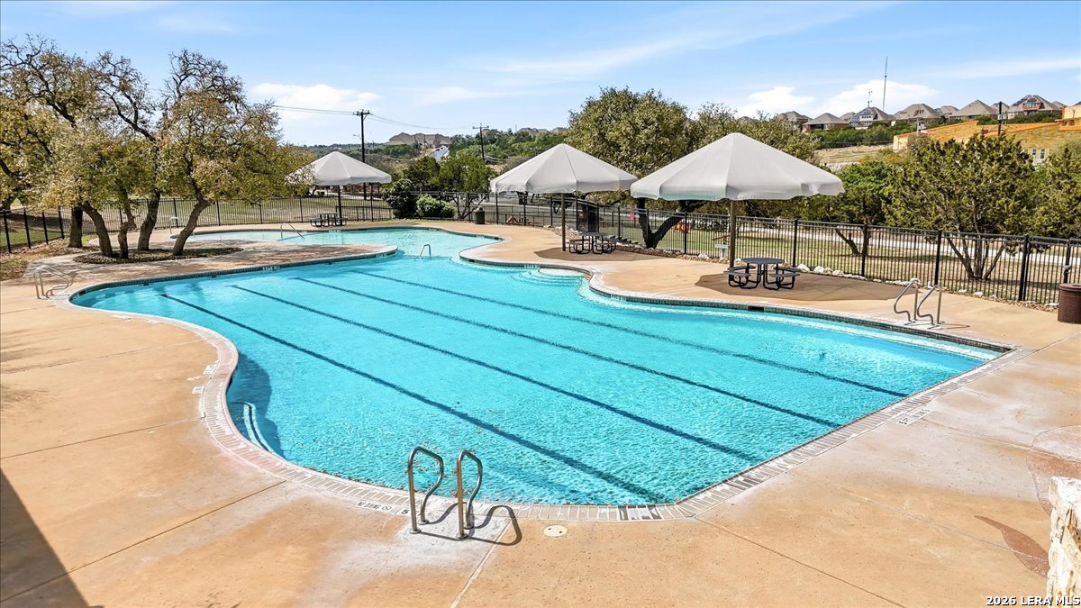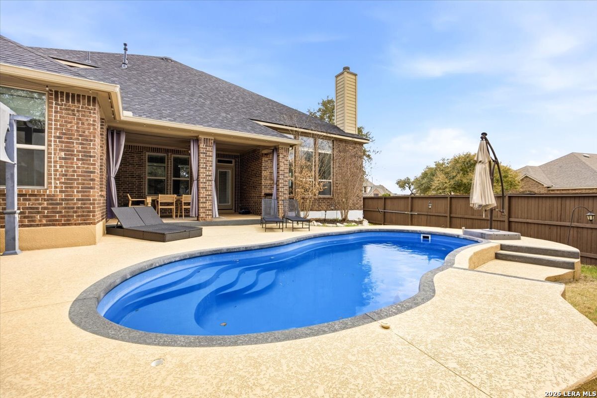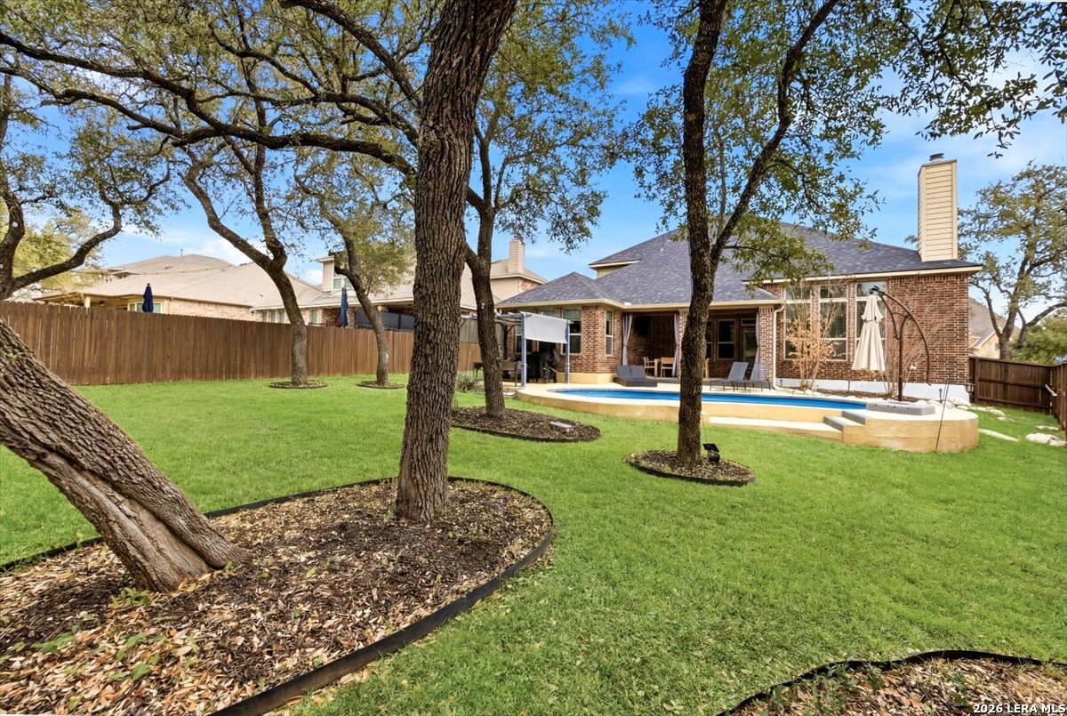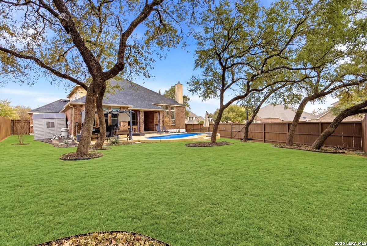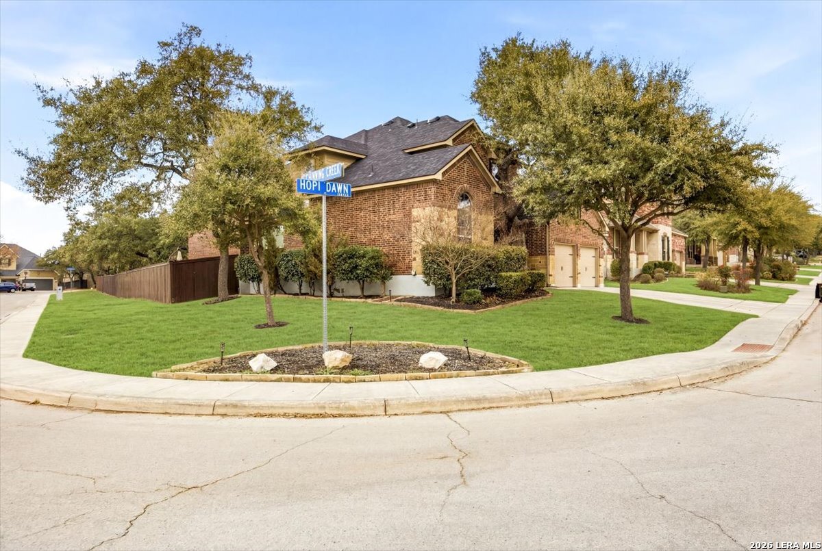 Welcome to 25511 Hopi Dawn! Situated on a spacious 1/4+ acre corner lot in the highly desirable front section of The Colony at Indian Springs, this impressive Highland Home of nearly 3,000 sqft features 4 bedrooms, 3.5 baths, a dedicated study with double French doors, a 3-car garage & pool. The thoughtfully designed open floor plan seamlessly connects the kitchen, breakfast nook, dining area, and living room, creating an ideal space for everyday living and entertaining. The kitchen boasts a large center island with bar seating, gas stove, abundant counter space, and generous storage, all overlooking the inviting living room with a beautiful stone fireplace. The downstairs primary suite is a private retreat with plentiful natural light, plush carpet, separate vanities, garden tub, separate shower, and a walk-in closet with custom built-ins. Upstairs features a spacious game room, three additional bedrooms, including one ensuite bath and a shared hall bath. Step outside to your private backyard oasis with a sparkling POOL, covered patio, additional arbor-covered patio space, and mature trees-perfect for relaxing or entertaining. Easy access to Bulverde Rd and Hwy 281 makes for convenient to shopping & dining and quick commutes. Residents enjoy outstanding Indian Springs amenities including pools, parks, playgrounds, walking trails, pickle ball courts, and dog parks. Come see what Hopi Dawn has to offer to make your San Antonio living the perfect fit for you!