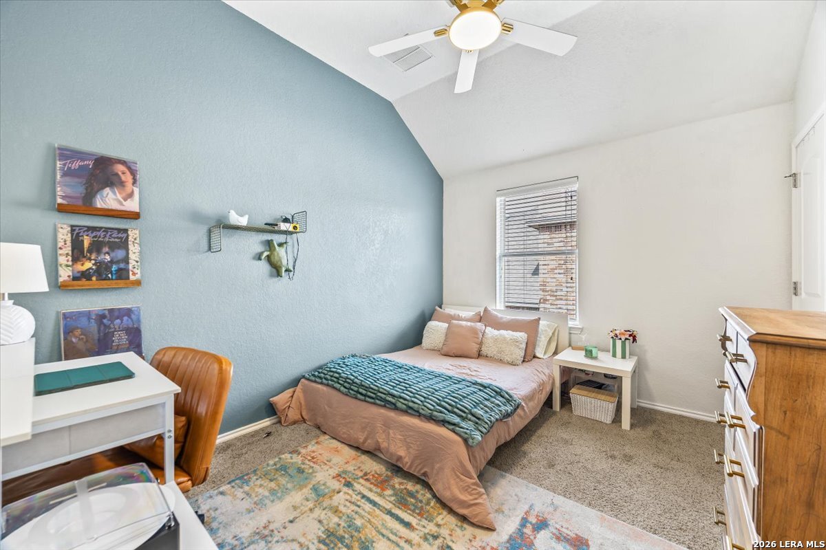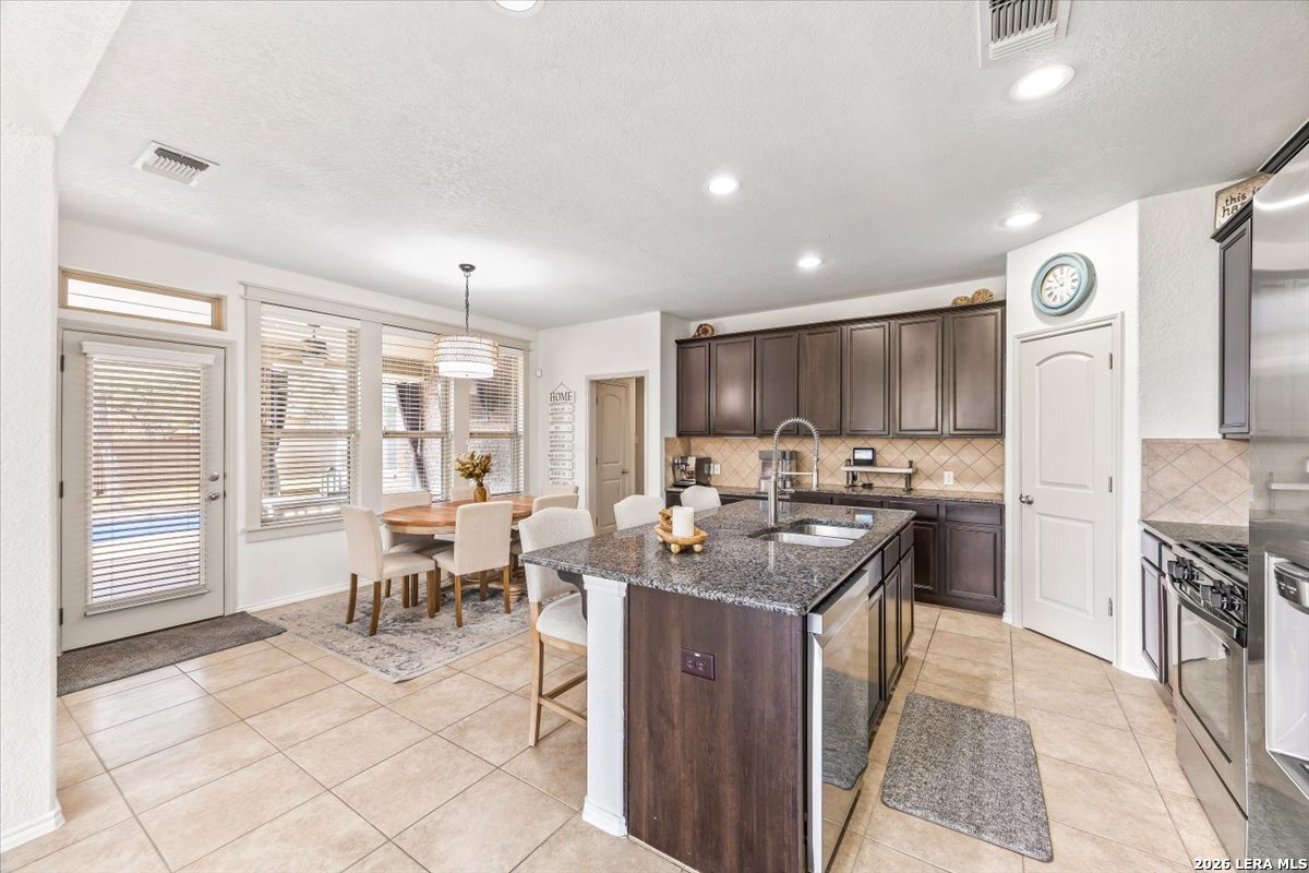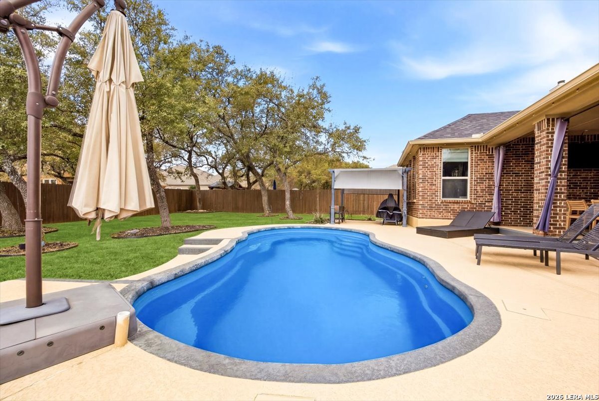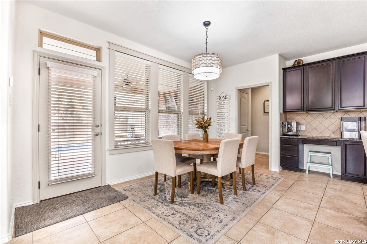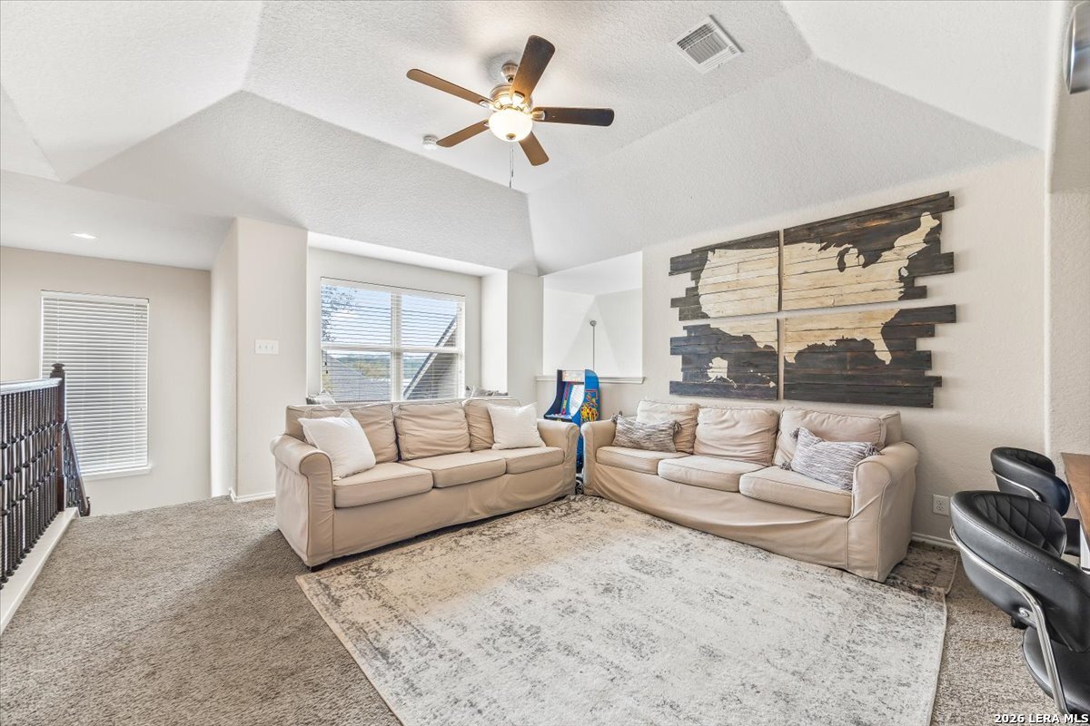 Welcome to 25511 Hopi Dawn! Situated on a spacious 1/4+ acre corner lot in the highly desirable front section of The Colony at Indian Springs, this impressive Highland Home of nearly 3,000 sqft features 4 bedrooms, 3.5 baths, a dedicated study with double French doors, a 3-car garage & pool. The thoughtfully designed open floor plan seamlessly connects the kitchen, breakfast nook, dining area, and living room, creating an ideal space for everyday living and entertaining. The kitchen boasts a large center island with bar seating, gas stove, abundant counter space, and generous storage, all overlooking the inviting living room with a beautiful stone fireplace. The downstairs primary suite is a private retreat with plentiful natural light, plush carpet, separate vanities, garden tub, separate shower, and a walk-in closet with custom built-ins. Upstairs features a spacious game room, three additional bedrooms, including one ensuite bath and a shared hall bath. Step outside to your private backyard oasis with a sparkling POOL, covered patio, additional arbor-covered patio space, and mature trees-perfect for relaxing or entertaining. Easy access to Bulverde Rd and Hwy 281 makes for convenient to shopping & dining and quick commutes. Residents enjoy outstanding Indian Springs amenities including pools, parks, playgrounds, walking trails, pickle ball courts, and dog parks. Come see what Hopi Dawn has to offer to make your San Antonio living the perfect fit for you!