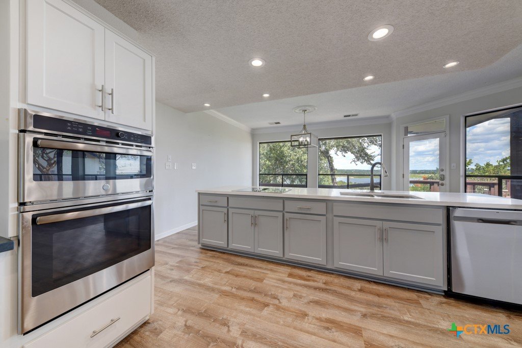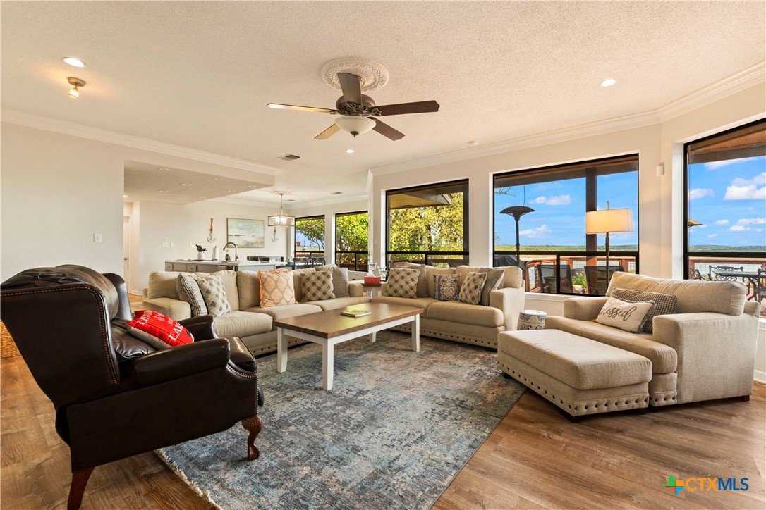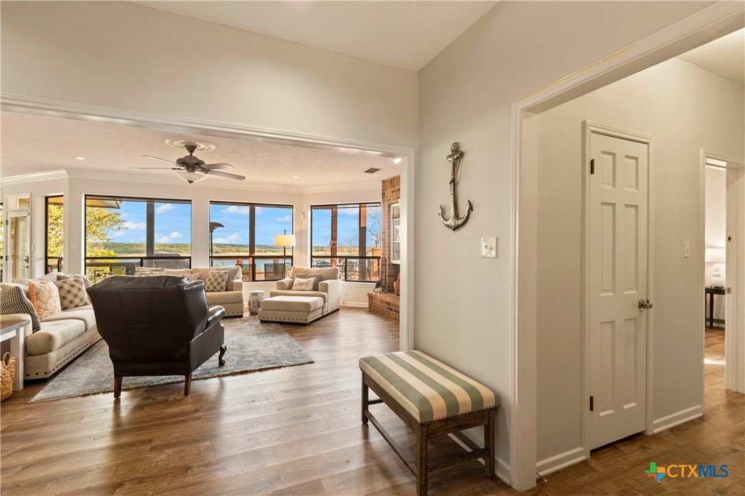MEMORIES ARE MADE AT THE LAKE!!! This exceptional waterfront home embraces panoramic lake views from the moment you walk thru the front door. The interior was beautifully remodeled (2022) and the exterior was painted and roof replaced (2025). The main level includes an open concept living room, dining room, kitchen, primary suite, laundry room, half bath and study. The updated kitchen has a large center island with breakfast bar seating, quartz countertops, soft close cabinets and new stainless steel appliances. New easy care waterproof luxury vinyl flooring has been installed throughout the home. Primary bath and upstairs guest bath have been fully updated to include quartz countertops, new tile and seamless glass shower enclosures. Two of the upstairs bedrooms share a private balcony both with "WOW" views of the lake. The supersized deck on back is perfect for entertaining, grilling and watching the evening sunsets. All of this plus a gentle walk down to the water makes this home "THE ONE".