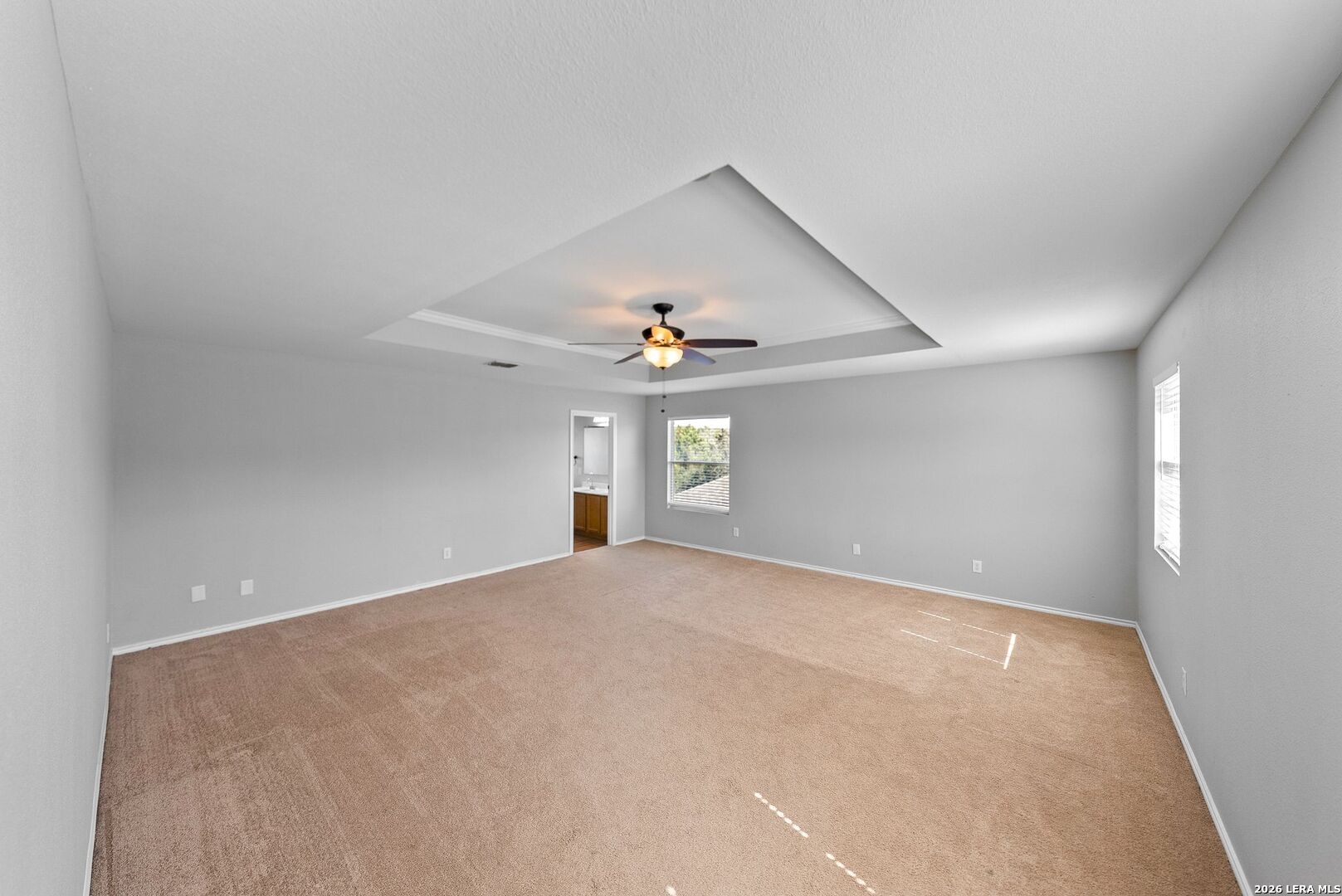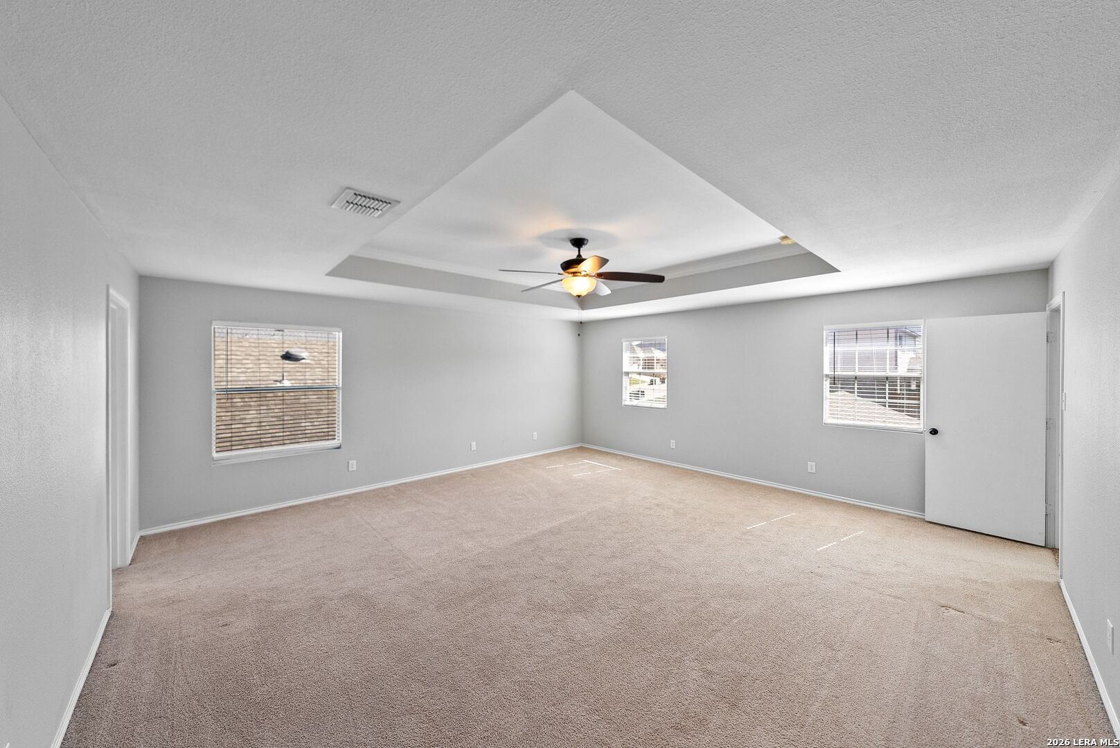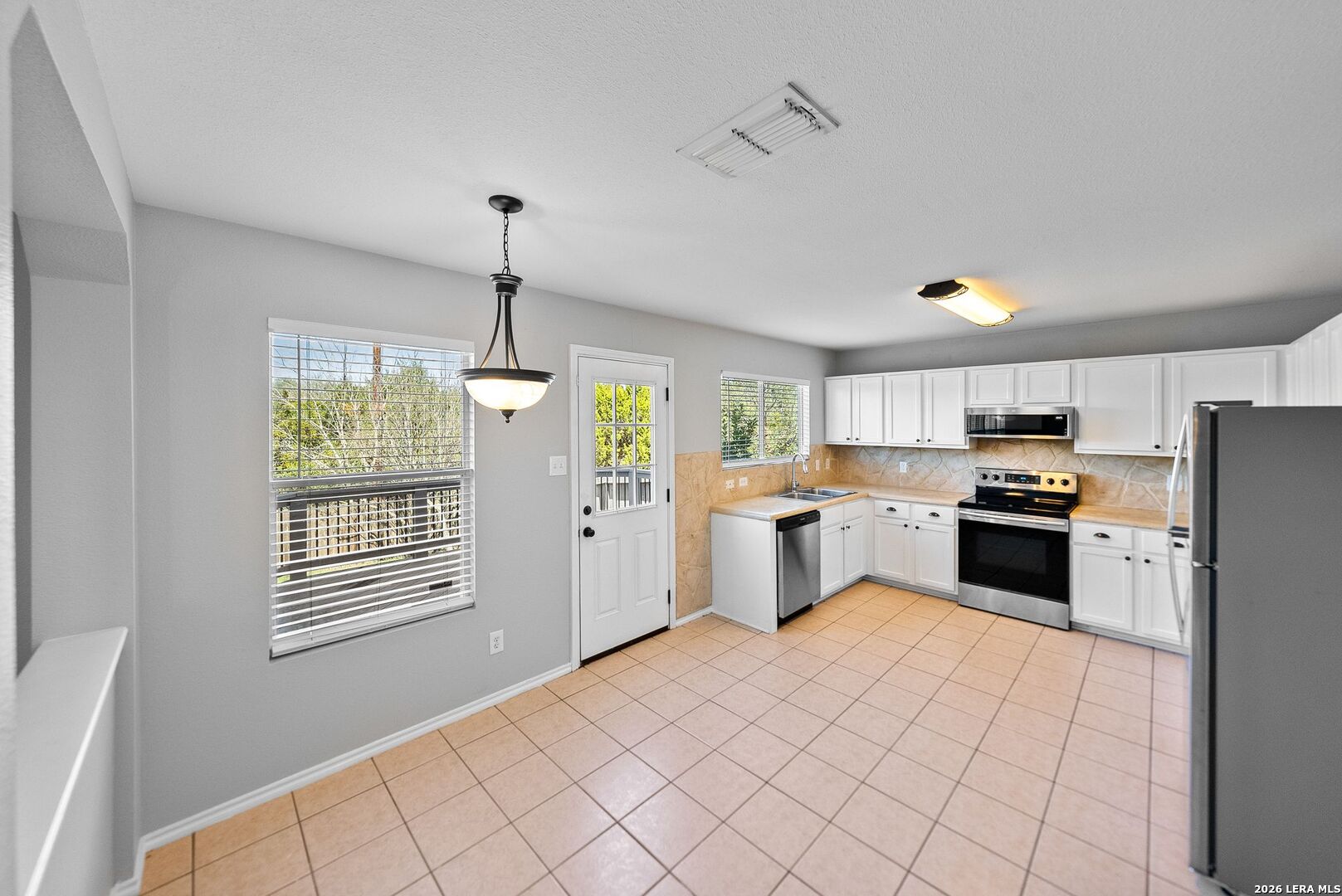 Experience modern living at its finest in this sophisticated retreat located at 25615 Velvet Rose, nestled within the exclusive Bluffs of Lookout Canyon. This expansive two-story residence spans over 2,400 square feet, offering a seamless blend of style and functionality with 4 bedrooms and 3 full bathrooms. The interior is defined by a bright, open-concept layout featuring dual living zones that adapt effortlessly to your lifestyle-whether you're designing a high-end home office or a curated space for entertaining. At the center of the home, the chef-inspired kitchen flows naturally into the social areas, boasting sleek appliances and ample prep space. The primary suite serves as a true sanctuary, elevated by architectural tray ceilings, a generous walk-in closet, and a spa-like ensuite with dual vanities. Beyond the interior, the property transitions into a private outdoor haven, where your backyard opens directly onto a lush greenbelt, ensuring ultimate privacy and a serene backdrop for starlit evenings. Perfectly positioned near Stone Oak, with rapid access to Hwy 281 and Evans Road, this home offers a quiet escape without sacrificing proximity to San Antonio's premier dining, shopping, and top-tier schools. This isn't just a rental; it's an elevated lifestyle upgrade.