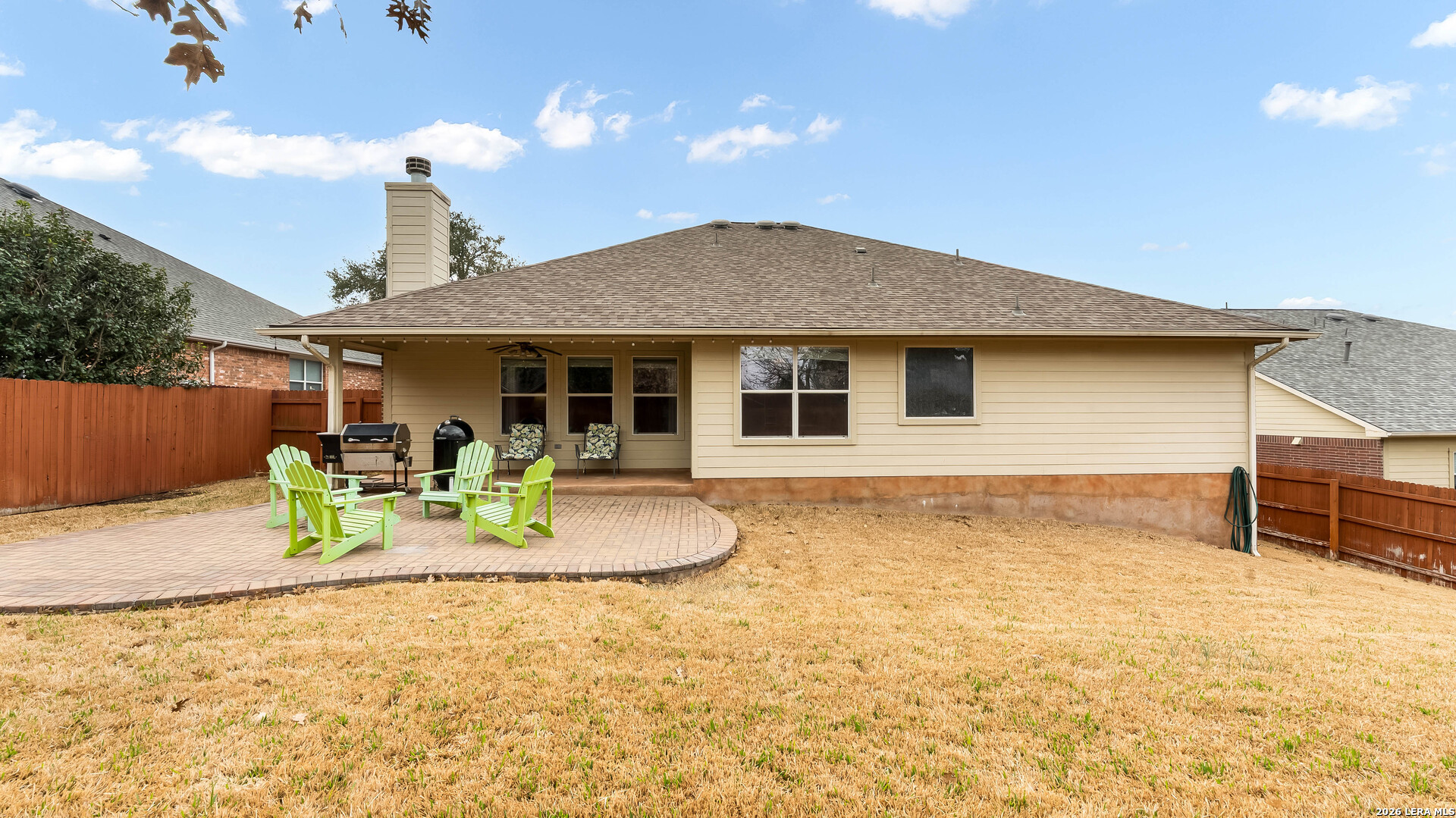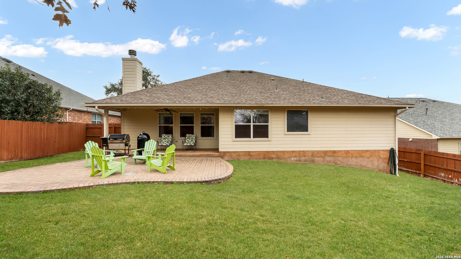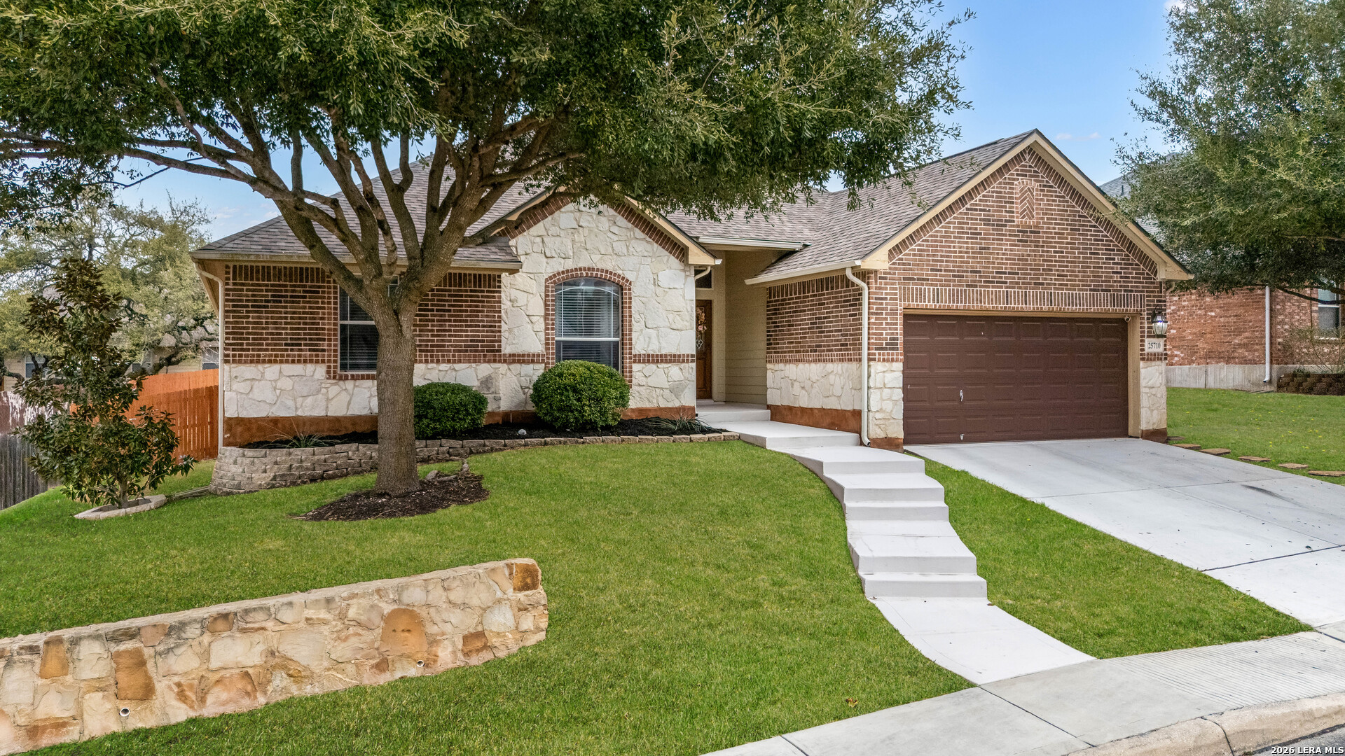 Beautiful single-story home on a quiet cul-de-sac in The Preserve at Indian Springs. Thoughtfully maintained and move-in ready, this home features a spacious living room with 10-ft ceilings, custom drapes, two ceiling fans, and a floor-to-ceiling Austin stone fireplace (wood-burning with gas starter). The kitchen offers granite countertops, tile backsplash, extra-tall cabinetry, center island, gas cooktop with Austin stone surround, large walk-in pantry, and a recently replaced built-in microwave. Split "mother-in-law" floor plan provides privacy, with the primary suite located on a separate hallway. The primary bath includes double vanities, garden tub, extra-tall shower, enclosed water closet, and a large walk-in closet. Additional highlights include Culligan water softener, 1-year-old water heater, 1-year-old garage door opener with keypad and remotes, Nest security camera system, mudroom with added storage, spacious attic storage, and laundry room with extra refrigerator and cabinetry. Enjoy the covered patio and extended paver entertaining area overlooking a landscaped yard with sprinkler system (front and back), upgraded Rain Bird controller, recently trimmed mature oak trees, magnolia and peach trees, and roof replaced approximately 3 years ago. Neighborhood amenities include an oversized family pool, covered pavilion, basketball court, and playground.
