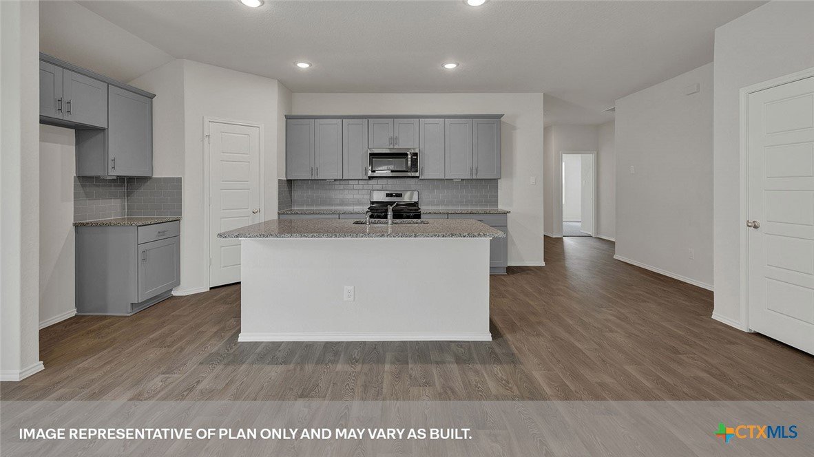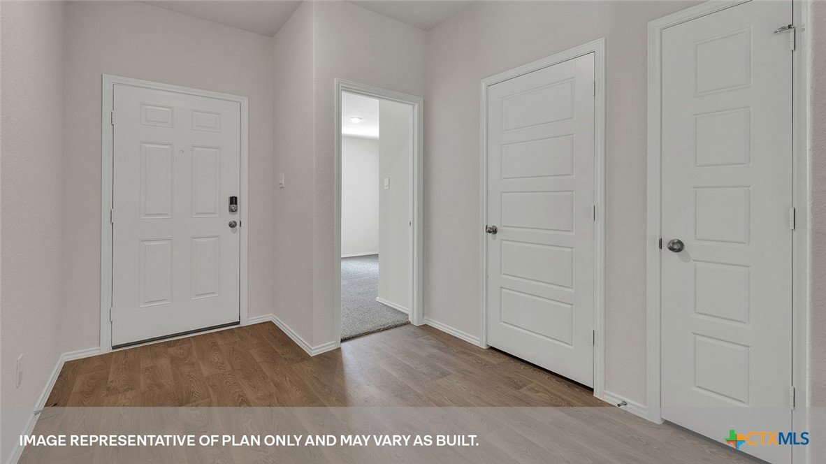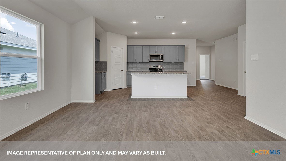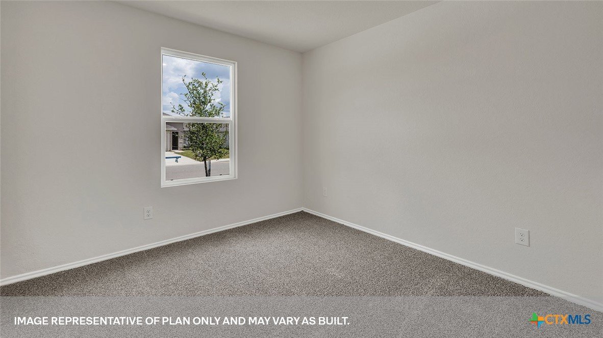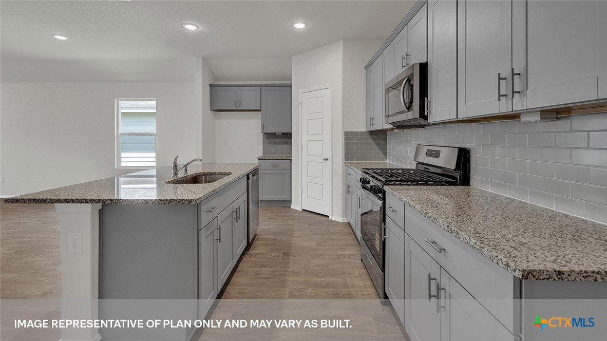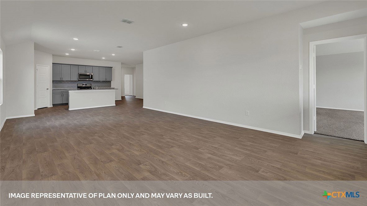 SEPTEMBER ESTIMATED COMPLEITION. The Gaven is one of our one-story homes featured in our Paramount community in Kyle, Texas. This efficient floorplan offers 1,772 square feet of living space across 4 bedrooms, 2 bathrooms and a 2 car garage. Our homes in Paramount feature our modern farmhouse exterior. Stepping inside the home from the covered entryway, you will find two secondary bedrooms and a full bathroom off the foyer. The secondary bathroom includes a shower/tub combination, and the bedrooms feature a closet with shelving. Moving further into the home, you will find the kitchen, which includes an island with an undermount sink, stainless steel appliances, quartz countertops and 36” upper cabinets. The dining room and family room flow easily from the kitchen and you’re sure to make many memories in this beautiful space. The utility room and bedroom 2 are off the kitchen. With the utility room at the center of the home, your laundry chores will be an easy task to complete. The primary bedroom is tucked off the family room at the back of the home. Featuring its own attached bathroom with a walk-in shower, marble countertops with dual vanity, and separate toilet area with a door, enjoy this relaxing space during your bedtime routine. A walk-in closet is connected to the bathroom, with plenty of room for your accessories and prized possessions. The Gaven includes vinyl flooring throughout the common areas of the home and carpet in the bedrooms. All our new homes at Paramount feature extra storage space in the garage, a covered back patio, full sod, and an irrigation system in the front and back yard. This home comes with our America’s Smart Home base package, which includes Video Front Door Bell, Front Door Deadbolt Lock, Home Hub, Thermostat, and Deako® Smart Switches.