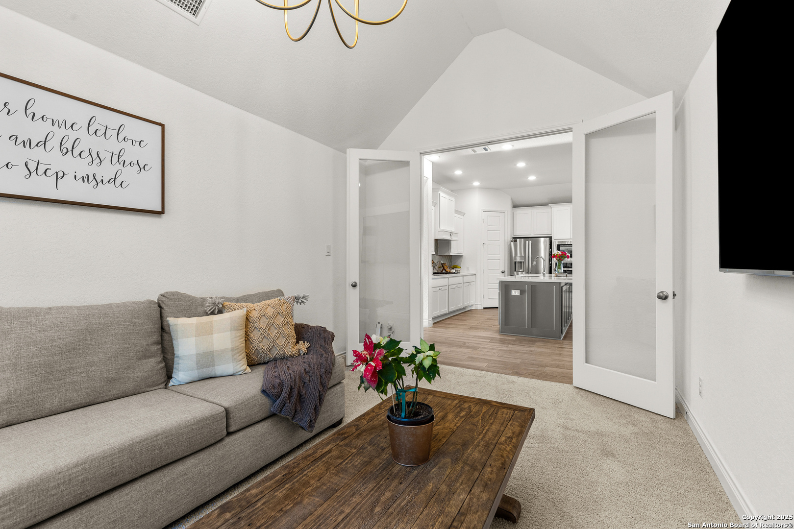 This stunning one-story Perry home offers four bedrooms, three baths, and 2,575 sq. ft. of thoughtfully designed living space. With soaring 13-foot ceilings and an open floor plan, this home exudes elegance and spaciousness. The heart of the home is the gourmet kitchen, seamlessly flowing into the dining and living areas-perfect for entertaining. A flex room serves as an ideal office, media room, or additional living space, complete with a beautiful gold chandelier for a touch of luxury. The primary suite i
