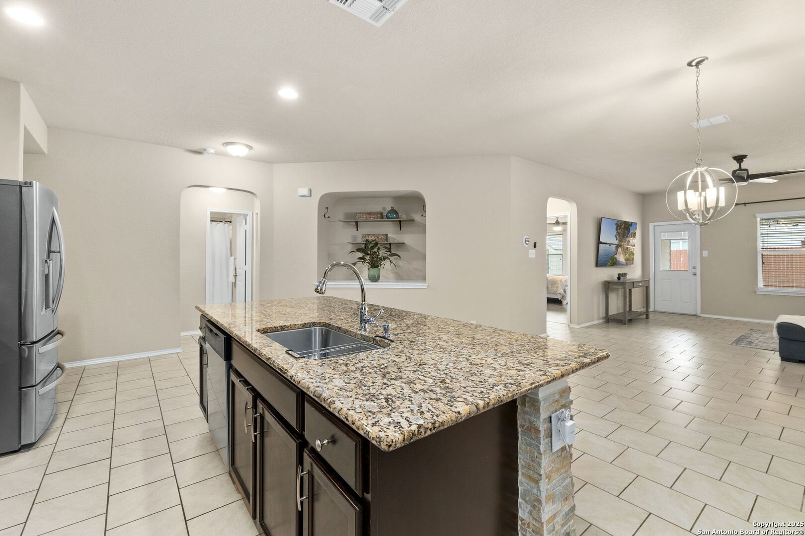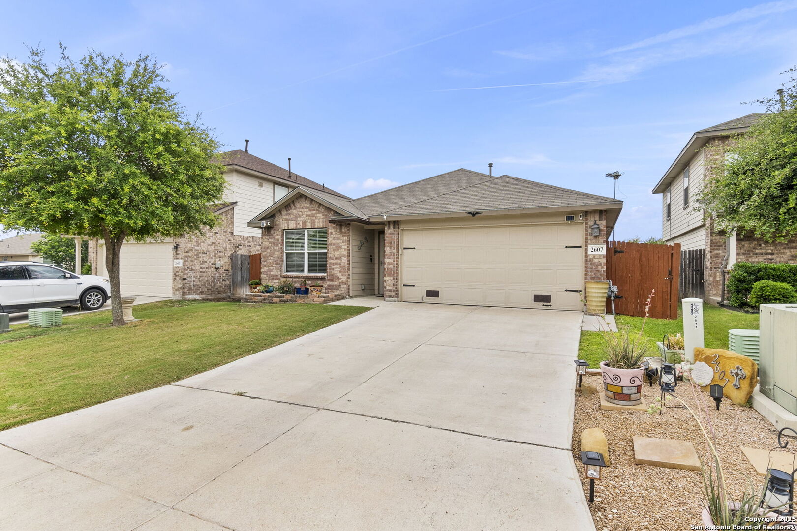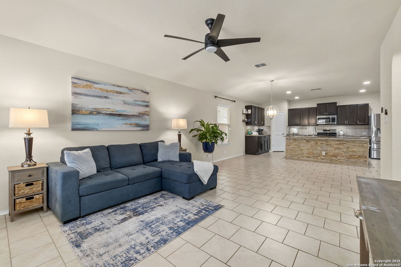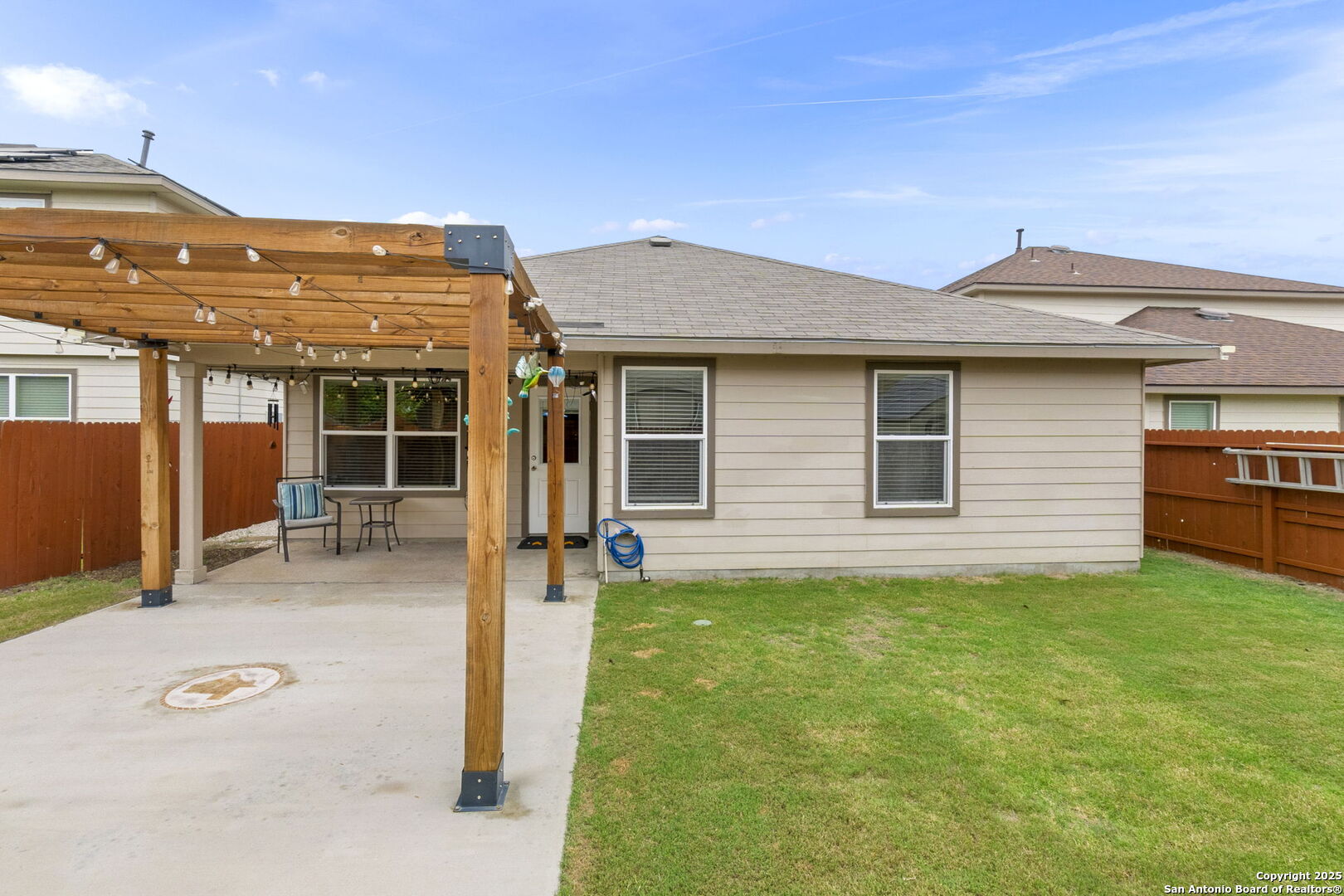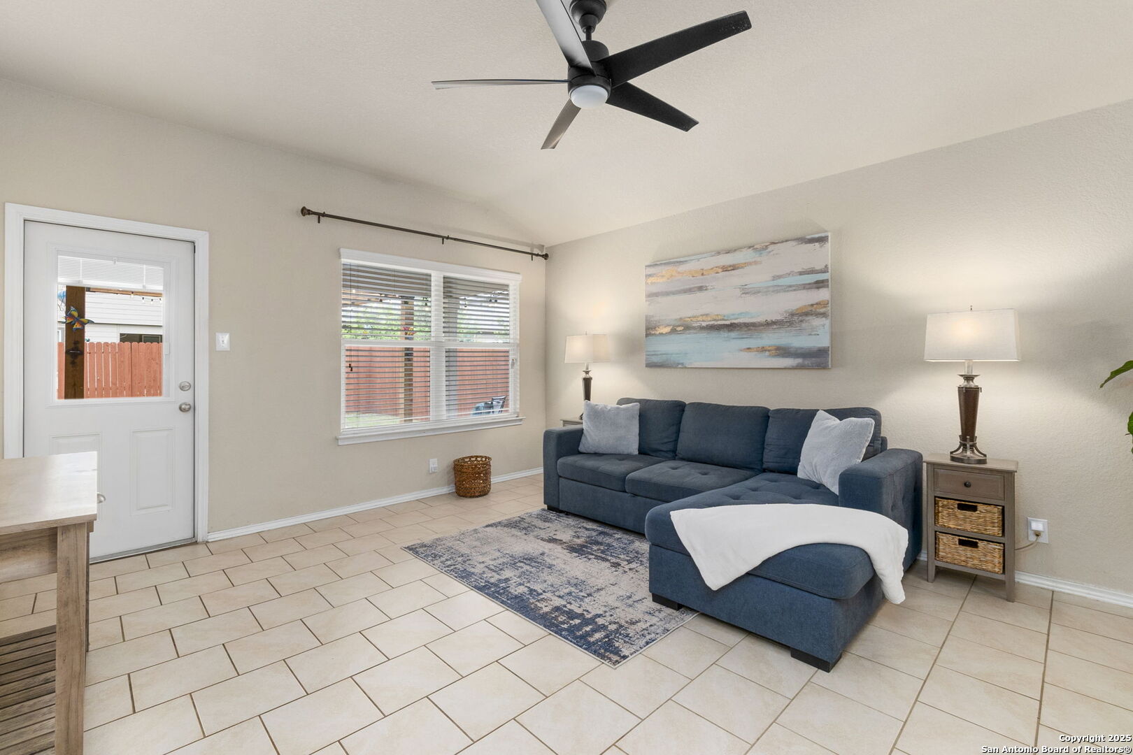 Effortlessly blending charm and functionality, this beautifully maintained home offers a flexible layout ideal for modern living. A fourth front room serves perfectly as a home office or optional bedroom, creating space that adapts to your needs. Step into the open-concept main living area, where the spacious kitchen impresses with a stone-accented island, rich brown cabinetry, and sleek stainless steel appliances. Entertaining flows easily from kitchen to dining to living room, making it perfect for gatherings both large and small. The generous primary suite features a private en suite bathroom and plenty of room to unwind at the end of the day. Out back, an extended concrete patio offers space for outdoor seating and BBQs, while the grassy area invites play or gardening. Situated in the growing East San Antonio corridor, just minutes from I-10, shopping, and dining, this move-in ready home offers both comfort and convenience in a prime location. Whether you're looking for your first home or your forever one, this property checks all the boxes.