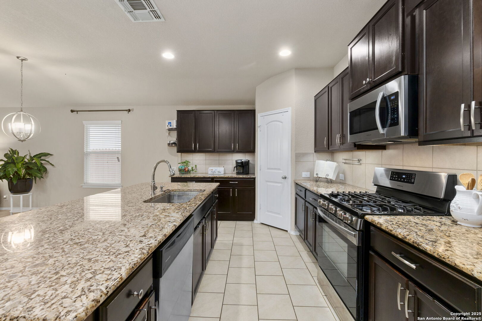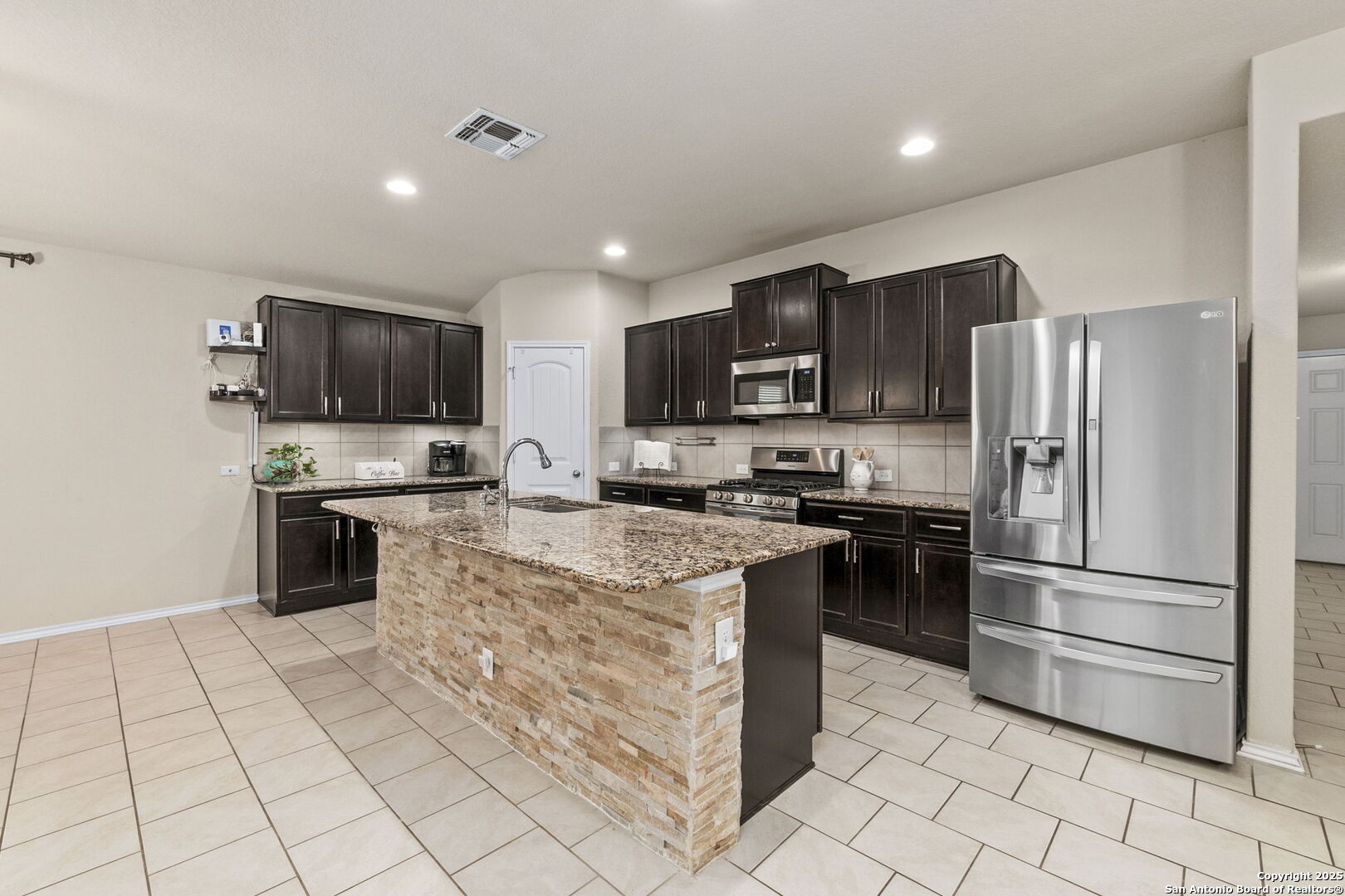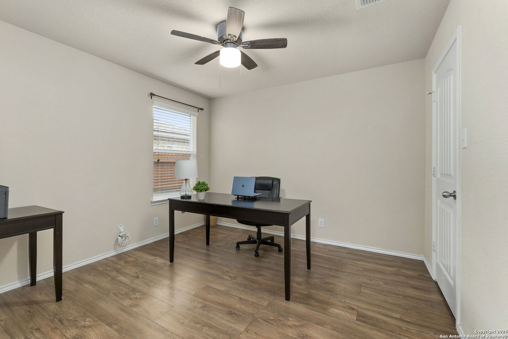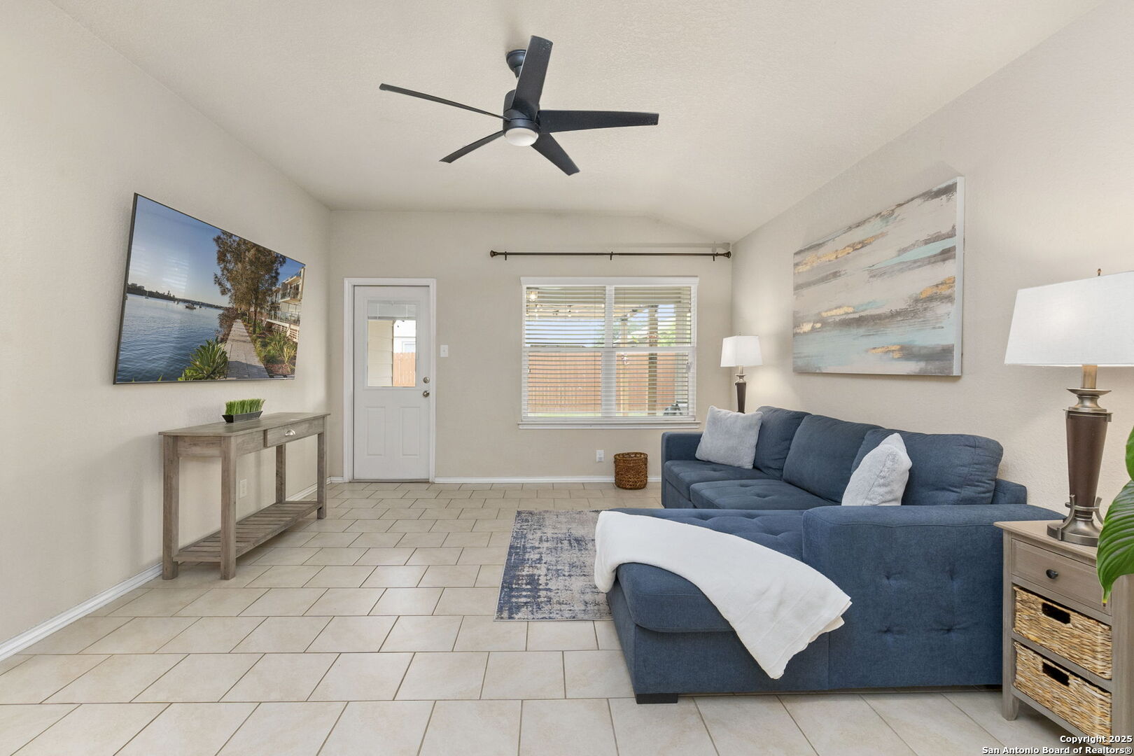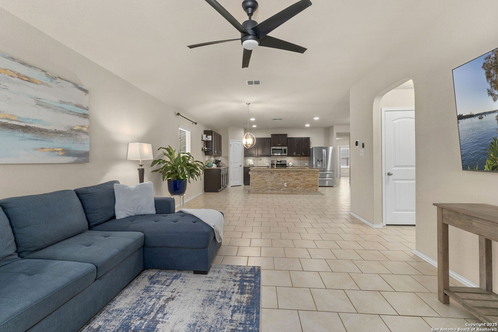 Effortlessly blending charm and functionality, this beautifully maintained home offers a flexible layout ideal for modern living. A fourth front room serves perfectly as a home office or optional bedroom, creating space that adapts to your needs. Step into the open-concept main living area, where the spacious kitchen impresses with a stone-accented island, rich brown cabinetry, and sleek stainless steel appliances. Entertaining flows easily from kitchen to dining to living room, making it perfect for gatherings both large and small. The generous primary suite features a private en suite bathroom and plenty of room to unwind at the end of the day. Out back, an extended concrete patio offers space for outdoor seating and BBQs, while the grassy area invites play or gardening. Situated in the growing East San Antonio corridor, just minutes from I-10, shopping, and dining, this move-in ready home offers both comfort and convenience in a prime location. Whether you're looking for your first home or your forever one, this property checks all the boxes.