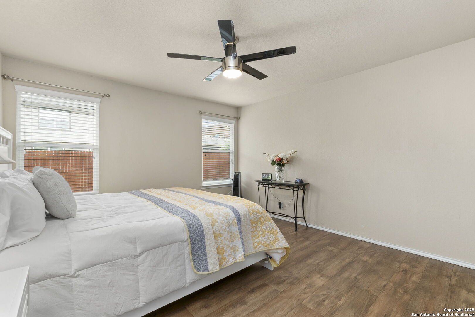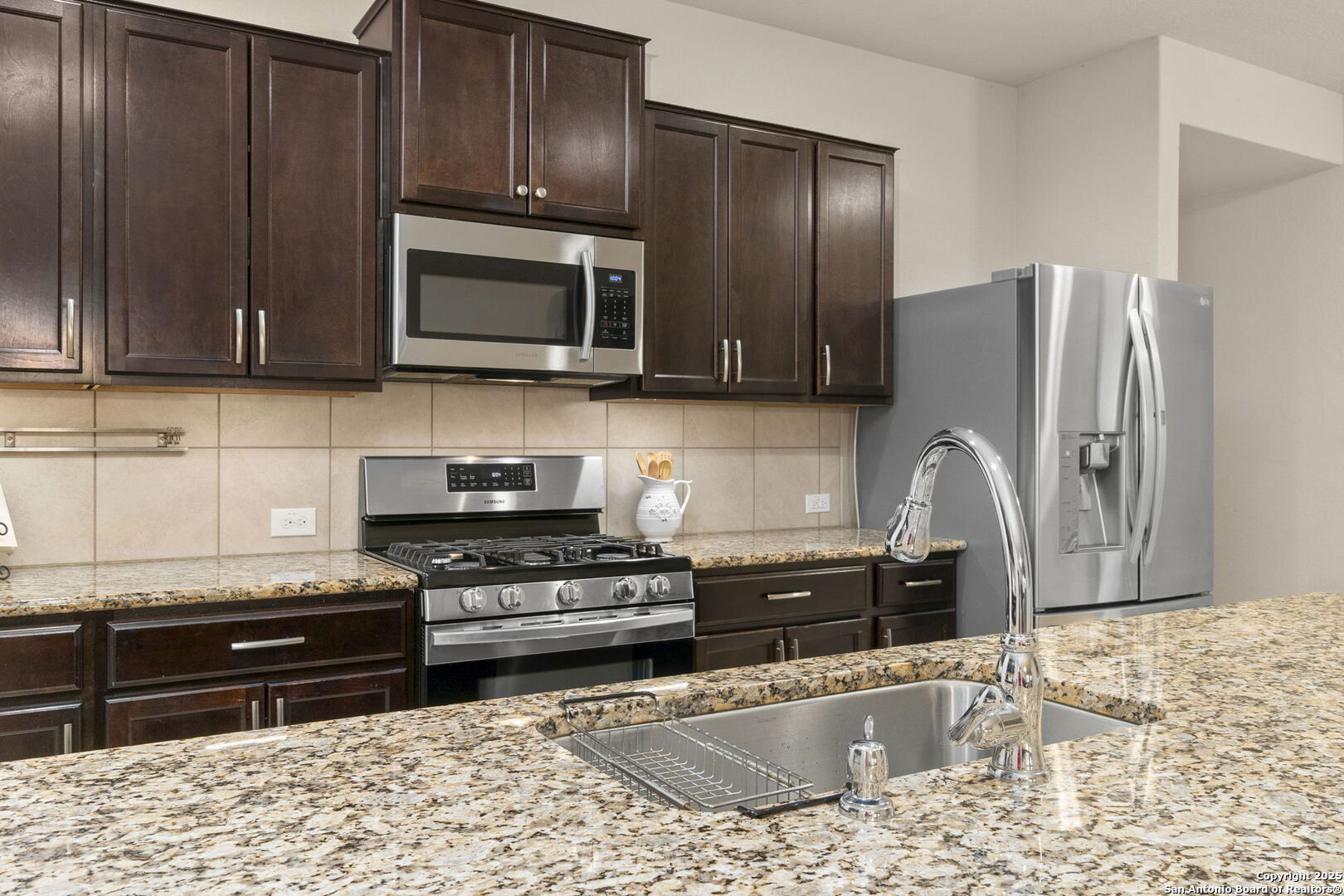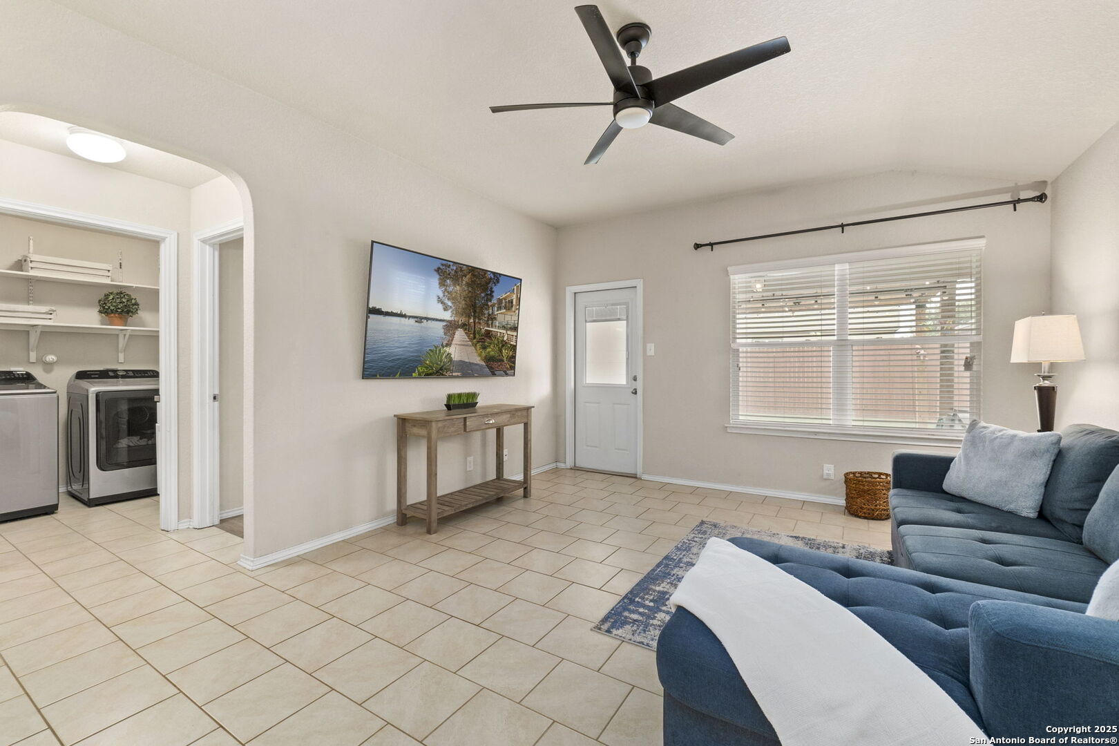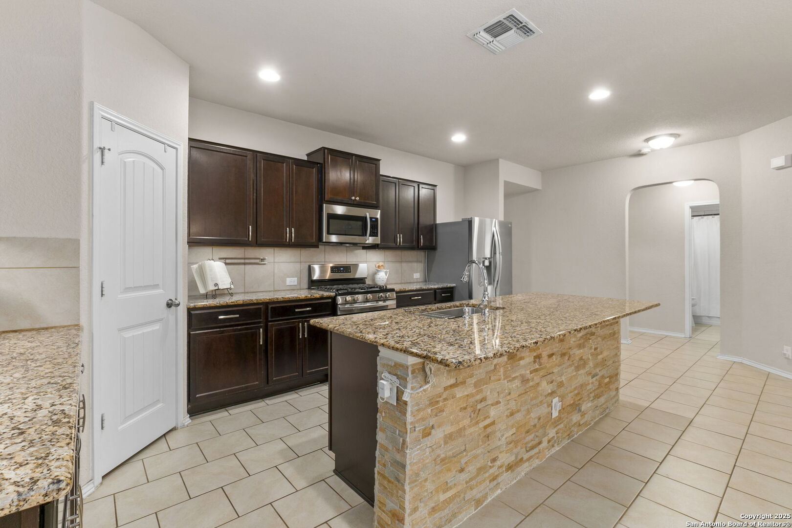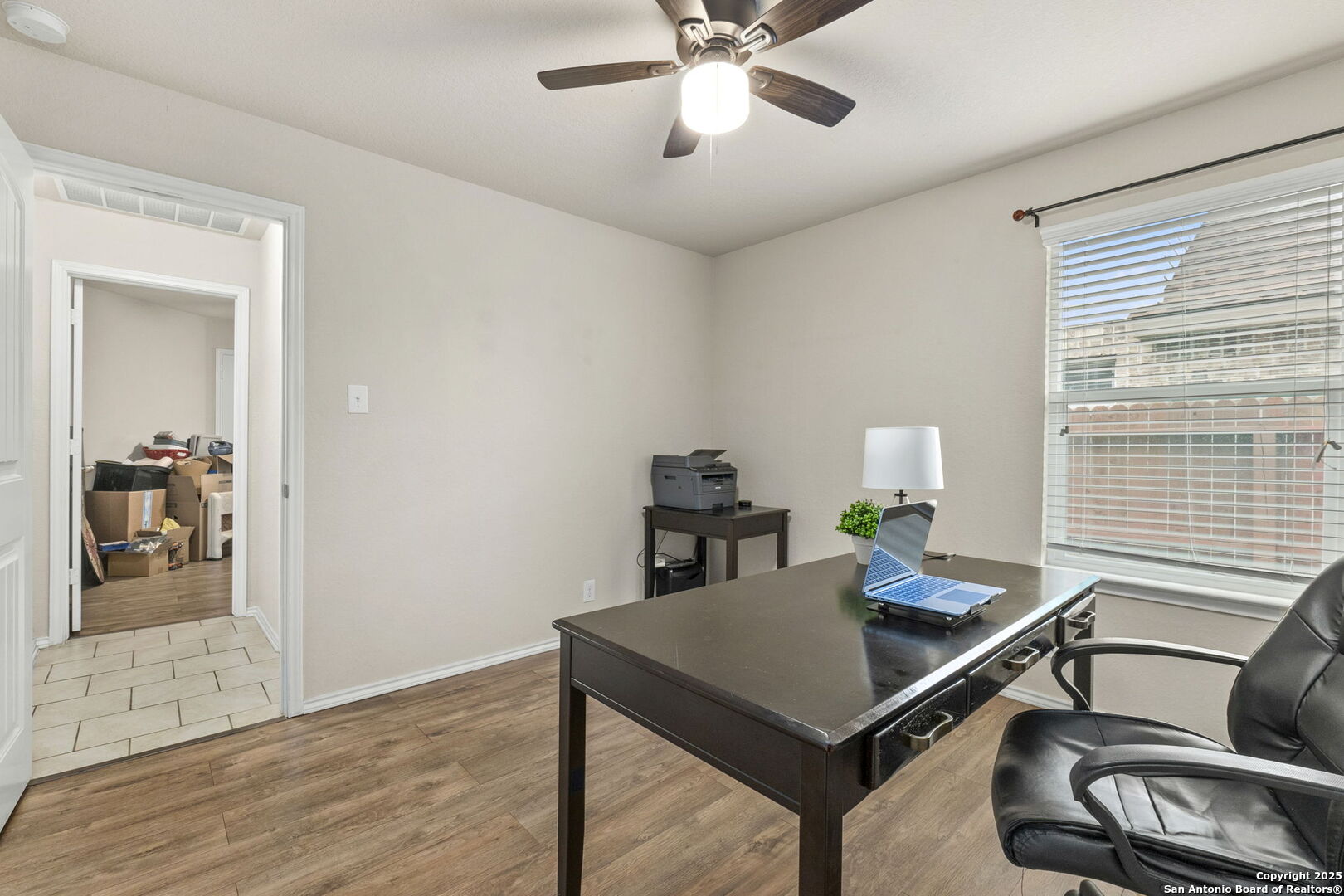 Effortlessly blending charm and functionality, this beautifully maintained home offers a flexible layout ideal for modern living. A fourth front room serves perfectly as a home office or optional bedroom, creating space that adapts to your needs. Step into the open-concept main living area, where the spacious kitchen impresses with a stone-accented island, rich brown cabinetry, and sleek stainless steel appliances. Entertaining flows easily from kitchen to dining to living room, making it perfect for gatherings both large and small. The generous primary suite features a private en suite bathroom and plenty of room to unwind at the end of the day. Out back, an extended concrete patio offers space for outdoor seating and BBQs, while the grassy area invites play or gardening. Situated in the growing East San Antonio corridor, just minutes from I-10, shopping, and dining, this move-in ready home offers both comfort and convenience in a prime location. Whether you're looking for your first home or your forever one, this property checks all the boxes.
