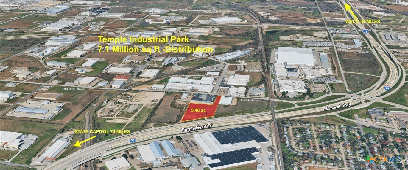 508 feet of frontage on IH-35 with great visibility. This 5.48 acre platted industrial lot has direct access to both IH-35 and Industrial Blvd at the gateway to the Temple's booming Industrial Park with over 7M sq ft of warehouse and distribution. Lot is surrounded by major industrial users and distribution centers, traffic count 80,000 VPD. All utilities on site. In addition to warehouse/distribution, it is great for truck services, truck parking, dealerships, hospitality, gas, retail, storage, service center, or personal warehouse. Seller intends a 1031 exchange.