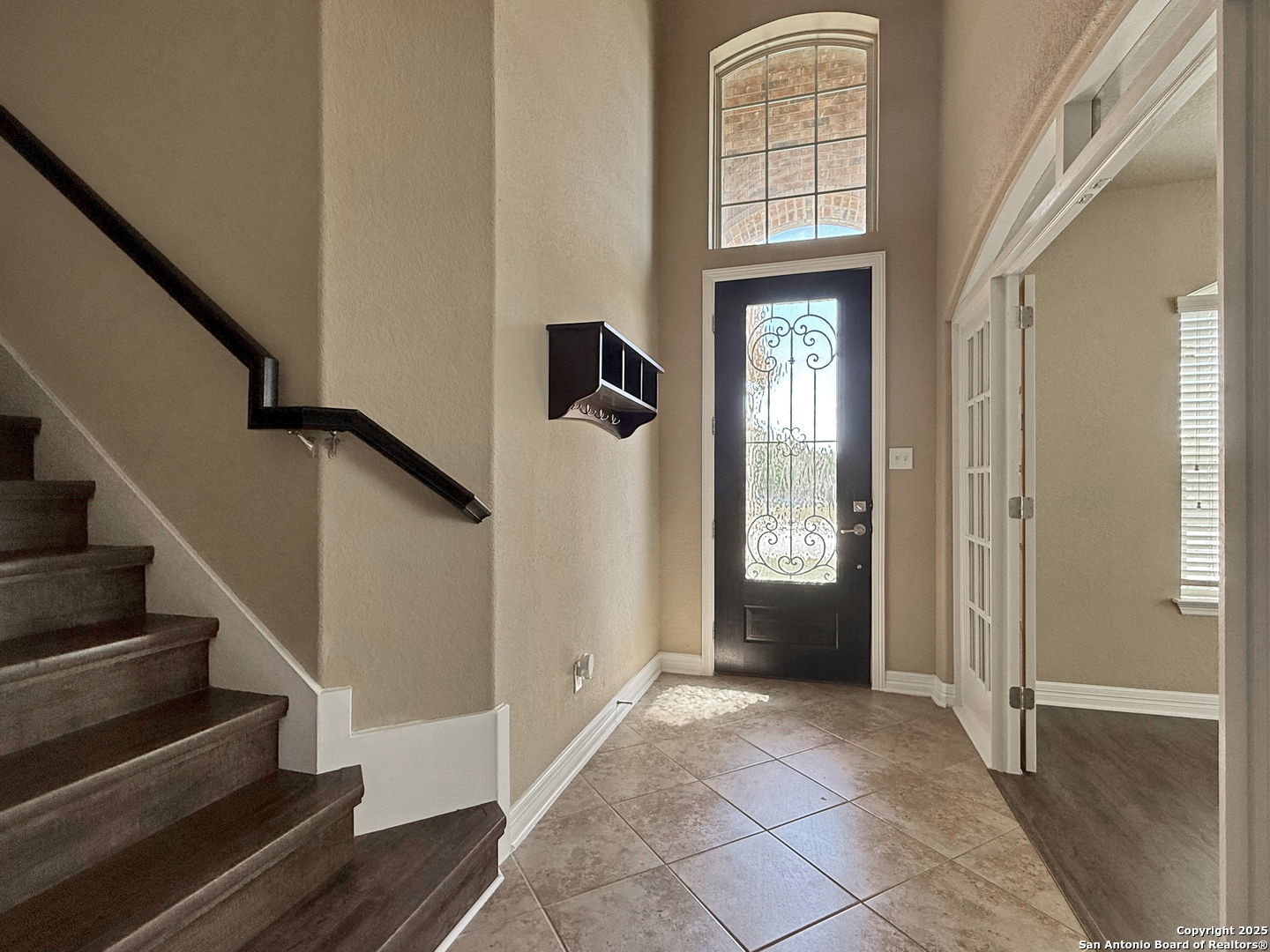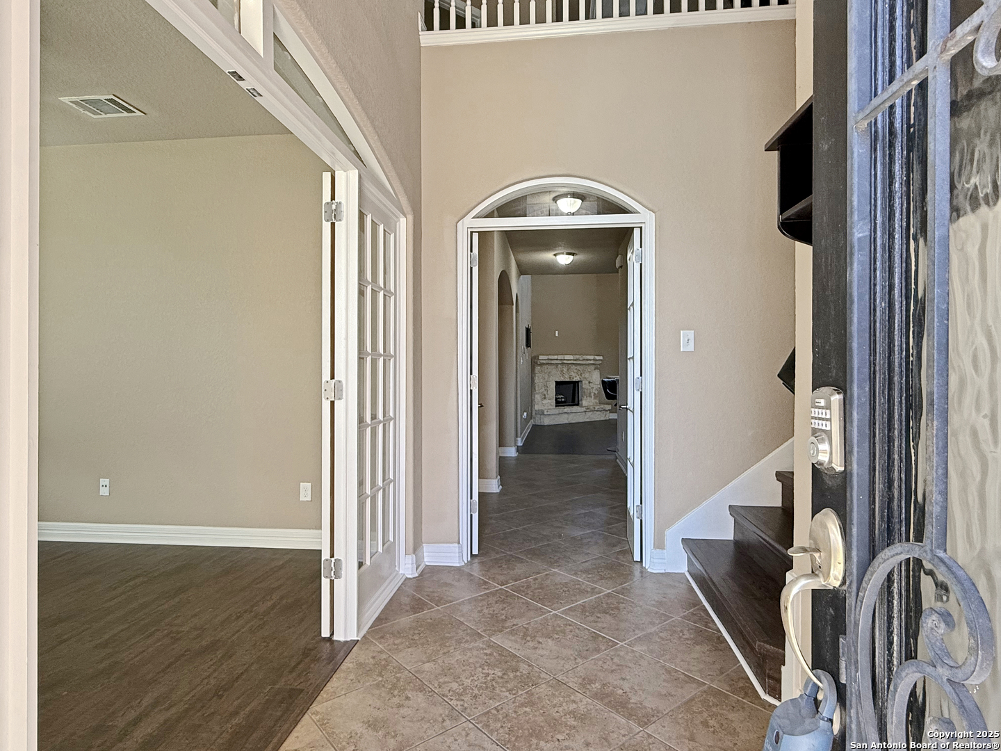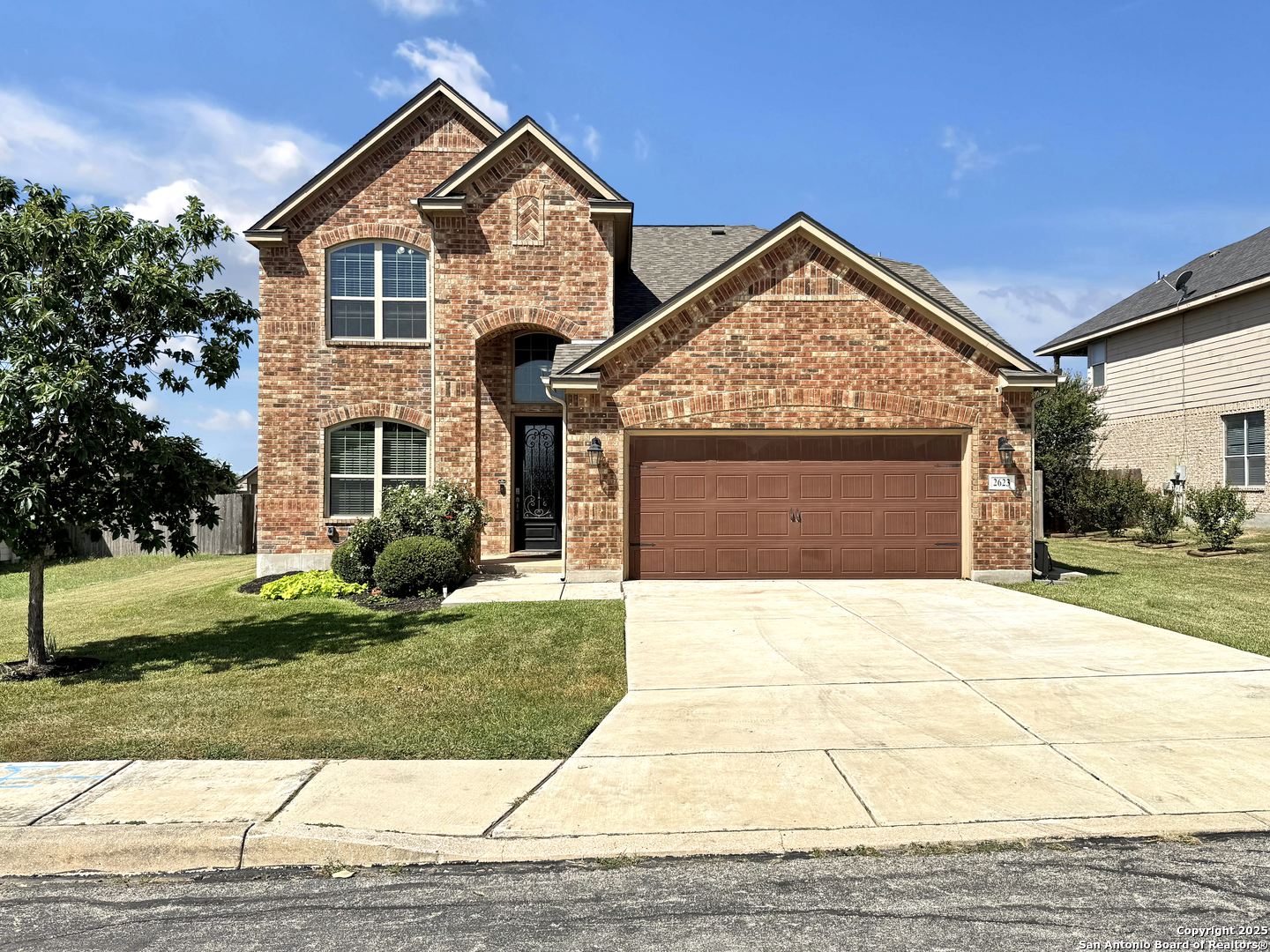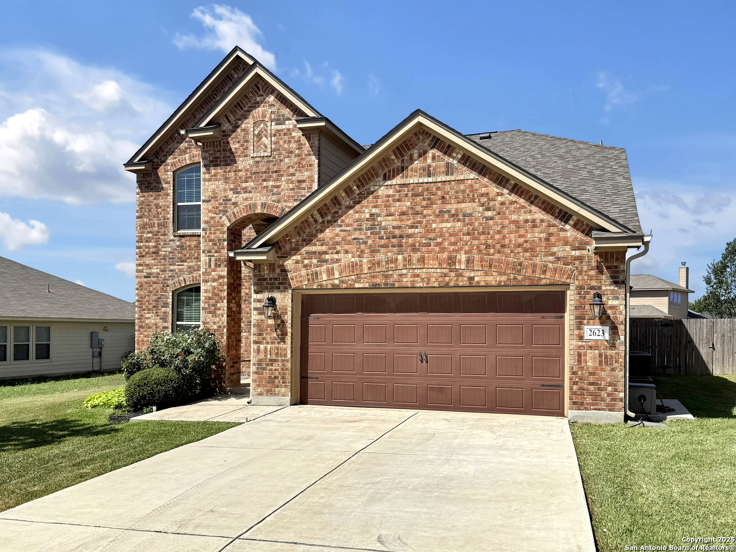 Welcome to 2623 Wolf Moon, a stunning two-story Texas Contemporary home located in the sought-after gated community of Horizon Pointe. Situated on nearly a quarter-acre lot, this 4-bedroom, 2.5-bath residence offers a perfect blend of style, comfort, and functionality. Step through the elegant glass and wrought-iron accented front door into a warm entryway, where a dedicated office with French doors awaits to your left. The open floor plan unfolds with a spacious living area featuring soaring two-story ceilings, large windows that fill the space with natural light, and a striking stone fireplace. The gourmet kitchen is a true centerpiece with a large island, 42-inch cabinets with crown molding, granite countertops, gas cooking, a stylish backsplash, and both recessed and pendant lighting. The primary suite, conveniently located downstairs, offers a serene bay window sitting area, a spa-like bathroom with a garden tub, walk-in shower, dual vanities, and a large walk-in closet. Upstairs, you'll find three additional bedrooms, a full bathroom, and a versatile loft that opens to the living room below. Outdoors is an entertainer's dream with a covered, tiled patio featuring stone-accented columns, a vaulted ceiling, an outdoor ceiling fan, and shade screens for added comfort. The expansive backyard is beautifully landscaped and includes a storage shed. Additional features include recently installed laminate wood floors (no carpet downstairs), a new water softener, newly installed epoxy-coated garage floors, an in-home vacuum system, in-wall pest control, and multiple walk-in storage closets. Roof was replaced in 2023. Horizon Pointe offers a gated entrance and a prime location near shopping, dining, and major highways, making commuting a breeze. Don't wait to make this your new home!