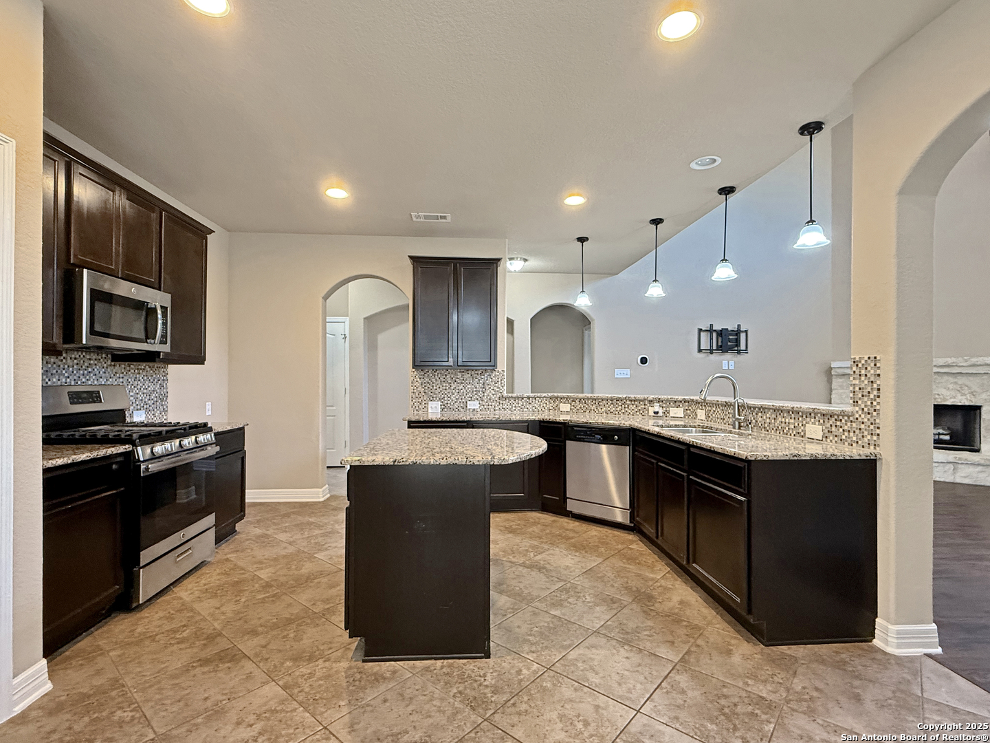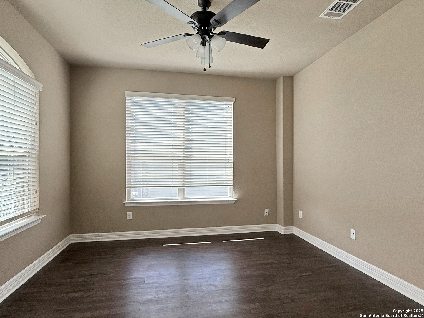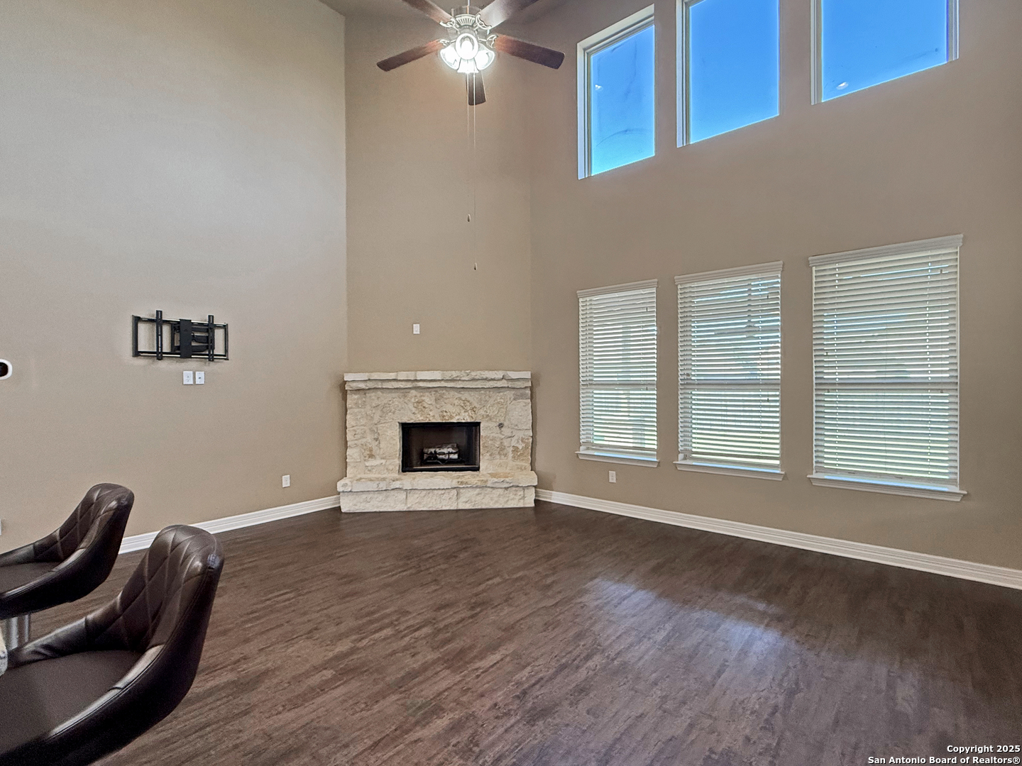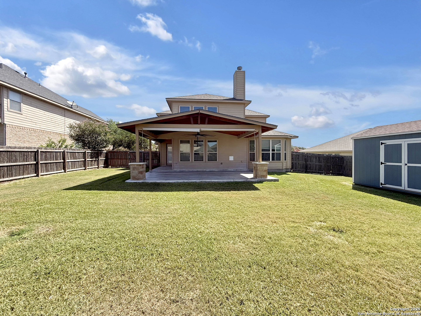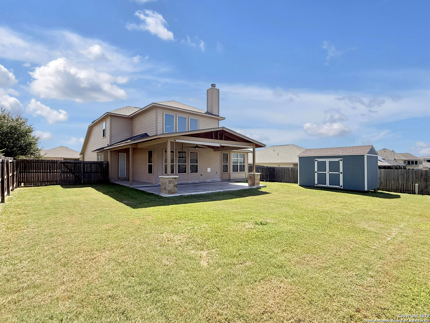 Welcome to 2623 Wolf Moon, a stunning two-story Texas Contemporary home located in the sought-after gated community of Horizon Pointe. Situated on nearly a quarter-acre lot, this 4-bedroom, 2.5-bath residence offers a perfect blend of style, comfort, and functionality. Step through the elegant glass and wrought-iron accented front door into a warm entryway, where a dedicated office with French doors awaits to your left. The open floor plan unfolds with a spacious living area featuring soaring two-story ceilings, large windows that fill the space with natural light, and a striking stone fireplace. The gourmet kitchen is a true centerpiece with a large island, 42-inch cabinets with crown molding, granite countertops, gas cooking, a stylish backsplash, and both recessed and pendant lighting. The primary suite, conveniently located downstairs, offers a serene bay window sitting area, a spa-like bathroom with a garden tub, walk-in shower, dual vanities, and a large walk-in closet. Upstairs, you'll find three additional bedrooms, a full bathroom, and a versatile loft that opens to the living room below. Outdoors is an entertainer's dream with a covered, tiled patio featuring stone-accented columns, a vaulted ceiling, an outdoor ceiling fan, and shade screens for added comfort. The expansive backyard is beautifully landscaped and includes a storage shed. Additional features include recently installed laminate wood floors (no carpet downstairs), a new water softener, newly installed epoxy-coated garage floors, an in-home vacuum system, in-wall pest control, and multiple walk-in storage closets. Roof was replaced in 2023. Horizon Pointe offers a gated entrance and a prime location near shopping, dining, and major highways, making commuting a breeze. Don't wait to make this your new home!