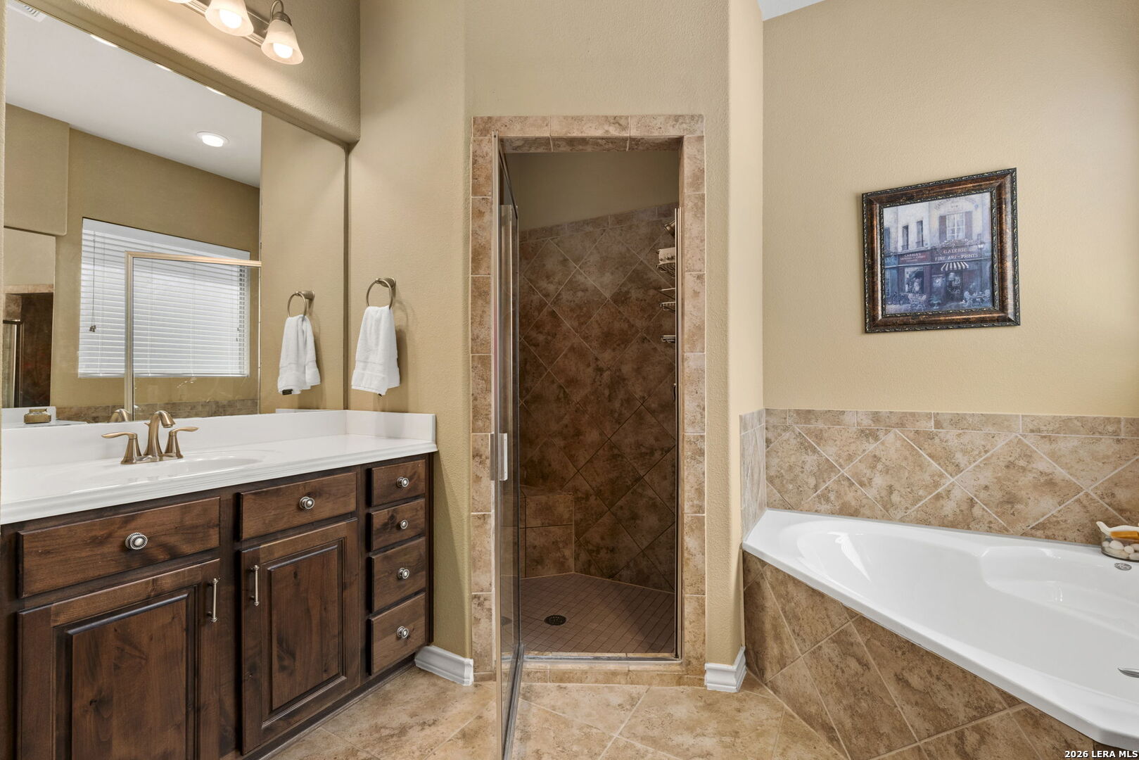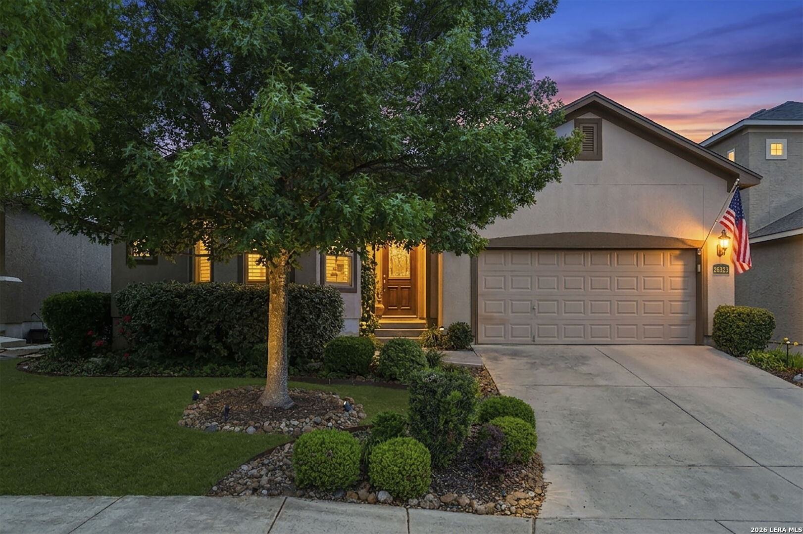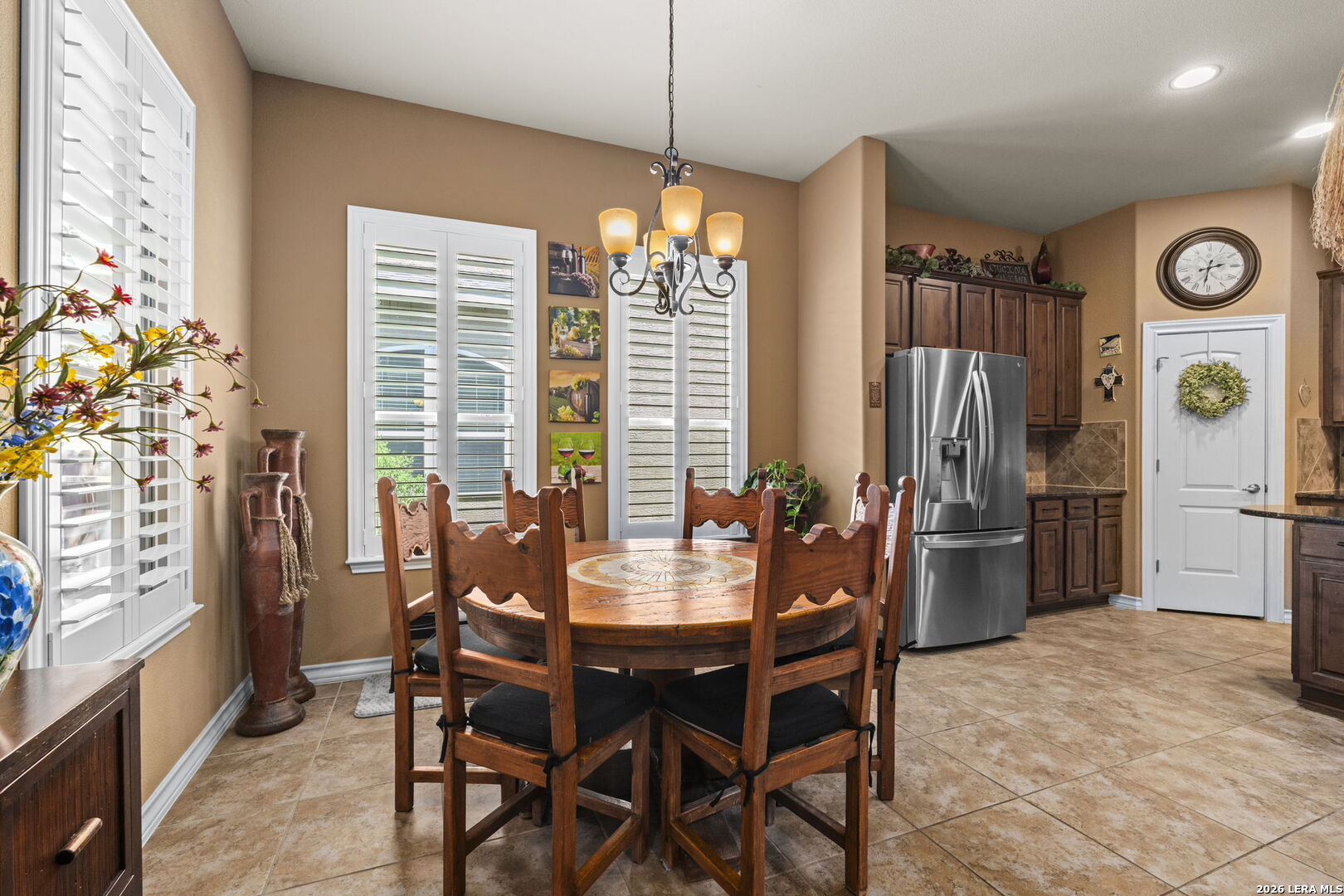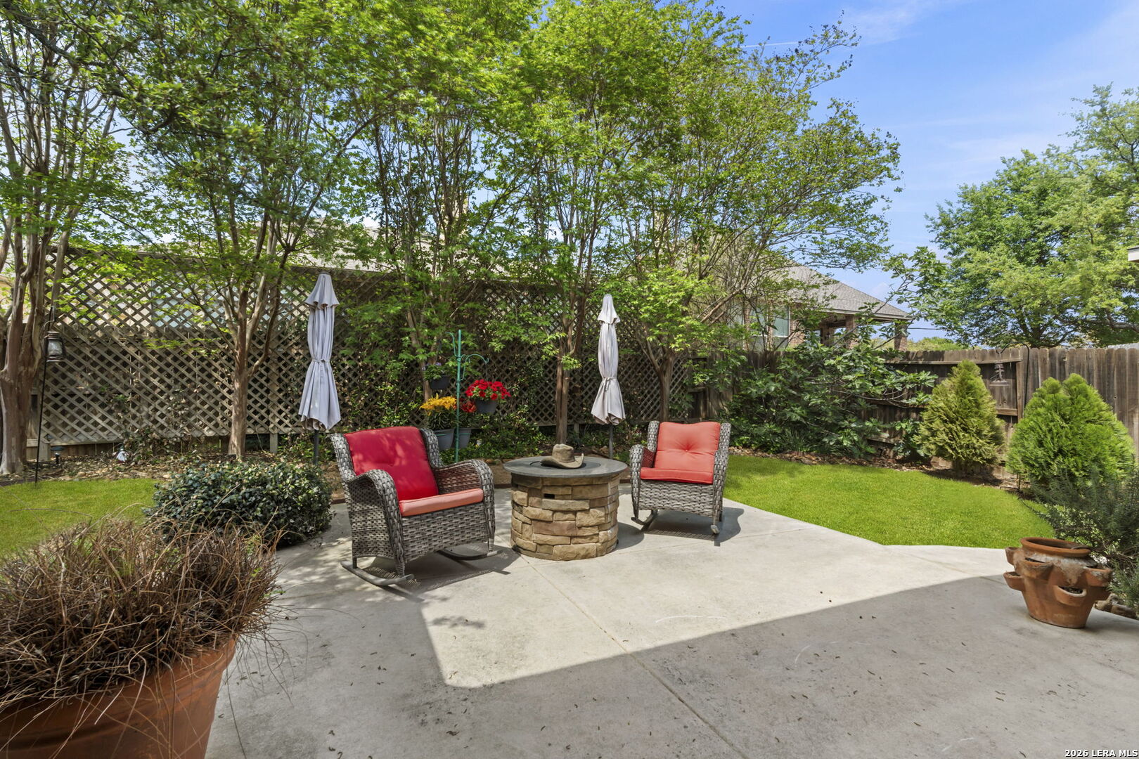 Beautifully maintained and thoughtfully designed, this 3-bedroom, 2.5-bath, 2,314 sq ft home in the controlled-access community of Tuscan Oaks offers the perfect combination of comfort, style, and everyday convenience. From the moment you arrive, the impeccable landscaping, mature trees, and charming curb appeal make a lasting first impression - especially at sunset. Step inside through the decorative glass front door into a welcoming entry hallway that sets the tone for the warmth found throughout the home. The open-concept layout flows effortlessly across rich tile flooring, connecting the main living spaces with ease. The spacious family room centers around a classic wood-burning gas fireplace with brick surround, framed by plantation shutters that add both elegance and privacy. A second living area - currently used as a private retreat - is tucked off the main space with crown molding and offers endless flexibility as a media room, formal sitting room, or den. A versatile flex room with hardwood floors and its own access makes the perfect home office or study, while a dedicated laundry room with cabinetry adds everyday functionality. The chef's kitchen impresses with rich dark cabinetry, gleaming granite countertops, a tile backsplash, a center island, a gas cooktop, double ovens, stainless steel appliances, and a spacious breakfast nook surrounded by plantation shutters - perfect for casual dining or morning coffee. The primary suite is a true retreat, featuring a tray ceiling, crown molding, plantation shutters, hardwood floors, and a spa-like en-suite bath complete with split dual vanities with granite countertops, a garden tub, a separate walk-in shower, and a large custom walk-in closet. Two additional well-sized secondary bedrooms share a comfortable full bath, and each room offers great natural light and ample closet space. Step outside to your private backyard oasis - a generously sized covered concrete patio complete with a ceiling fan,a gas grill station, and a cozy stone fire pit seating area, all surrounded by lush landscaping and mature trees. Whether you're hosting friends or enjoying a quiet evening, this outdoor space truly delivers. Community Amenities Include: Controlled access entry, clubhouse, and playground. Prime Location: H-E-B Plus! is right around the corner at 281 and Evans Road H-E-B for everyday grocery needs. The nearby Village at Stone Oak offers chain restaurants, stores, and a movie theater, and US-281 runs through the area allowing quick access to all necessities. Stone Oak Park, Blossom Park, and Methodist Stone Oak Hospital are all within a short drive. Quick access to Highway 281 and Loop 1604 makes commuting throughout San Antonio a breeze, with major employers including USAA and the South Texas Medical Center just minutes away. Zoned to the highly regarded North East Independent School District. This home truly has it all - don't miss your opportunity to make it yours!