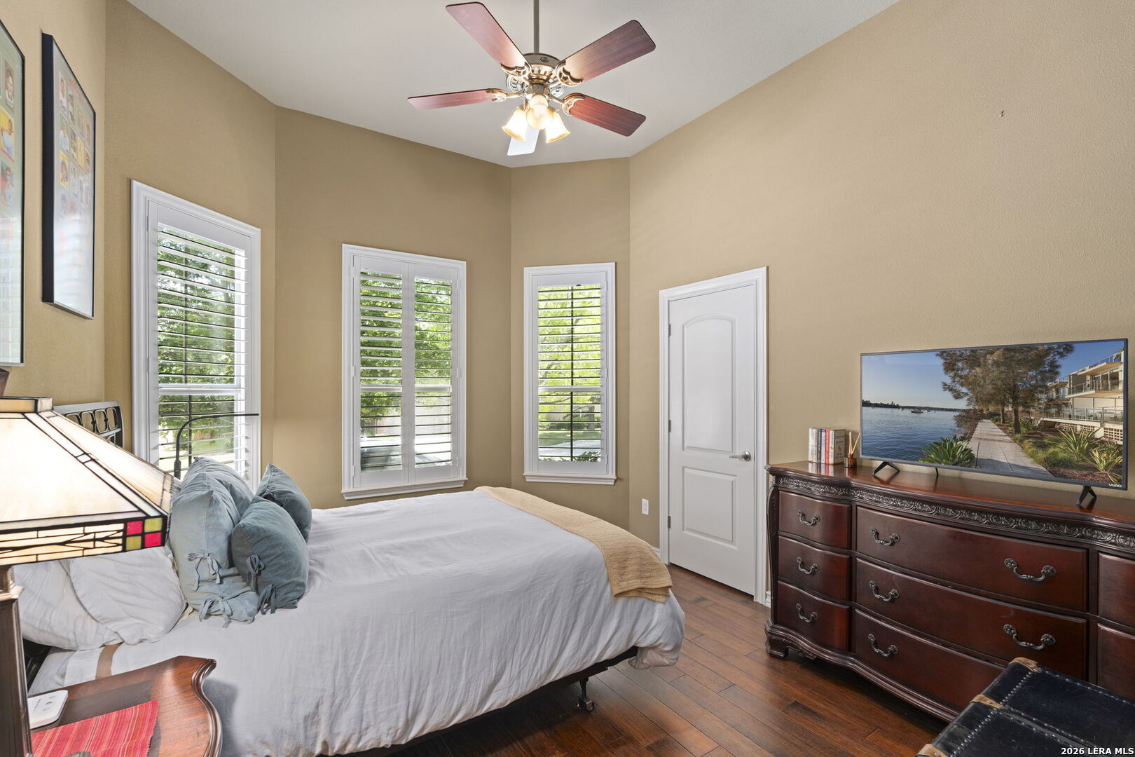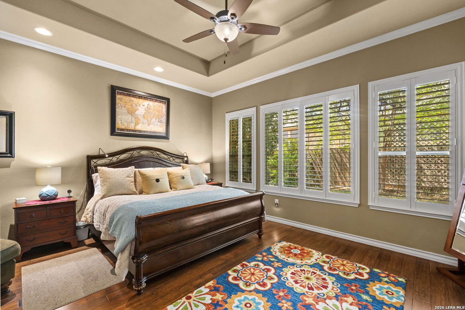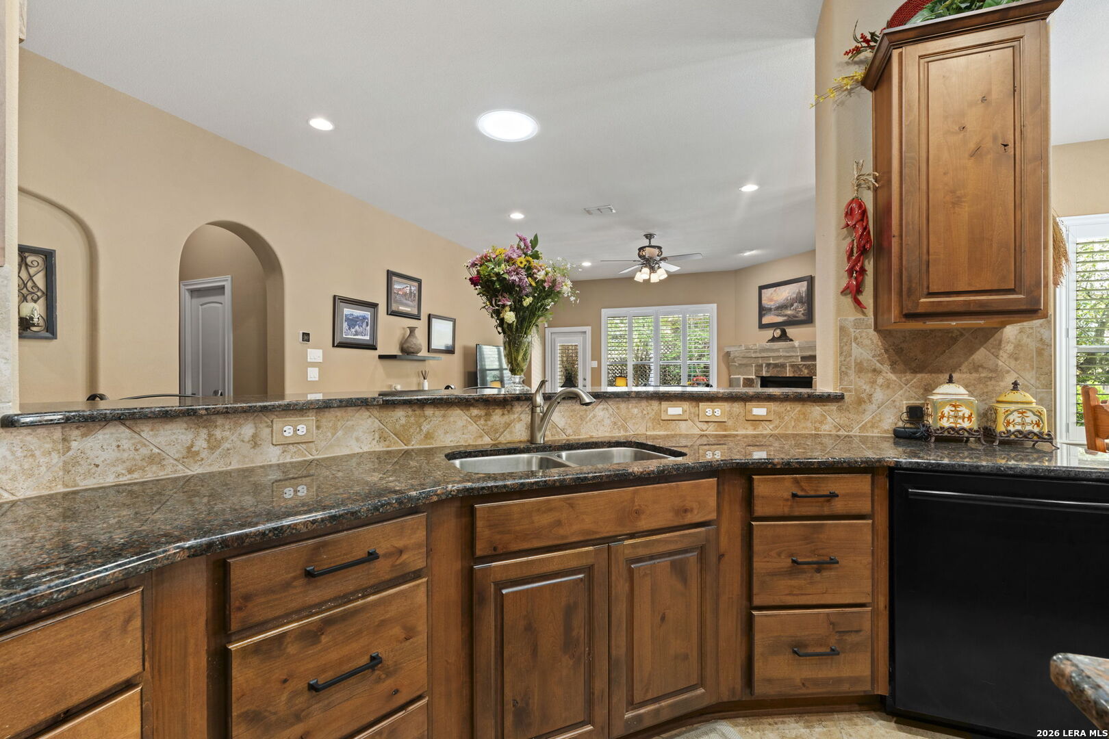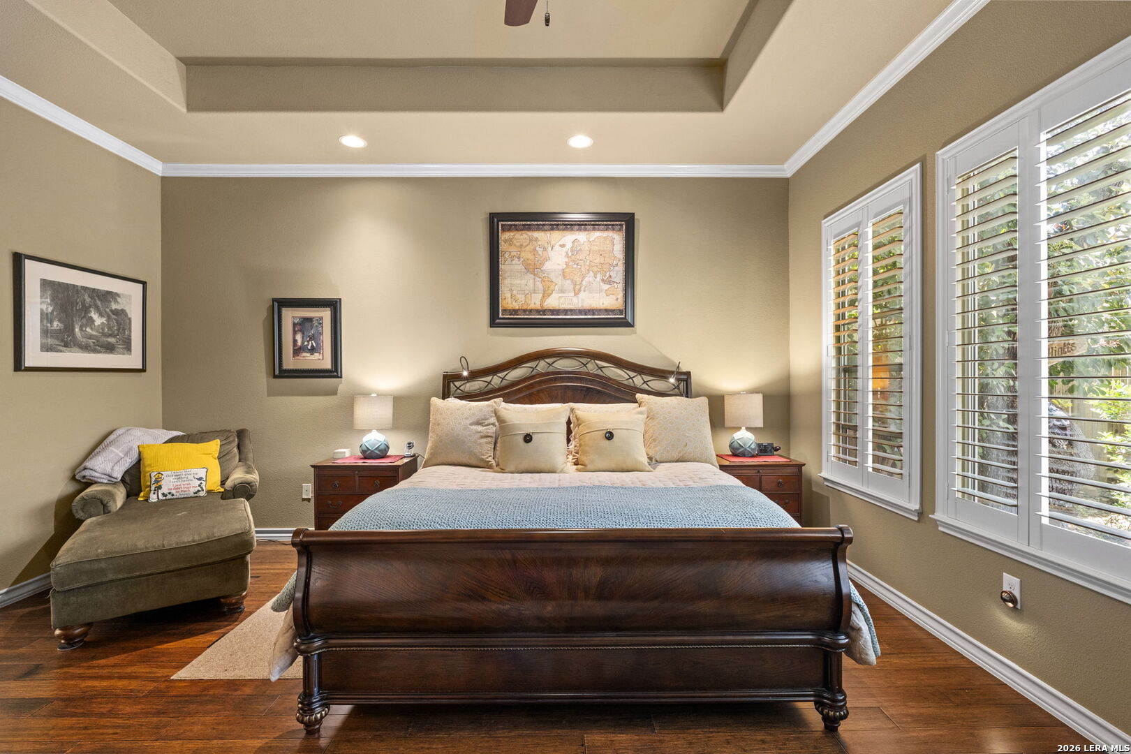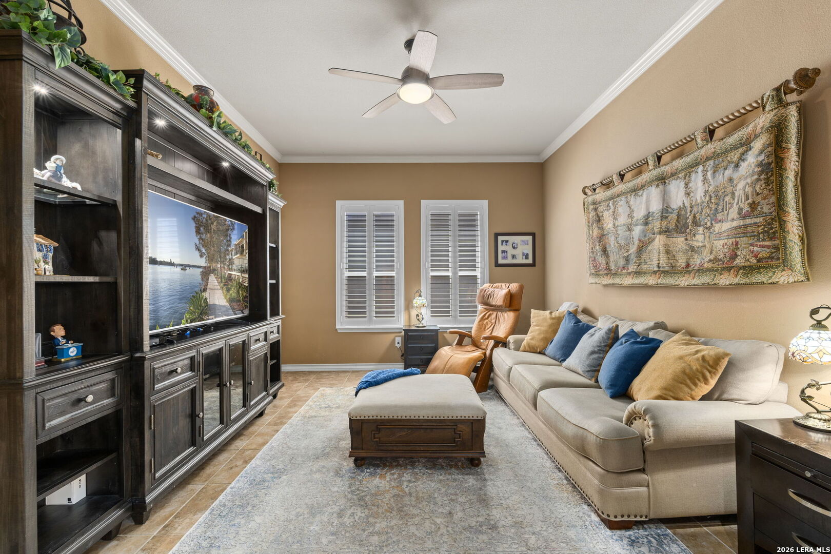 Beautifully maintained and thoughtfully designed, this 3-bedroom, 2.5-bath, 2,314 sq ft home in the controlled-access community of Tuscan Oaks offers the perfect combination of comfort, style, and everyday convenience. From the moment you arrive, the impeccable landscaping, mature trees, and charming curb appeal make a lasting first impression - especially at sunset. Step inside through the decorative glass front door into a welcoming entry hallway that sets the tone for the warmth found throughout the home. The open-concept layout flows effortlessly across rich tile flooring, connecting the main living spaces with ease. The spacious family room centers around a classic wood-burning gas fireplace with brick surround, framed by plantation shutters that add both elegance and privacy. A second living area - currently used as a private retreat - is tucked off the main space with crown molding and offers endless flexibility as a media room, formal sitting room, or den. A versatile flex room with hardwood floors and its own access makes the perfect home office or study, while a dedicated laundry room with cabinetry adds everyday functionality. The chef's kitchen impresses with rich dark cabinetry, gleaming granite countertops, a tile backsplash, a center island, a gas cooktop, double ovens, stainless steel appliances, and a spacious breakfast nook surrounded by plantation shutters - perfect for casual dining or morning coffee. The primary suite is a true retreat, featuring a tray ceiling, crown molding, plantation shutters, hardwood floors, and a spa-like en-suite bath complete with split dual vanities with granite countertops, a garden tub, a separate walk-in shower, and a large custom walk-in closet. Two additional well-sized secondary bedrooms share a comfortable full bath, and each room offers great natural light and ample closet space. Step outside to your private backyard oasis - a generously sized covered concrete patio complete with a ceiling fan,a gas grill station, and a cozy stone fire pit seating area, all surrounded by lush landscaping and mature trees. Whether you're hosting friends or enjoying a quiet evening, this outdoor space truly delivers. Community Amenities Include: Controlled access entry, clubhouse, and playground. Prime Location: H-E-B Plus! is right around the corner at 281 and Evans Road H-E-B for everyday grocery needs. The nearby Village at Stone Oak offers chain restaurants, stores, and a movie theater, and US-281 runs through the area allowing quick access to all necessities. Stone Oak Park, Blossom Park, and Methodist Stone Oak Hospital are all within a short drive. Quick access to Highway 281 and Loop 1604 makes commuting throughout San Antonio a breeze, with major employers including USAA and the South Texas Medical Center just minutes away. Zoned to the highly regarded North East Independent School District. This home truly has it all - don't miss your opportunity to make it yours!
