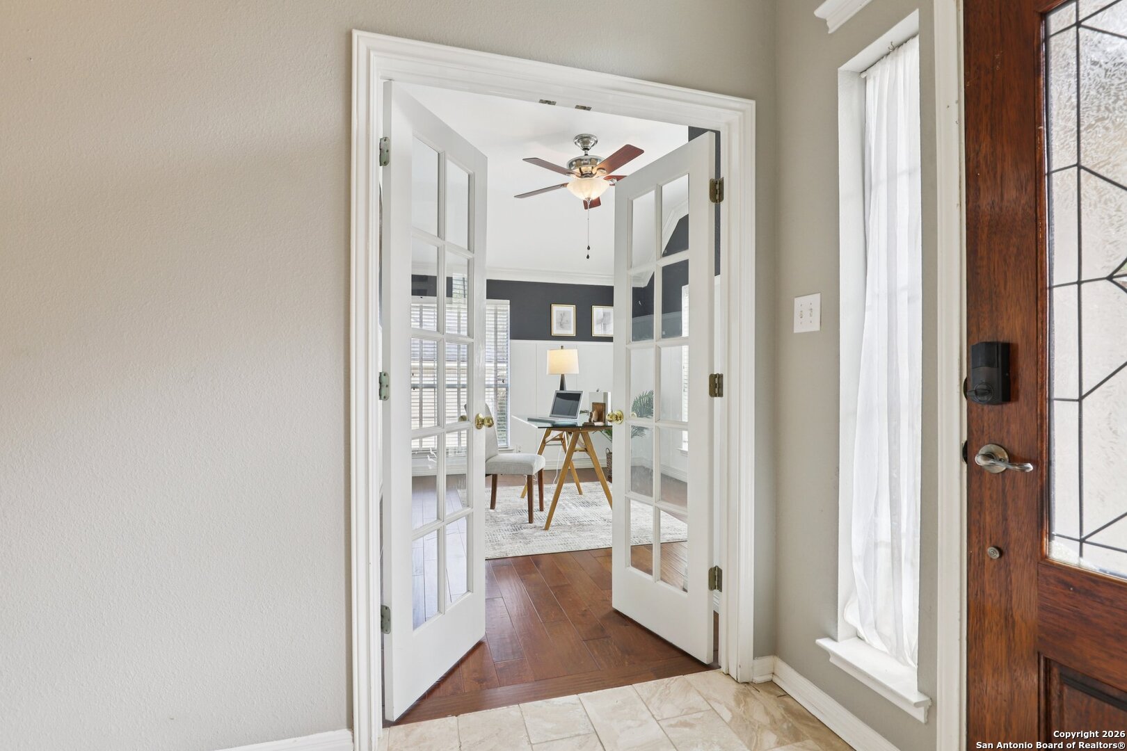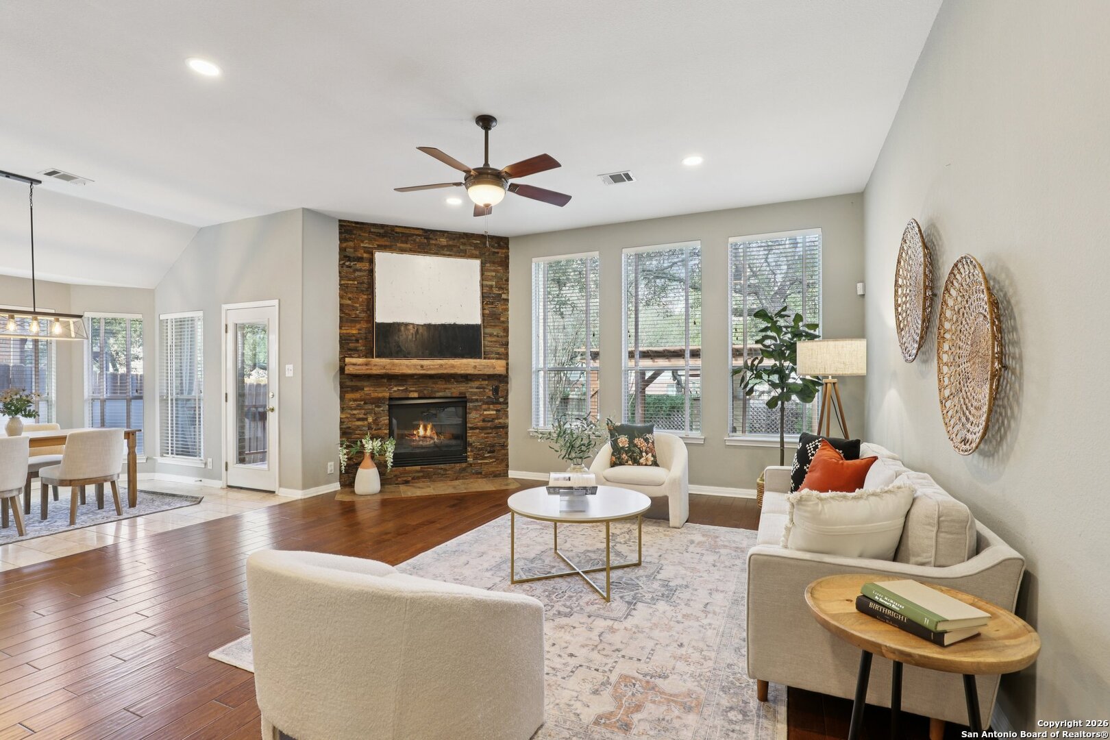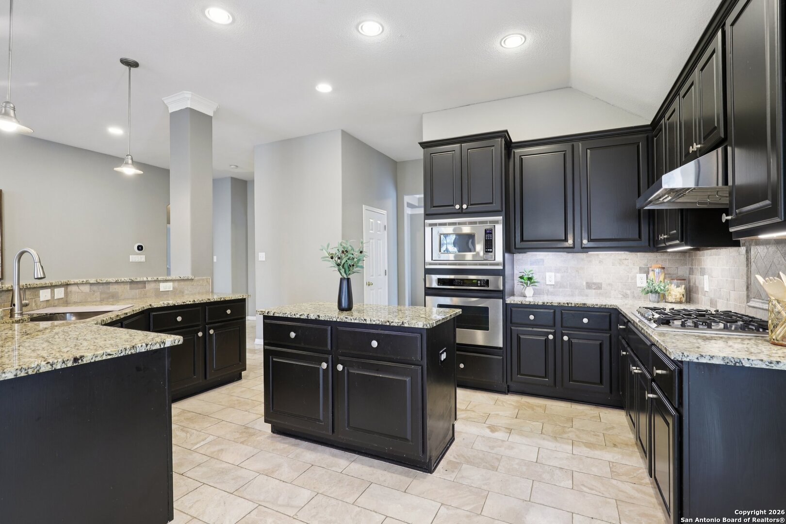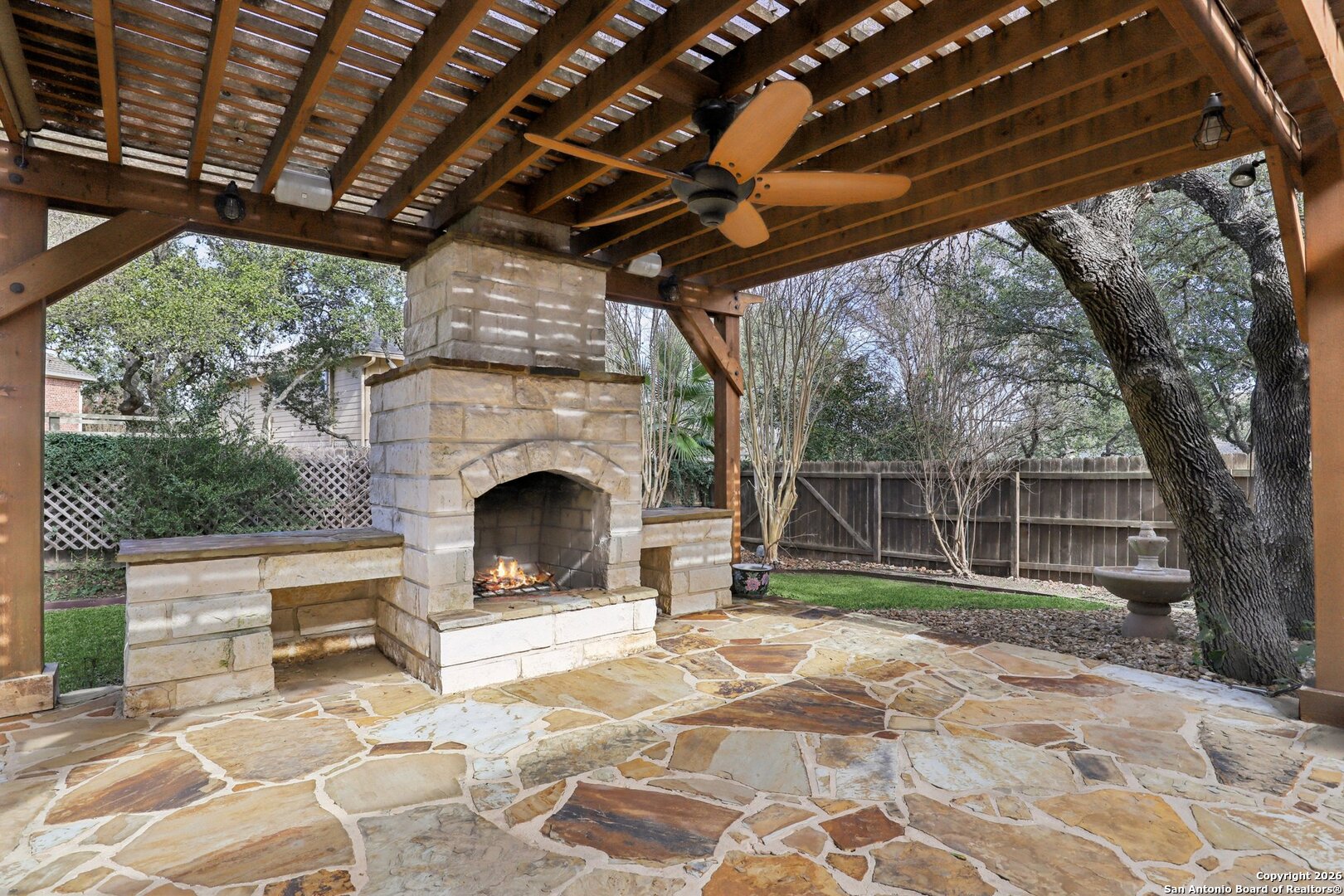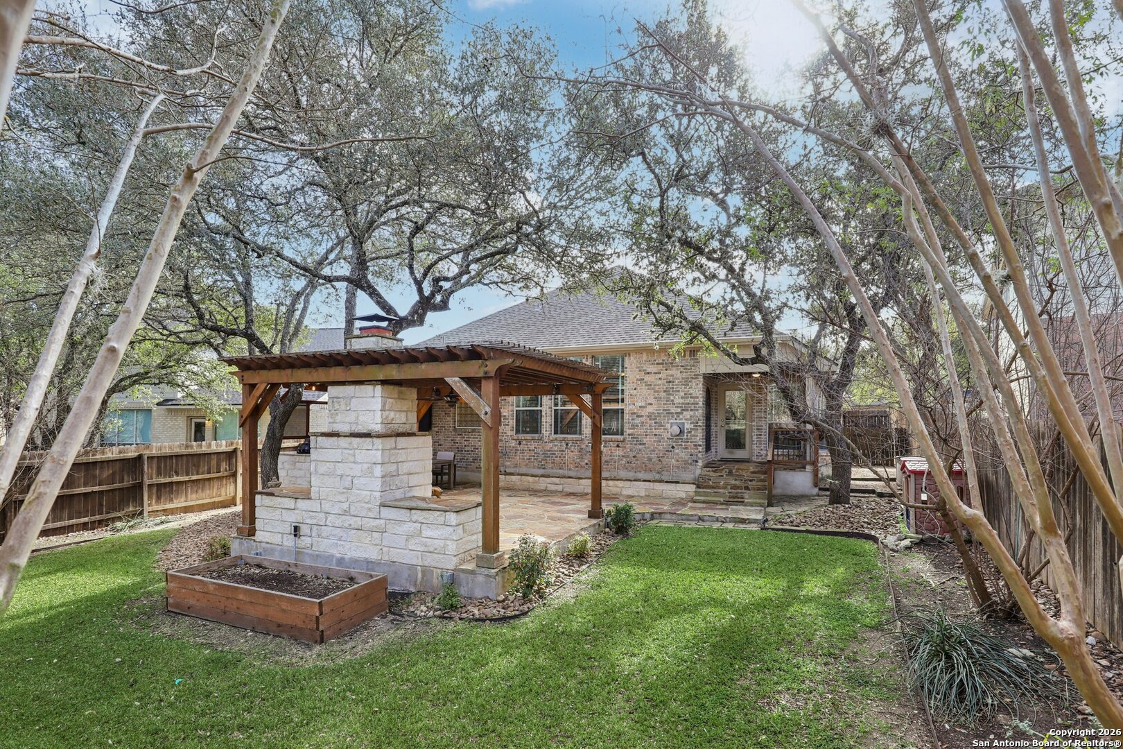 One-Story Beauty in Heights at Stone Oak! Welcome home to this stunning one-story residence featuring a wide-open entry accented with elegant tumbled marble flooring that continues through the kitchen and breakfast areas. Rich wood floors highlight the study, dining room, and spacious primary suite, adding warmth and sophistication throughout. The heart of the home is the well-appointed kitchen, complete with granite countertops, 42-inch cabinets, gas cooktop, and stainless-steel appliances, oven, and dishwasher. A large bar with accent lighting overlooks the kitchen, perfect for casual dining and entertaining. Retreat to the roomy primary bedroom and spa-like bath featuring tile accents, double vanities, a glass-enclosed shower, and a separate garden tub. Secondary bedrooms are generously sized with one able to be used as an office or a flex space, and the large laundry room is conveniently located. Step outside to an entertainer's dream backyard with a covered patio, outdoor kitchen, extended entertaining spaces, and a beautiful gazebo with flagstone flooring and an outdoor fireplace. The secluded backyard is enhanced by lush landscaping and a full sprinkler system. Additional highlights include 10-foot ceilings, crown molding, tray ceilings, HVAC less than 2 years old, and a brand-new Kinetico water softener. This exceptional home offers comfort, style, and thoughtful upgrades throughout-don't miss it!