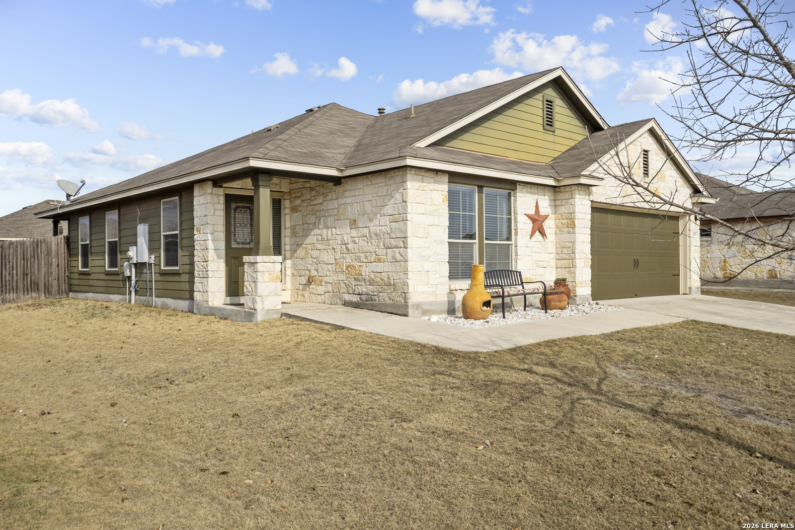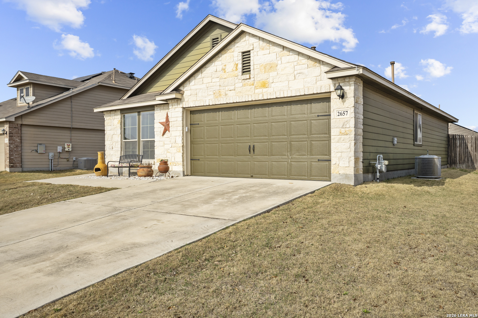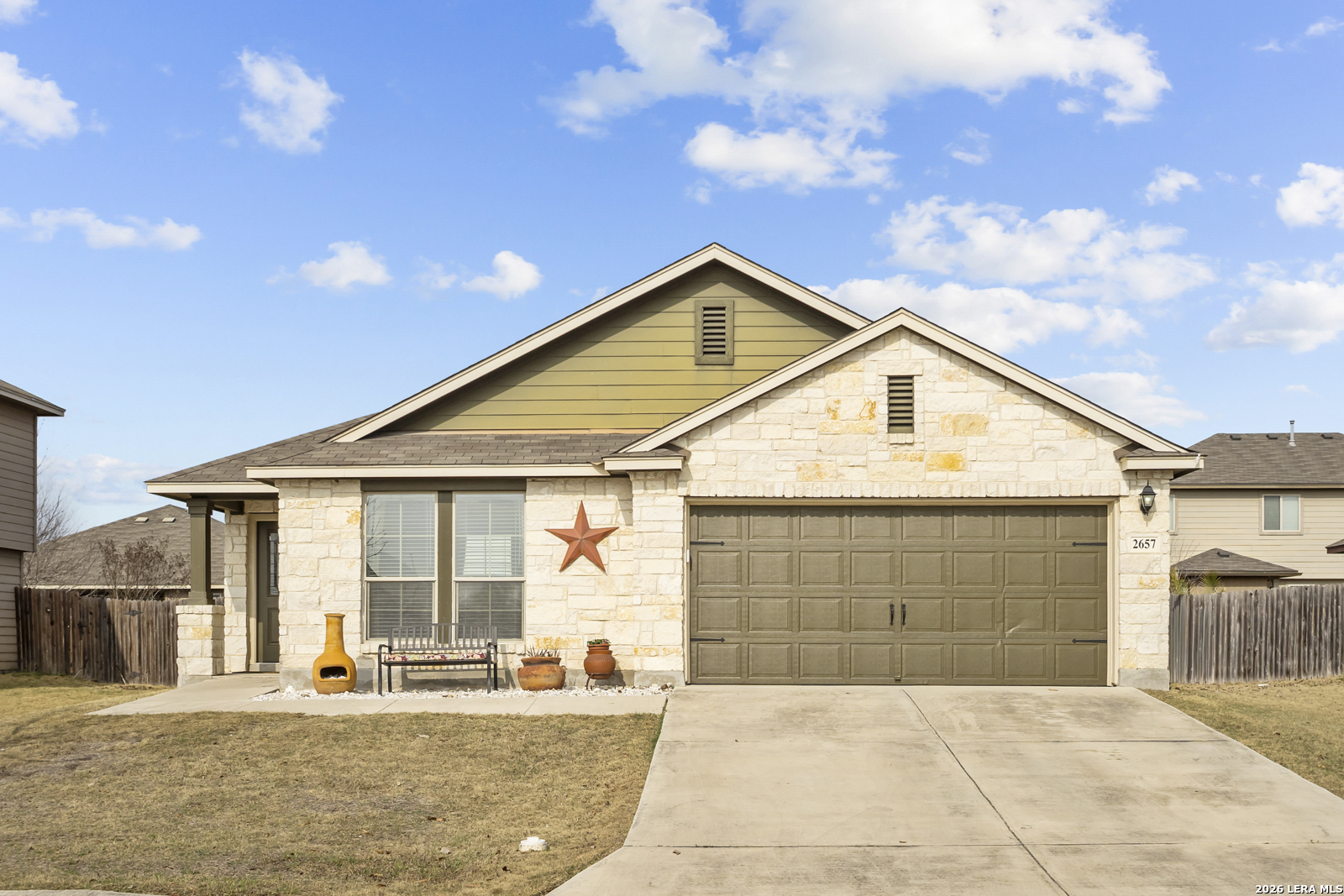 Welcome to 2657 Lonesome Creek Trl in the heart of New Braunfels! This charming 3-bedroom, 2-bathroom home offers a thoughtfully designed layout that combines comfort and functionality. Step inside to an inviting open floor plan where the living room flows seamlessly into the kitchen, creating the perfect space for entertaining and everyday living. The kitchen is equipped with sleek stainless steel appliances, ample cabinetry, and generous counter space, all overlooking the main living area so you're never far from the action. The well-sized primary suite provides a relaxing retreat, complete with a double vanity and a connected shower and tub combination designed for convenience and comfort. Two additional bedrooms offer flexibility for guests, a home office, or growing needs. Out back, enjoy a covered patio ideal for morning coffee or evening gatherings, all overlooking a large backyard with plenty of room to play, garden, or create your own outdoor oasis. Conveniently located near shopping, dining, and everything New Braunfels has to offer, this home is ready to welcome its next owner.