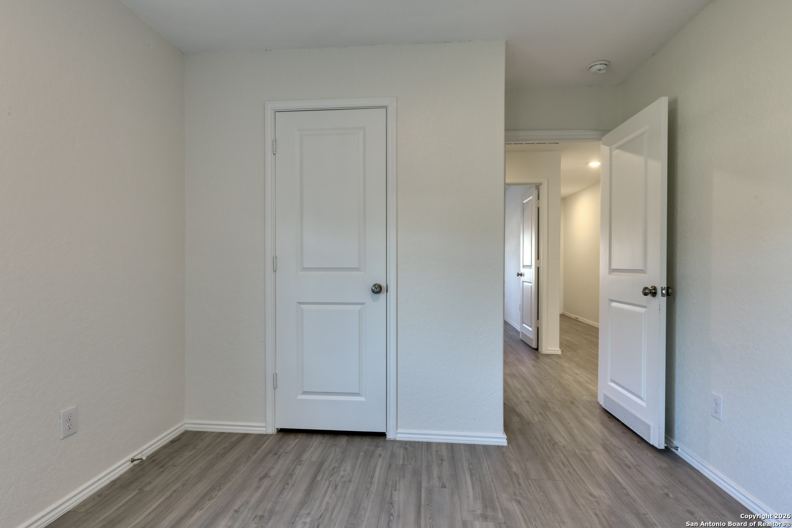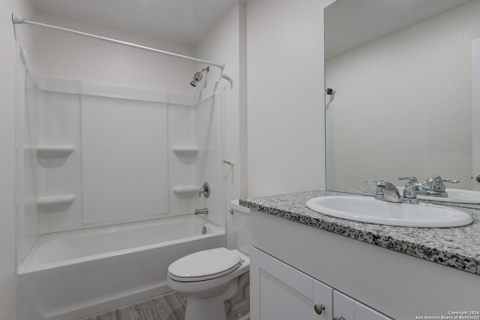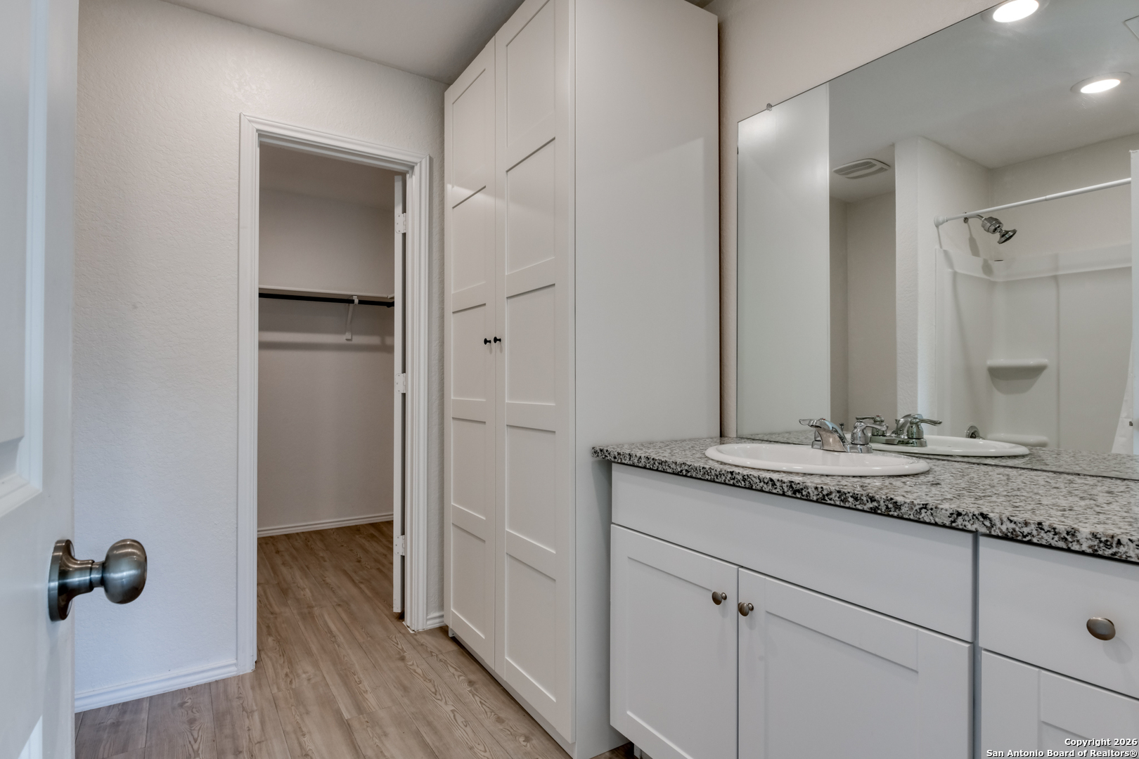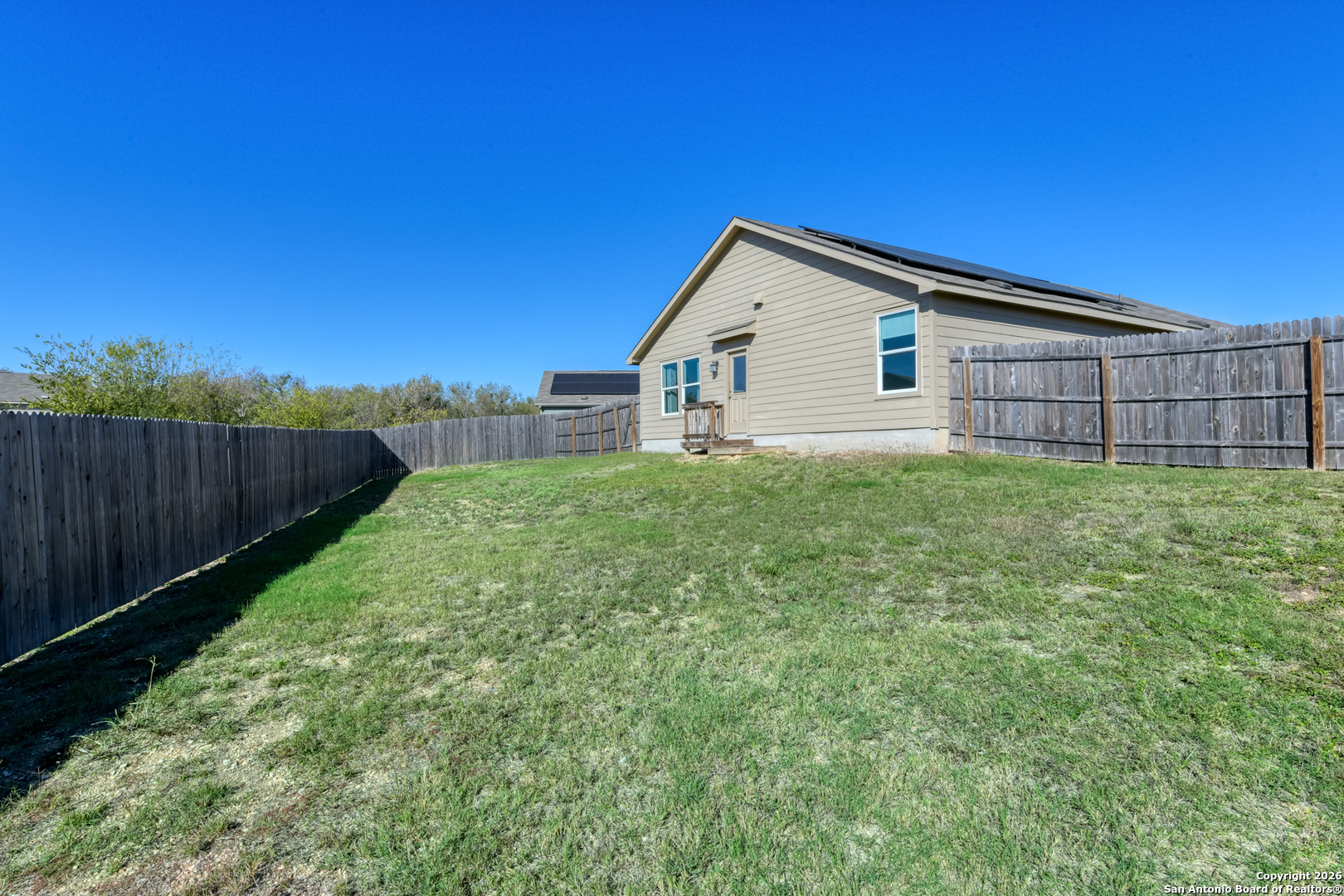 This inviting single-story home features charming curb appeal with a welcoming front porch and a spacious two-car garage with an epoxy floor. Step inside to an open floor plan where the living and dining areas flow together seamlessly, enhanced by generous natural light and smooth wood-look flooring throughout. The layout continues into a bright kitchen offering marble countertops, stainless steel appliances, white cabinetry, abundant storage, and a large peninsula that provides additional workspace and seating. The primary bedroom offers a restful retreat with its own private bath, which includes an elongated marble-topped vanity, generous cabinet storage, and access to a walk-in closet. Three secondary bedrooms and an additional full bath-also finished with a marble vanity-provide comfortable accommodations for guests, home office use, or flexible living. A convenient laundry area sits off the hallway for easy access. Out back, a wide fenced yard offers plenty of room for outdoor activities and future personalization. The neighborhood includes a walking path to enjoy the outdoors, and the home's location places you just minutes from downtown New Braunfels, offering quick access to dining, shopping, and recreation. * Please be aware that some photos have been virtually staged.