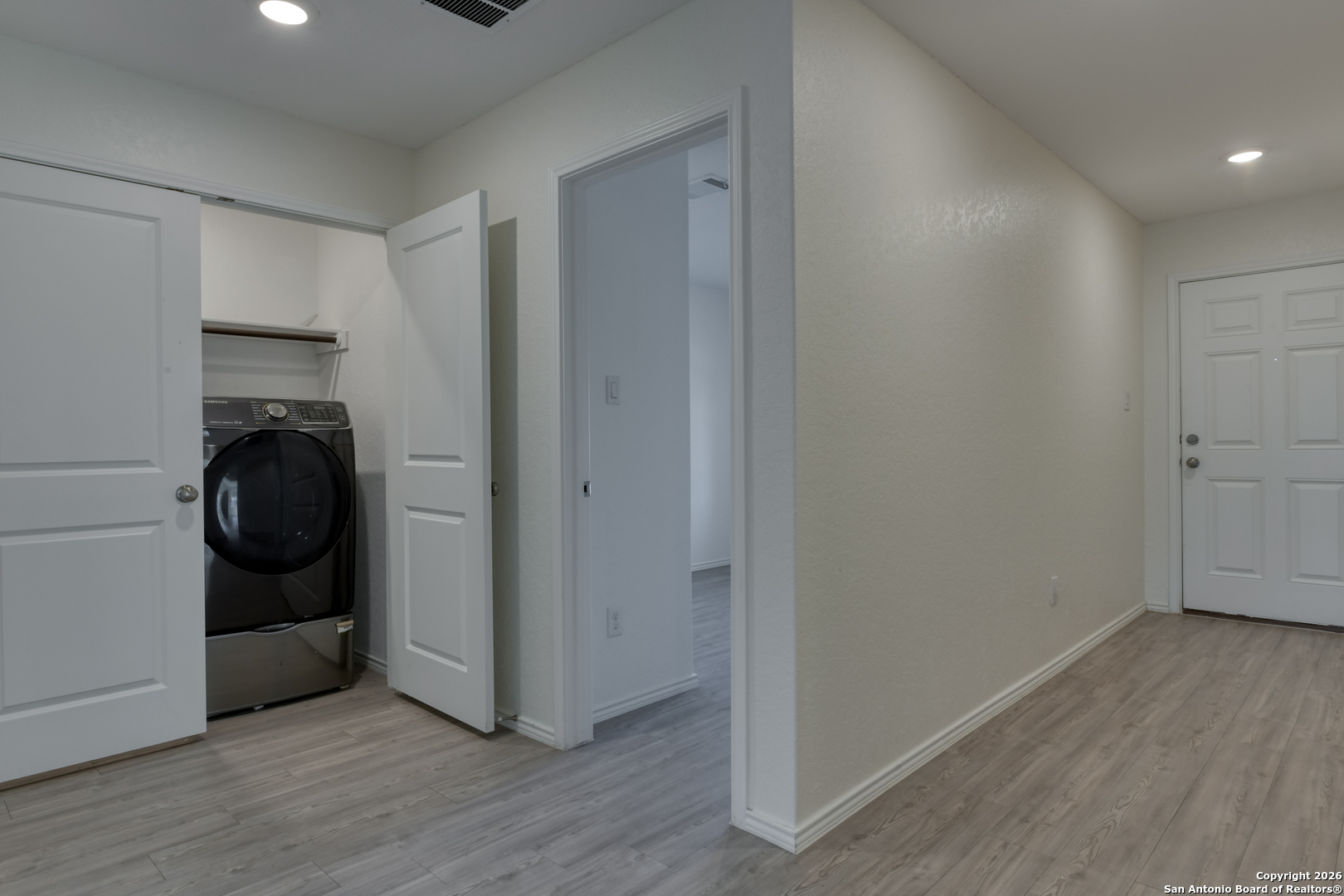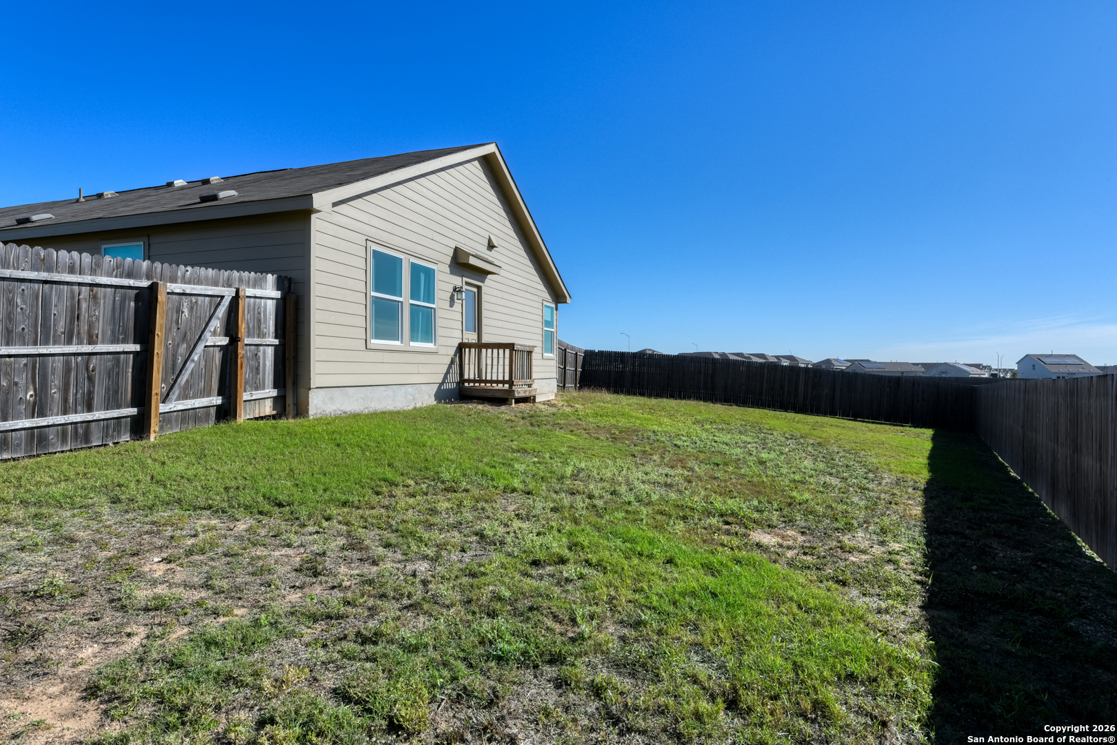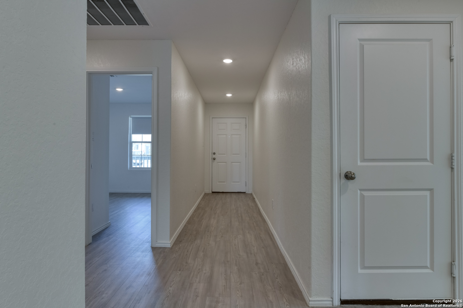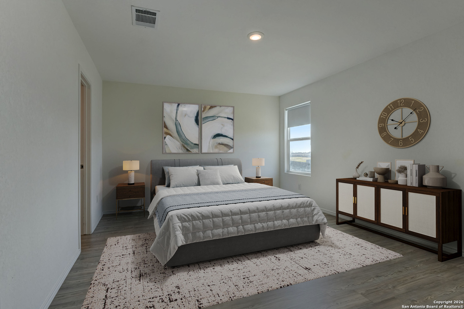 This inviting single-story home features charming curb appeal with a welcoming front porch and a spacious two-car garage with an epoxy floor. Step inside to an open floor plan where the living and dining areas flow together seamlessly, enhanced by generous natural light and smooth wood-look flooring throughout. The layout continues into a bright kitchen offering marble countertops, stainless steel appliances, white cabinetry, abundant storage, and a large peninsula that provides additional workspace and seating. The primary bedroom offers a restful retreat with its own private bath, which includes an elongated marble-topped vanity, generous cabinet storage, and access to a walk-in closet. Three secondary bedrooms and an additional full bath-also finished with a marble vanity-provide comfortable accommodations for guests, home office use, or flexible living. A convenient laundry area sits off the hallway for easy access. Out back, a wide fenced yard offers plenty of room for outdoor activities and future personalization. The neighborhood includes a walking path to enjoy the outdoors, and the home's location places you just minutes from downtown New Braunfels, offering quick access to dining, shopping, and recreation. * Please be aware that some photos have been virtually staged.
