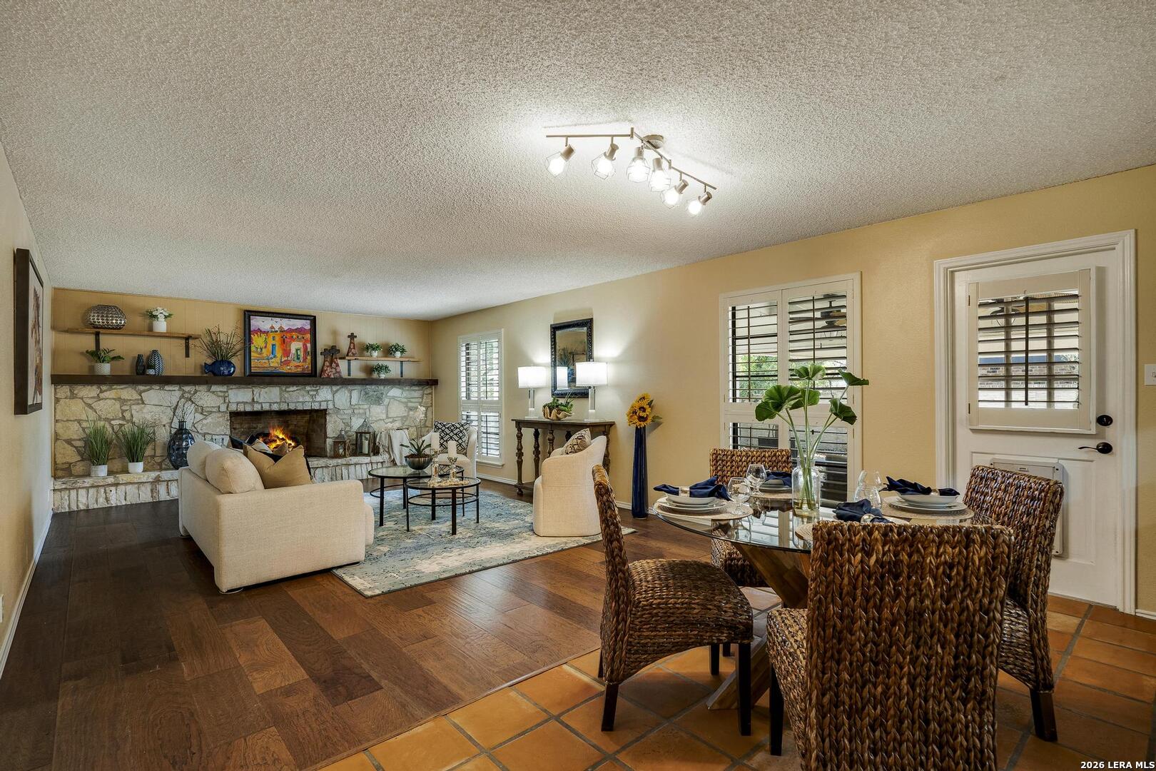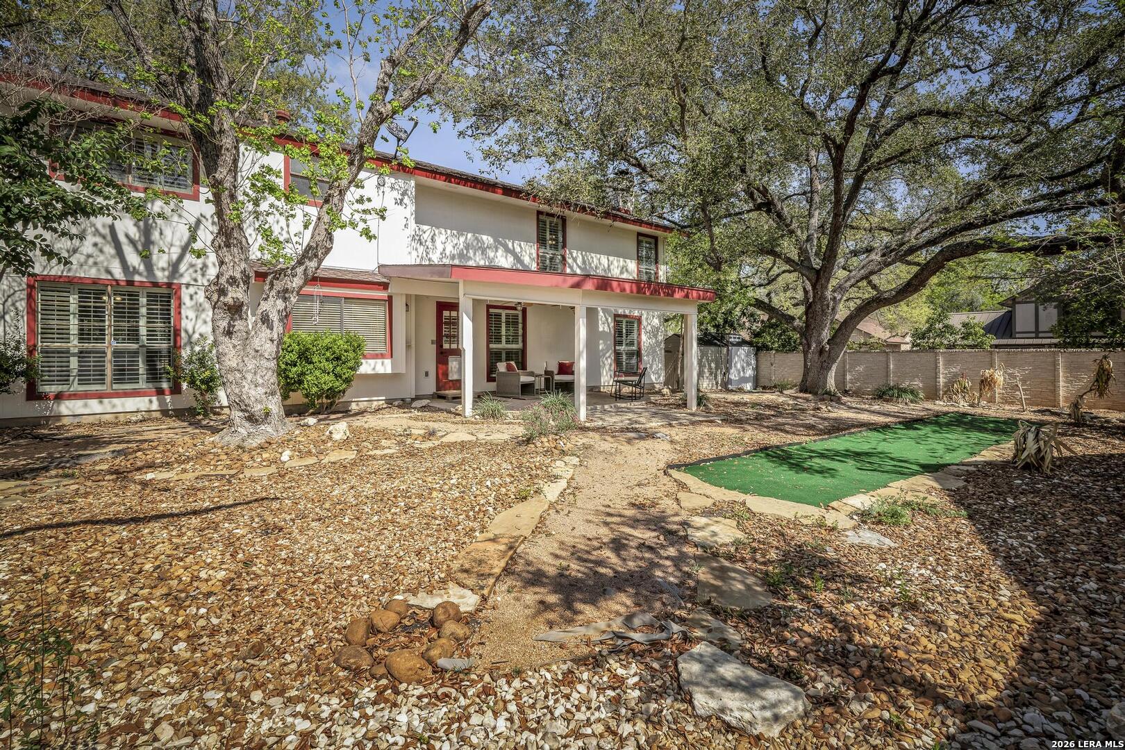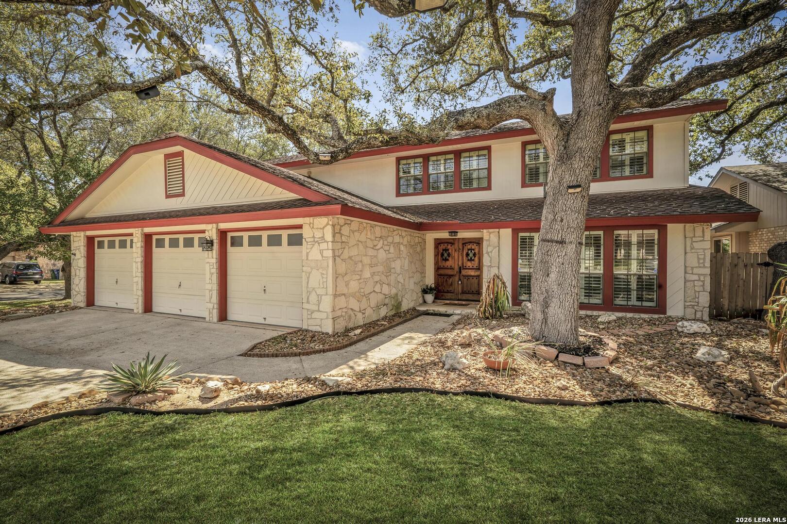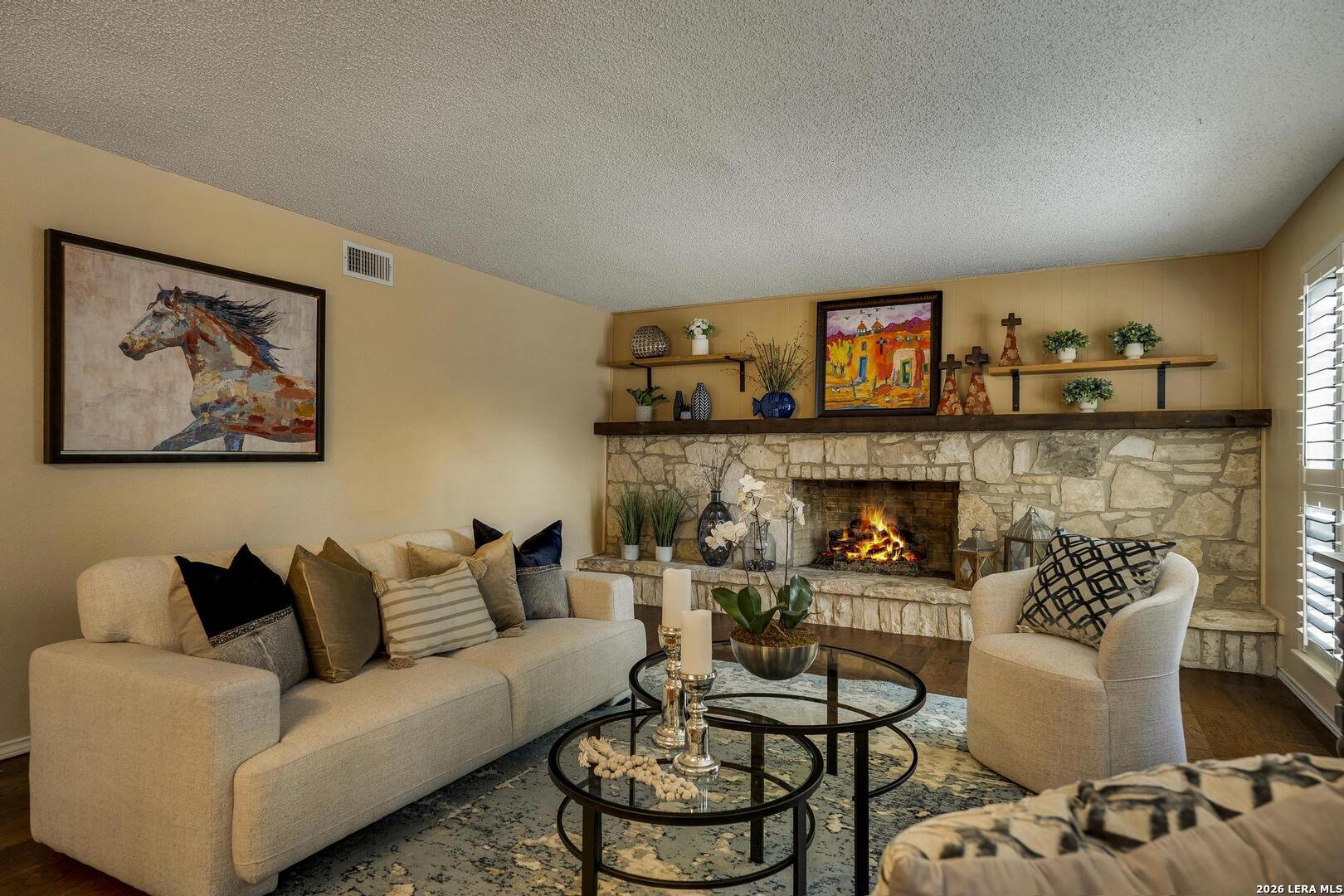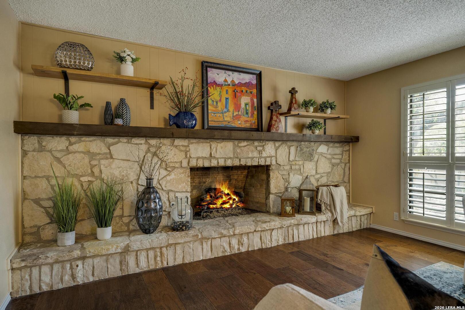 Elegant Spanish-style home with modern updates in desirable North Central San Antonio. Surrounded by mature oak trees, this beautifully maintained property features engineered wood flooring throughout, classic Saltillo tile, custom wood entry doors, plantation shutters, and a stunning floor-to-ceiling stone fireplace with vented gas logs. The spacious kitchen offers stainless steel appliances, generous counter space, and a breakfast bar, while the oversized primary suite includes a custom walk-in closet with built-ins. Enjoy the covered back patio, beautifully landscaped front and back yard, zero-scaped backyard for low-maintenance living, water softener, and 3-car garage. A rare blend of timeless character, warmth, and modern convenience.