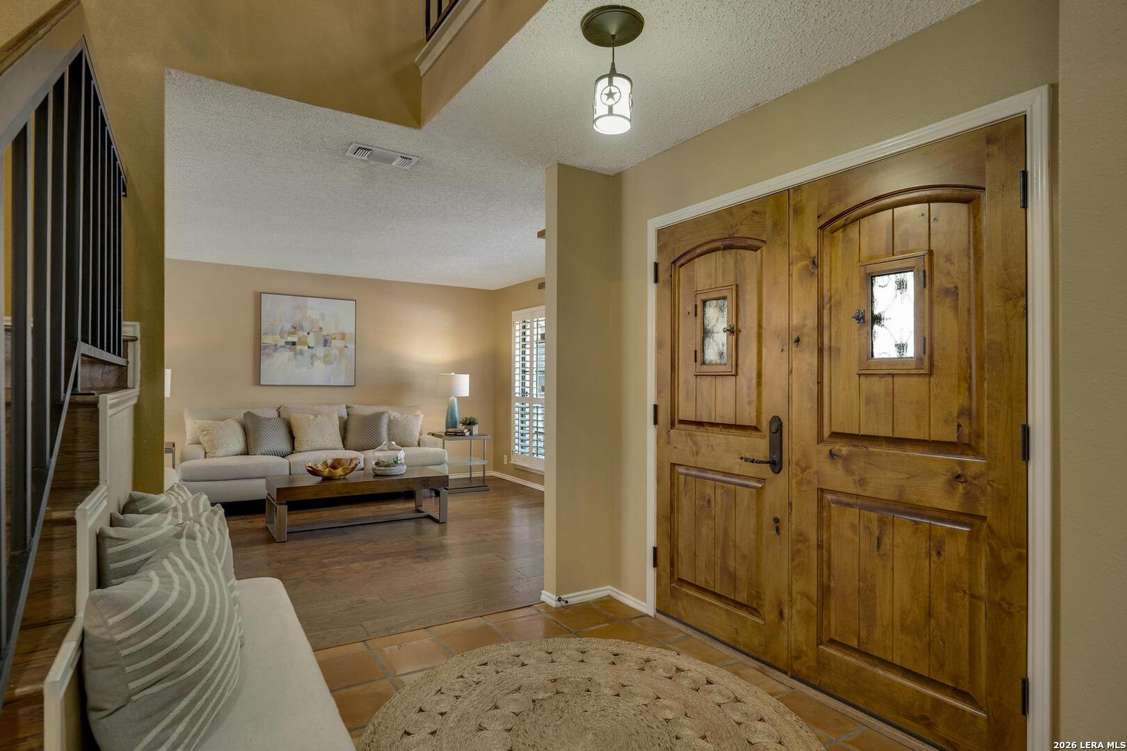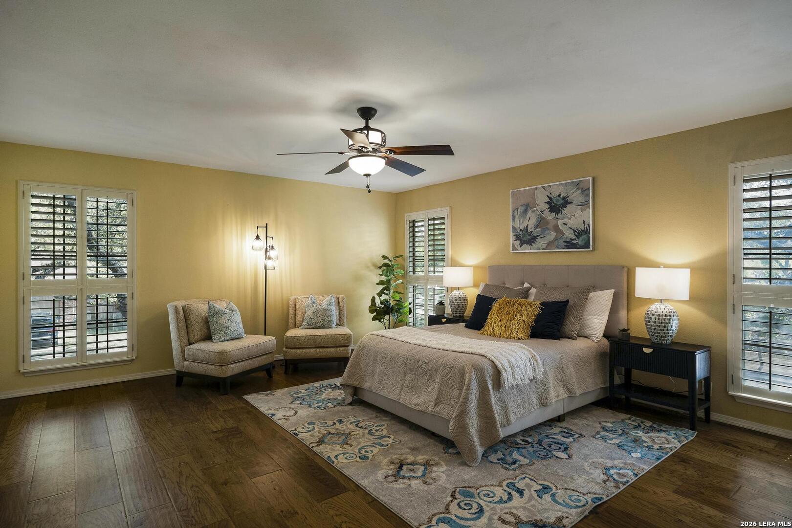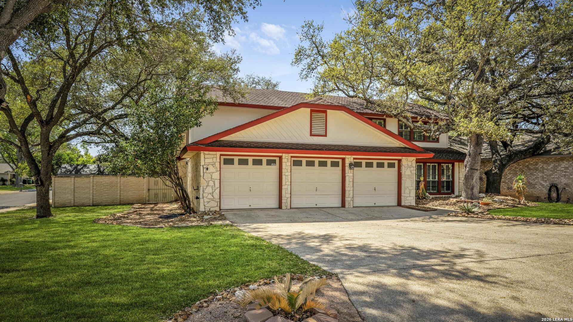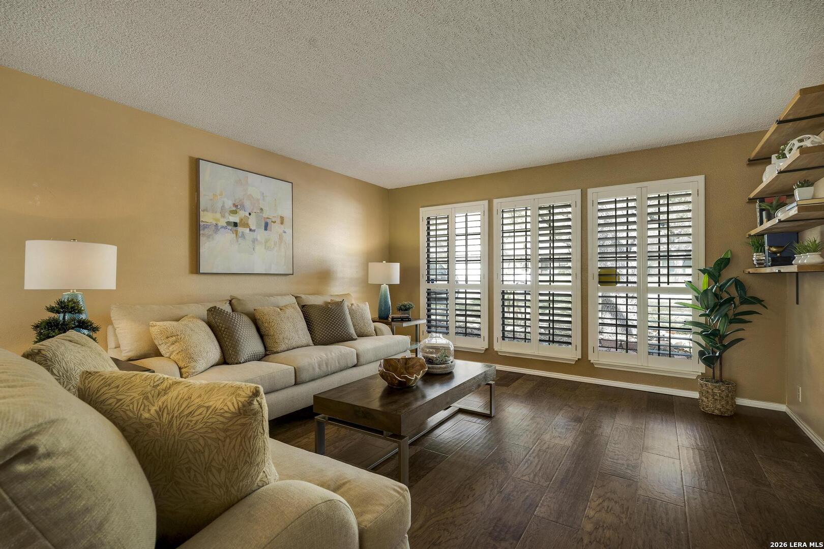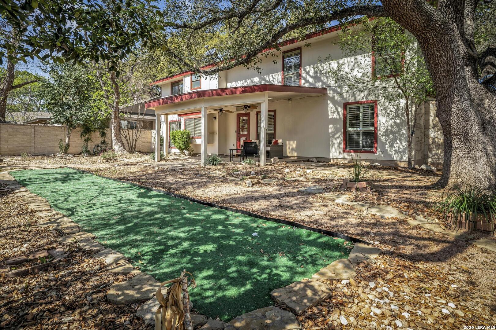 Elegant Spanish-style home with modern updates in desirable North Central San Antonio. Surrounded by mature oak trees, this beautifully maintained property features engineered wood flooring throughout, classic Saltillo tile, custom wood entry doors, plantation shutters, and a stunning floor-to-ceiling stone fireplace with vented gas logs. The spacious kitchen offers stainless steel appliances, generous counter space, and a breakfast bar, while the oversized primary suite includes a custom walk-in closet with built-ins. Enjoy the covered back patio, beautifully landscaped front and back yard, zero-scaped backyard for low-maintenance living, water softener, and 3-car garage. A rare blend of timeless character, warmth, and modern convenience.