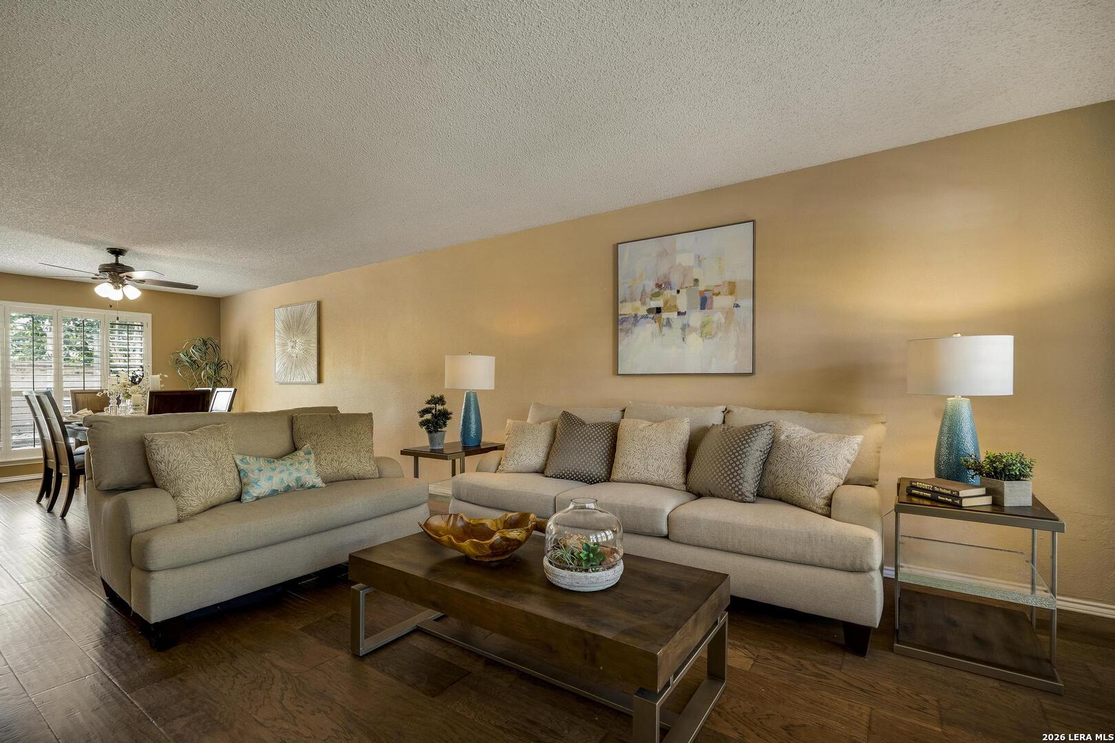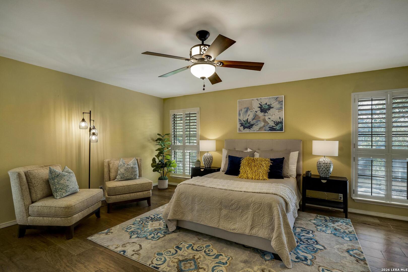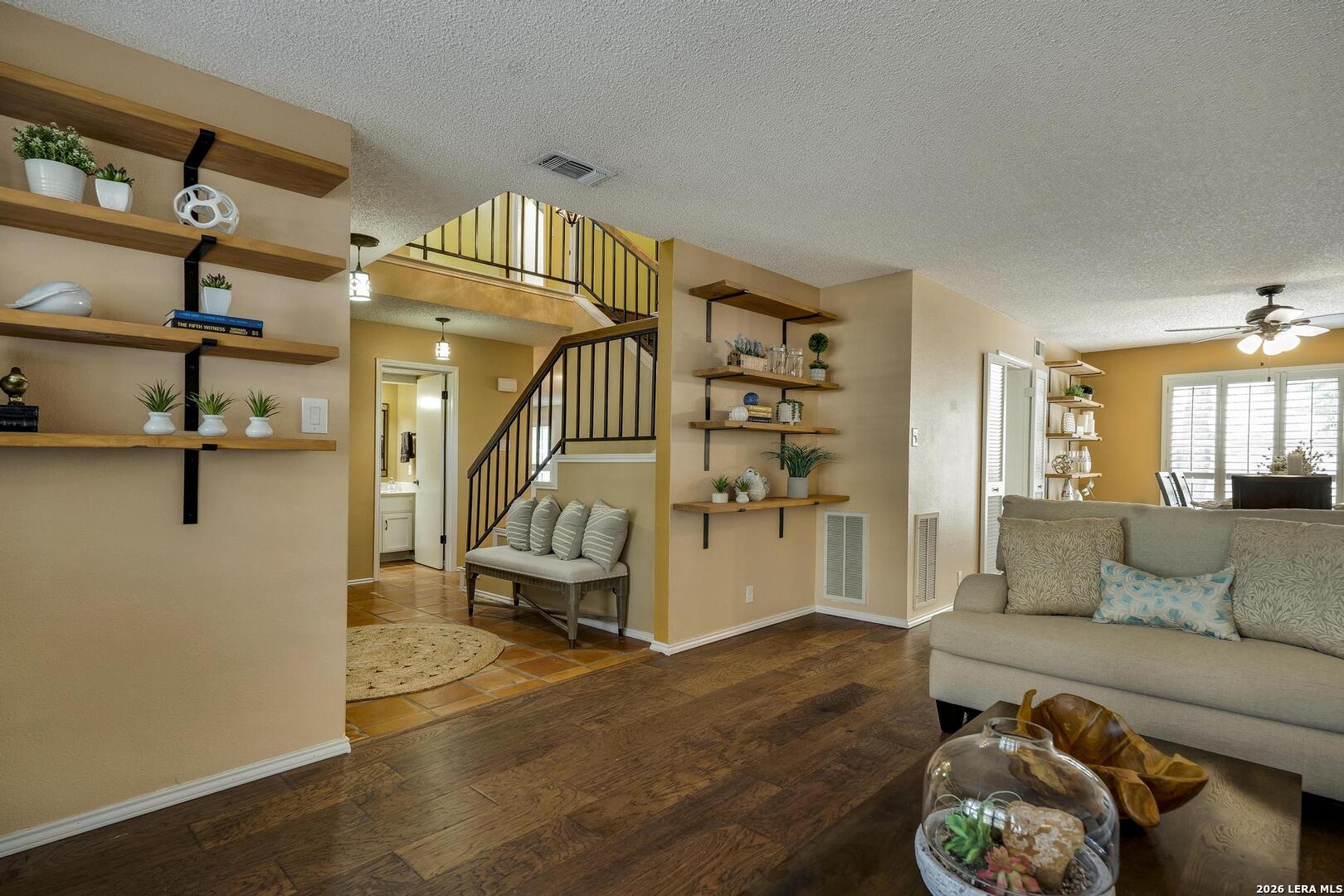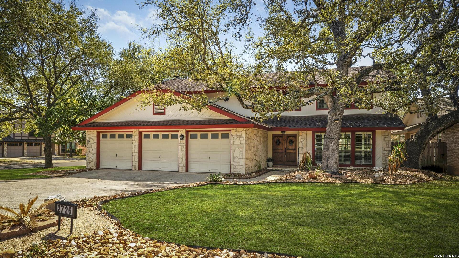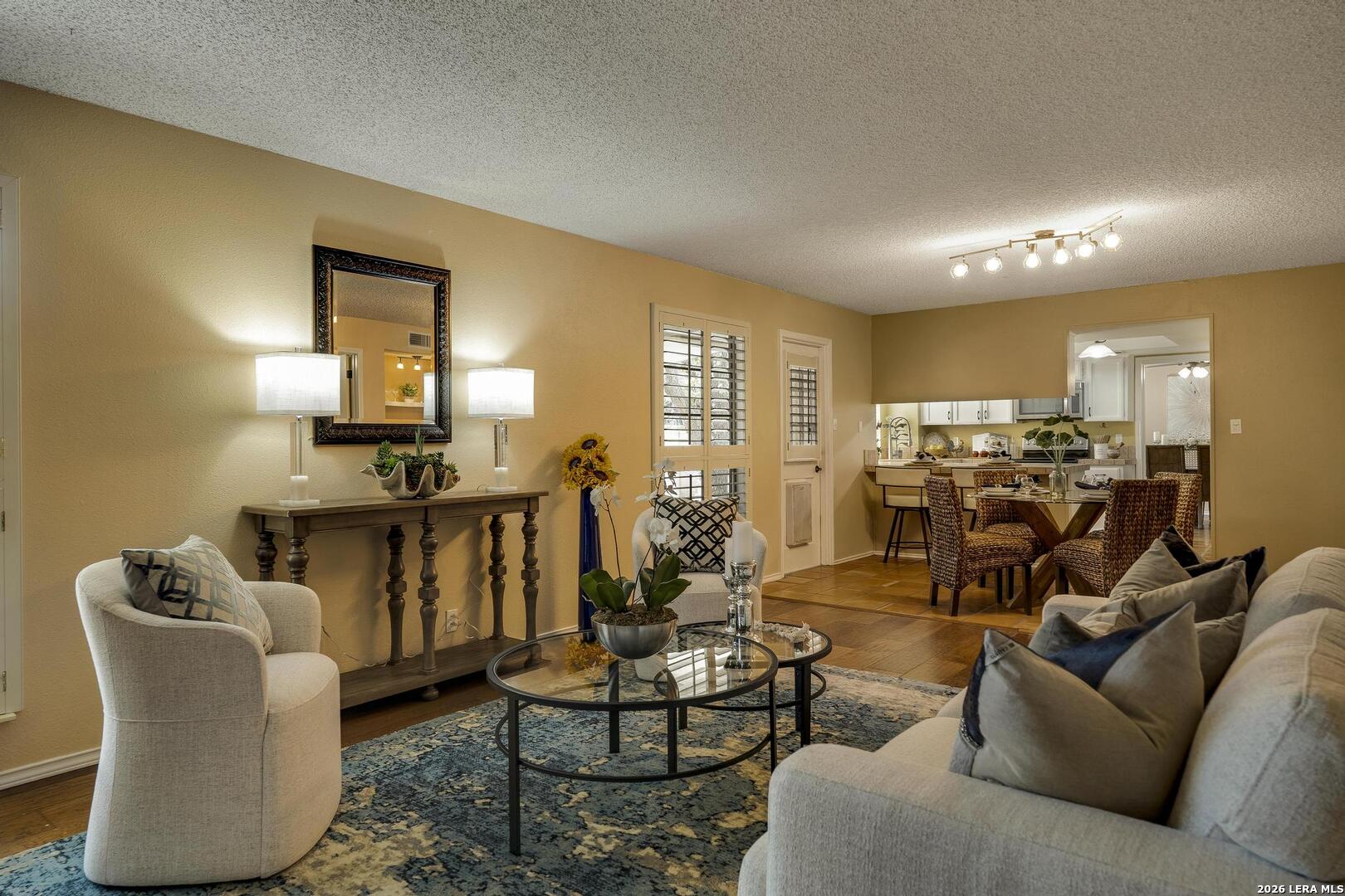 Elegant Spanish-style home with modern updates in desirable North Central San Antonio. Surrounded by mature oak trees, this beautifully maintained property features engineered wood flooring throughout, classic Saltillo tile, custom wood entry doors, plantation shutters, and a stunning floor-to-ceiling stone fireplace with vented gas logs. The spacious kitchen offers stainless steel appliances, generous counter space, and a breakfast bar, while the oversized primary suite includes a custom walk-in closet with built-ins. Enjoy the covered back patio, beautifully landscaped front and back yard, zero-scaped backyard for low-maintenance living, water softener, and 3-car garage. A rare blend of timeless character, warmth, and modern convenience.